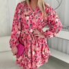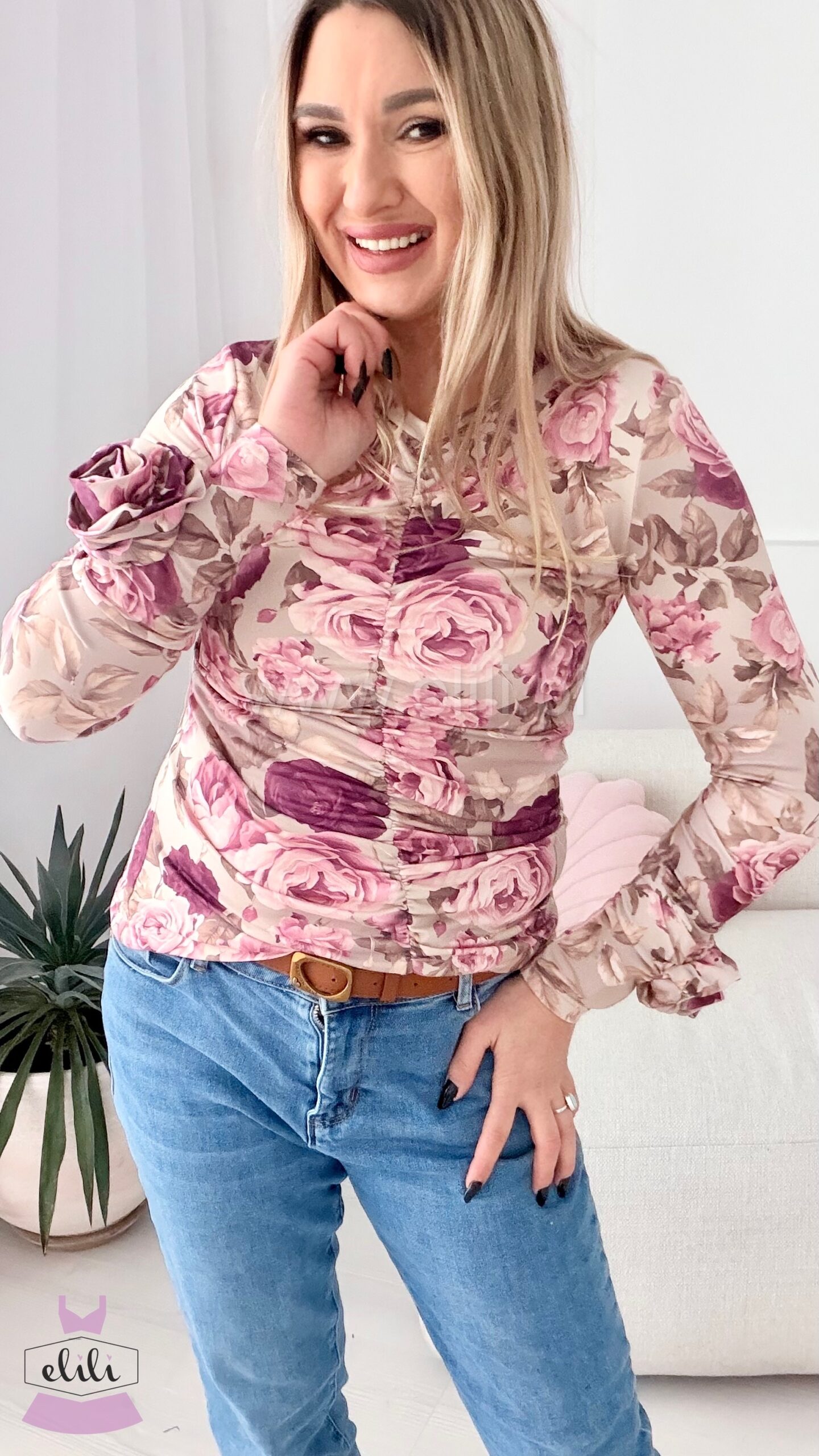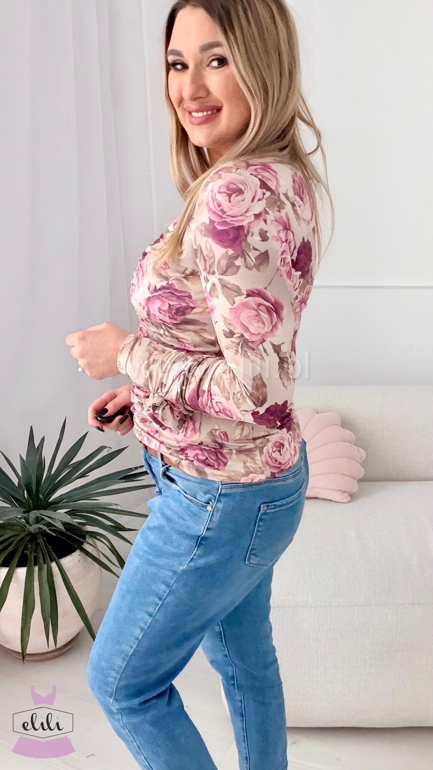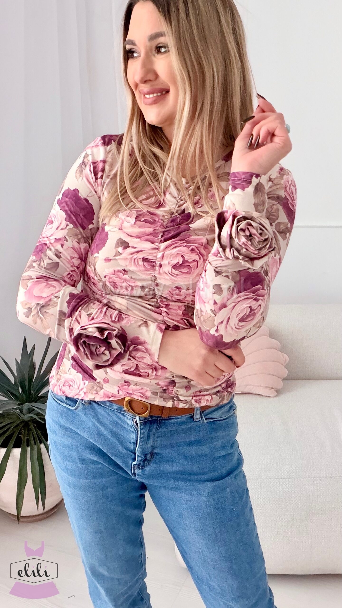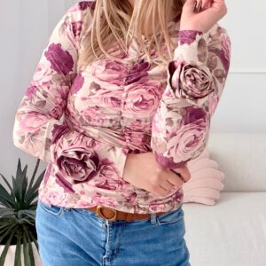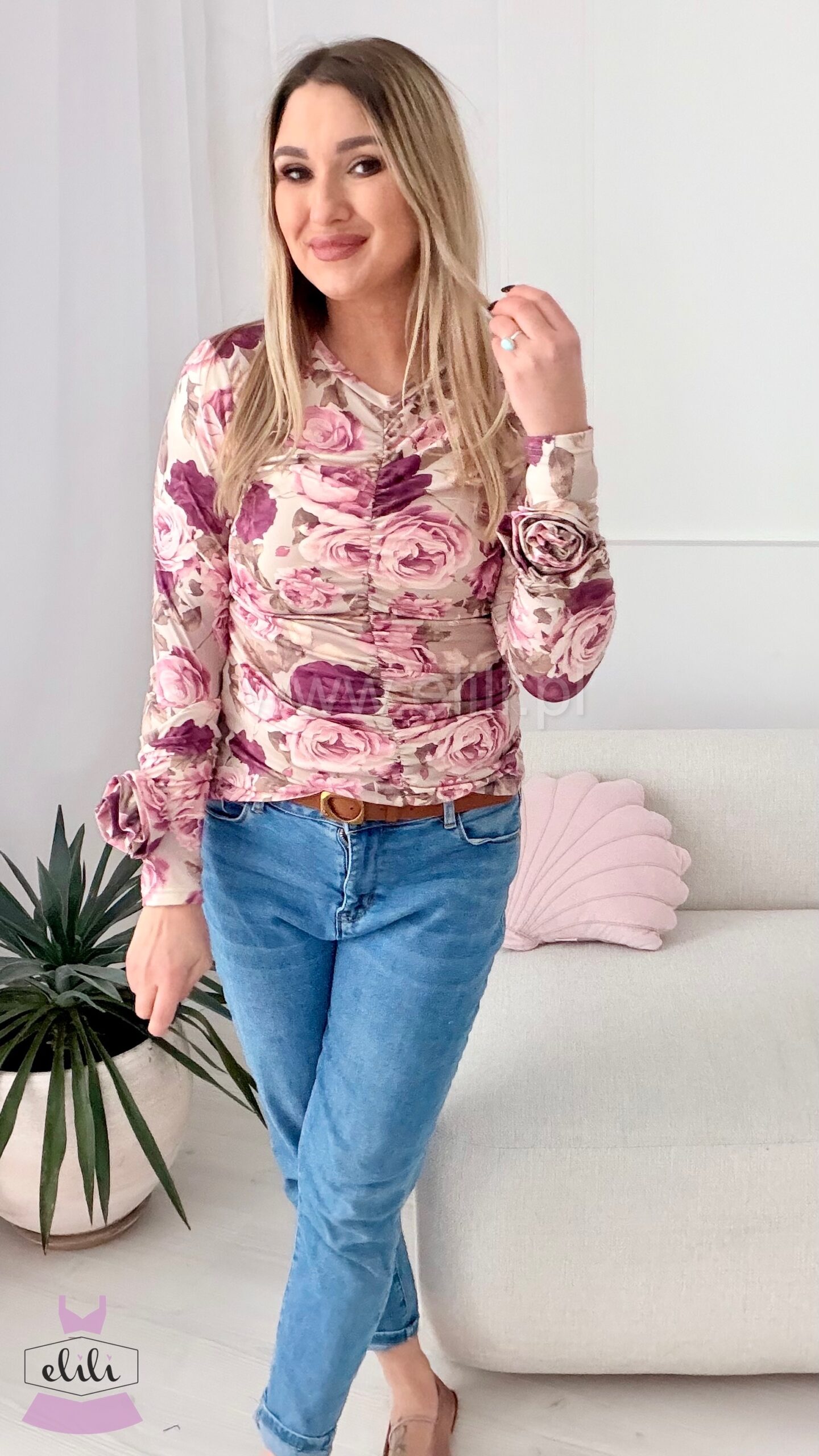 Wiskozowy model bardzo elastycznej bluzki z różąmi 3d na rekawie