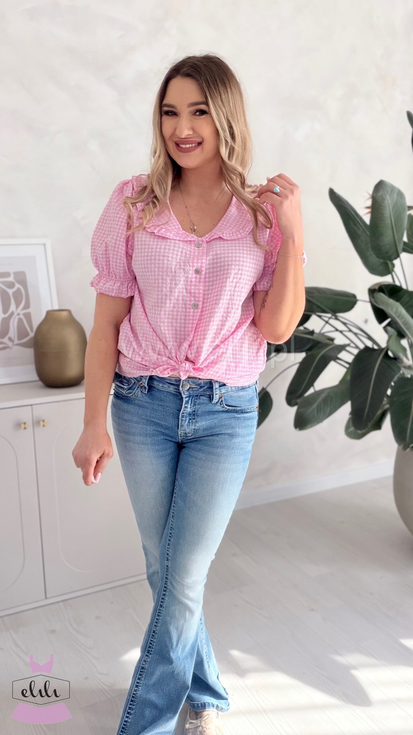 Bluzka z kołnierzykiem w kratke róż