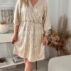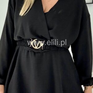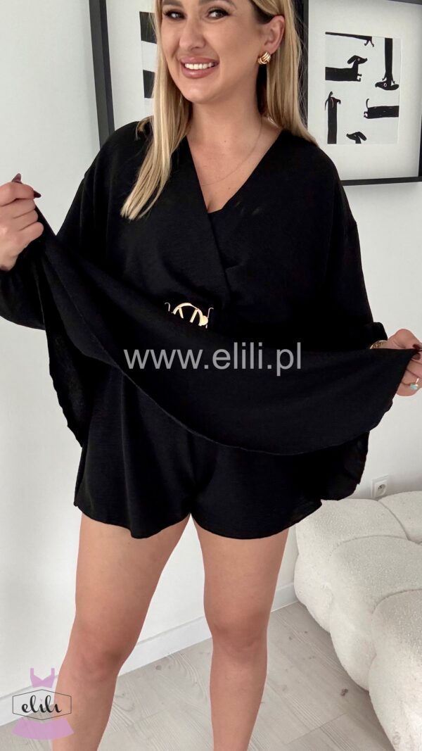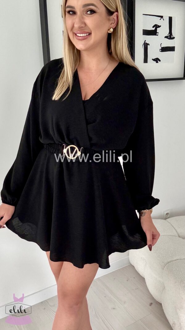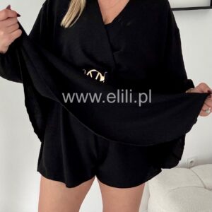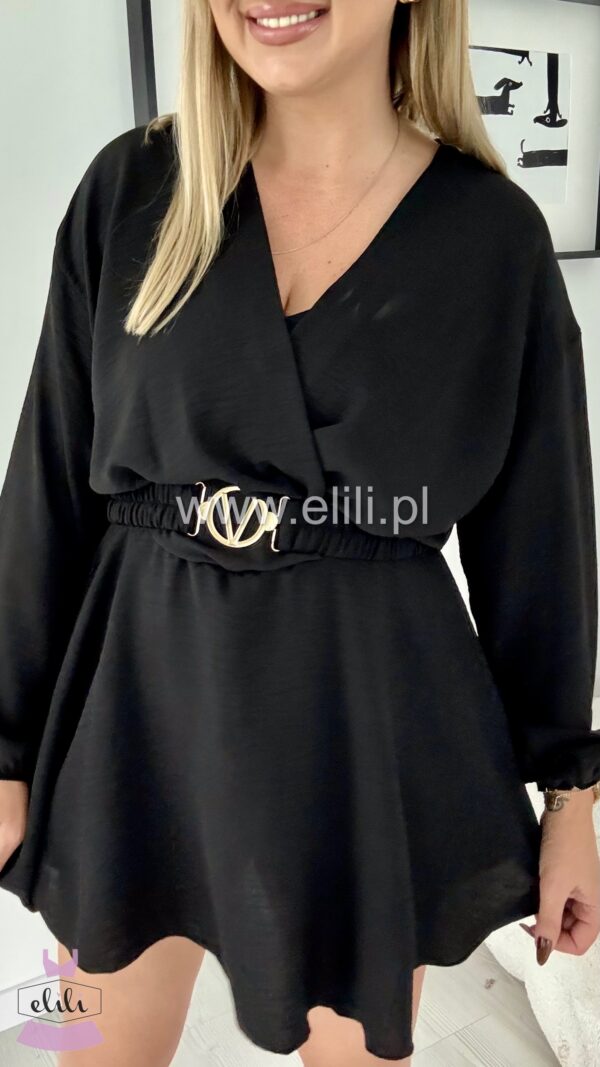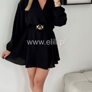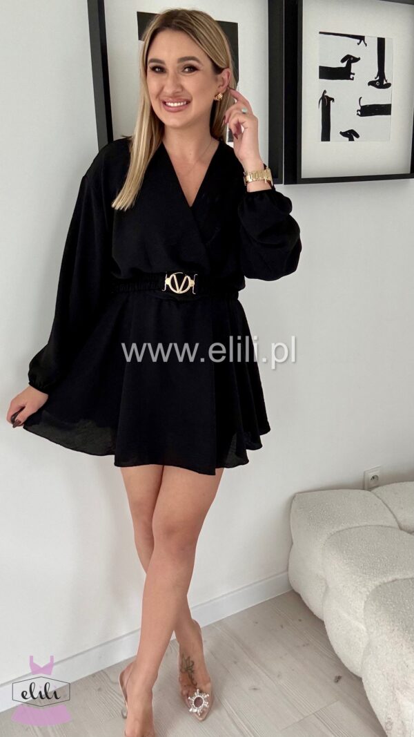 Sukienka kombinezon o długości mini z kopertowym dekoltem oraz falbanką na dole sukienki.