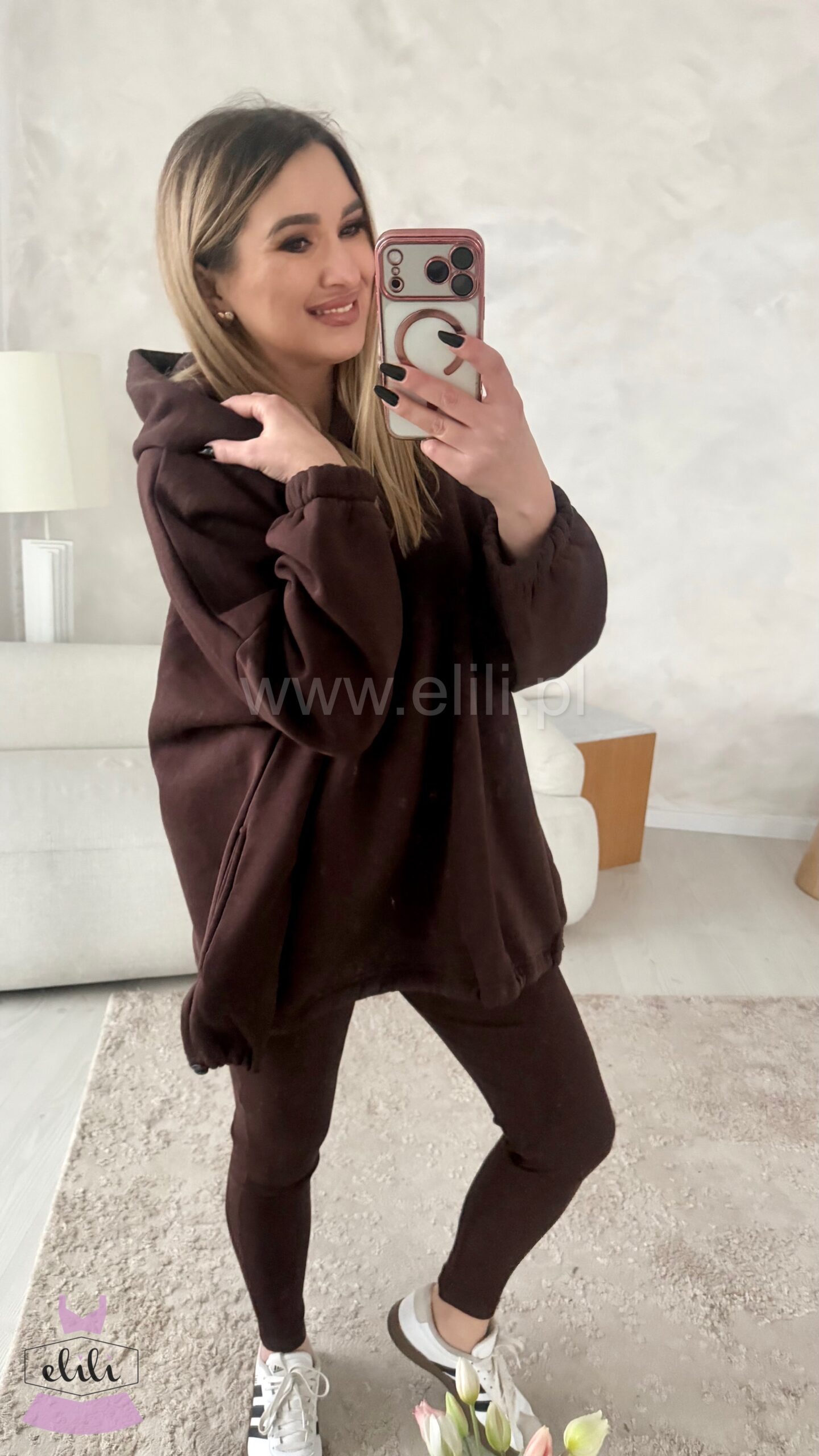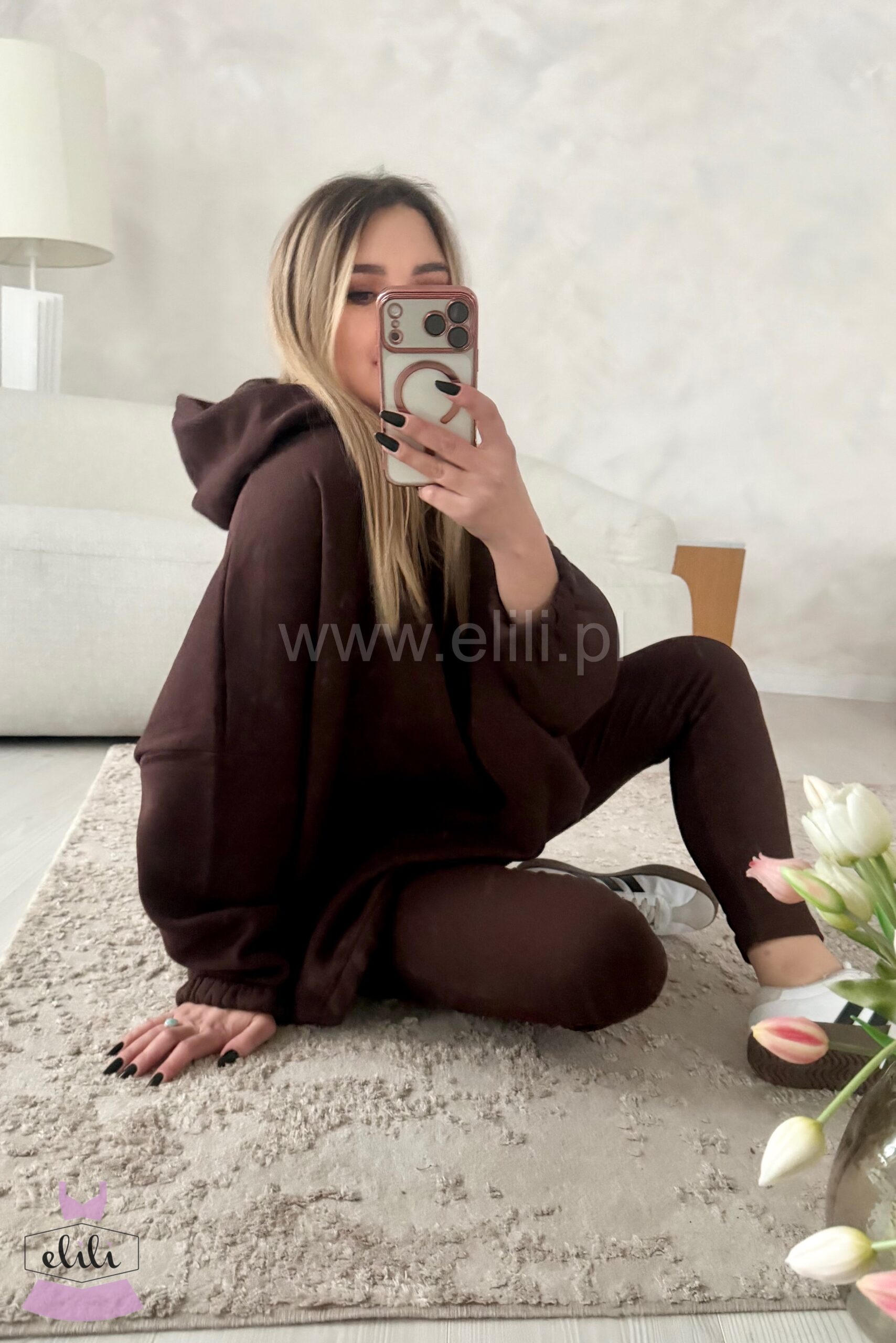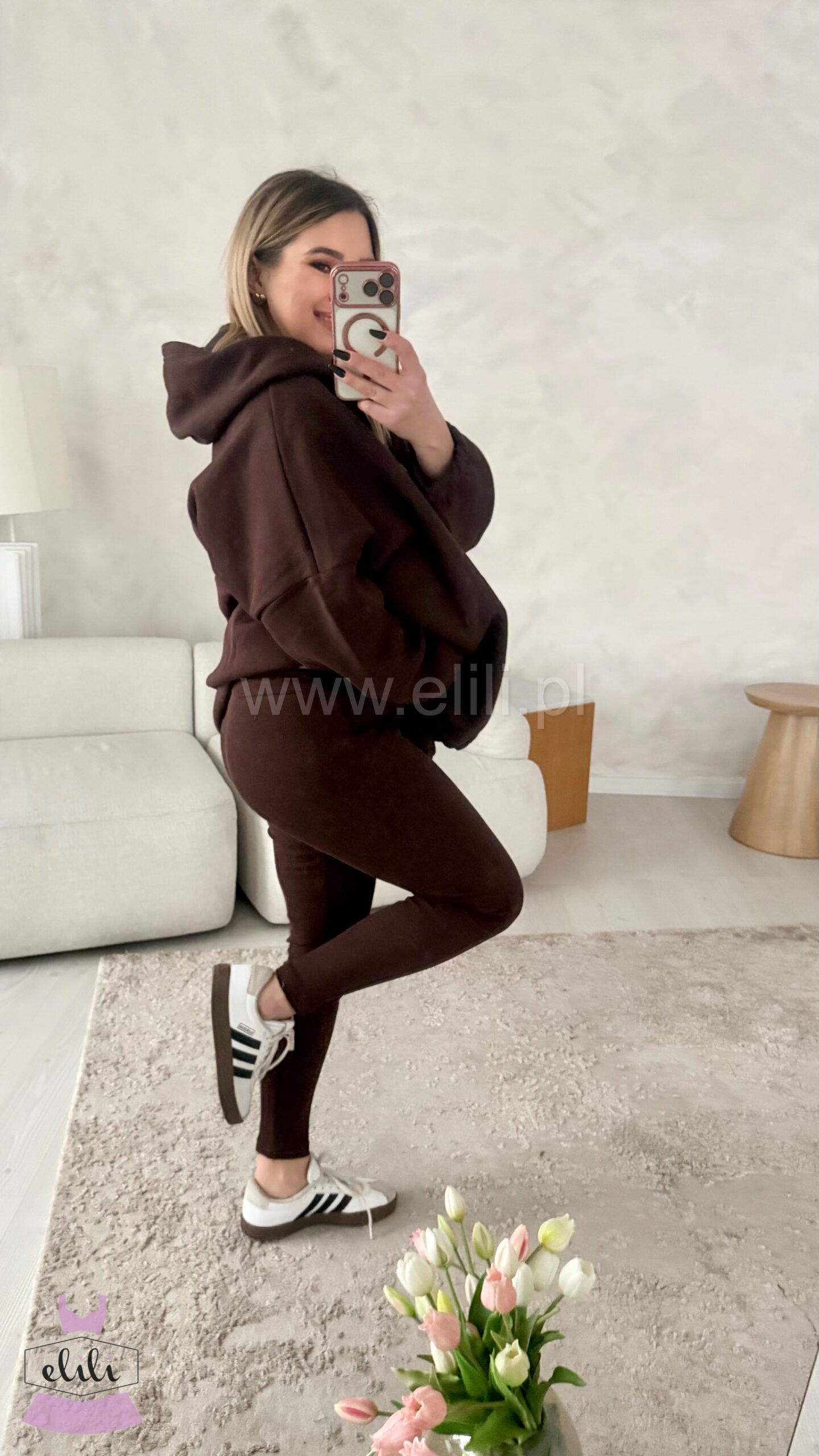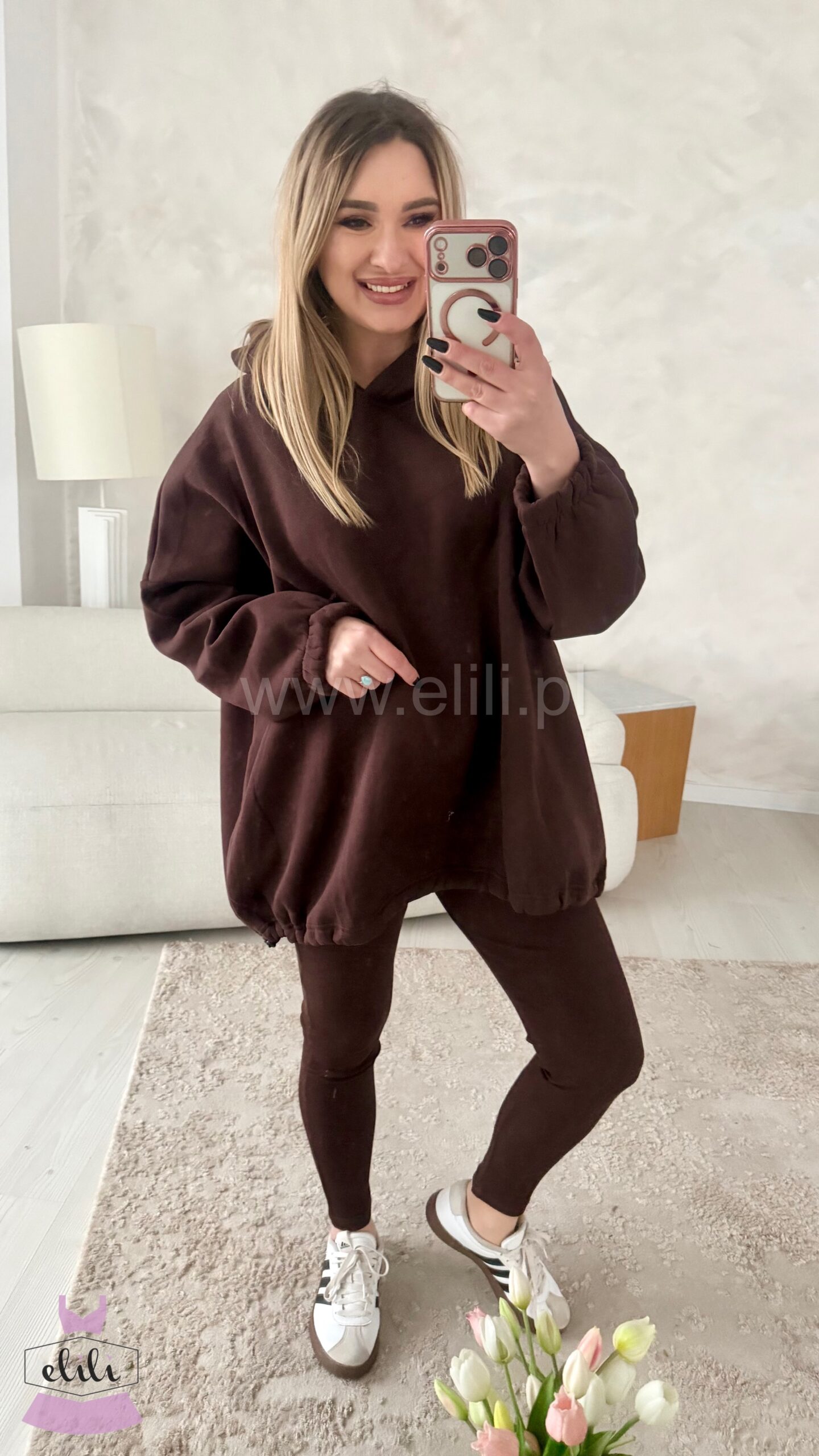 Komplet składający się z bardzo elastycznych legginsów z bawełny prążkowanej na gumie oraz delikatnie ocieplanej oversizowej bluzy z kapturem zakończonej sciągaczem