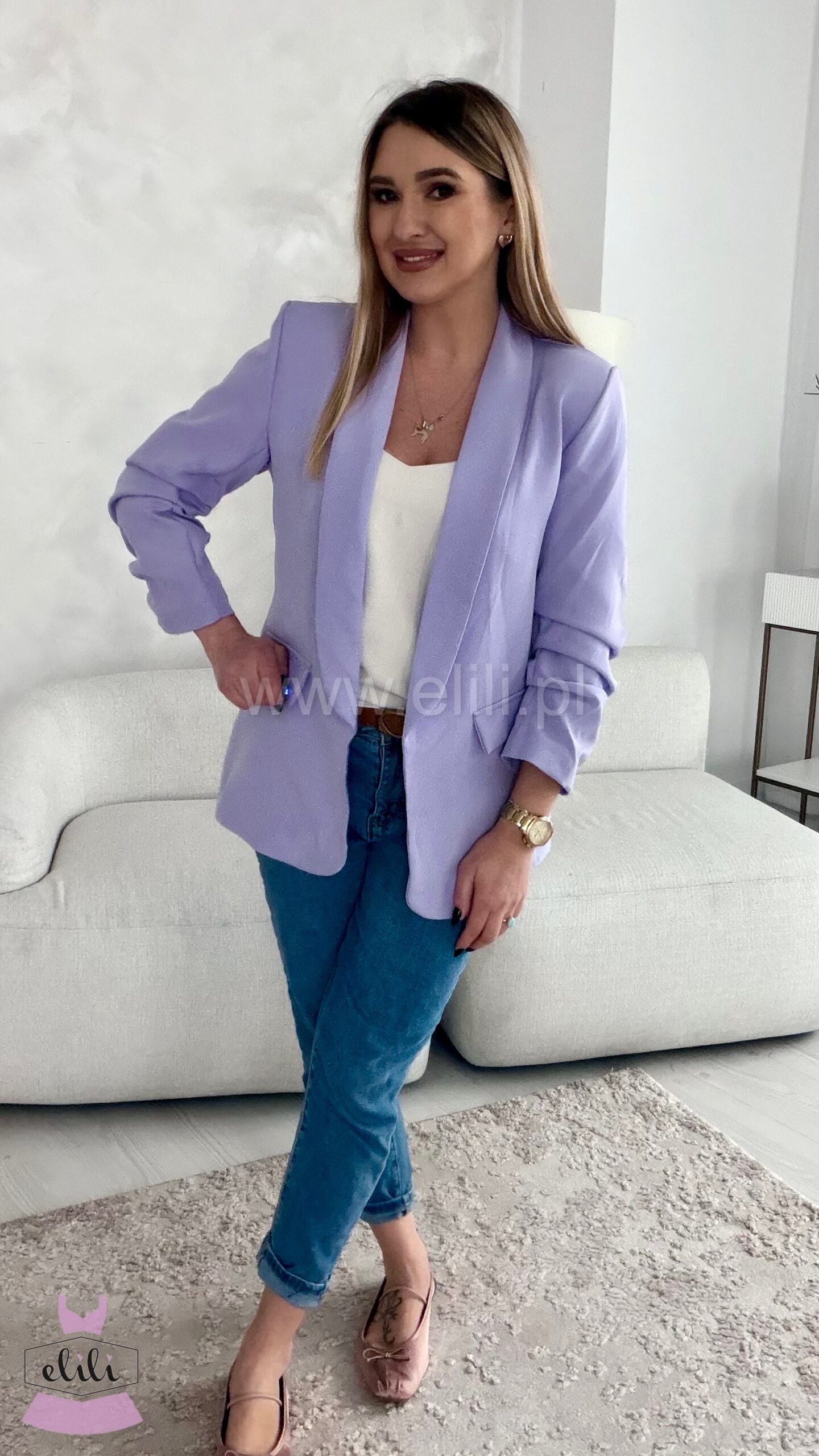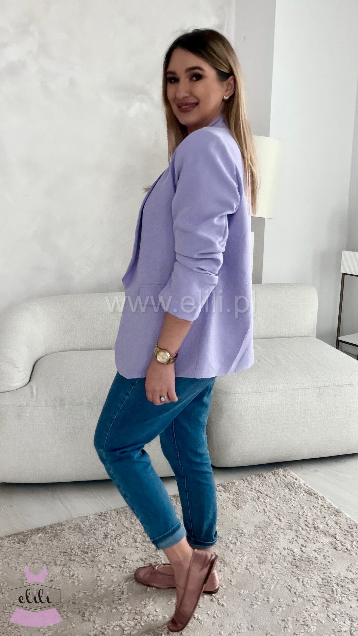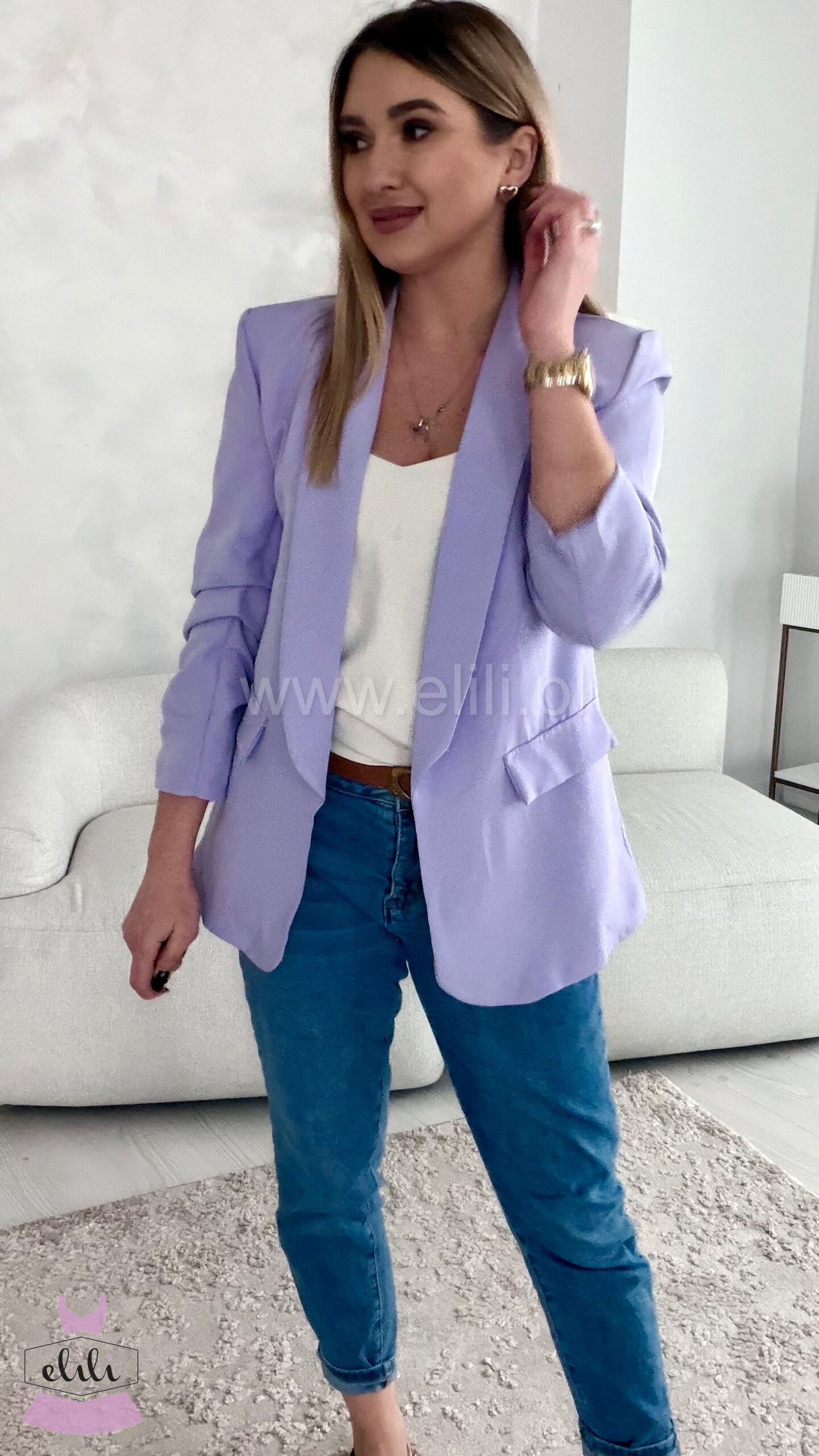 Ta delikatnie oversize’owa marynarka to połączenie klasycznej formy z modowym twistem. Luźniejszy krój subtelnie otula sylwetkę, nie tracąc przy tym eleganckiego charakteru. Dzięki pełnej podszewce marynarka dobrze się układa i zapewnia komfort noszenia, niezależnie od pory roku. Wyjątkowego charakteru dodają jej drapowania na mankietach, które przełamują prostotę fasonu i wprowadzają nutę nonszalancji – możesz nosić ją klasycznie lub z lekko podwiniętymi rękawami dla bardziej swobodnego efektu. To model idealny zarówno do biura, jak i na co dzień – pasuje do jeansów, spodni garniturowych, a nawet zwiewnych sukienek. Stylowa, kobieca i wygodna – stanie się bazą wielu udanych stylizacji.