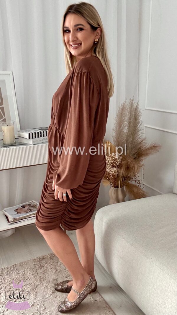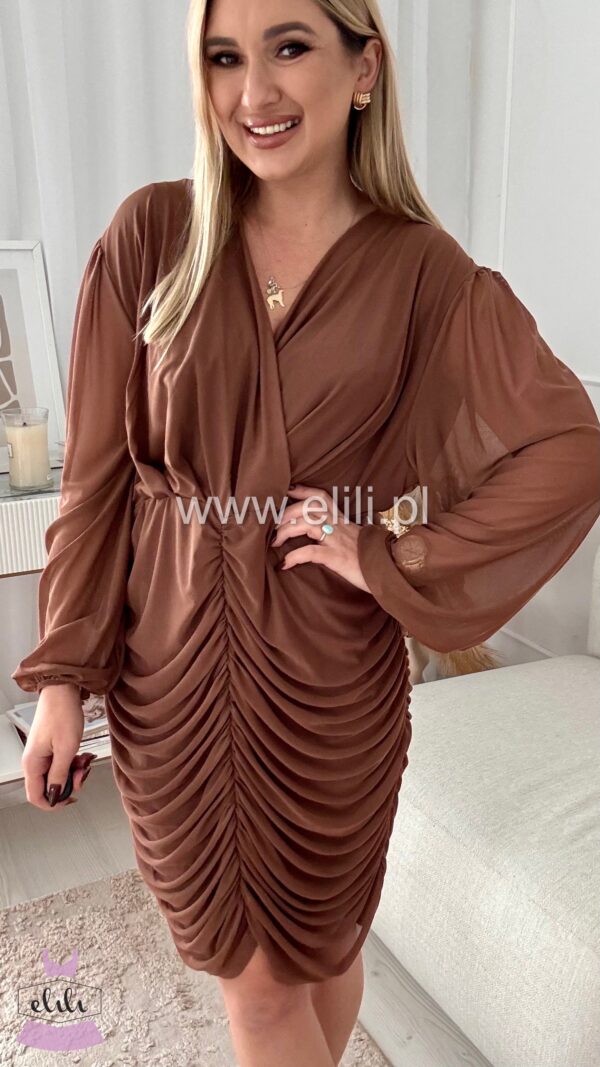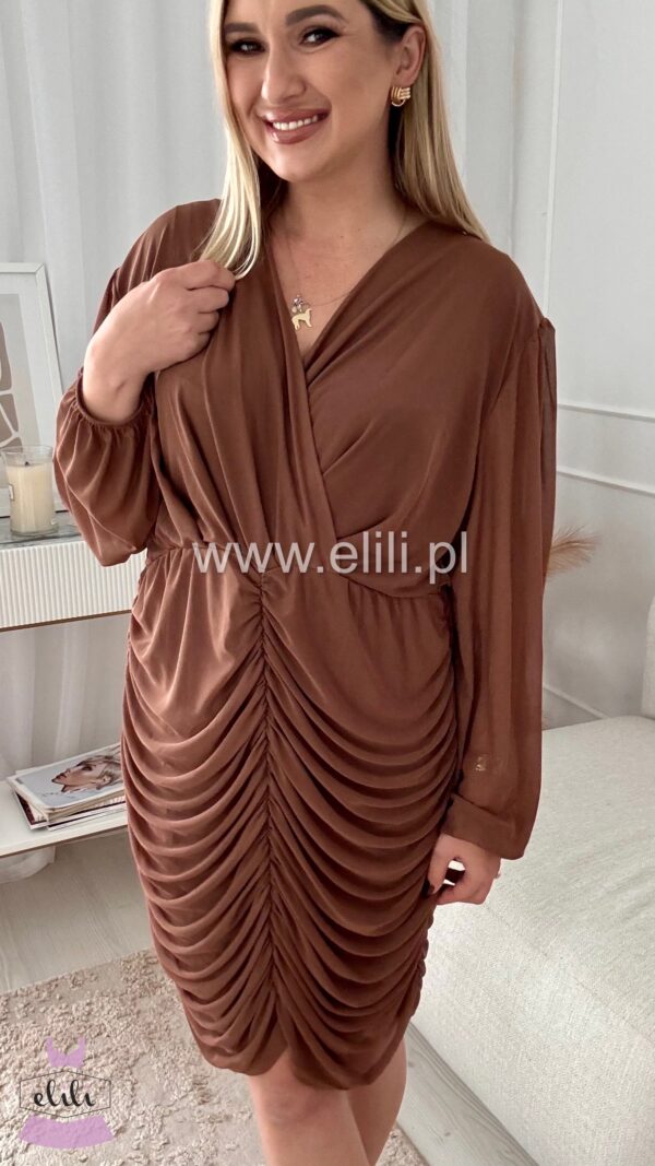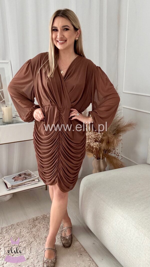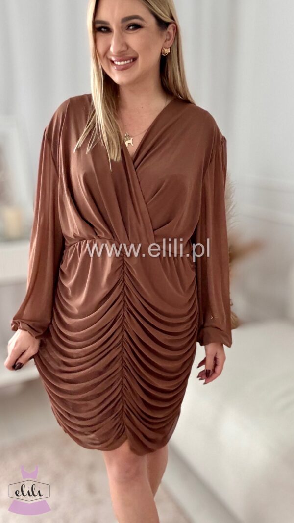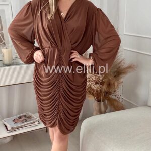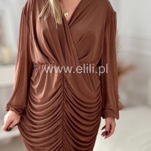 Dopasowana sukienka z drapowaniem to elegancka propozycja, która doskonale podkreśla sylwetkę, jednocześnie zapewniając komfort noszenia. Wykonana z bardzo elastycznego materiału, idealnie dopasowuje się do ciała, subtelnie eksponując kształty. Drapowanie na przodzie dodaje sukience finezyjnego charakteru, a kopertowy dekolt wprowadza element zmysłowości, przyciągając wzrok i nadając całemu fasonowi wyjątkowego wdzięku. To idealna sukienka na wieczorne wyjścia, koktajlowe przyjęcia czy romantyczne spotkania, łącząca elegancję z nowoczesnym stylem.