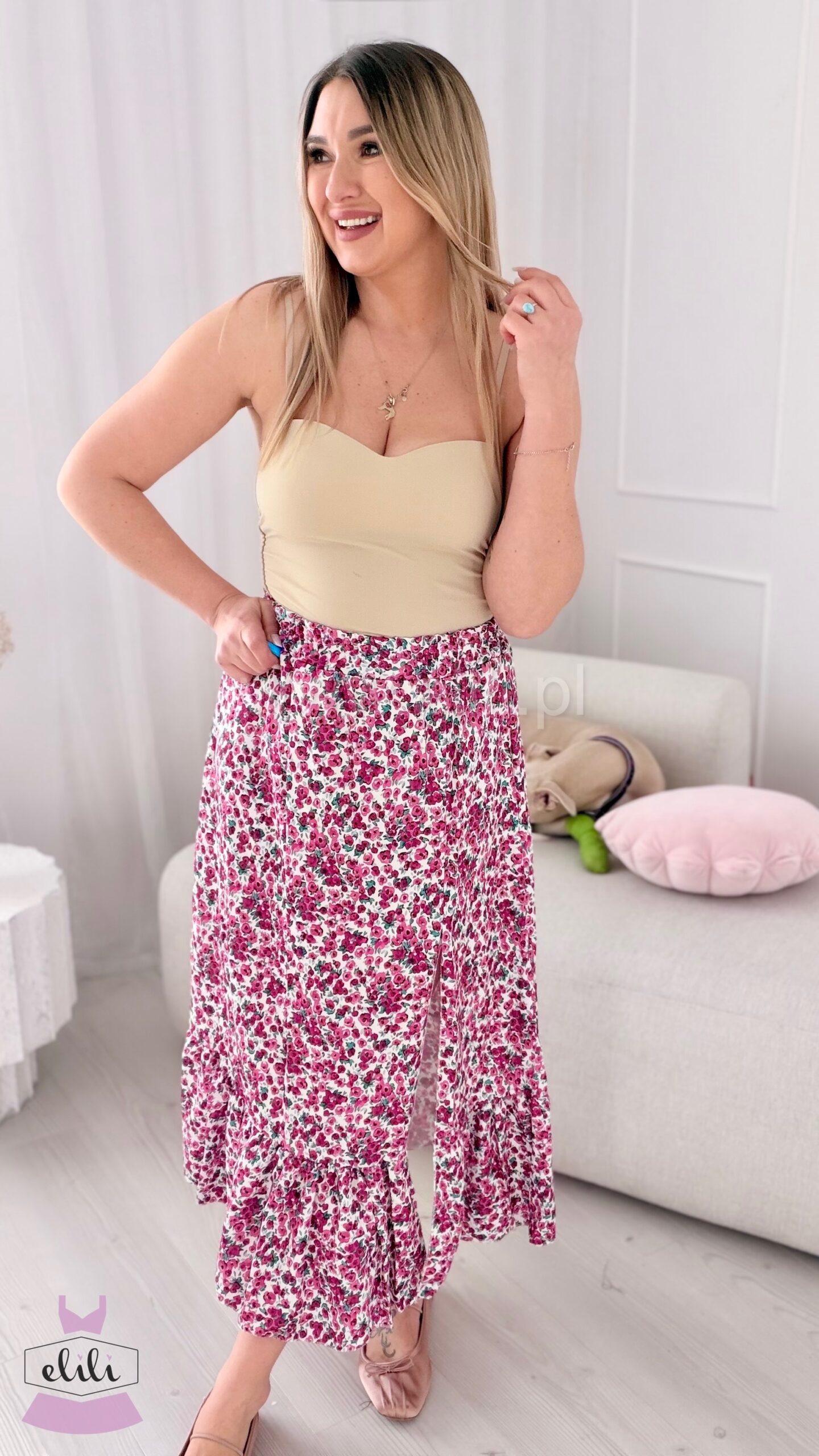 Spódnica midi z rozcięciem biała w różowe kwiatuszki
