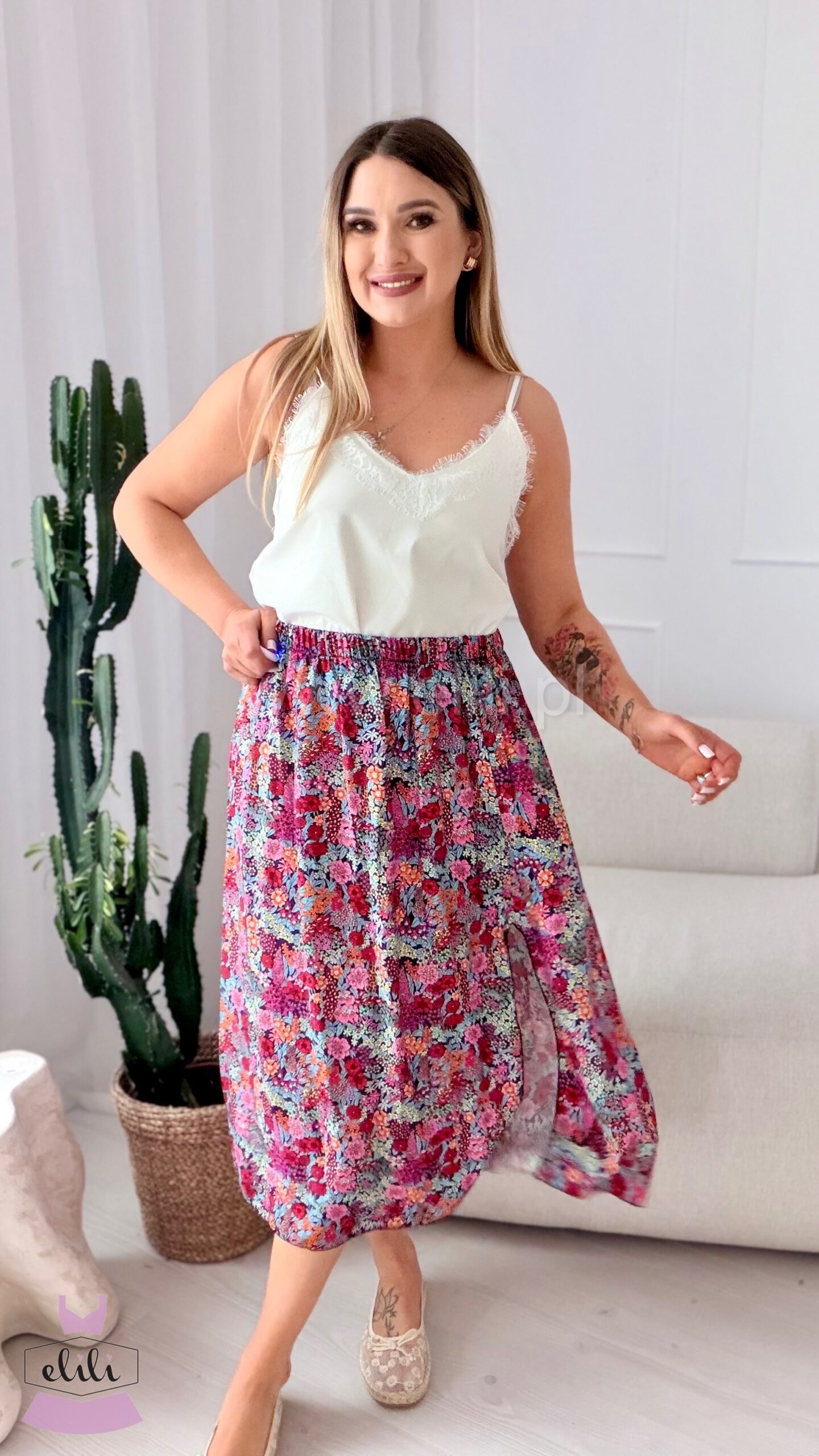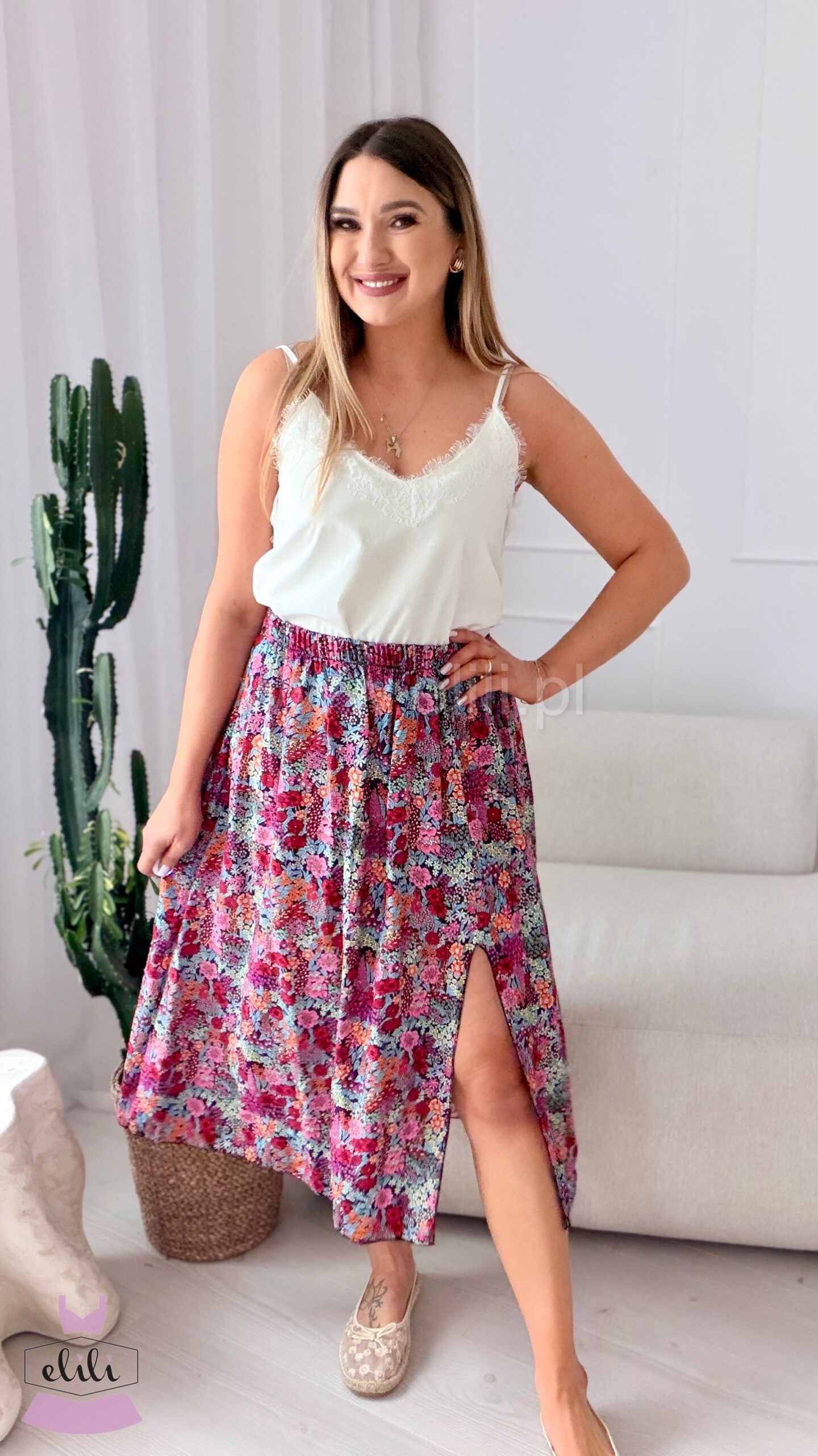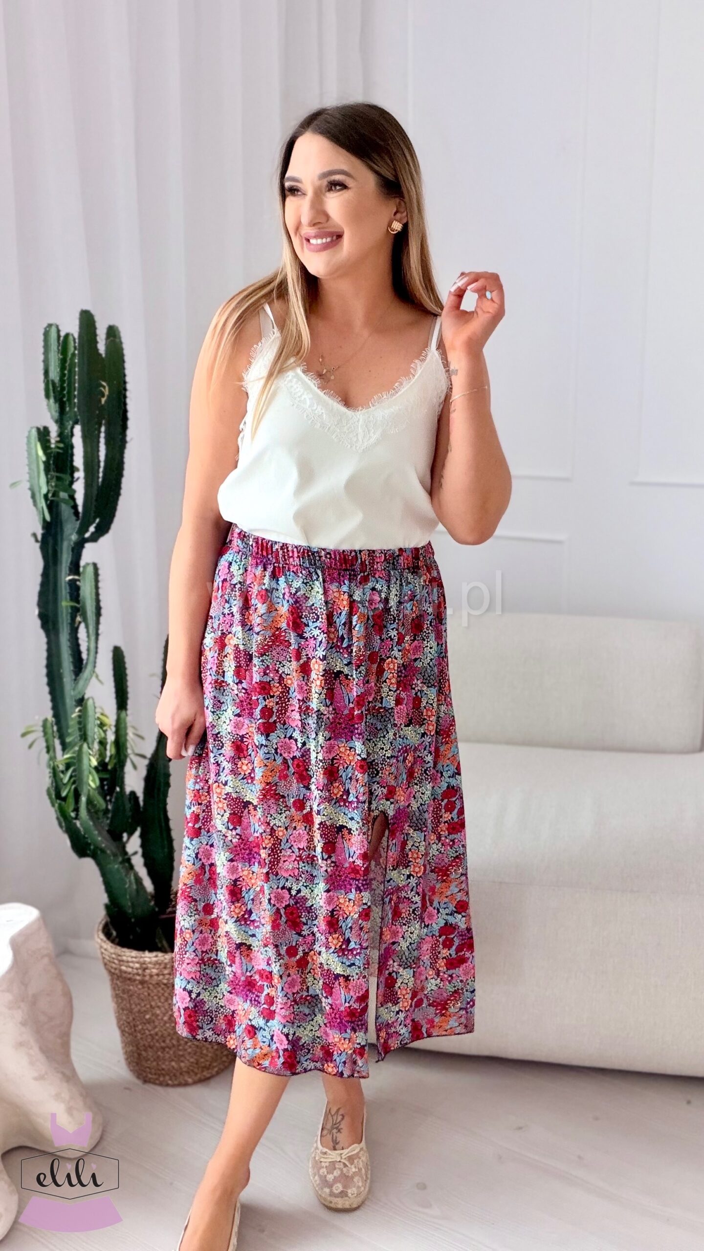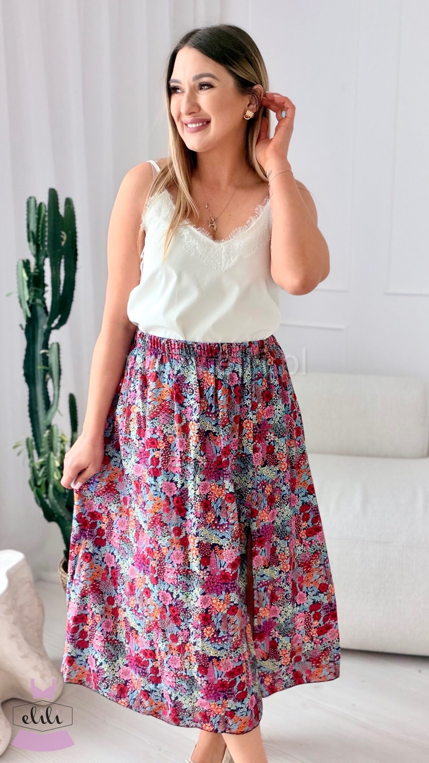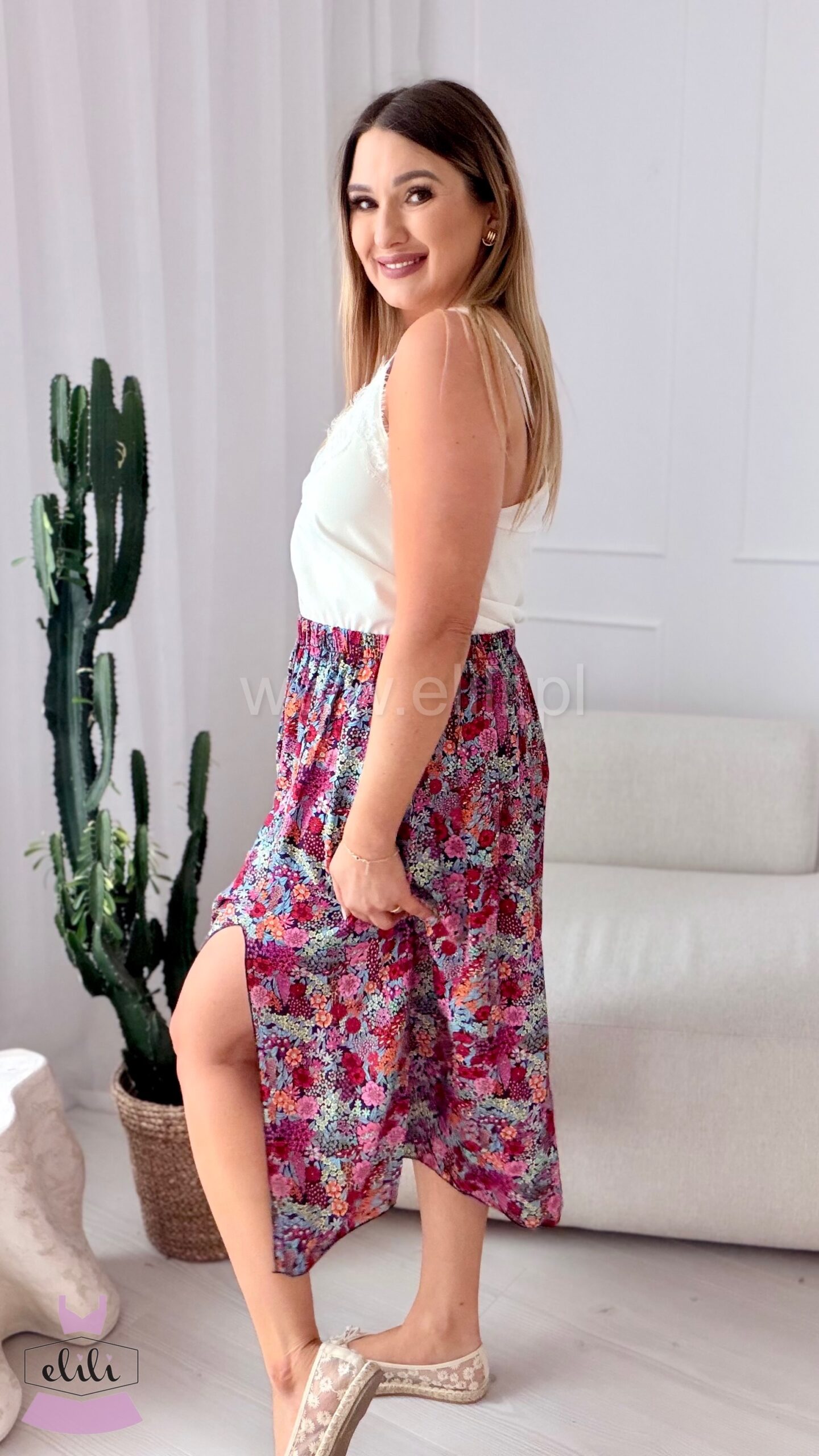 Spódnica na elastucznej gumie uszyta w 100% z wiskozy. Posiada rozcięcie