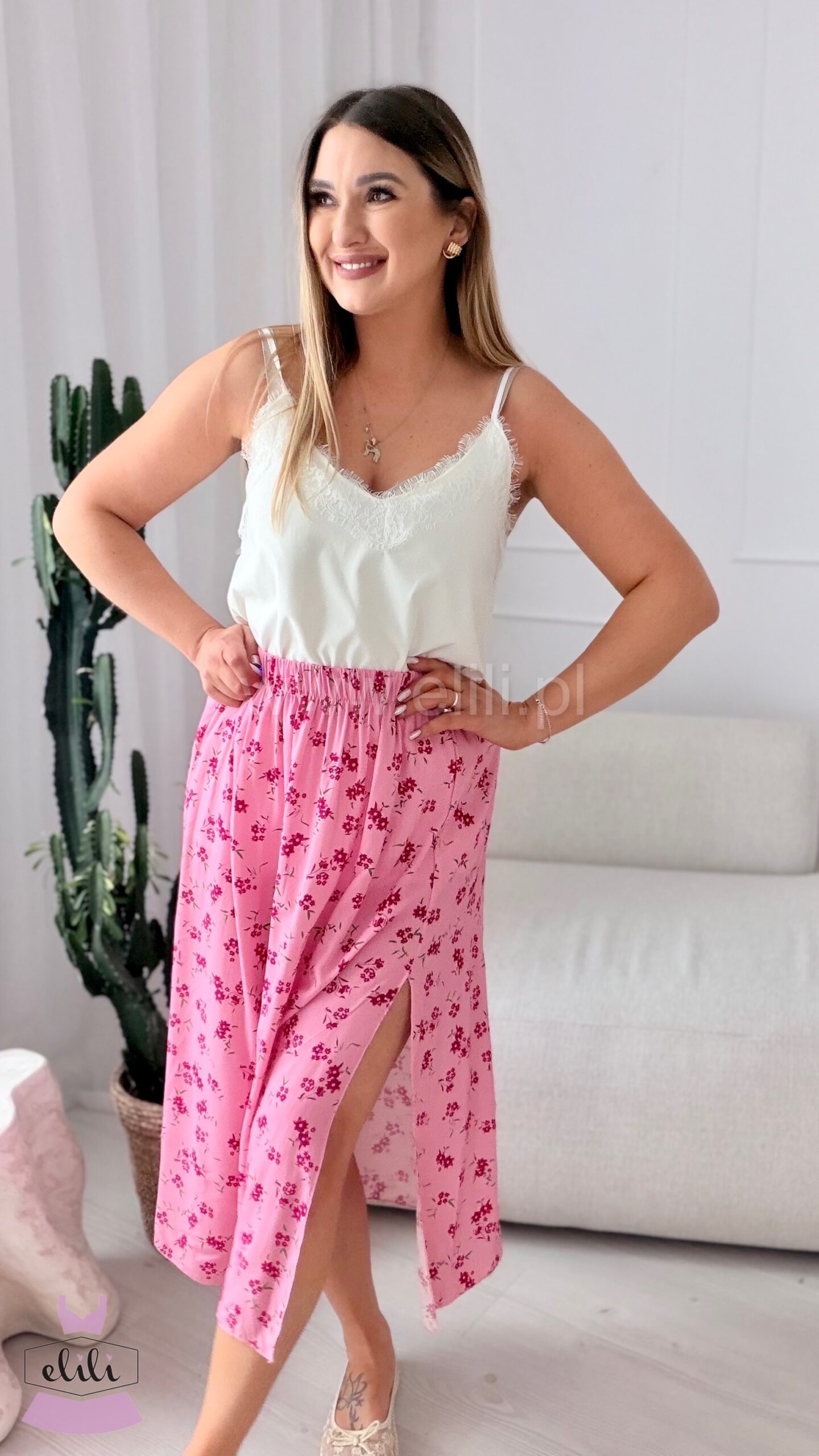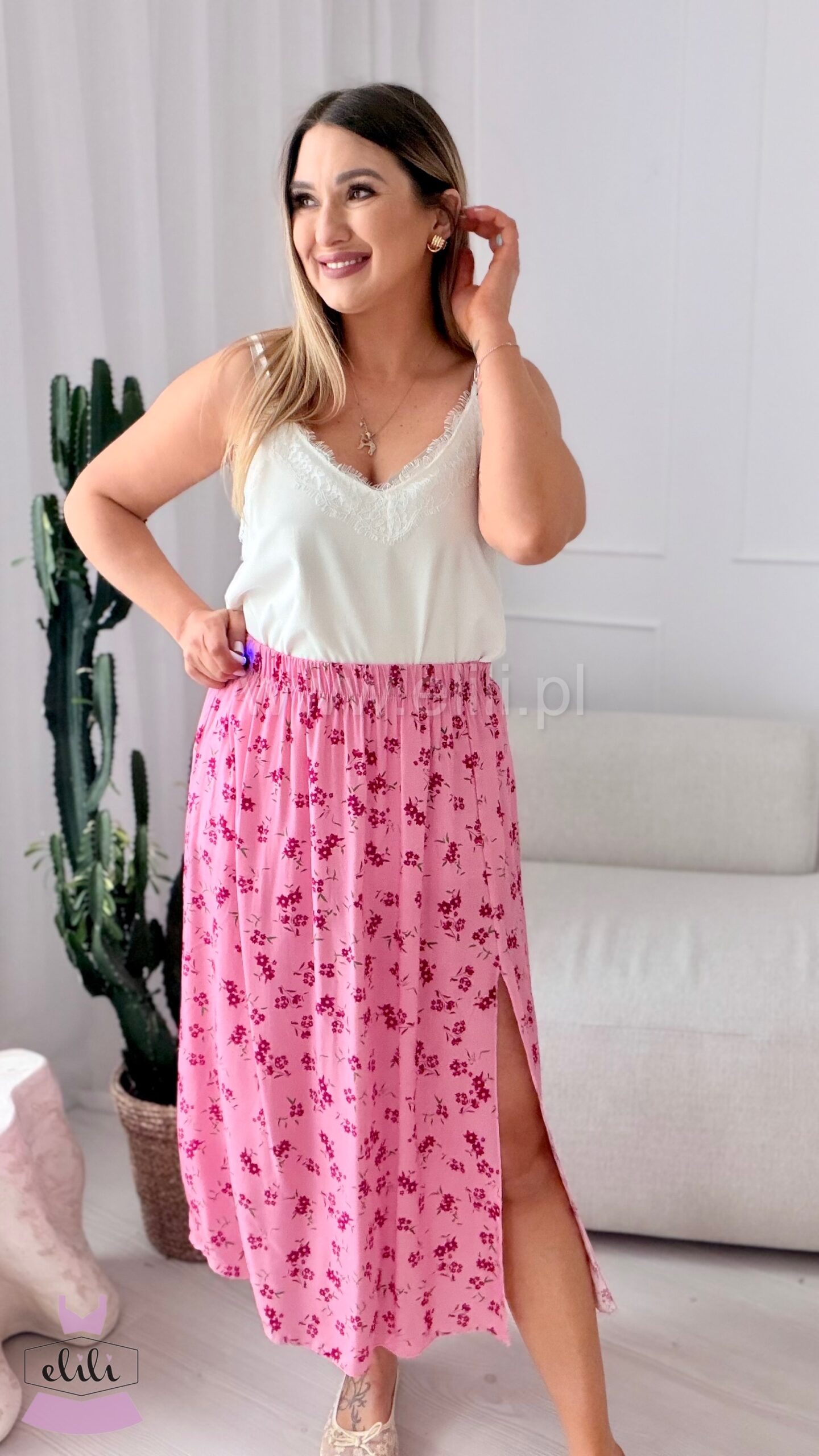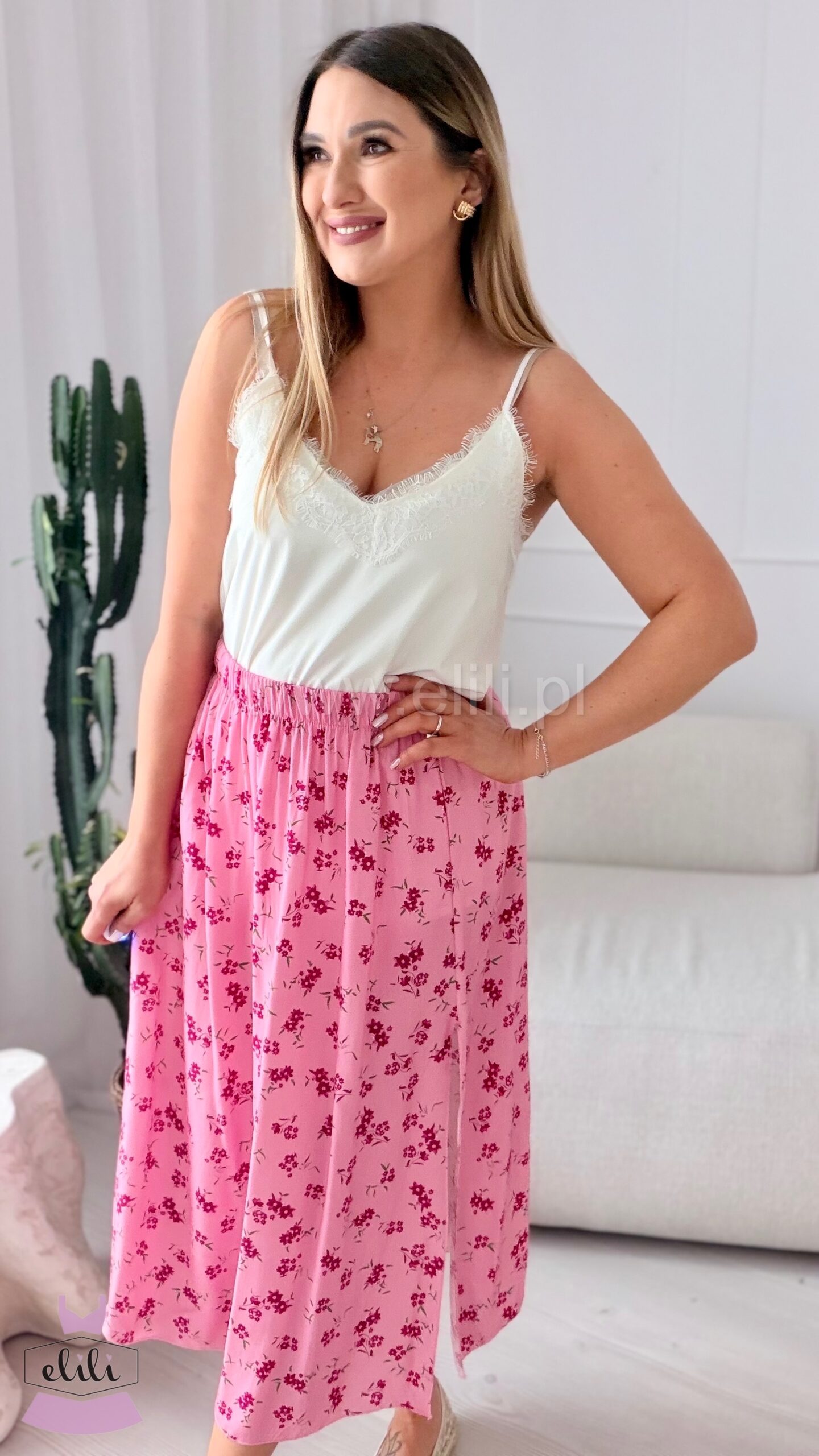Spódnica z wiskozy różowa w fuksjowe kwiaty