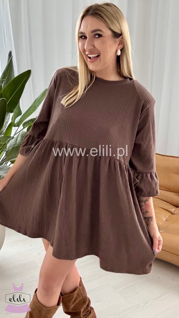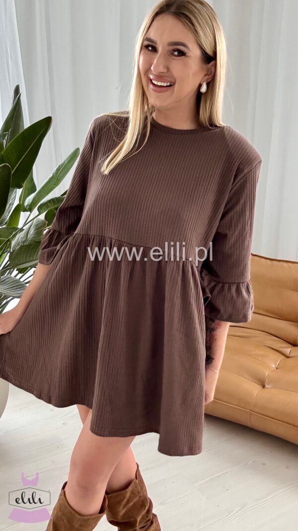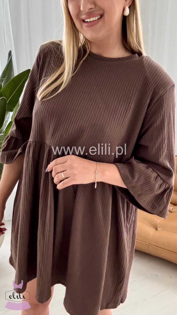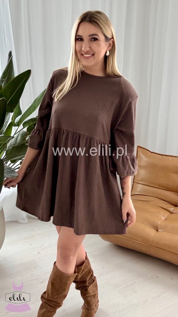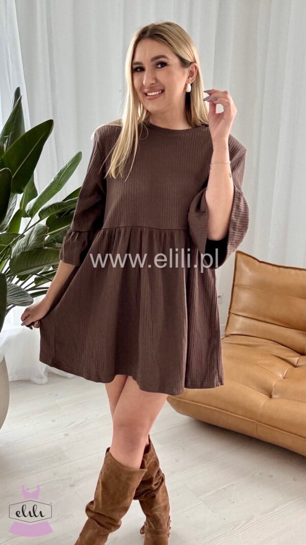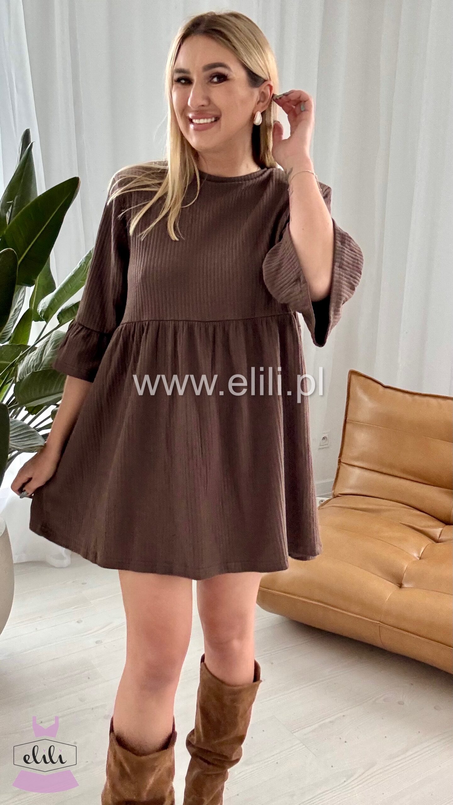 Sukienka o kroju typu baby doll. uszyta z prążkowanego materiału. posiada wszyte poduszki, które w razie potrzeby bez problemu można odpruć. Uszyta w polsce