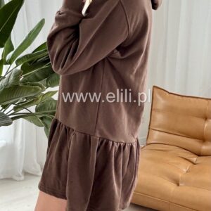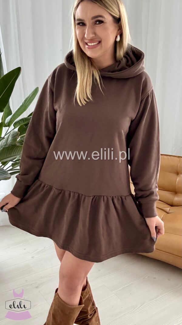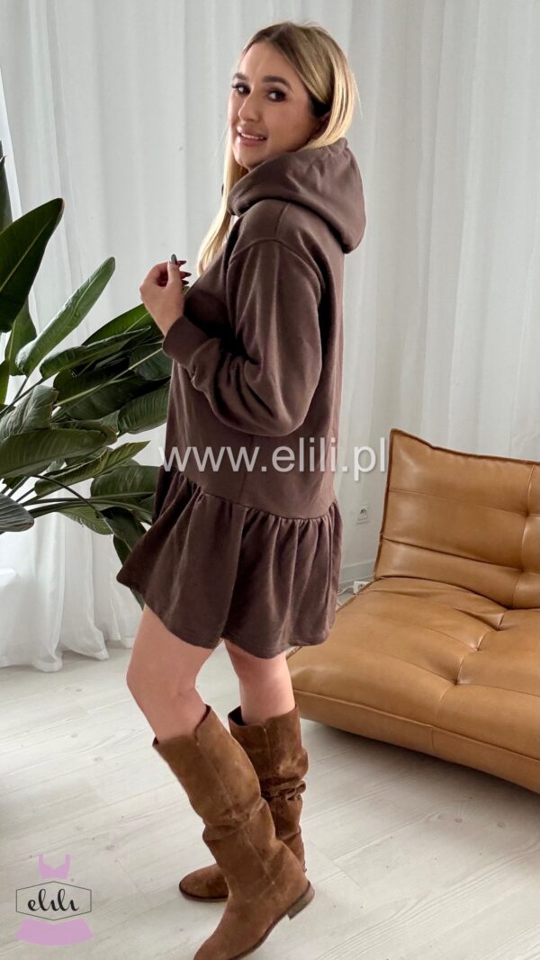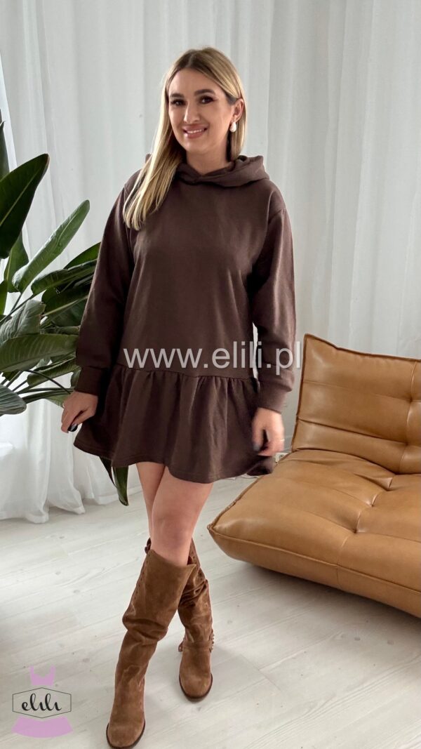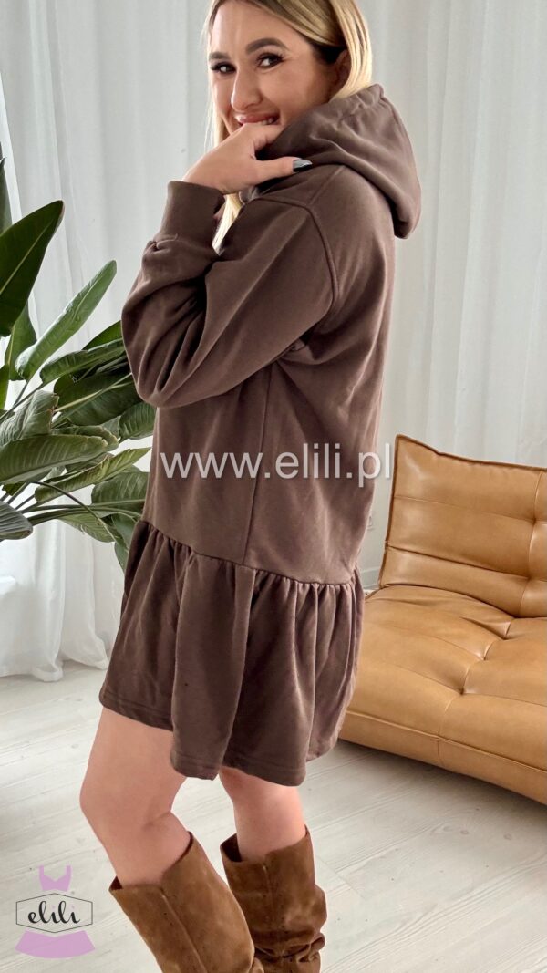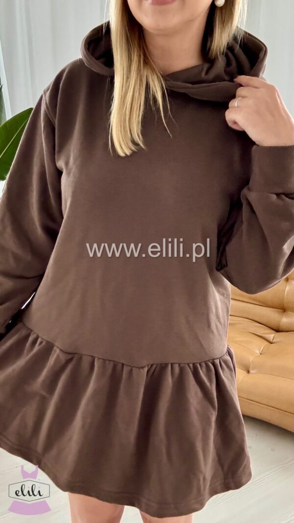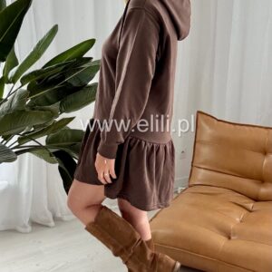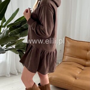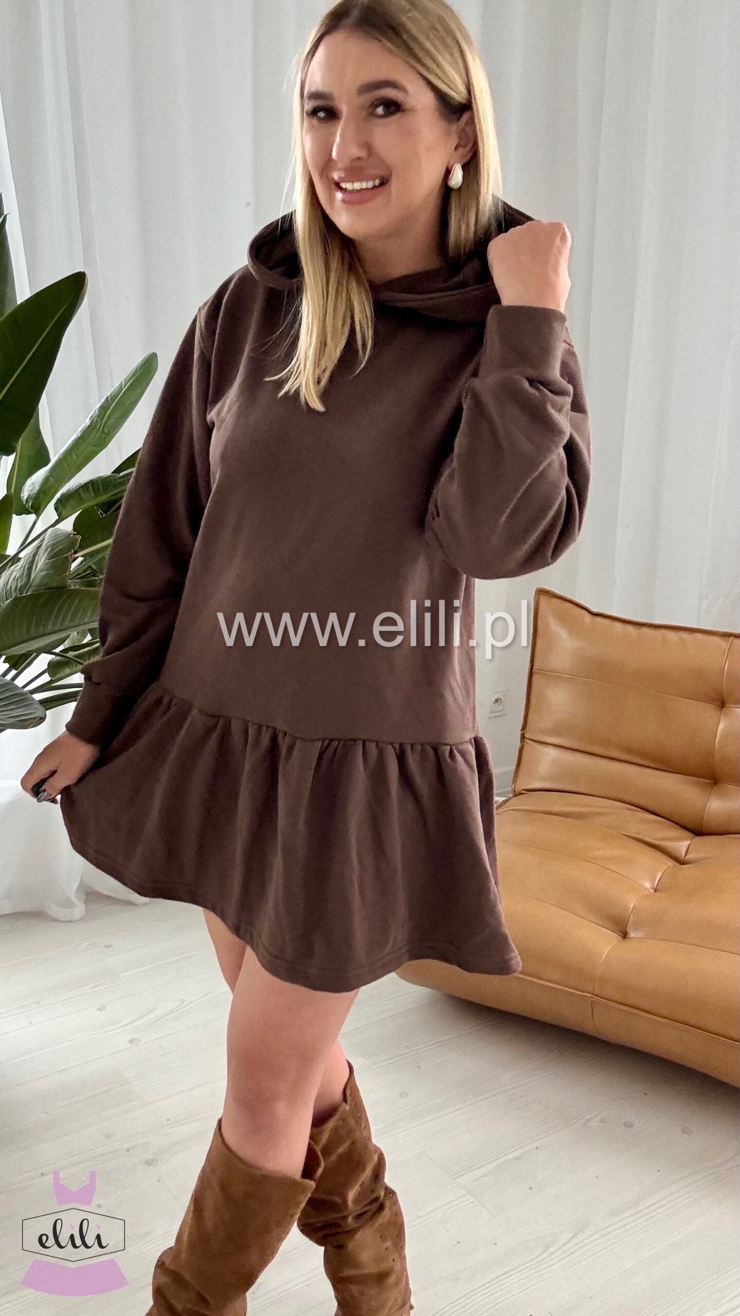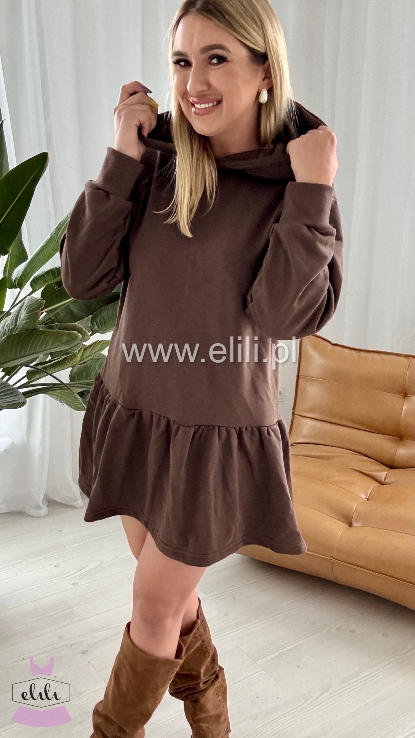 Bawełniany model sukienki typu baby doll z kapturem. Uszyta w Polsce
