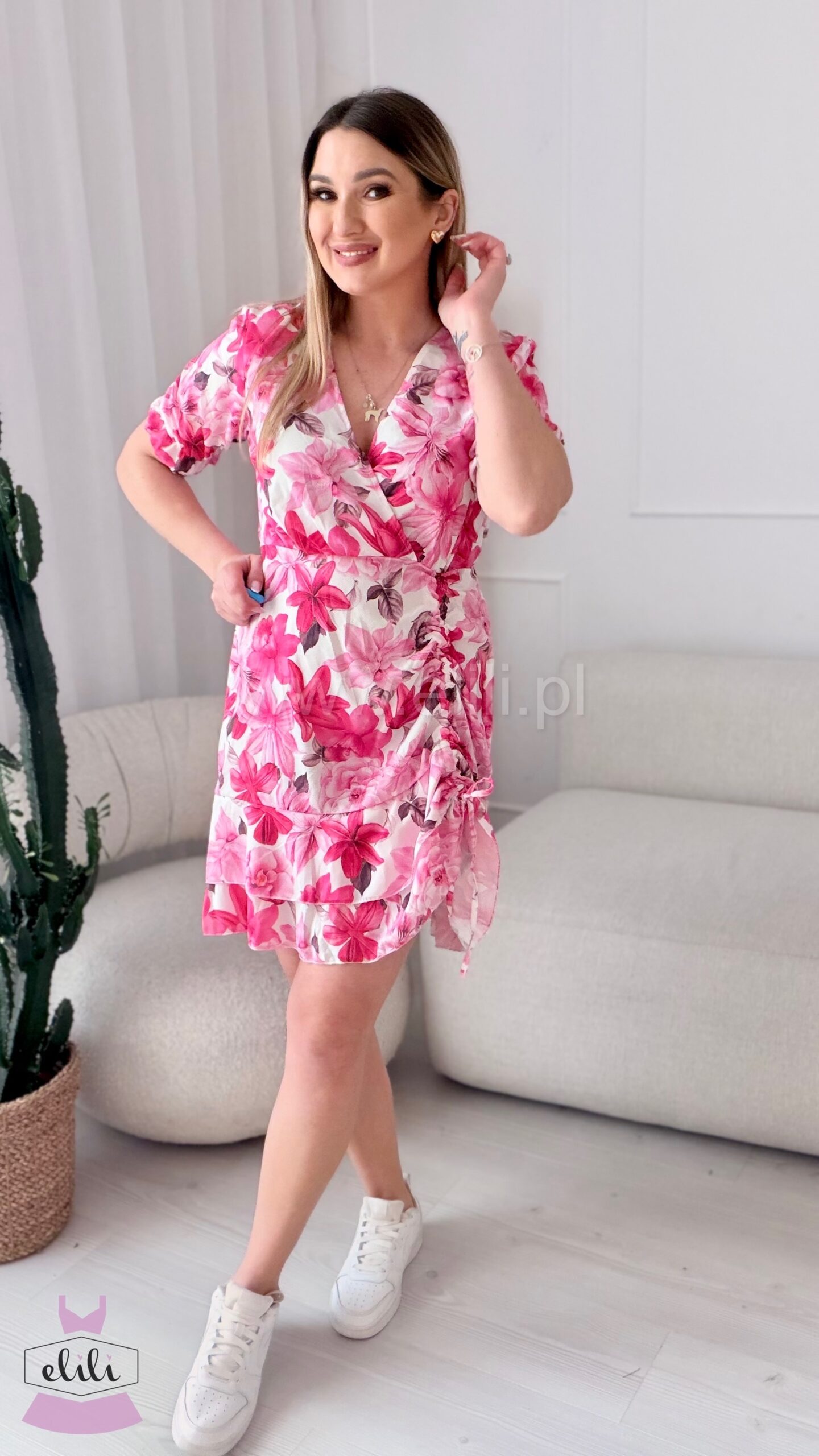 Sukienka posiada kopertowy dekolt, gumkę w talii i troczek na spódnicy.