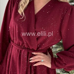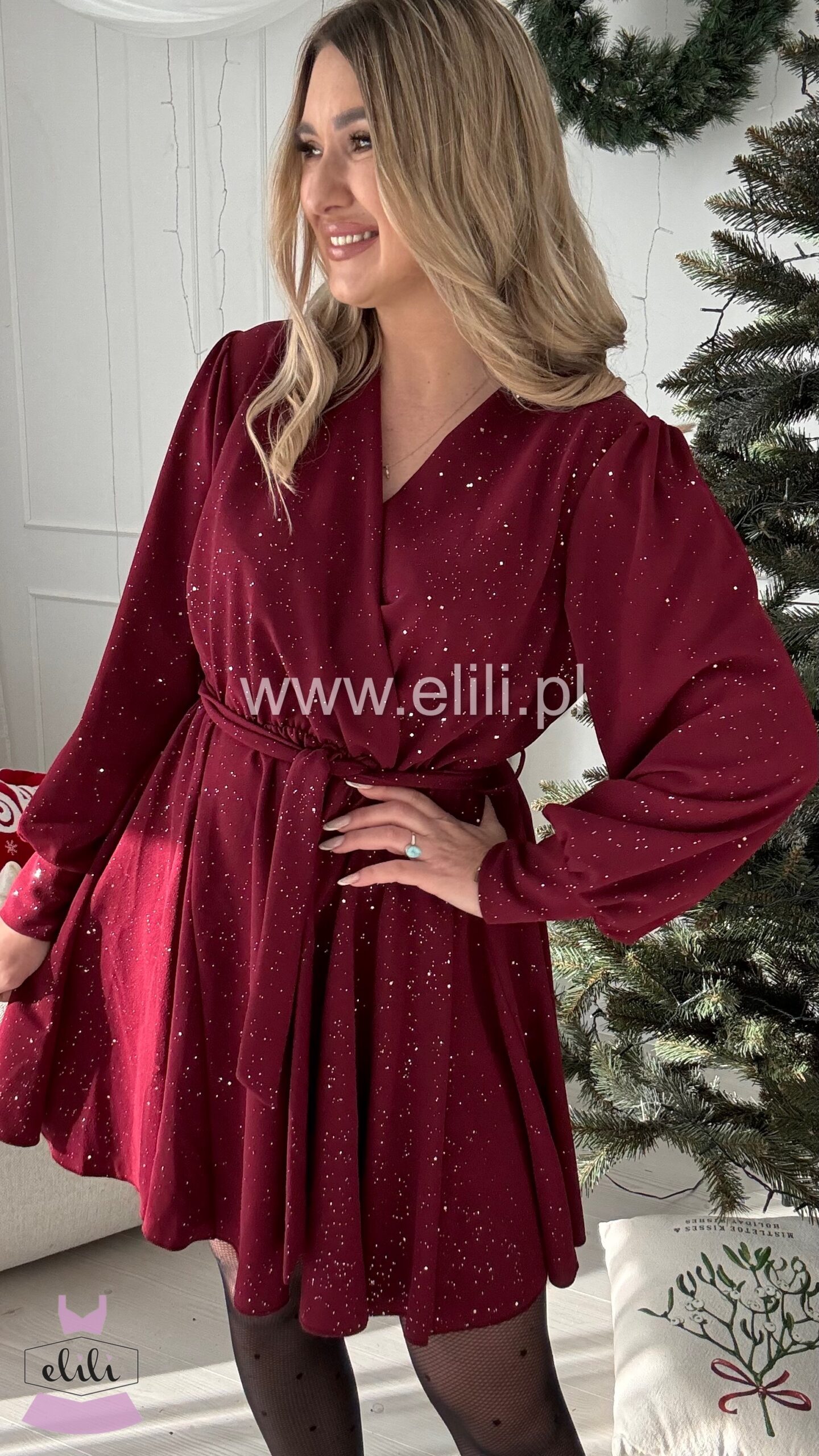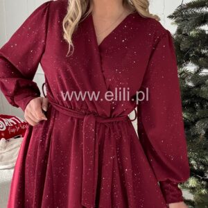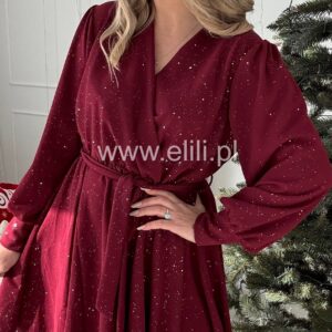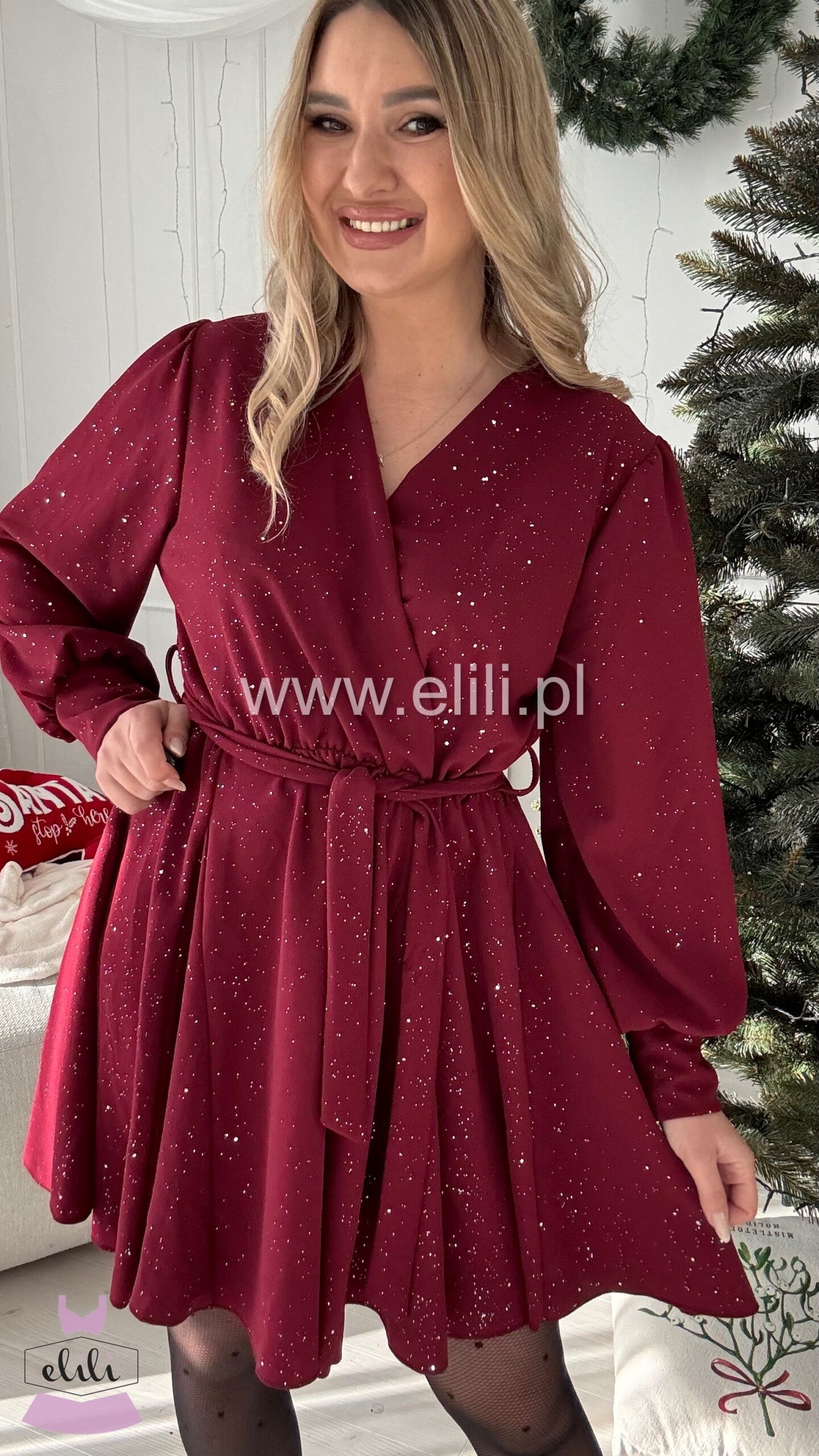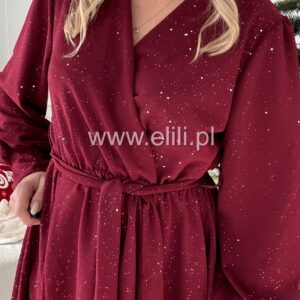 Sukienka z materiału z błyszczącymi aplikacjami. Posiada gumkę w talii oraz pasek