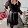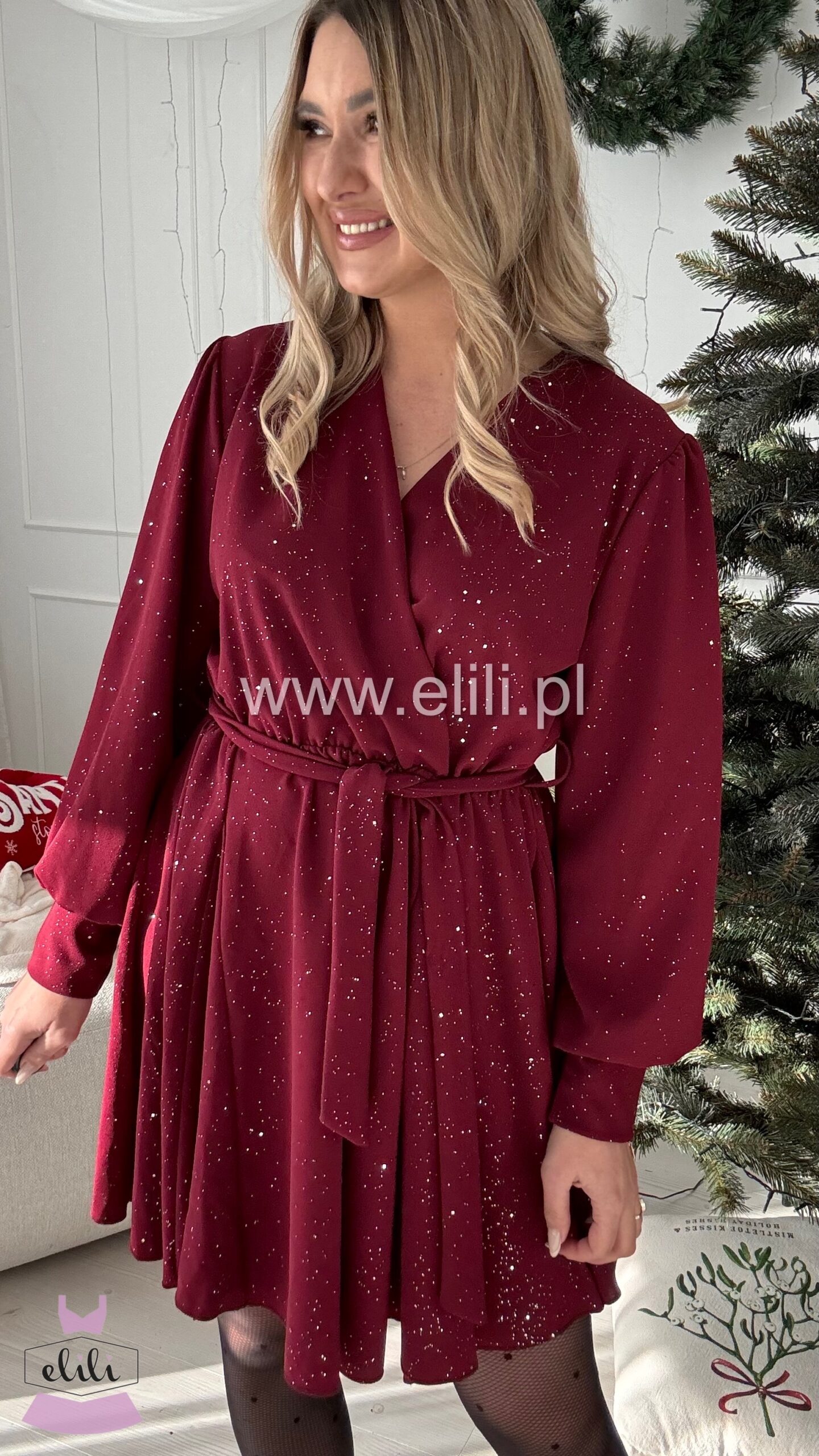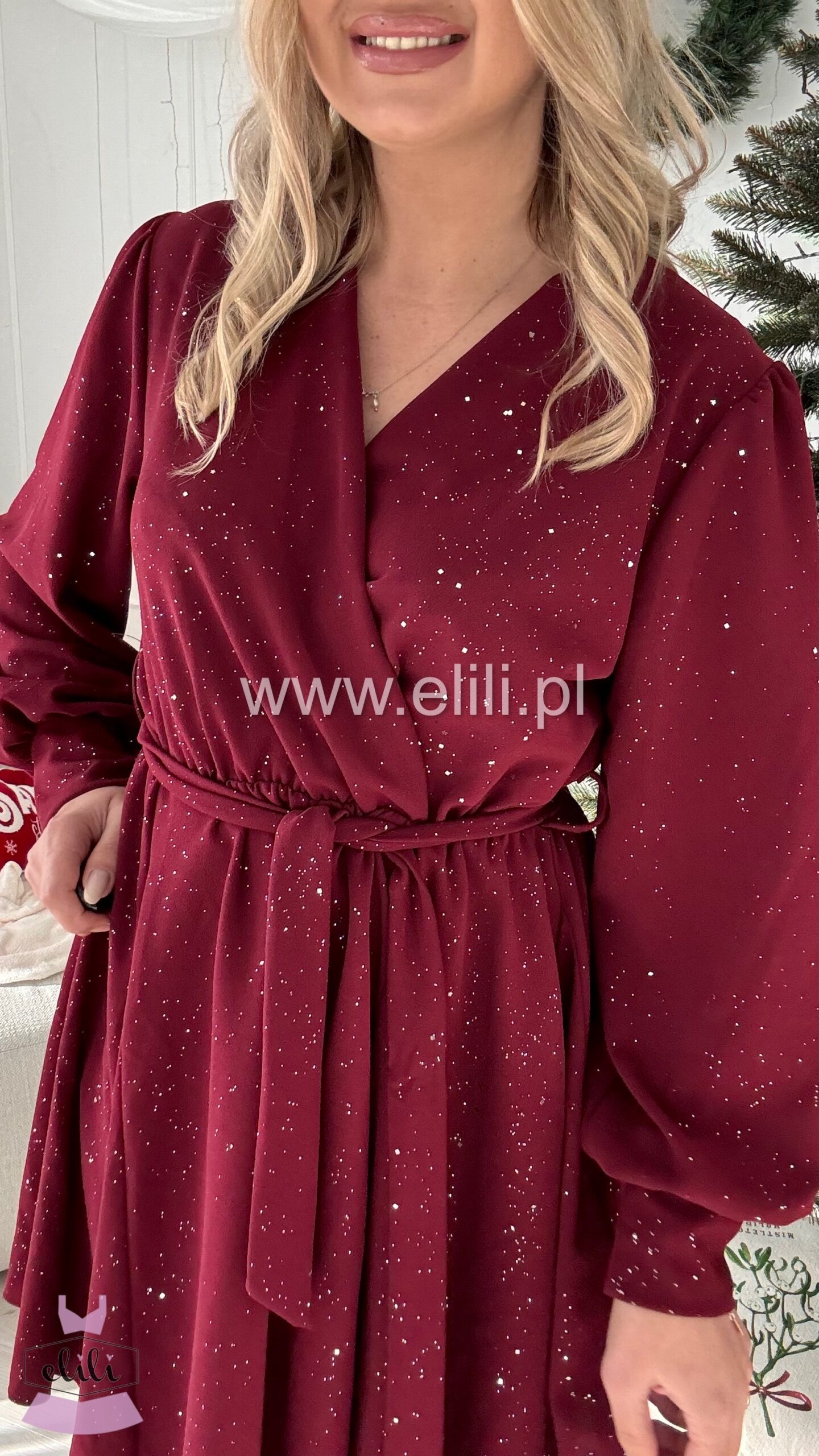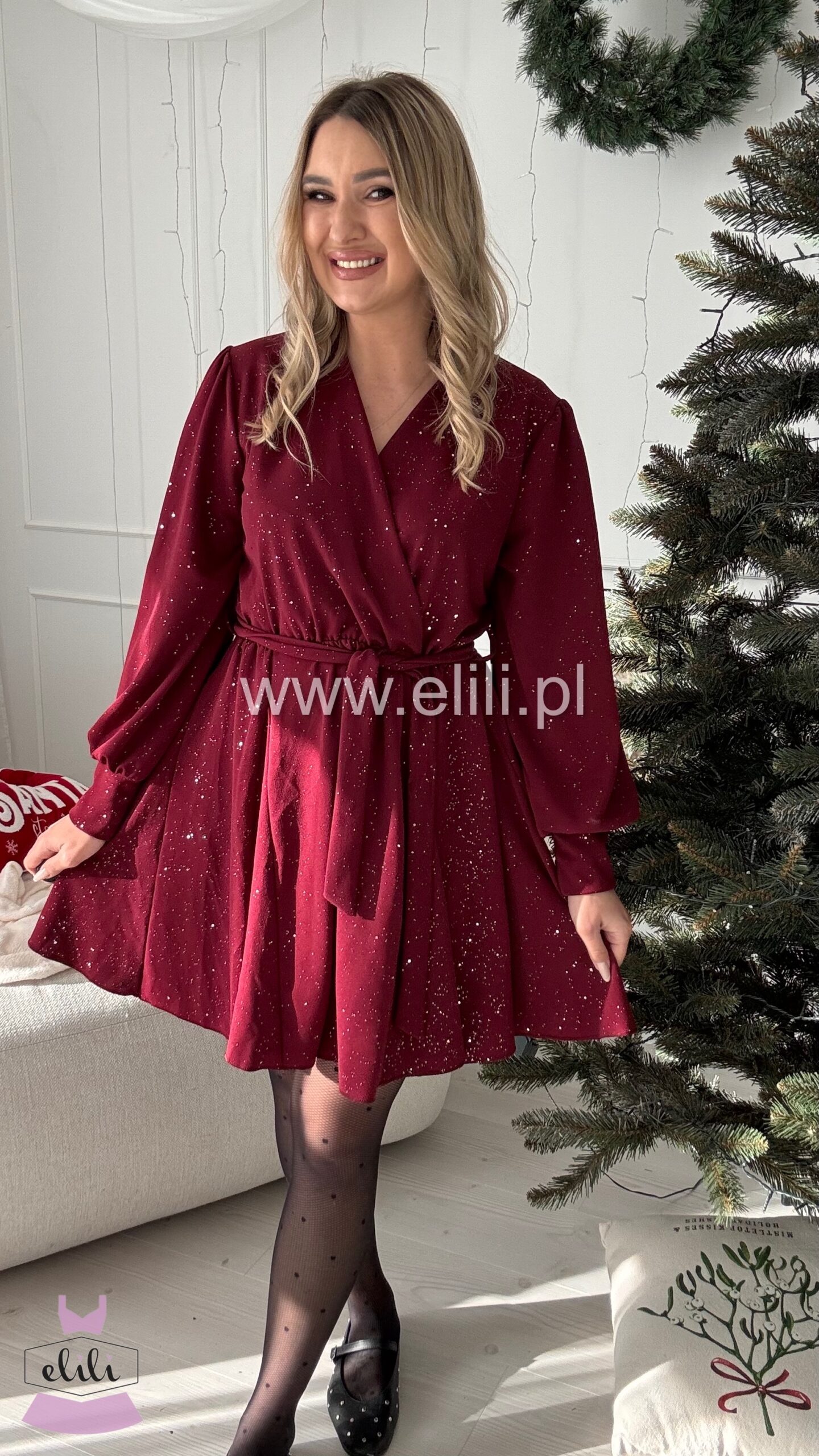 Sukienka z materiału z błyszczącymi aplikacjami. Posiada gumkę w talii oraz pasek