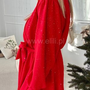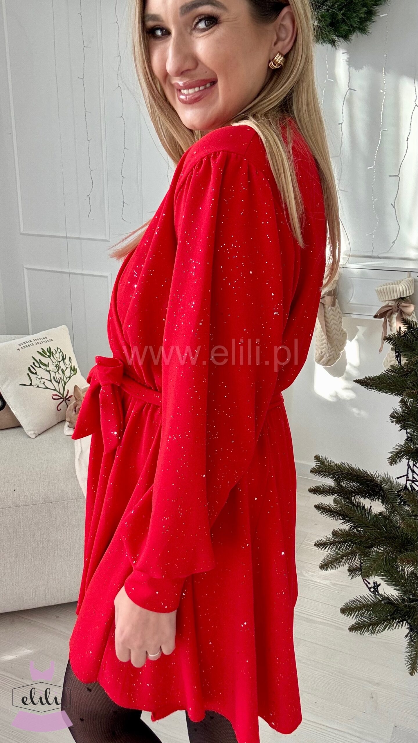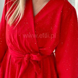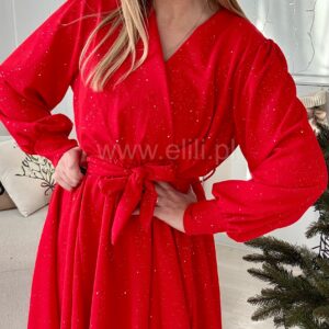 Sukienka z materiału z błyszczącymi aplikacjami. Posiada gumkę w talii oraz pasek