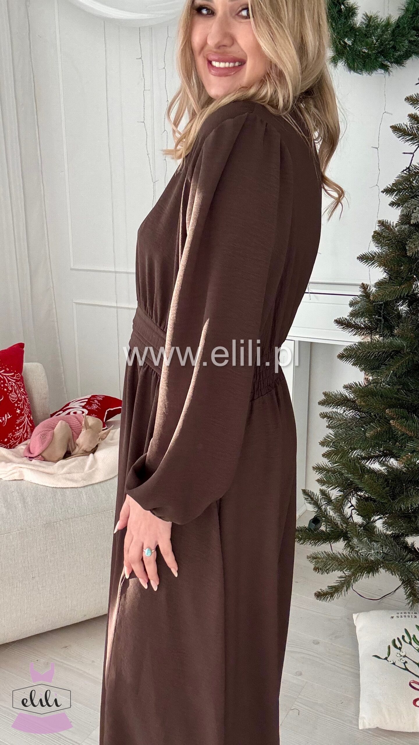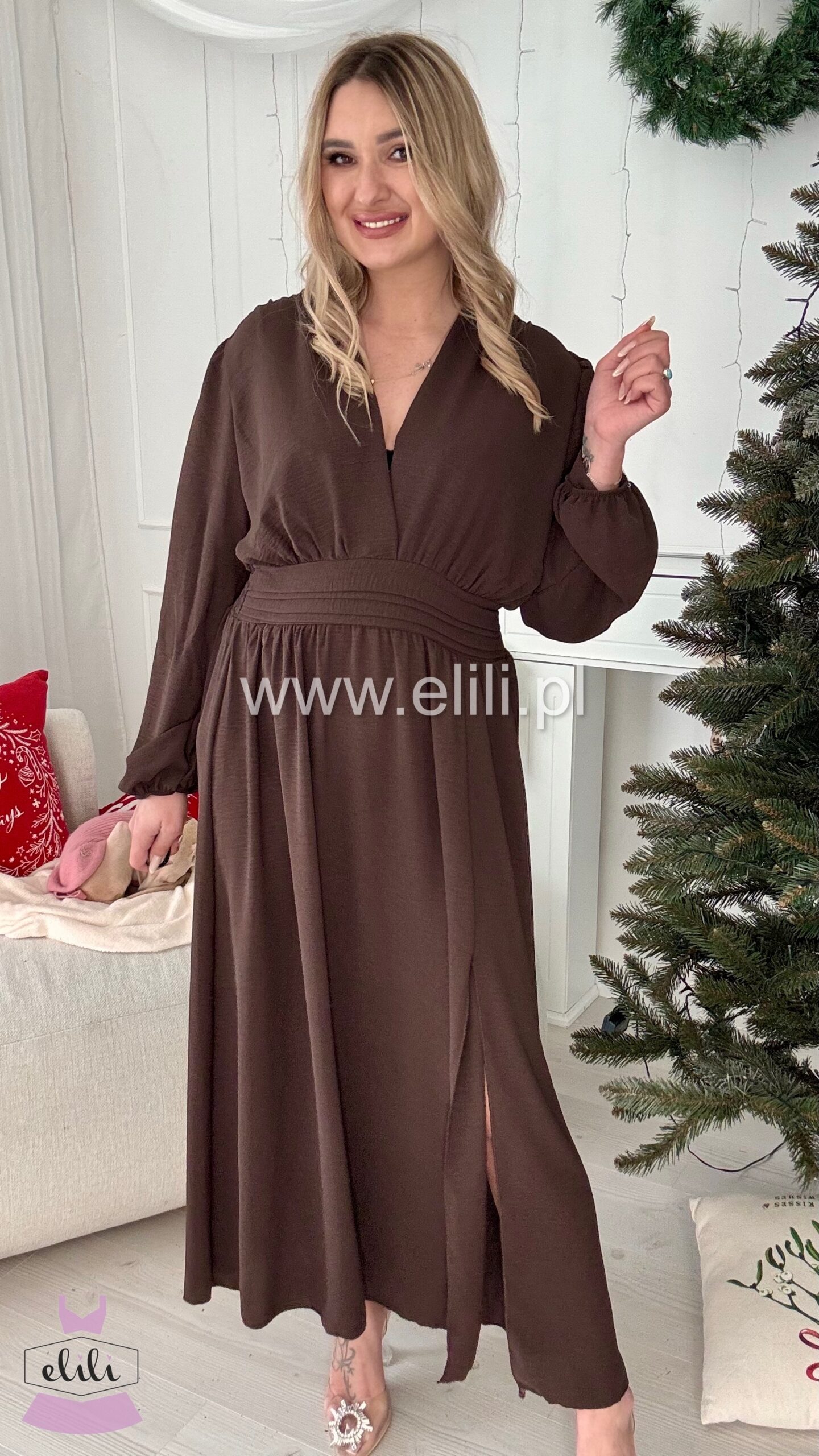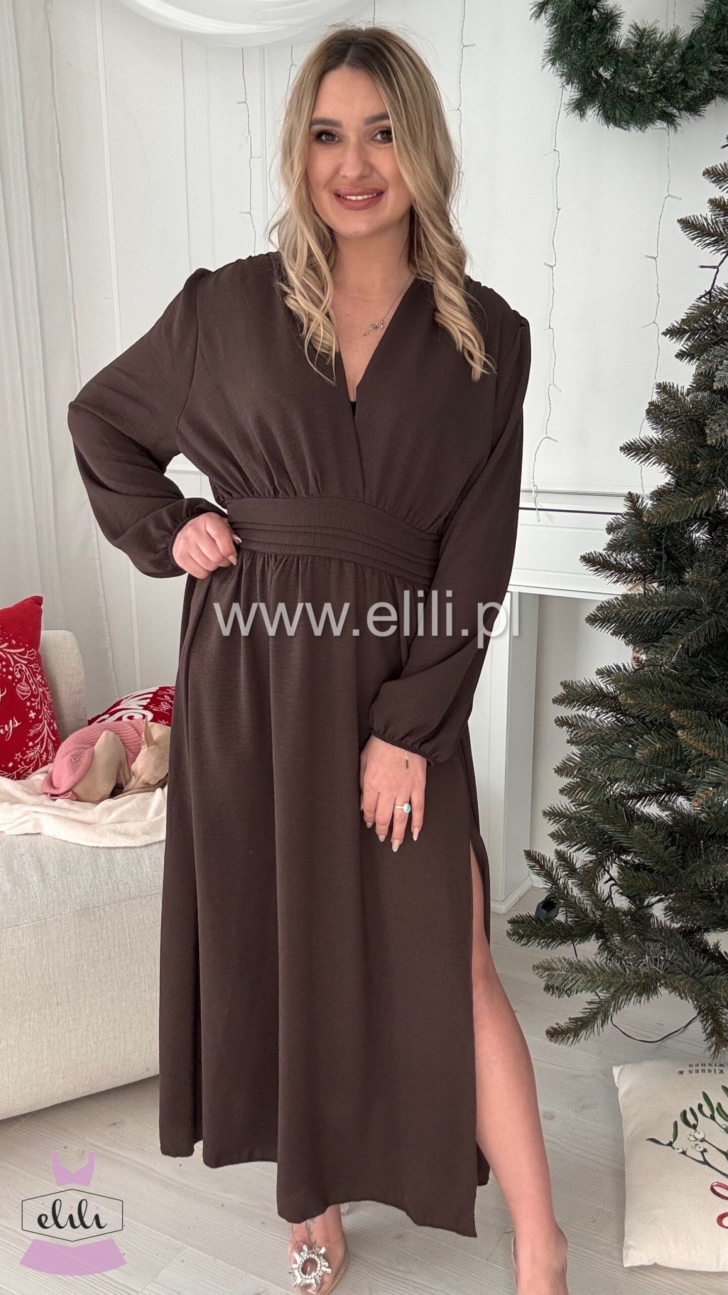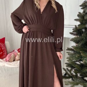 Elegancki model maxi w rozmiarze plus size. Z tyłu posiada pas z gumonici pozwalający na idealne dopasowanie sie do sylwetki. Z przodu ma pieknie podkreślona talię oraz rozcięcie na nodze.