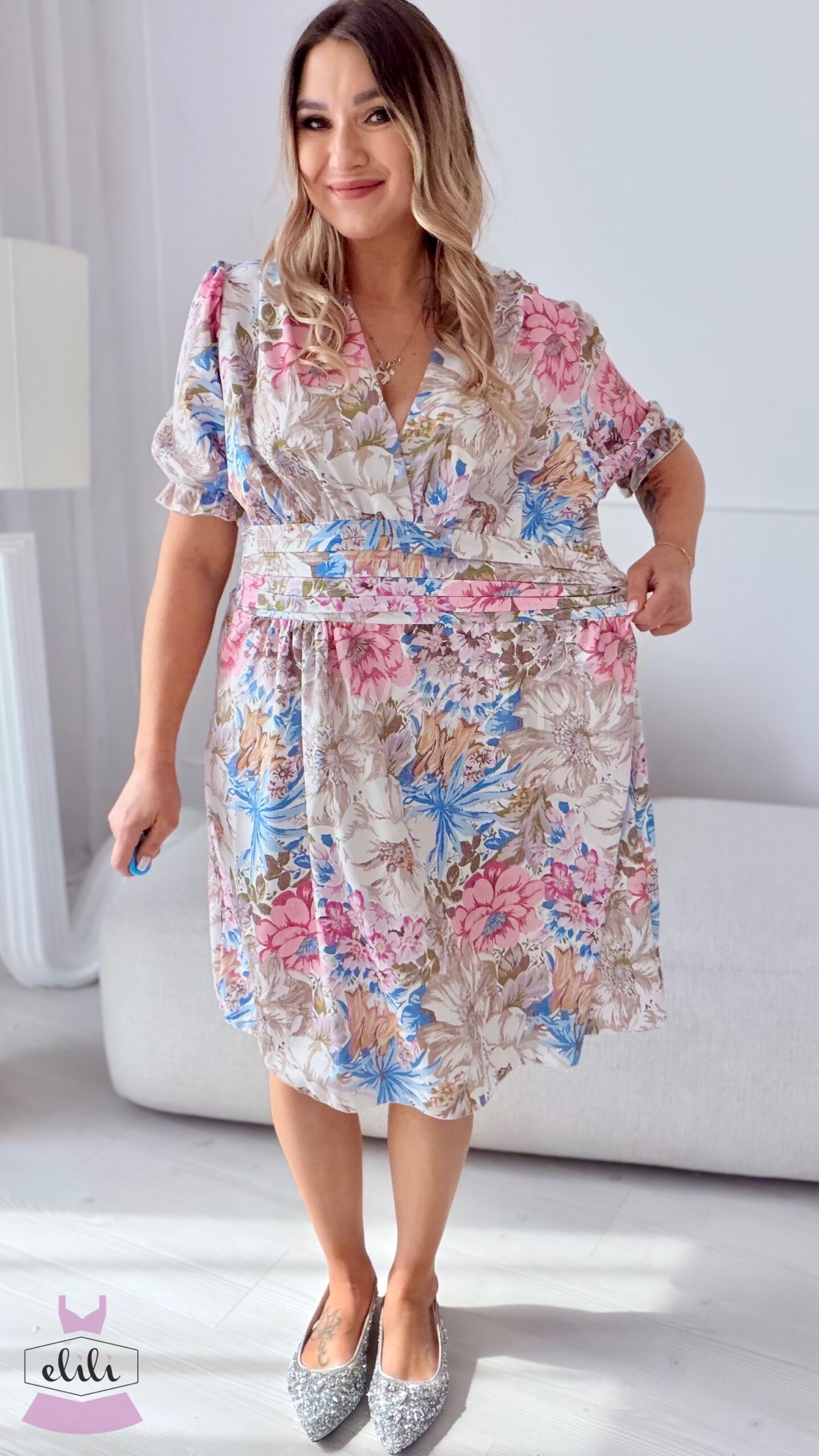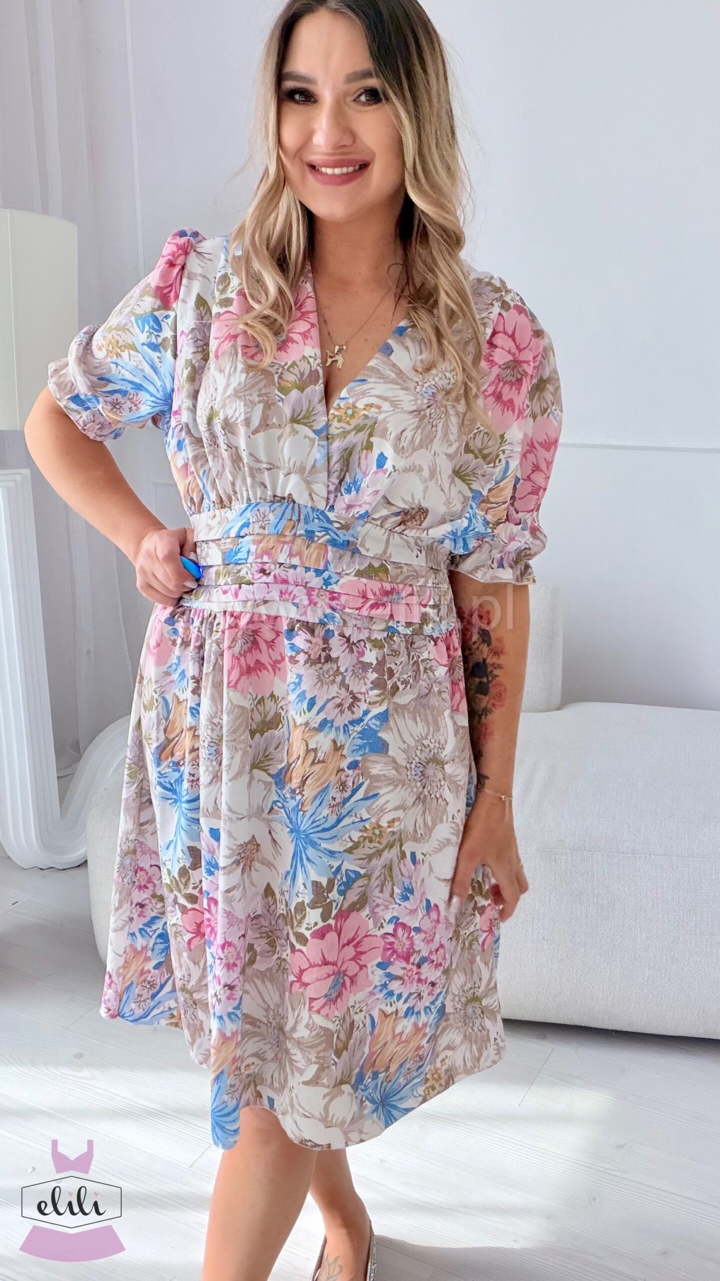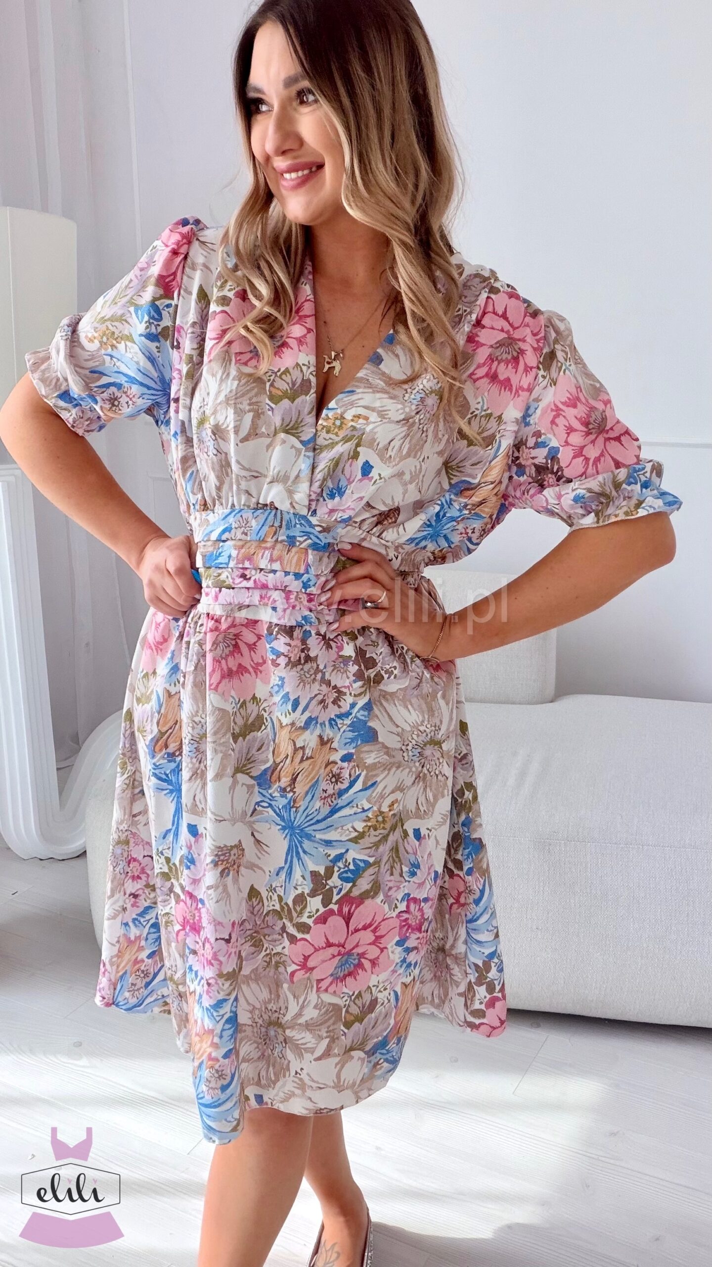 Eleganza to uwielbiany model , teraz dostępny również w wersji mini. Sukienka została zaprojektowana tak, aby pięknie podkreślać sylwetkę — zaznaczona talia nadaje proporcji, a dekolt w serek subtelnie wysmukla górę i eksponuje biust. Kobiecy krój w połączeniu z wygodą sprawia, że to idealna propozycja zarówno na co dzień, jak i na wyjątkowe okazje.