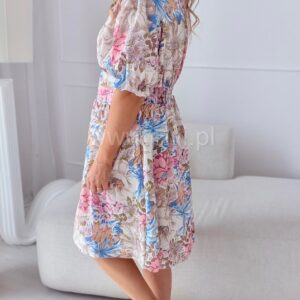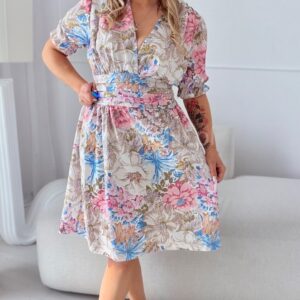 Sukienka Eleganza plus size mini beżowo-niebieskie kwiaty