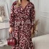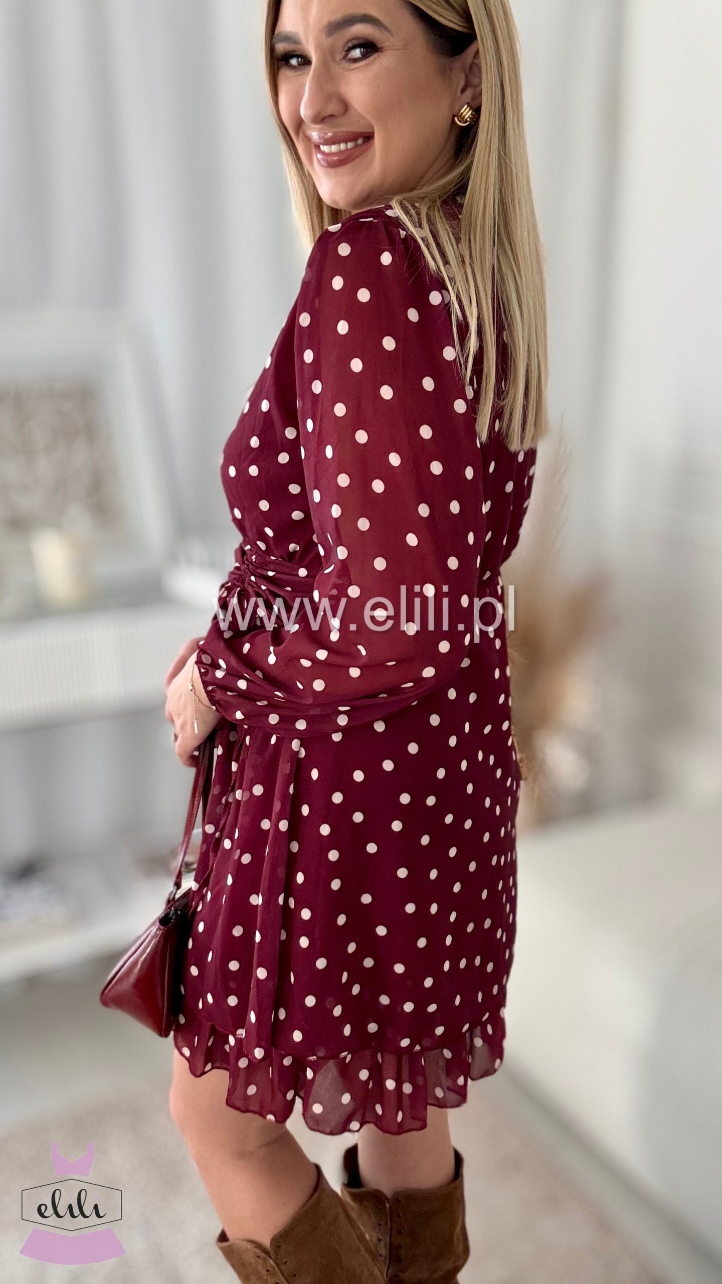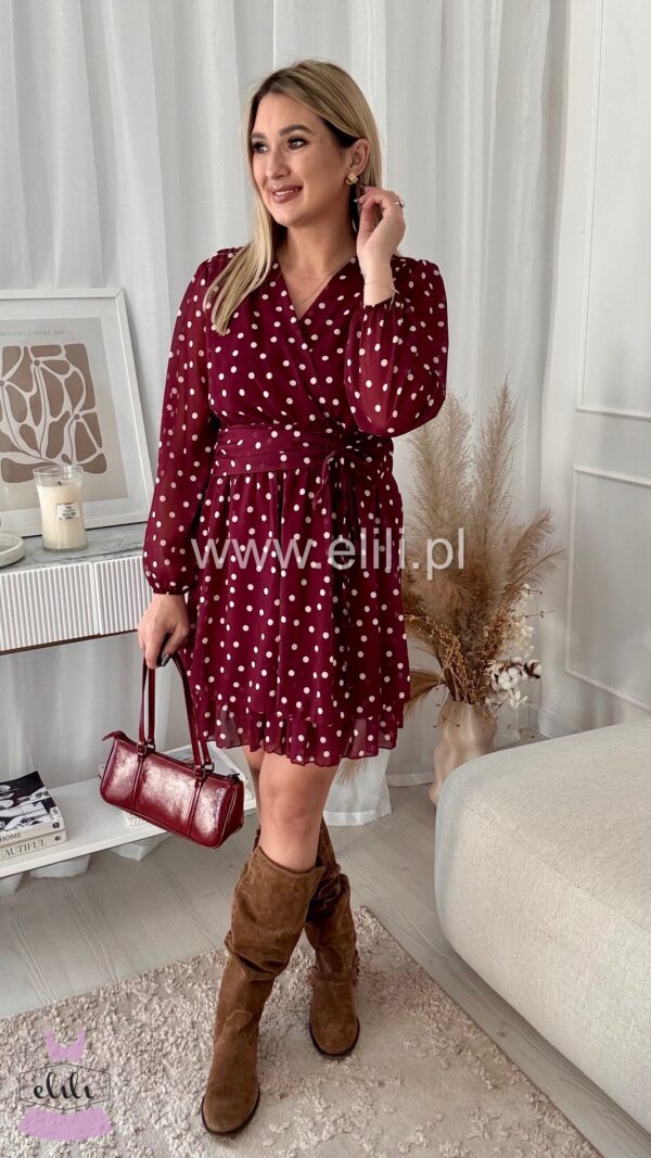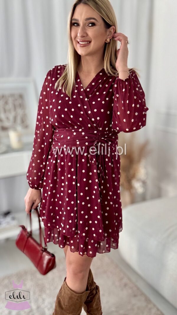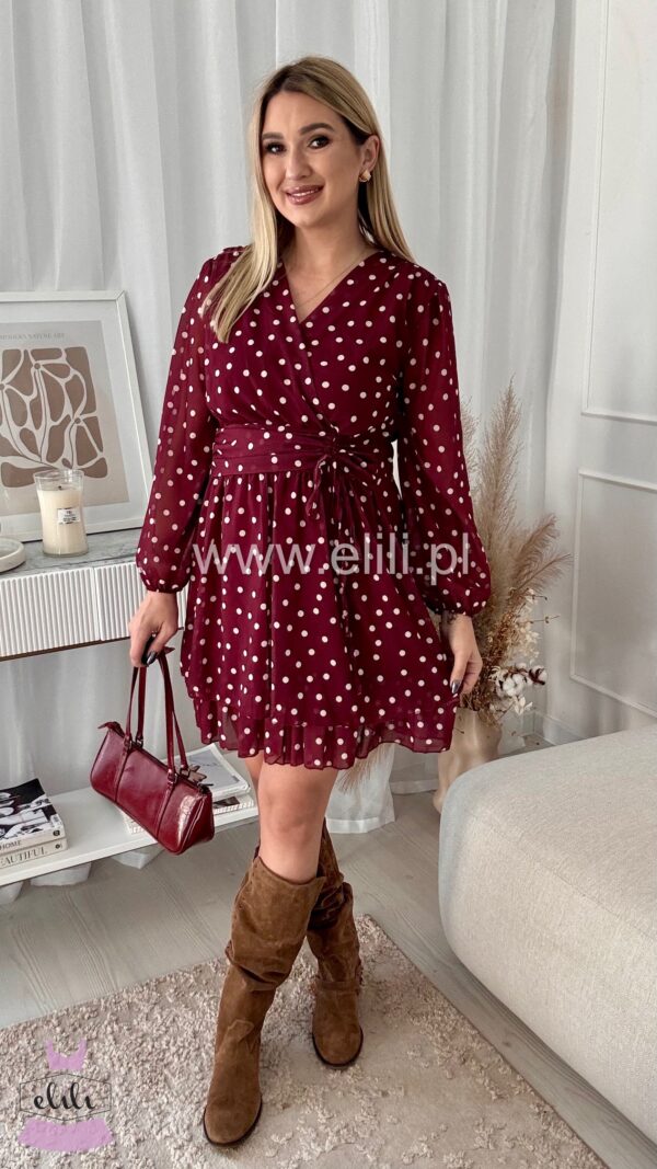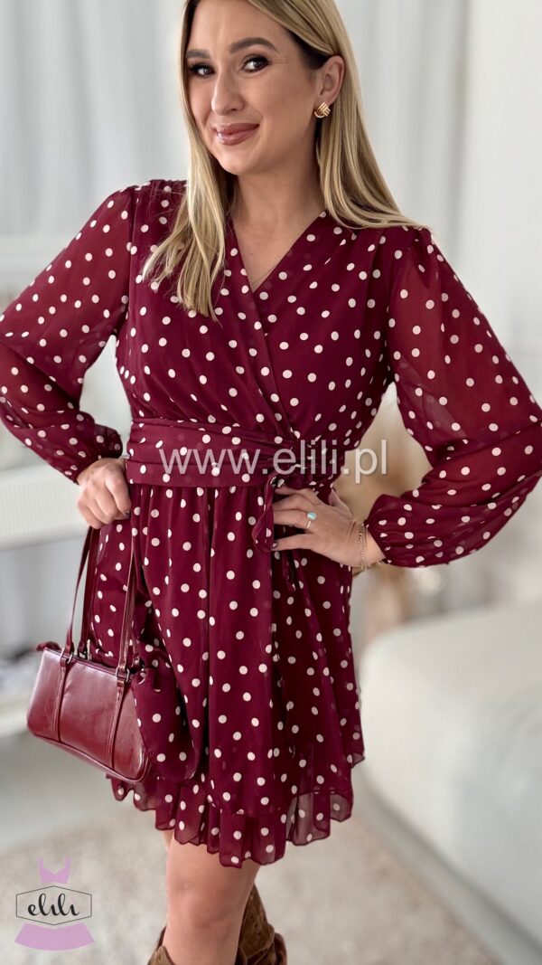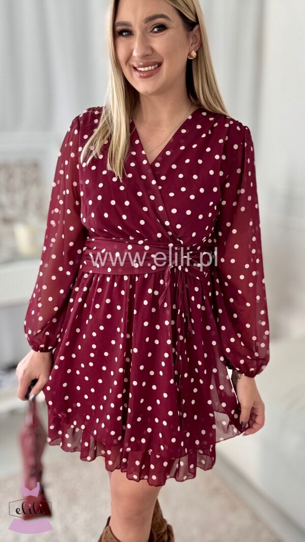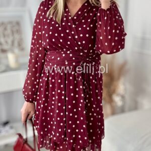 Szyfonowy model z przepięknie podkreśloną talią oraz ozdobnym ściagaczem na nim. Posiada w talii gumkę. Na podszewce
