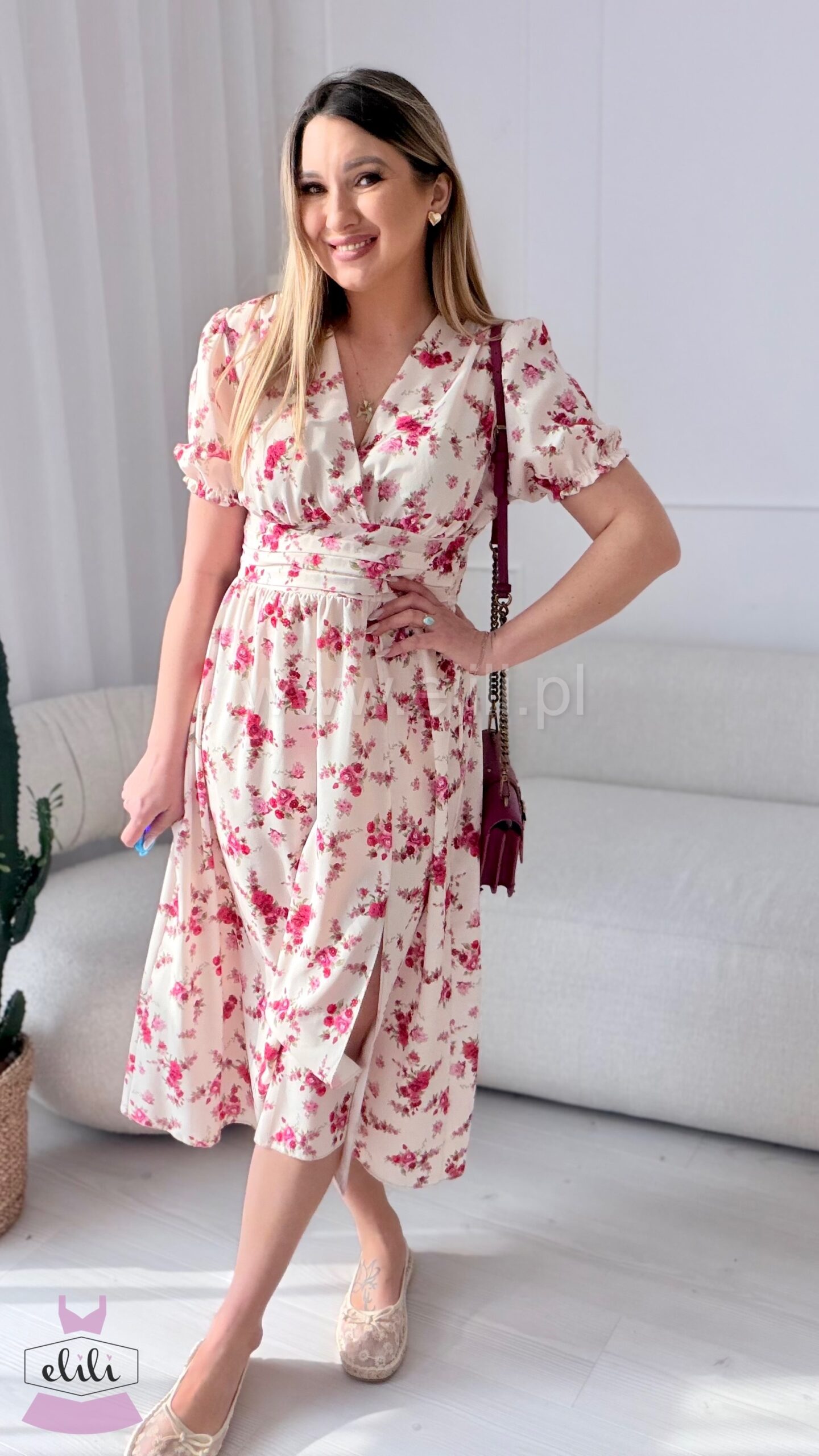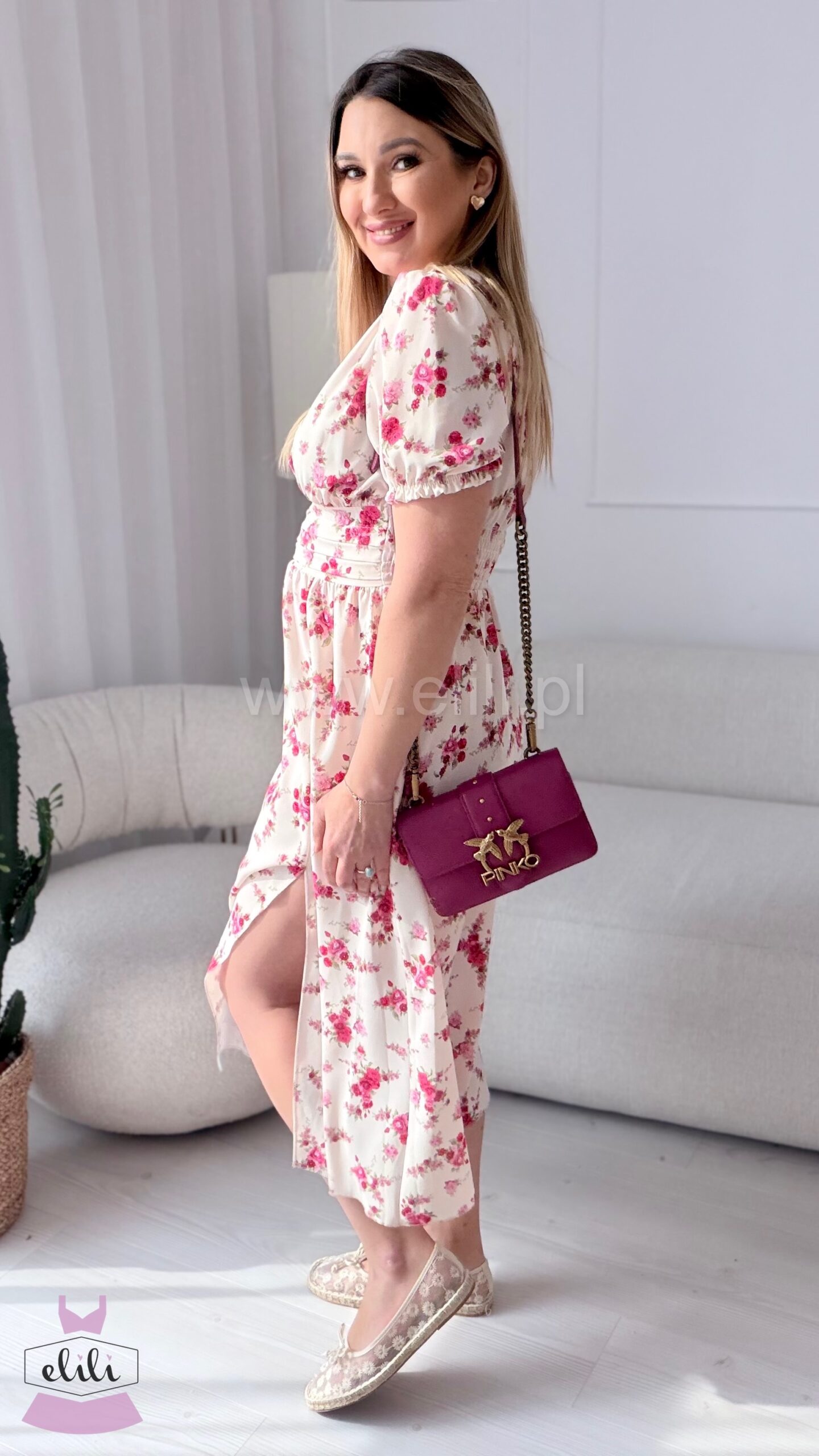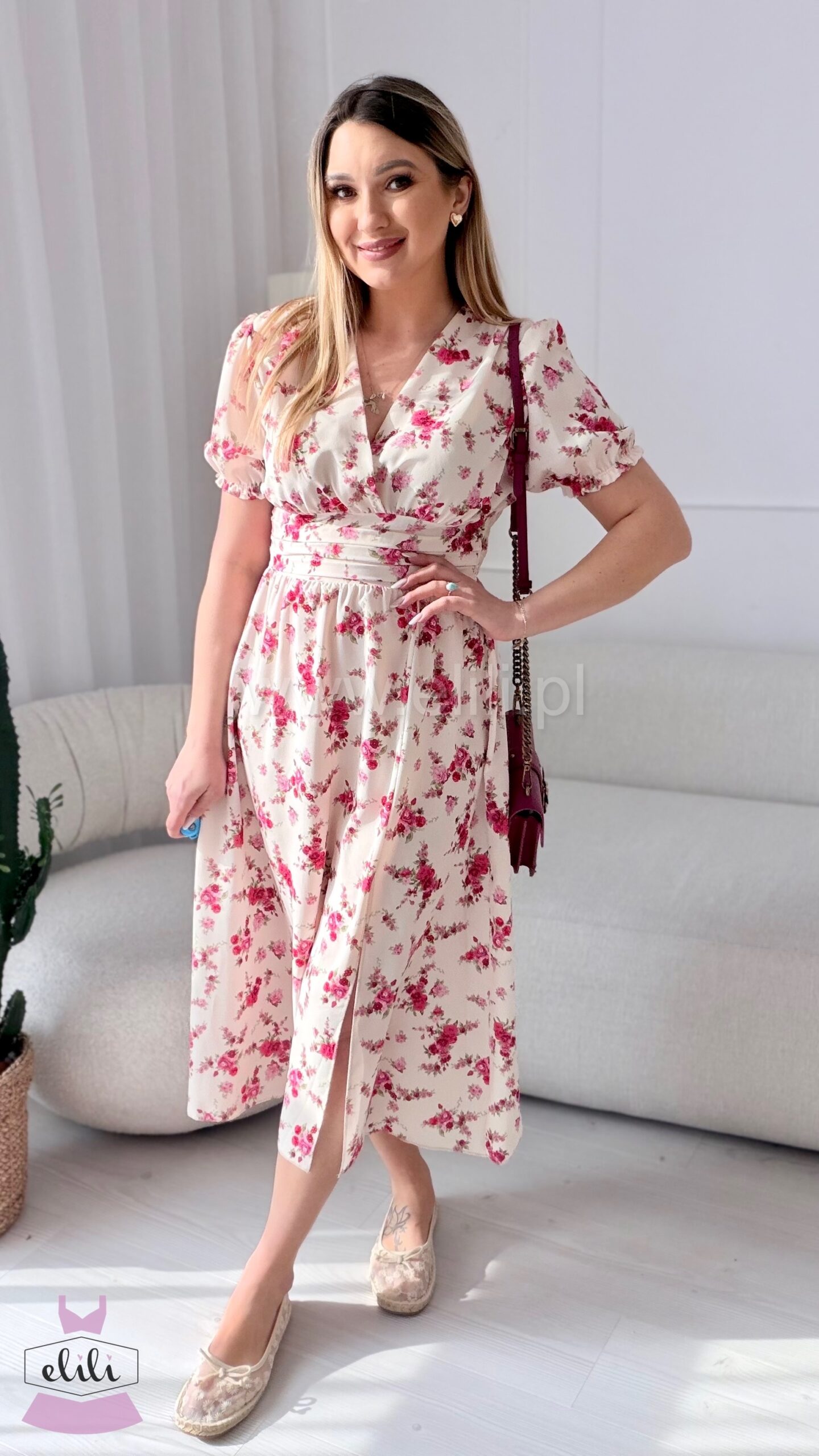 Kopertowy dekolt delikatnie eksponuje biust i wysmukla szyję, nadając całości lekkości i elegancji. Zmysłowe rozcięcie na nodze dodaje charakteru i sprawia, że Elina prezentuje się niezwykle kobieco – zarówno w ruchu, jak i na zdjęciach.