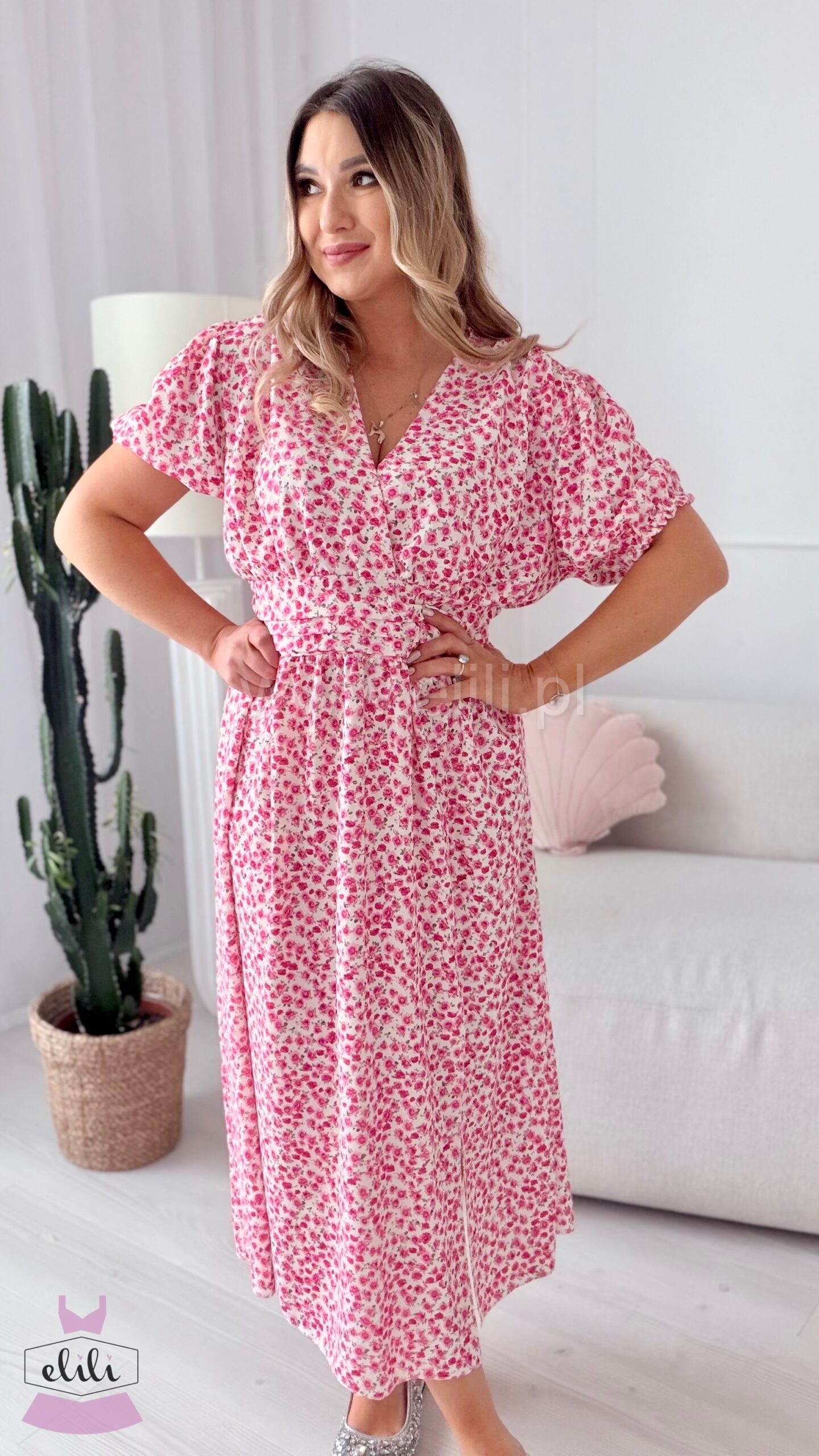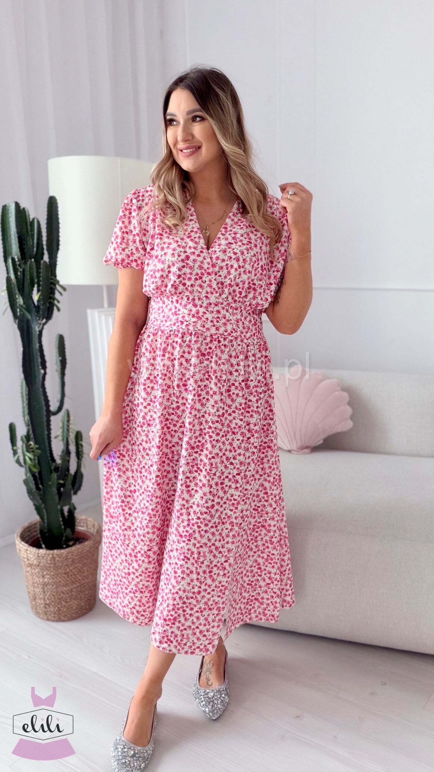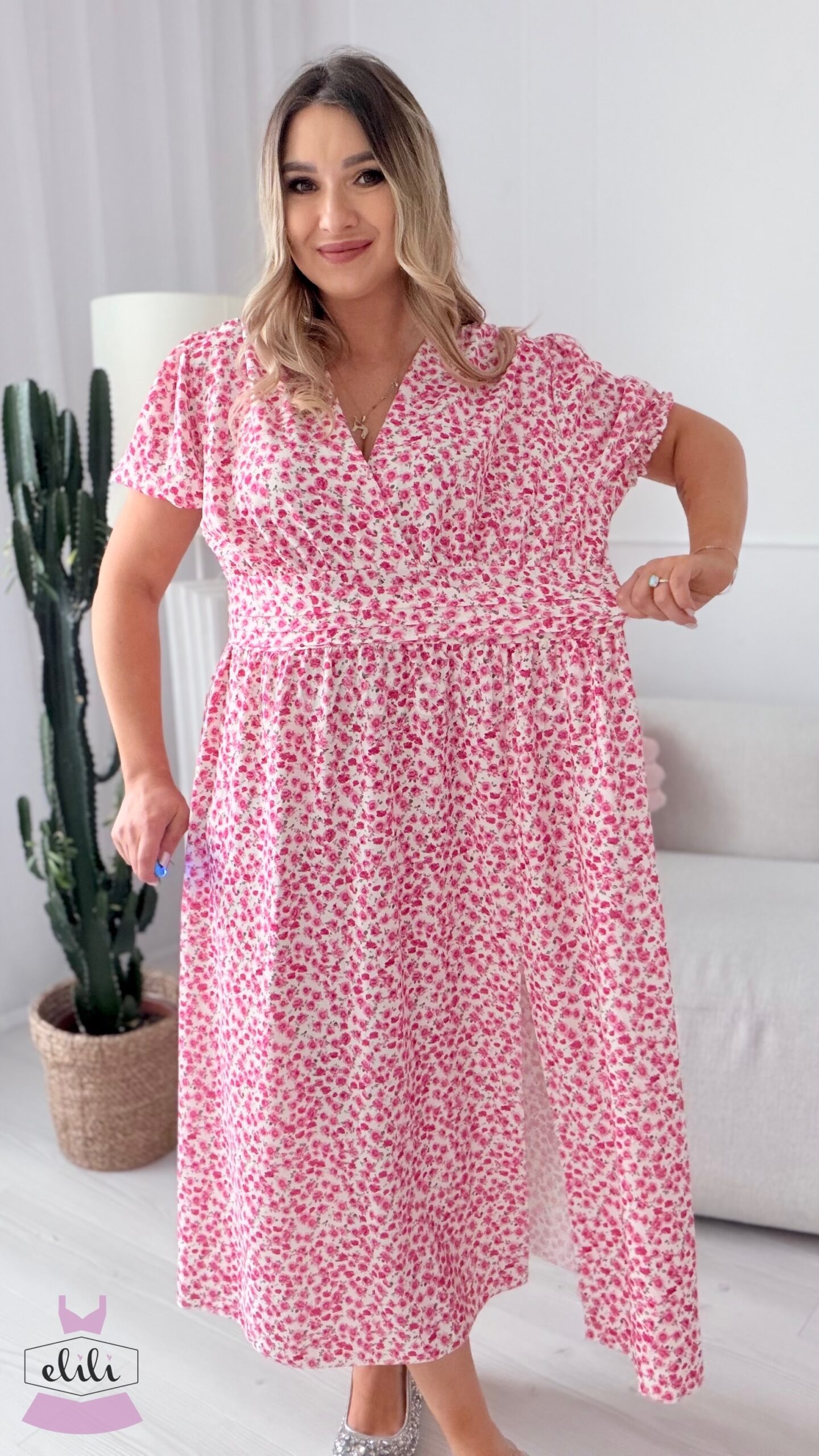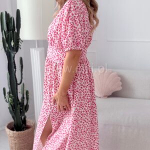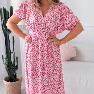 Sukienka Elina PLUS SIZE biała w fuksjowe kwiatuszki