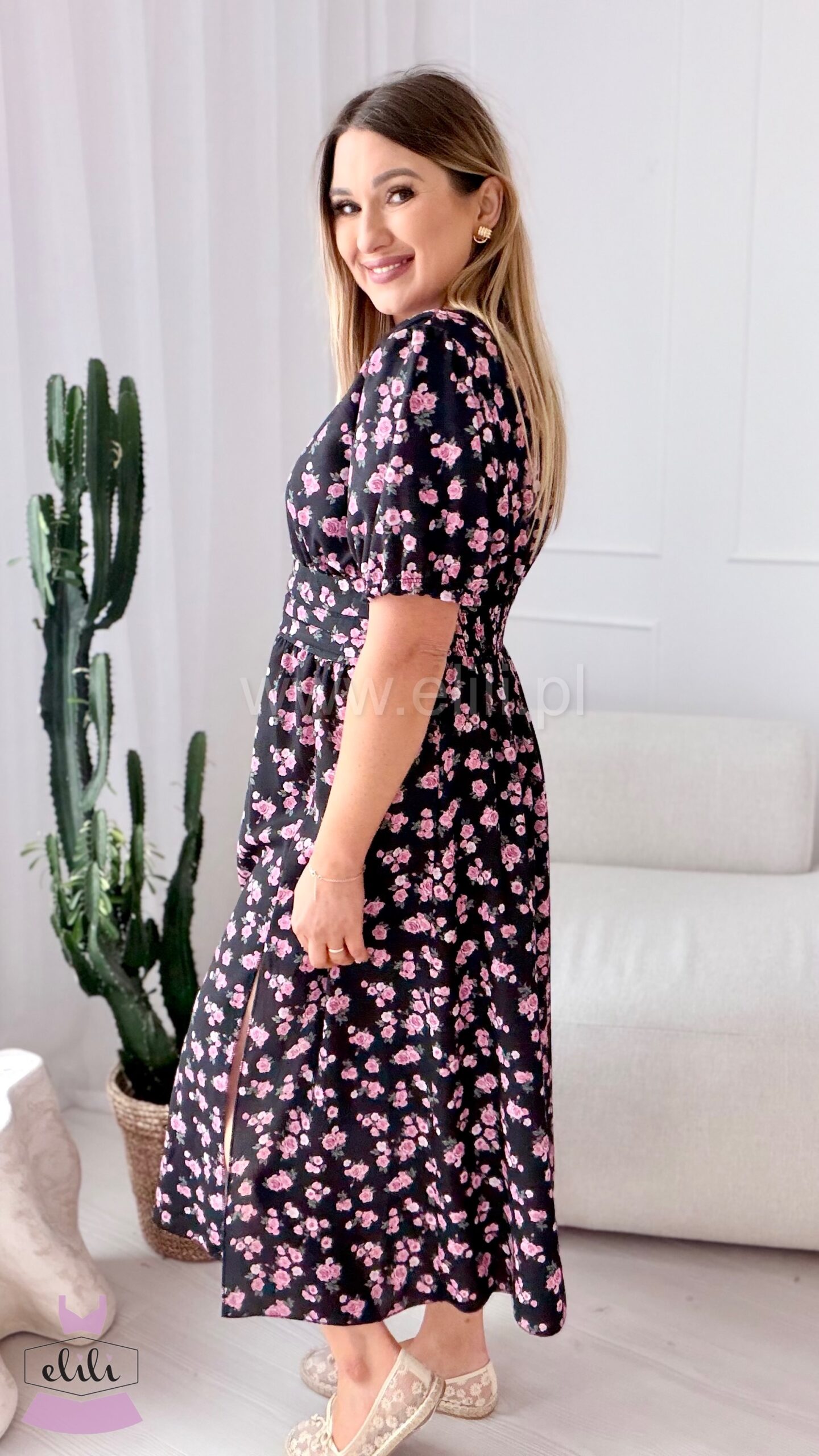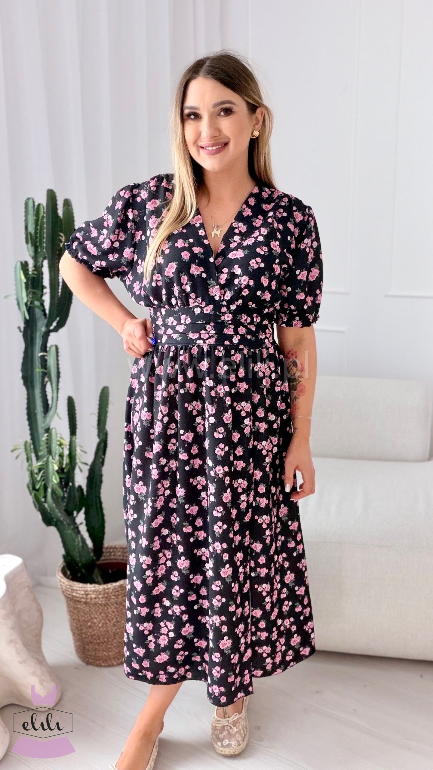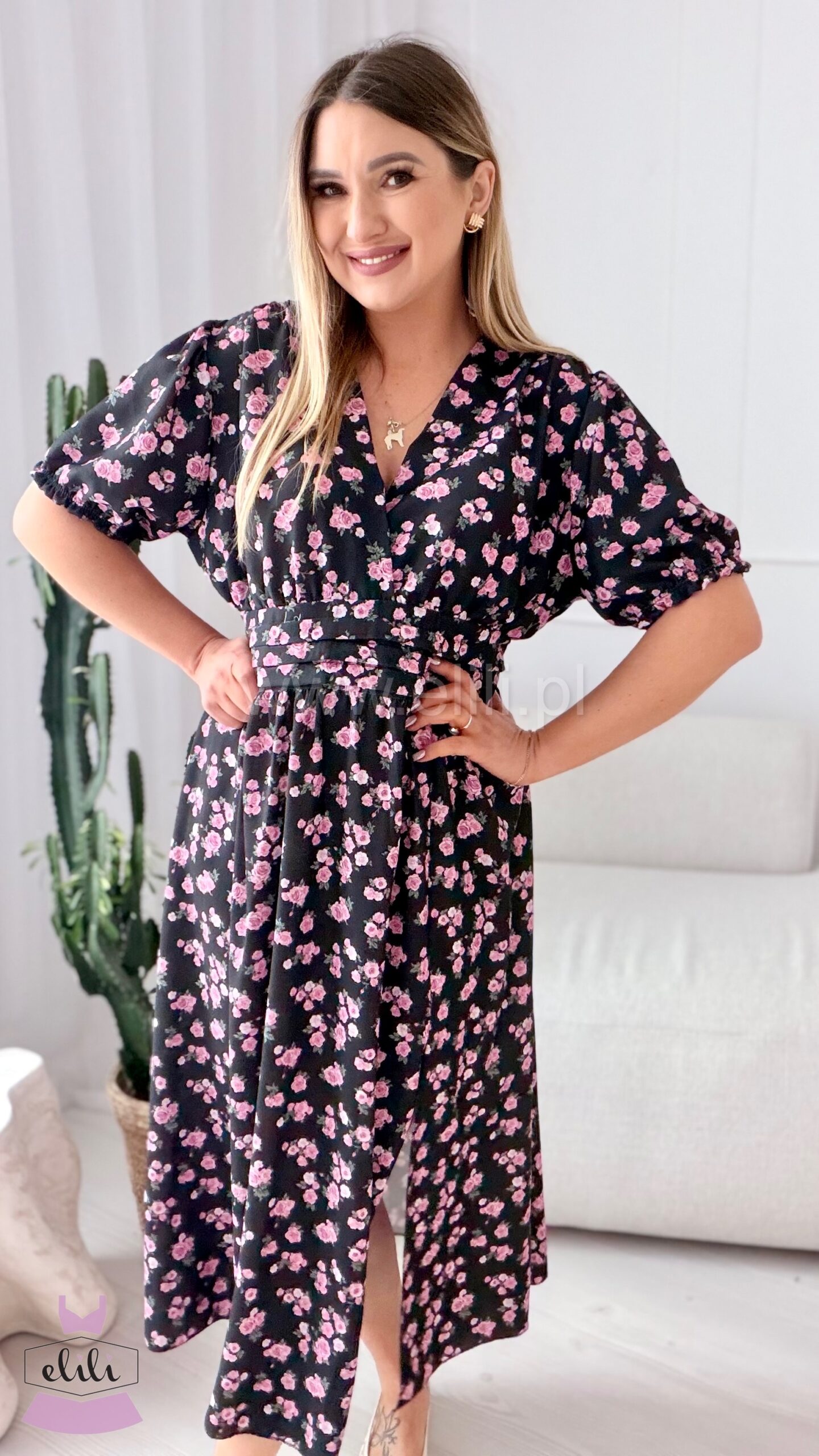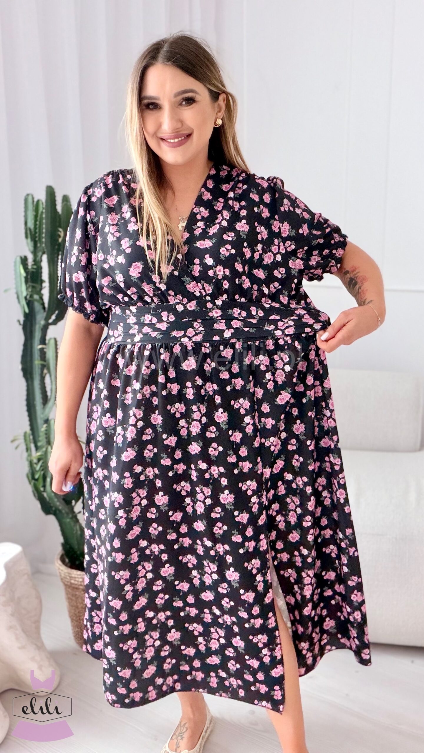 Kopertowy dekolt delikatnie eksponuje biust i wysmukla szyję, nadając całości lekkości i elegancji. Zmysłowe rozcięcie na nodze dodaje charakteru i sprawia, że Elina prezentuje się niezwykle kobieco – zarówno w ruchu, jak i na zdjęciach.