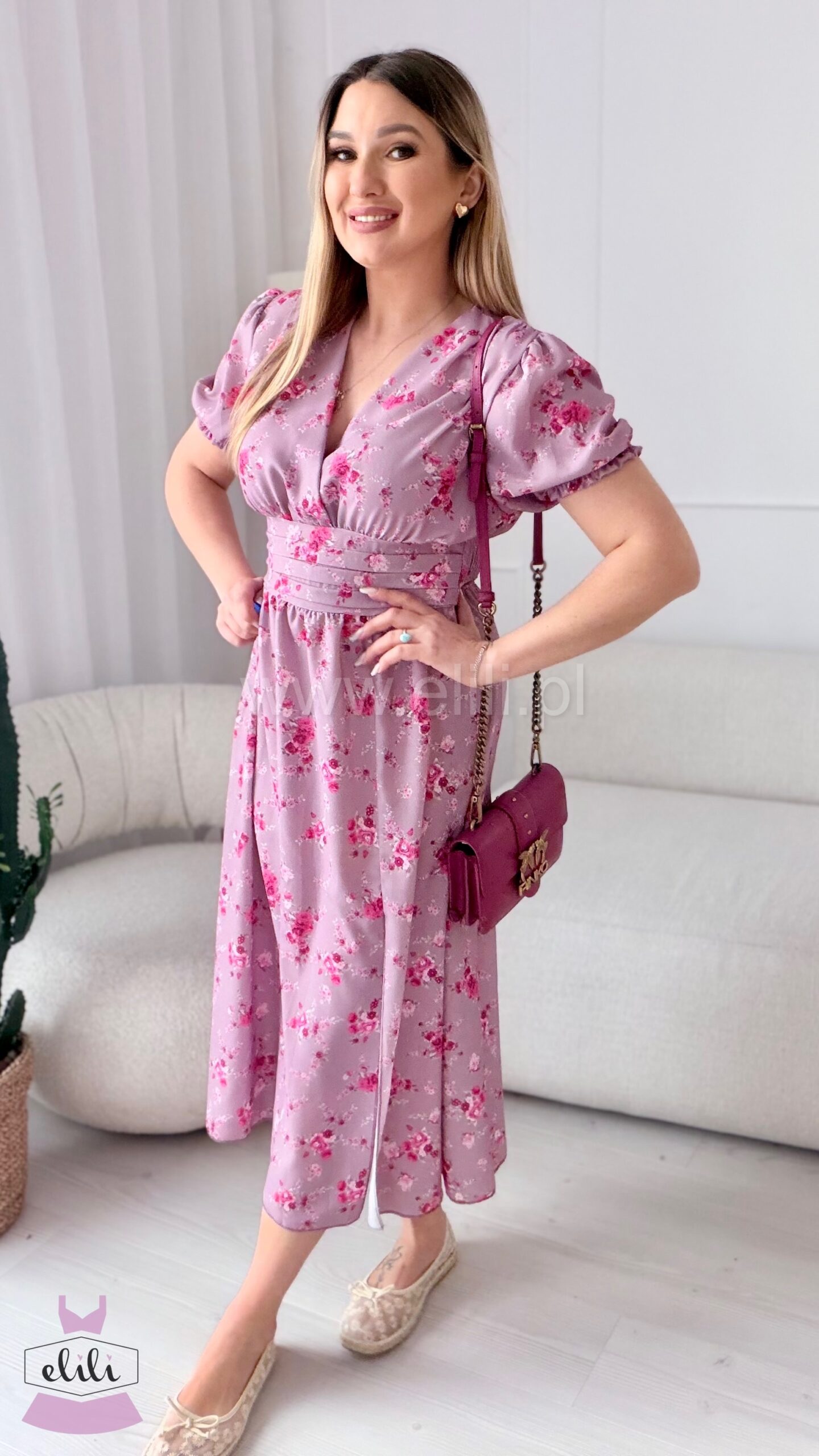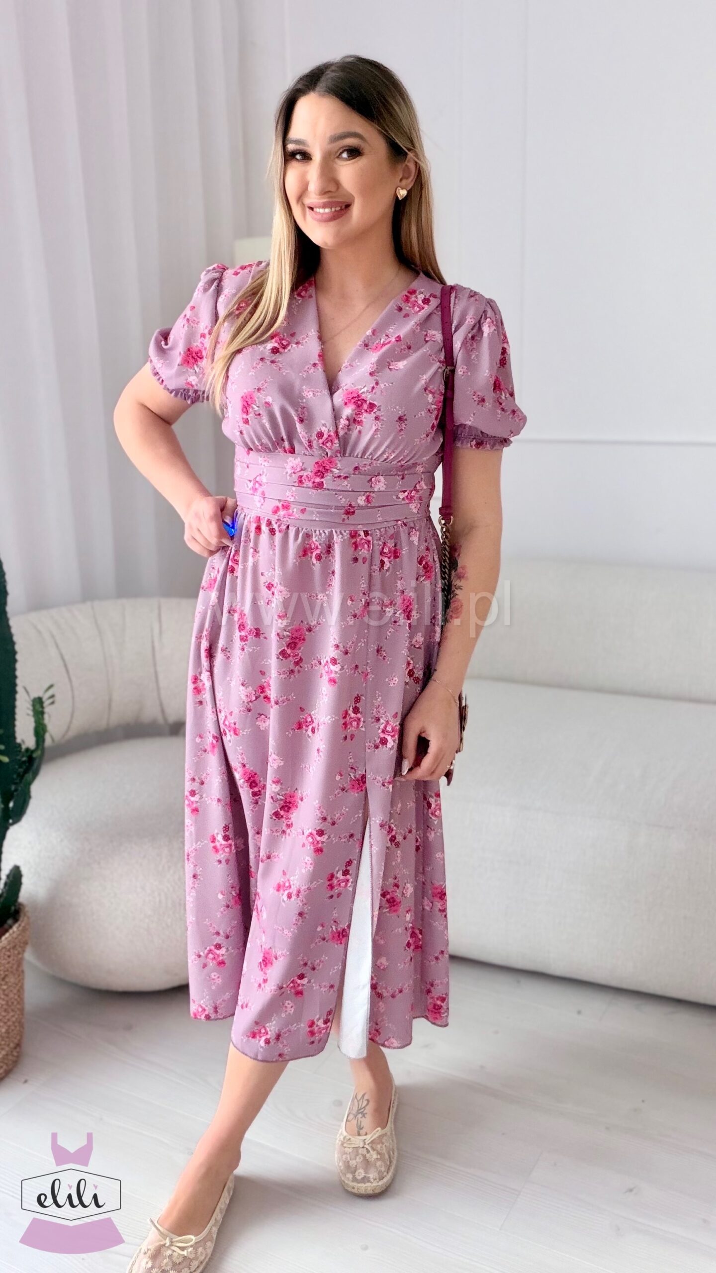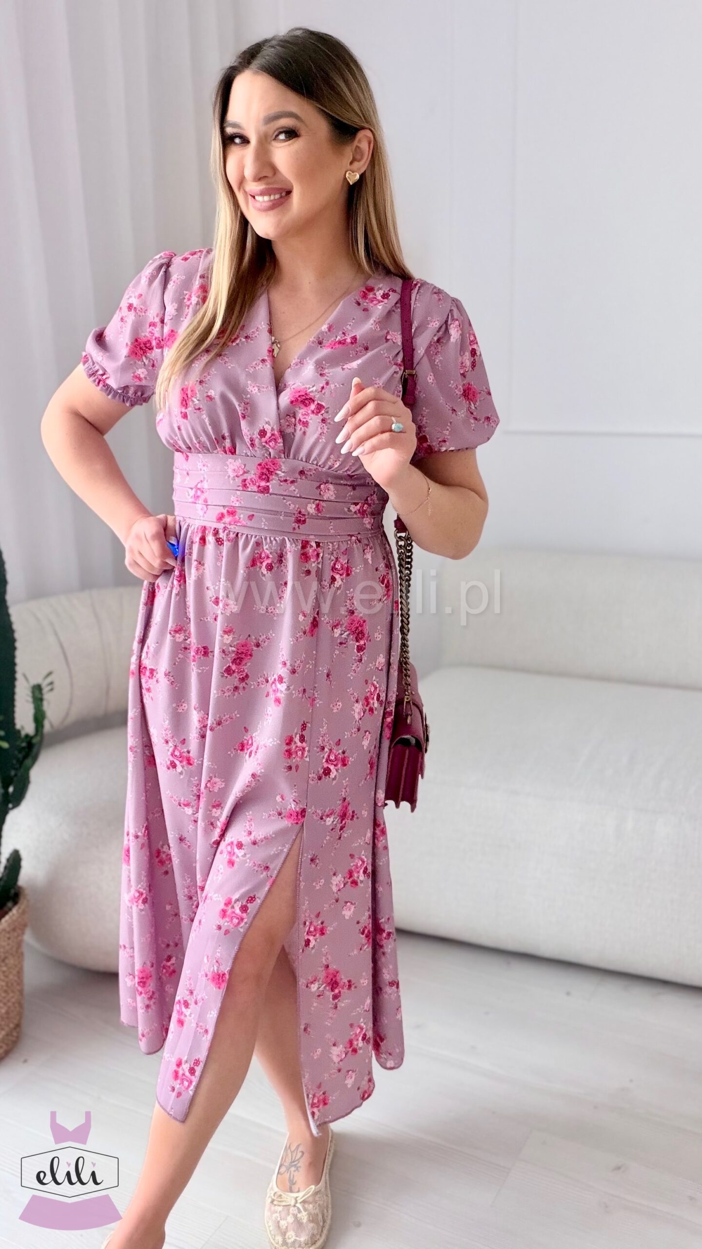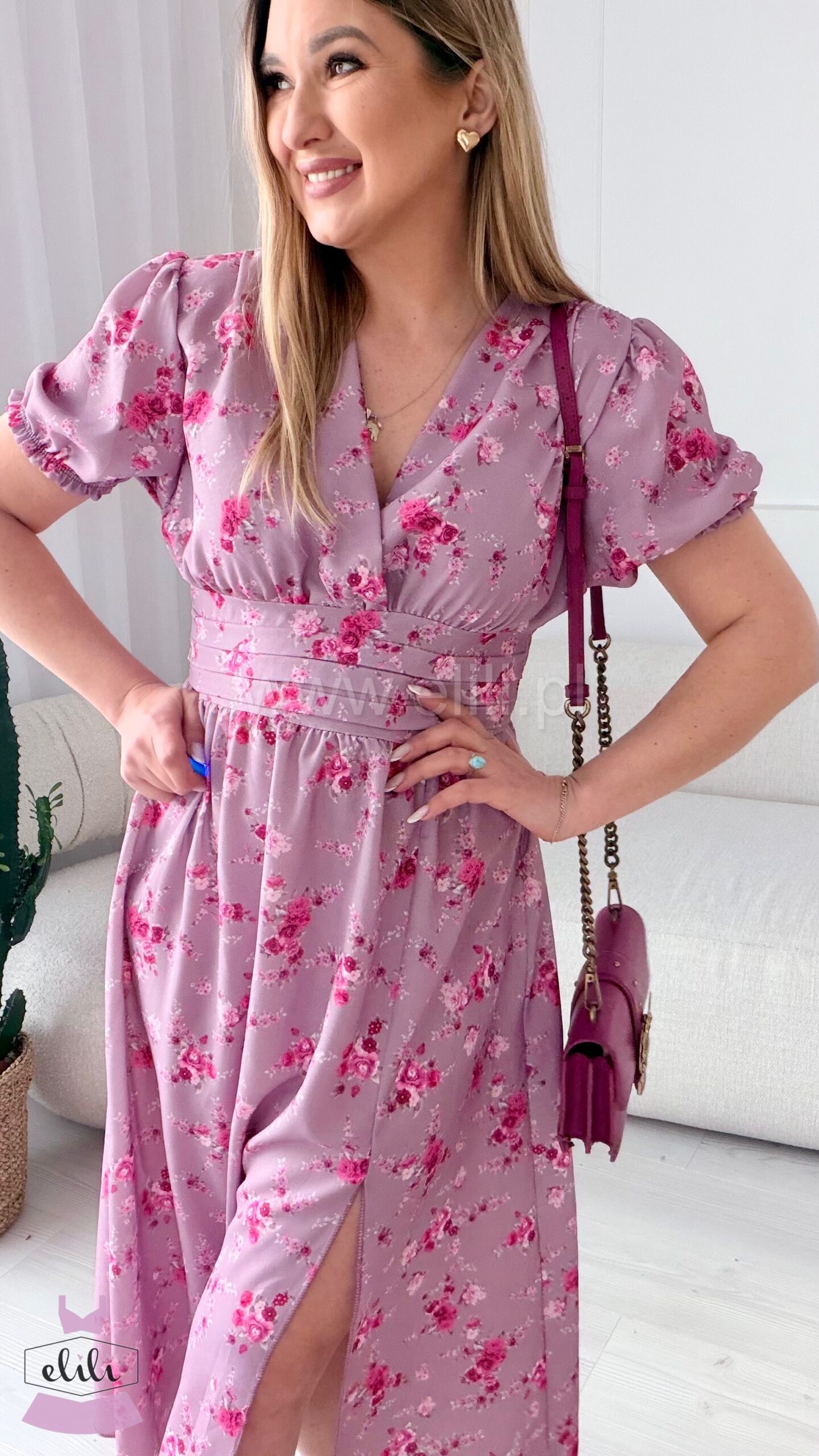 Kopertowy dekolt delikatnie eksponuje biust i wysmukla szyję, nadając całości lekkości i elegancji. Zmysłowe rozcięcie na nodze dodaje charakteru i sprawia, że Elina prezentuje się niezwykle kobieco – zarówno w ruchu, jak i na zdjęciach.