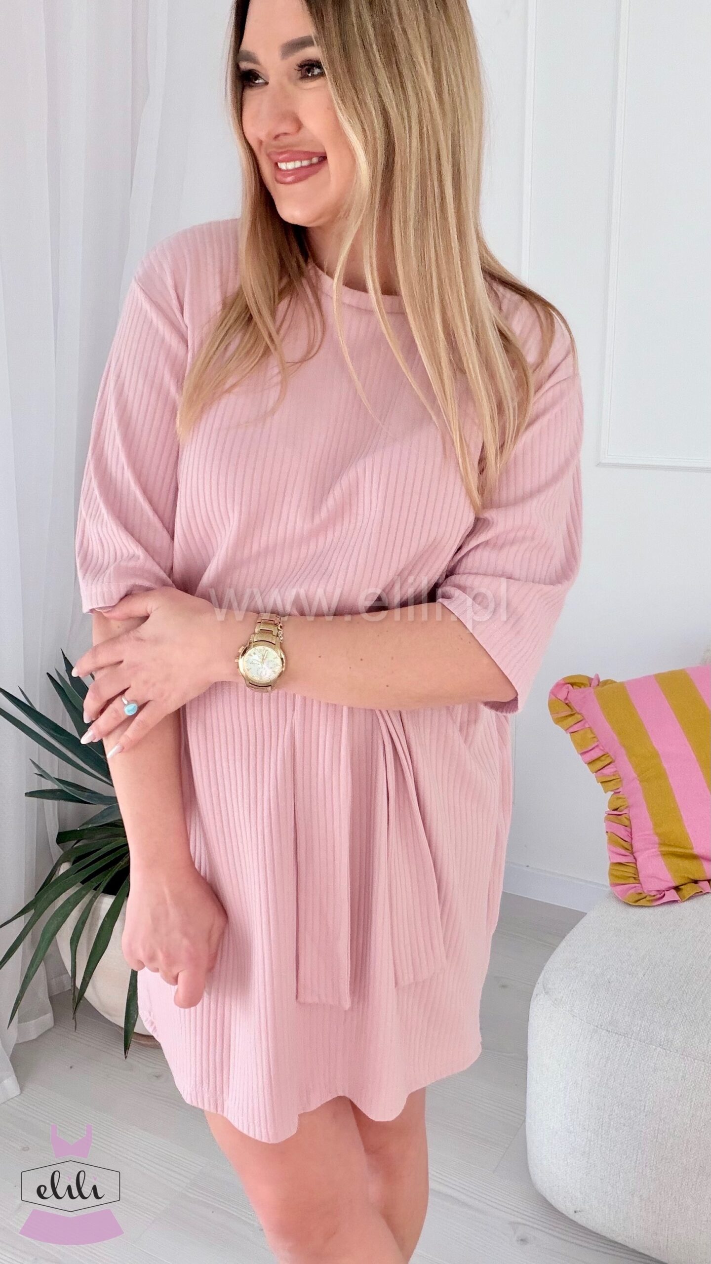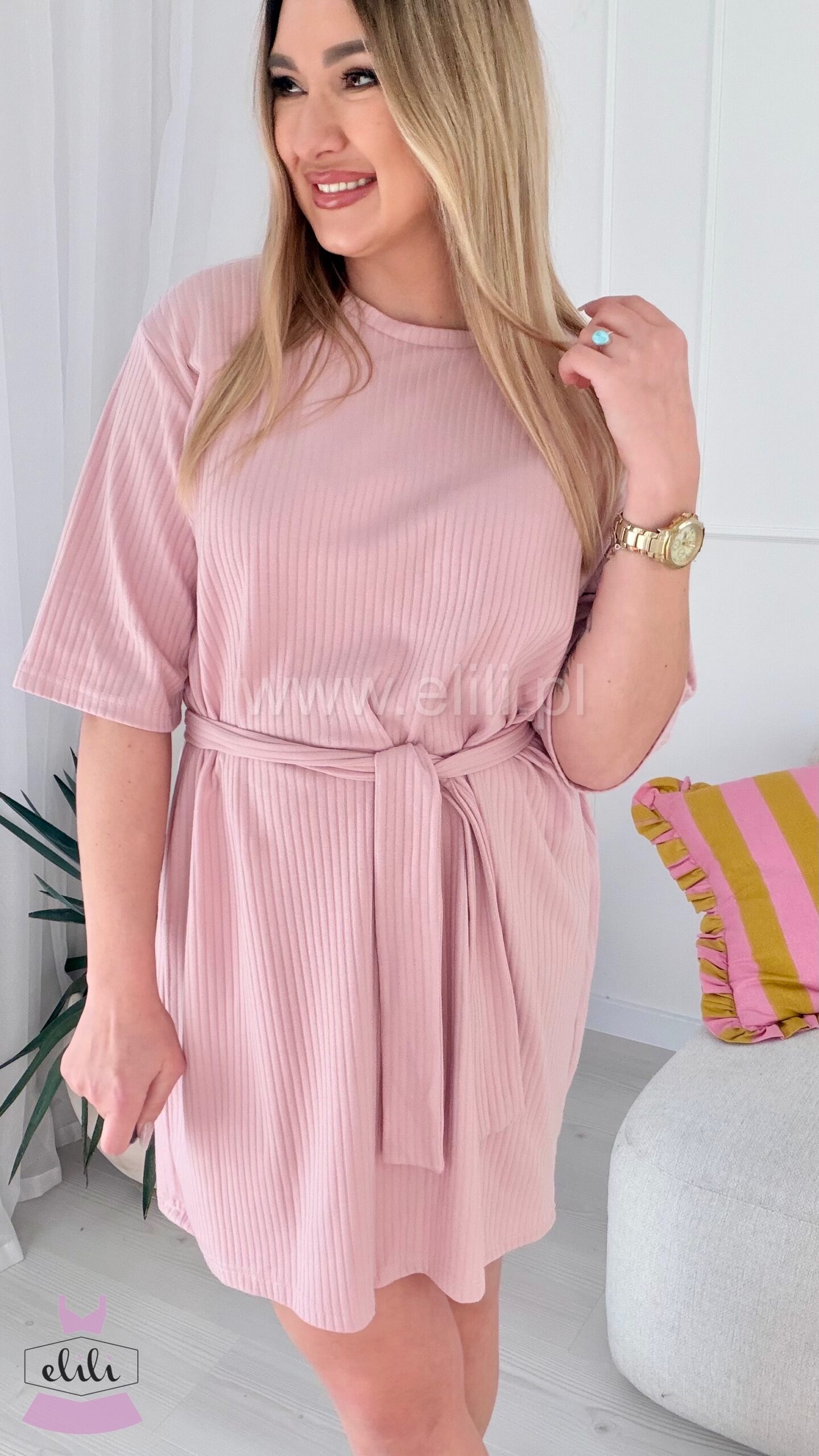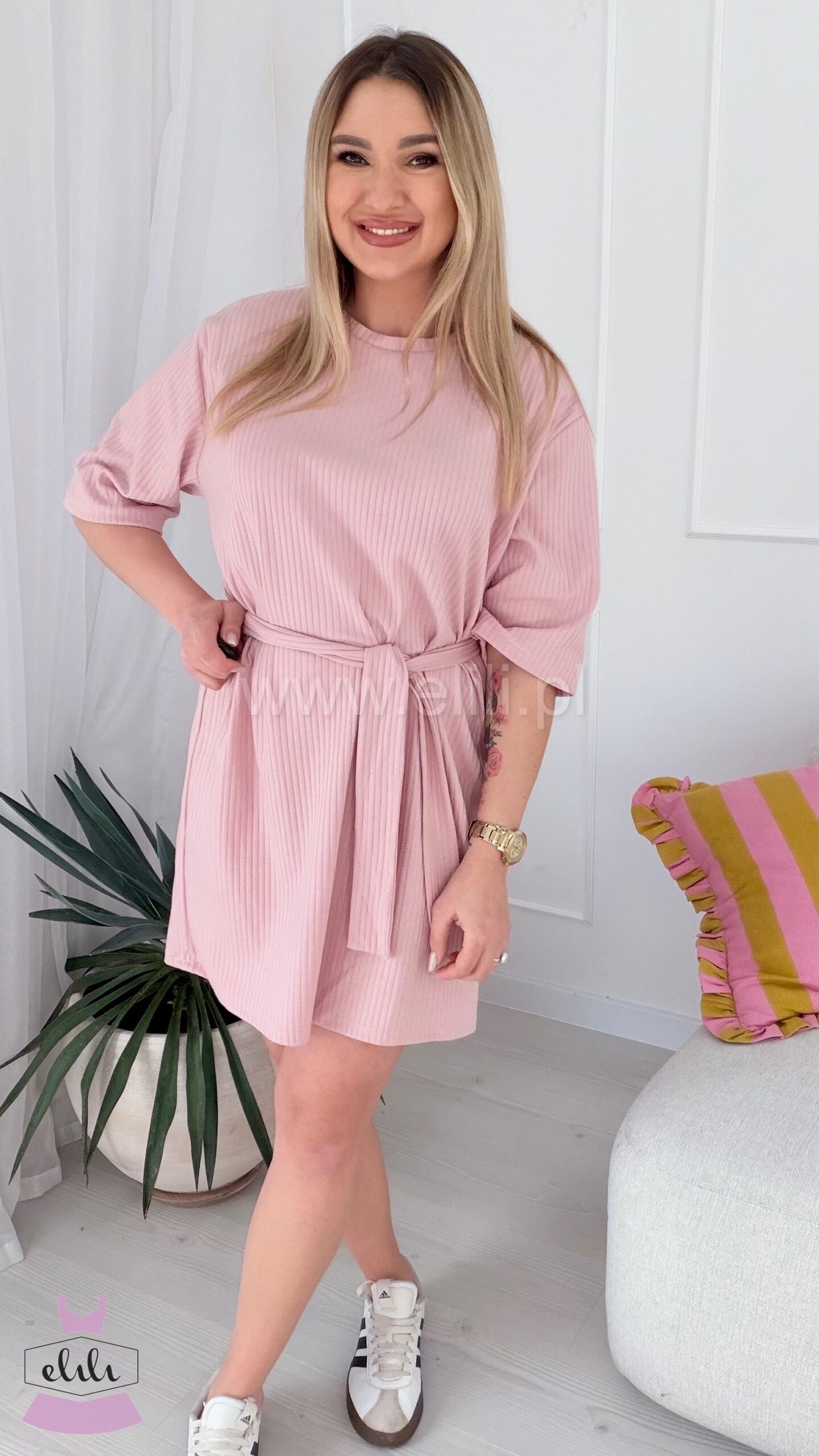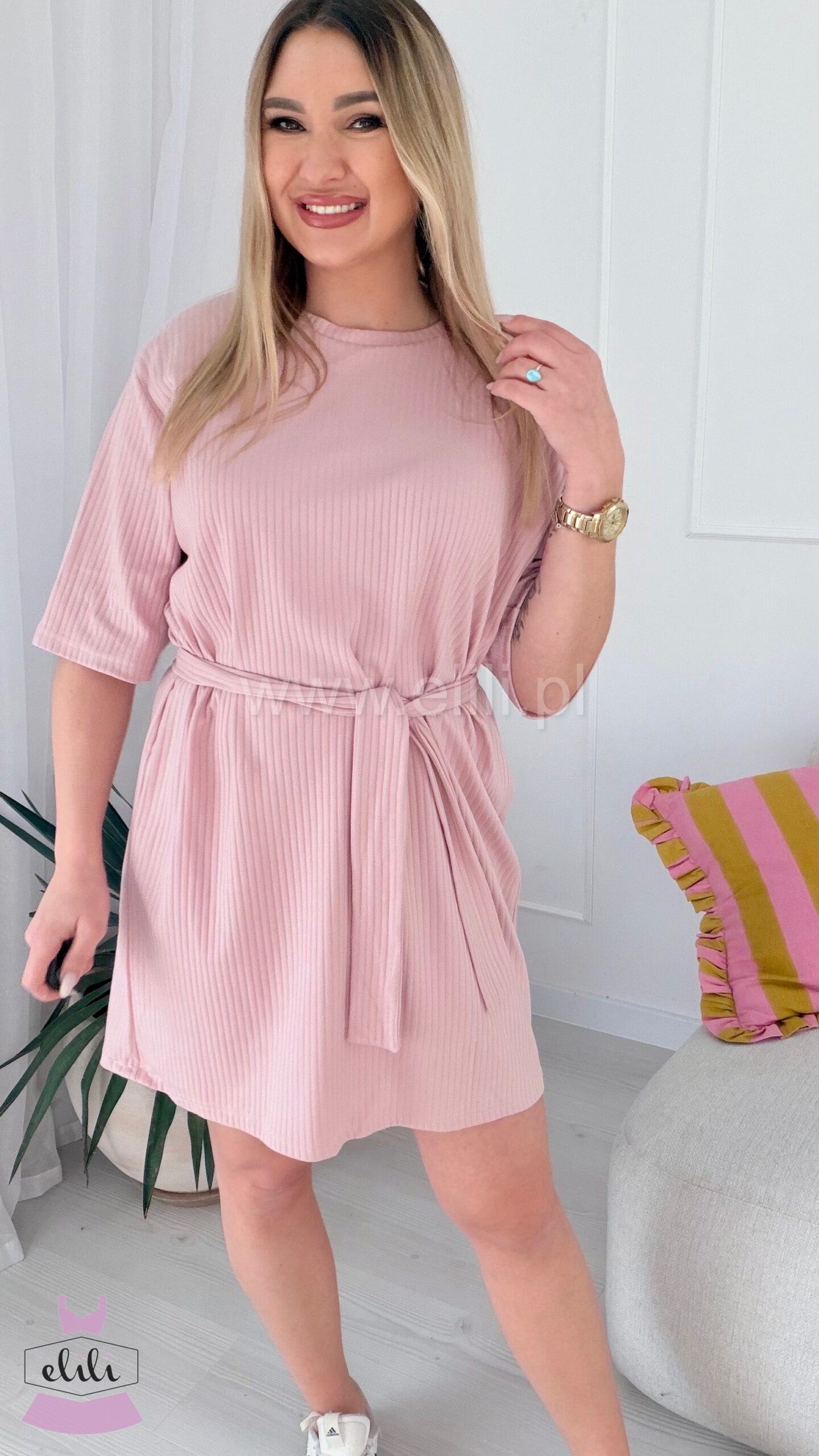 Prosta, casualowa sukienka o luźnym kroju przed kolano. Wykonana z bawełny, dzięki czemu jest miękka, oddychająca i elastyczna, co zapewnia komfort noszenia.