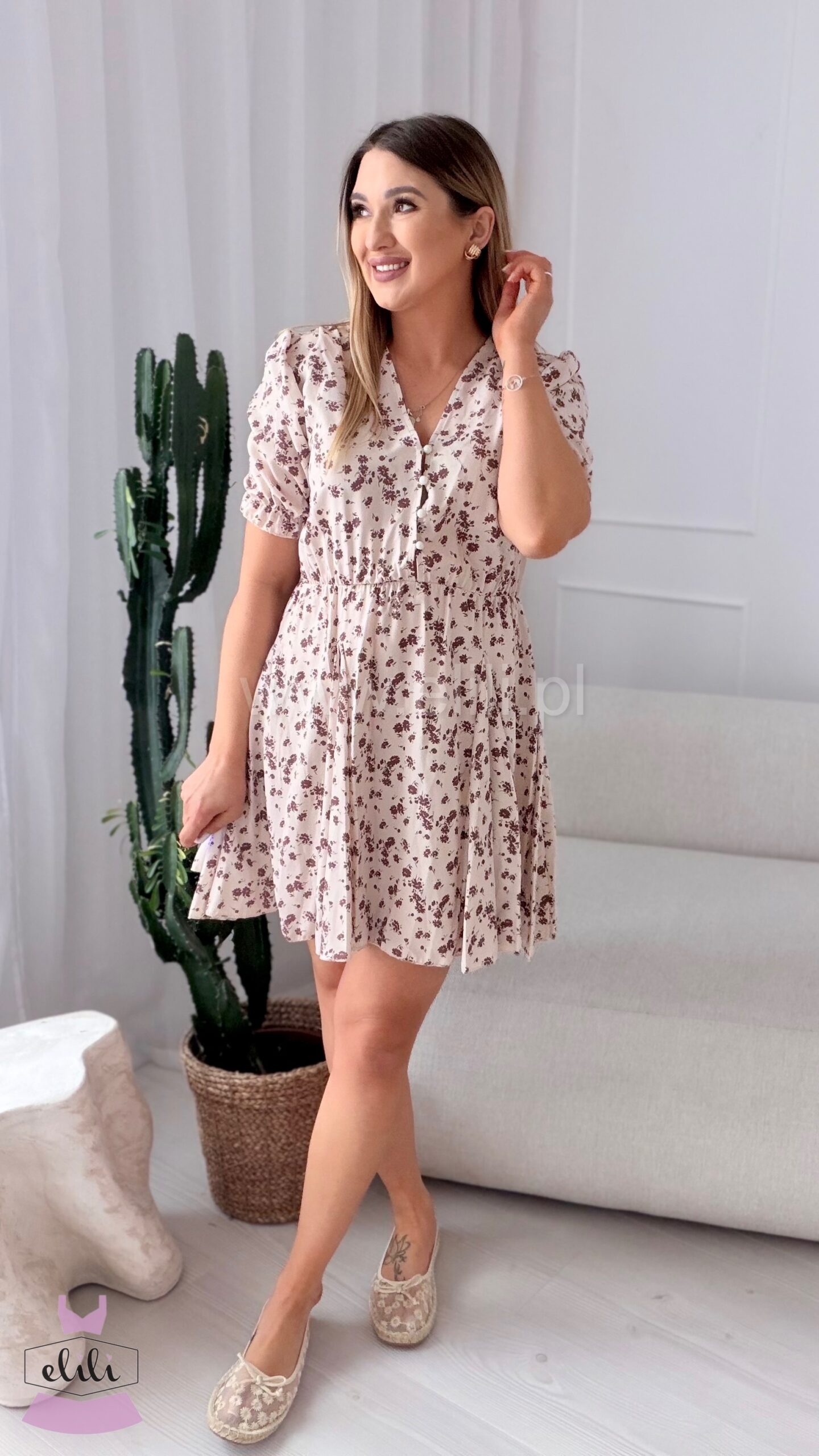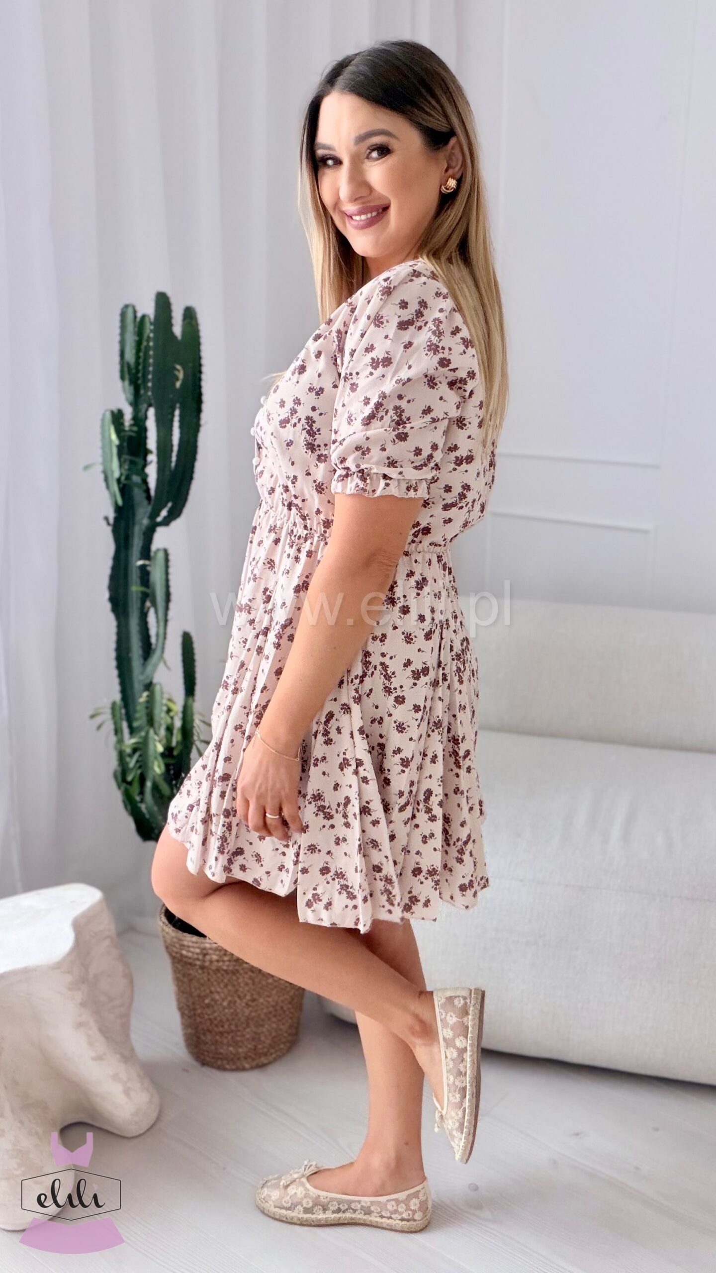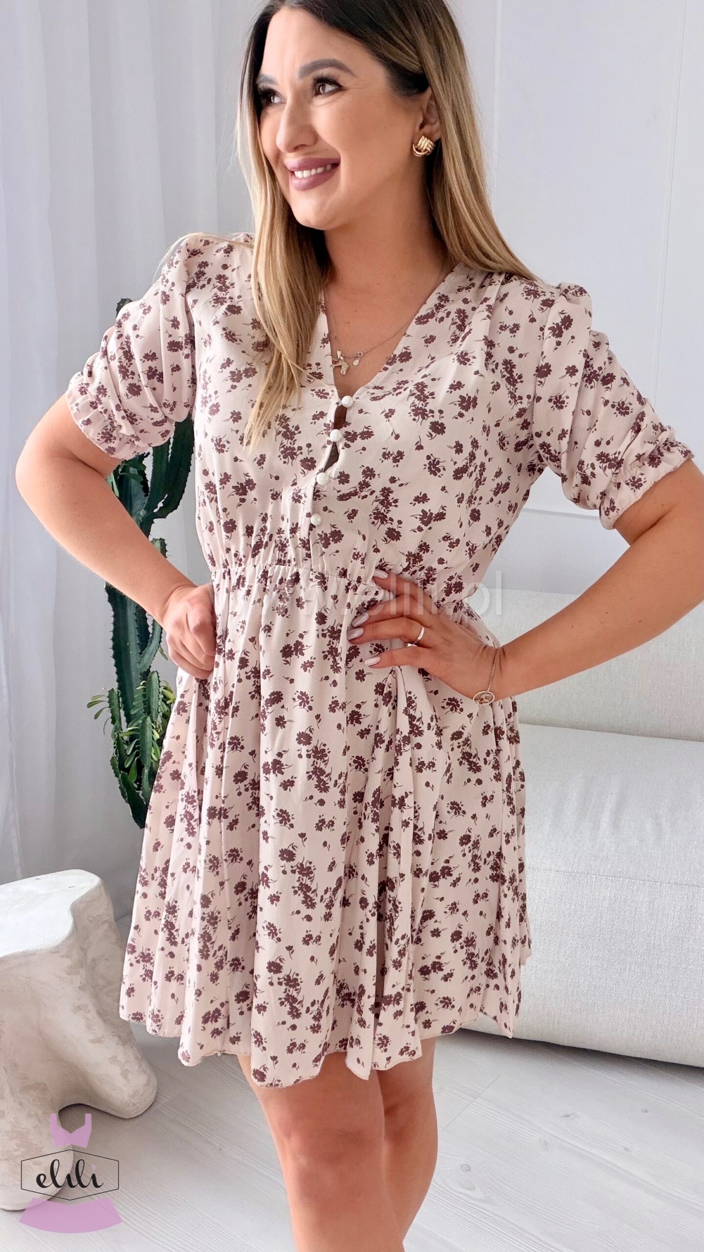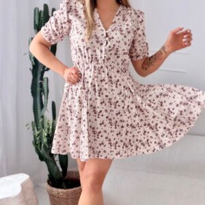 Sukienka Ewa mini beżowa w brązowe kwiatuszki