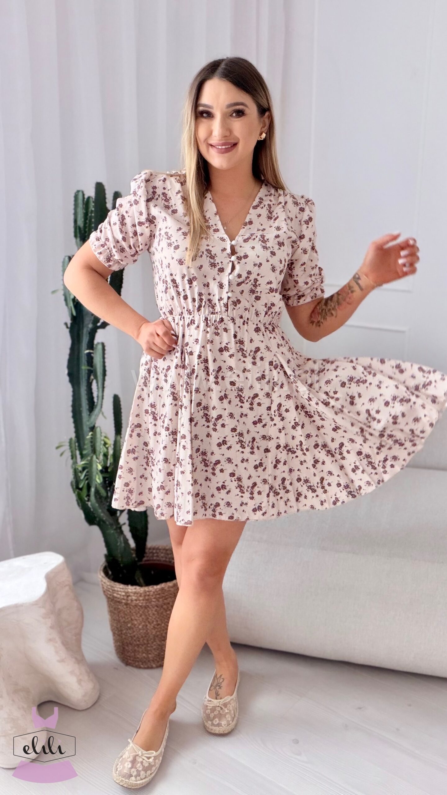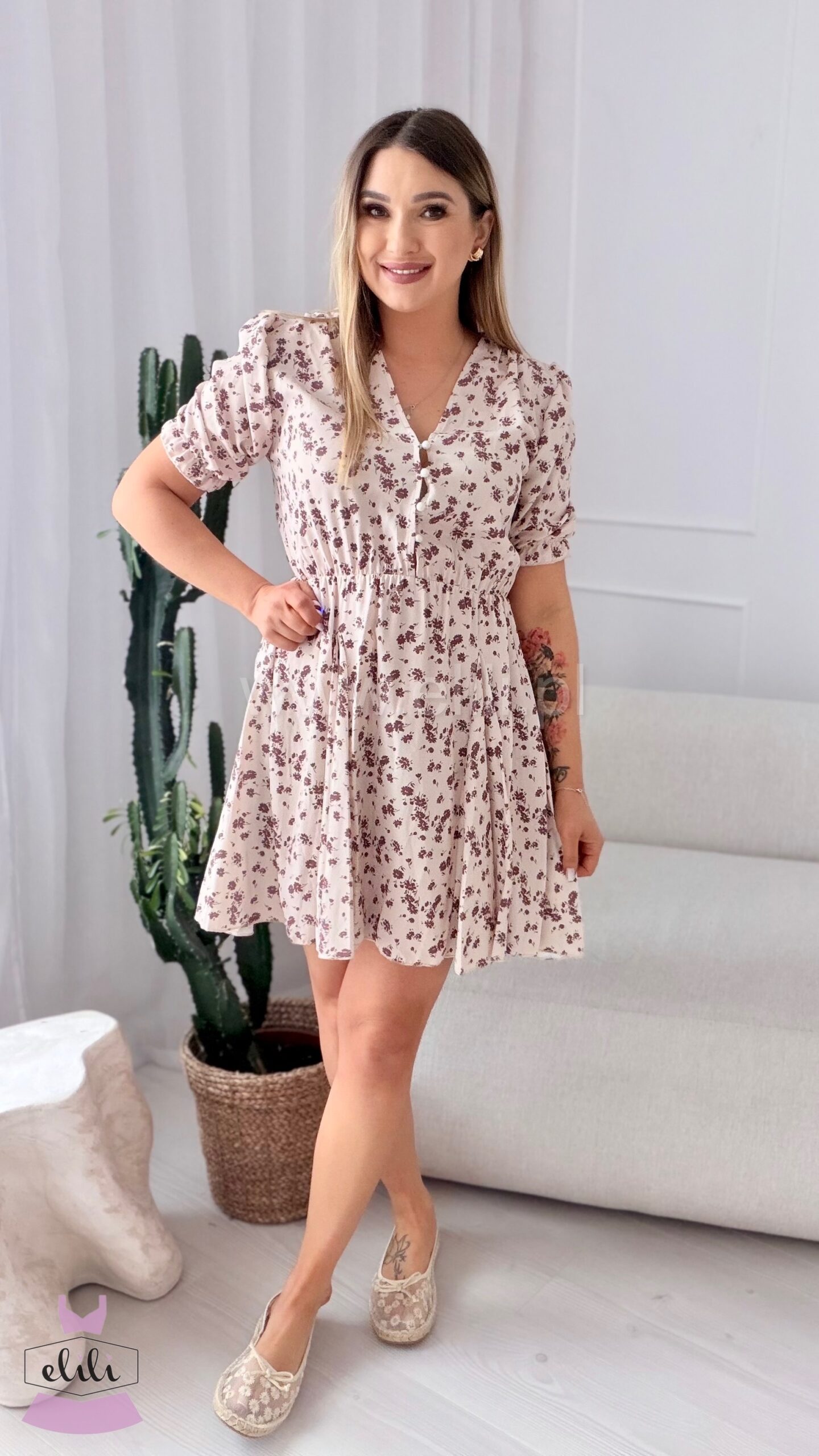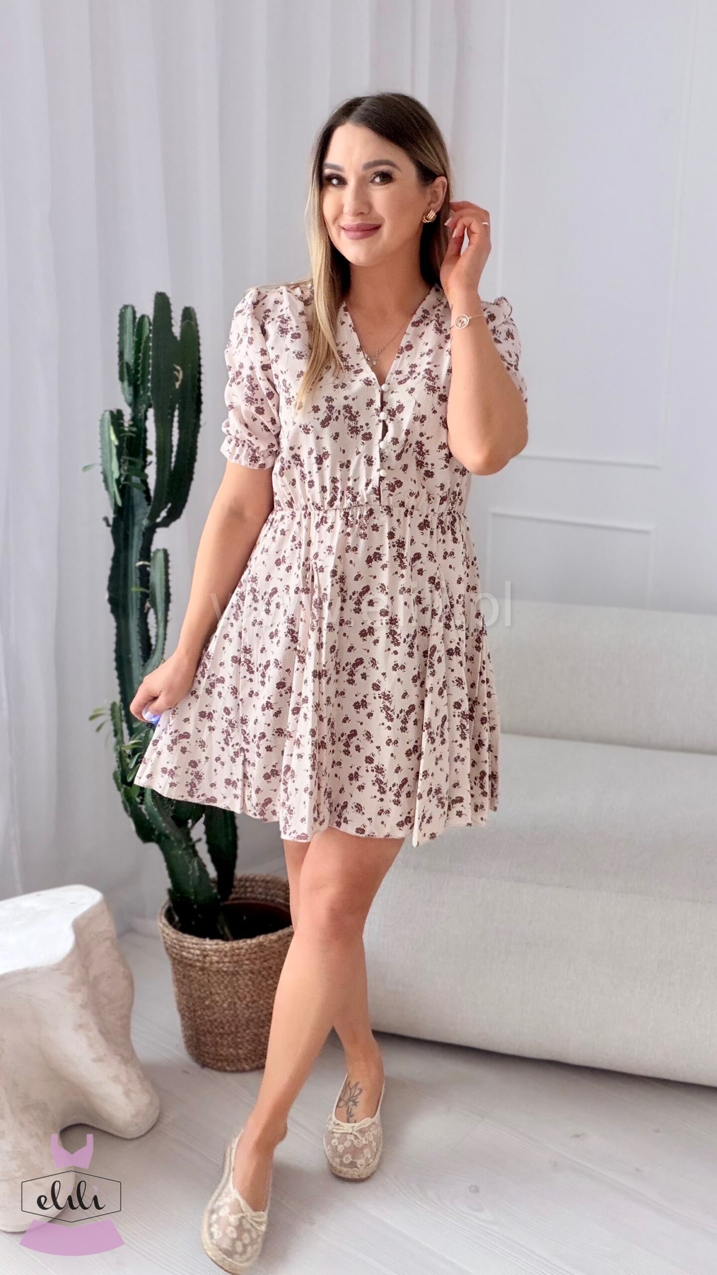 Sukienka Ewa mini beżowa w brązowe kwiatuszki