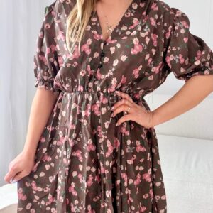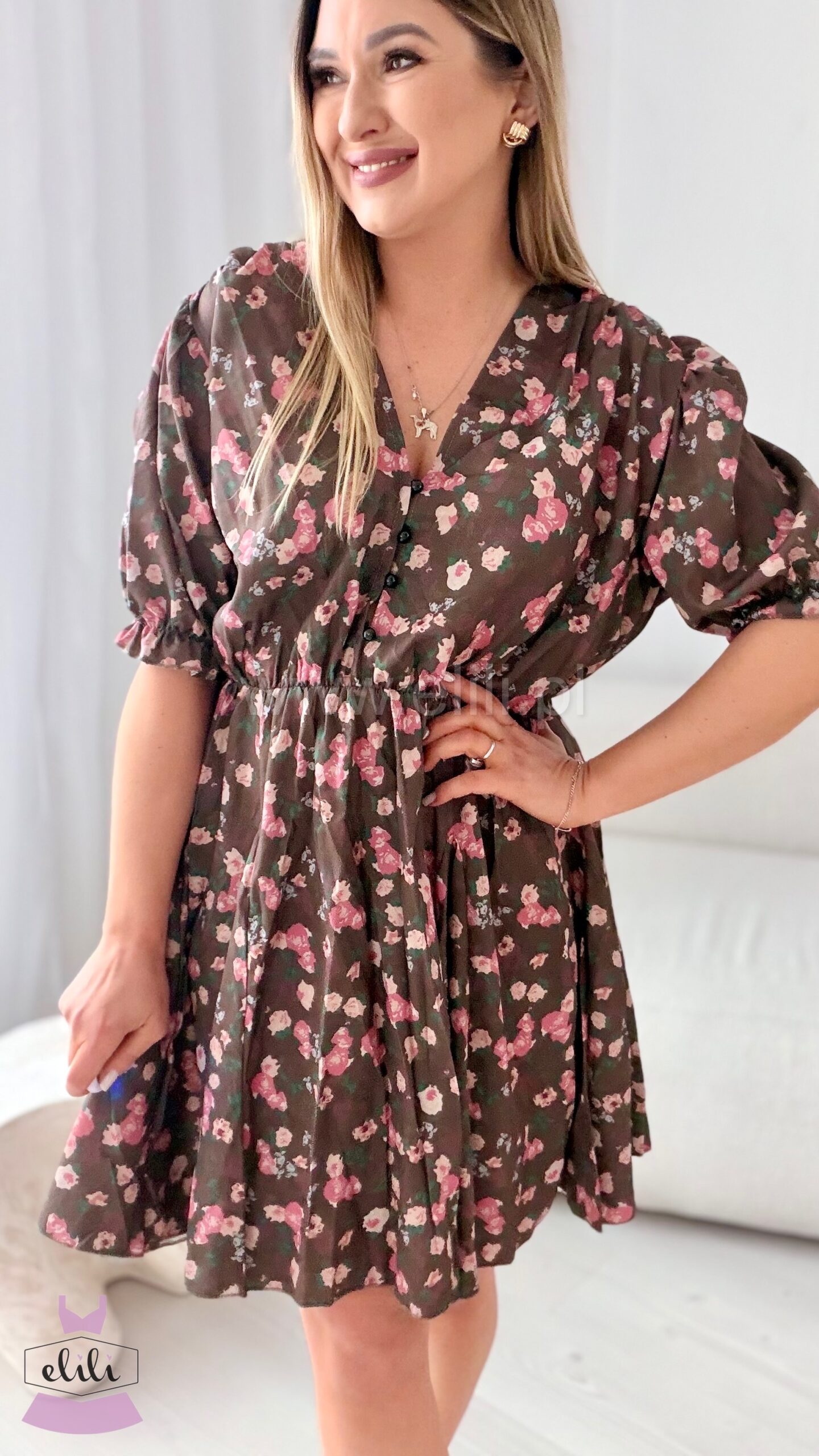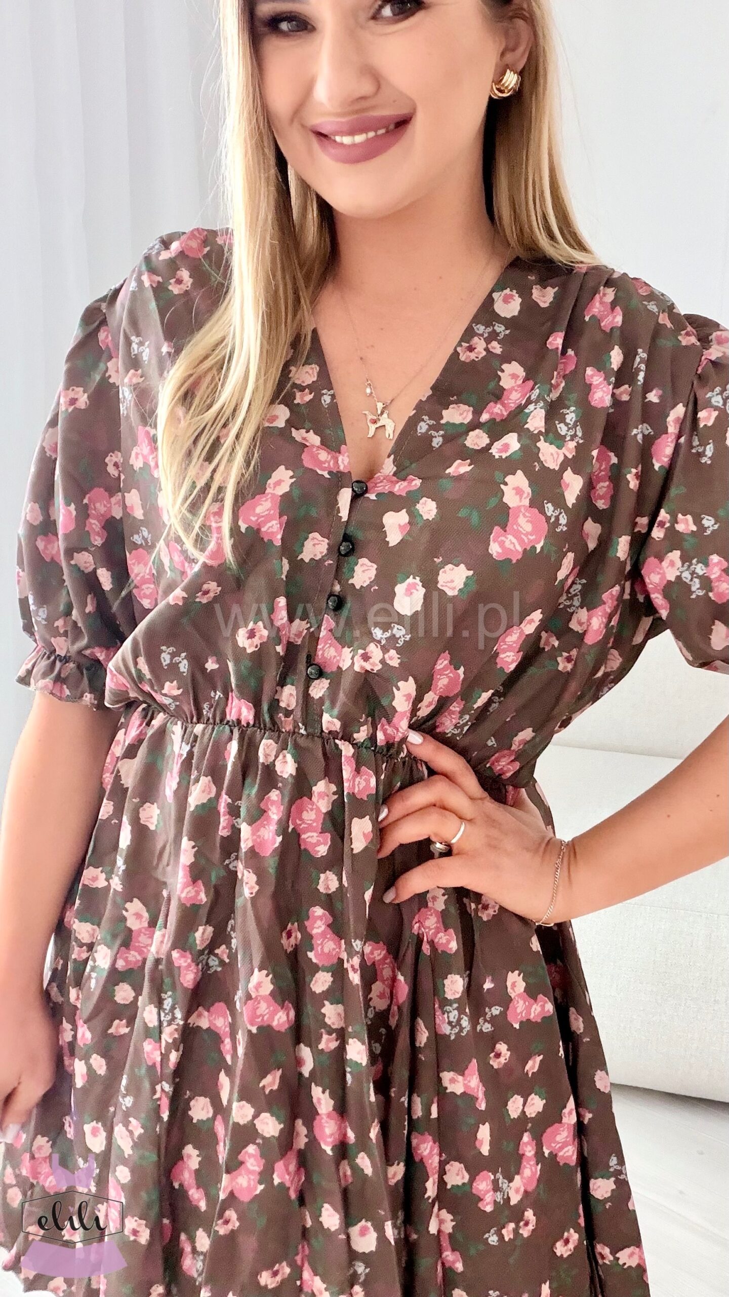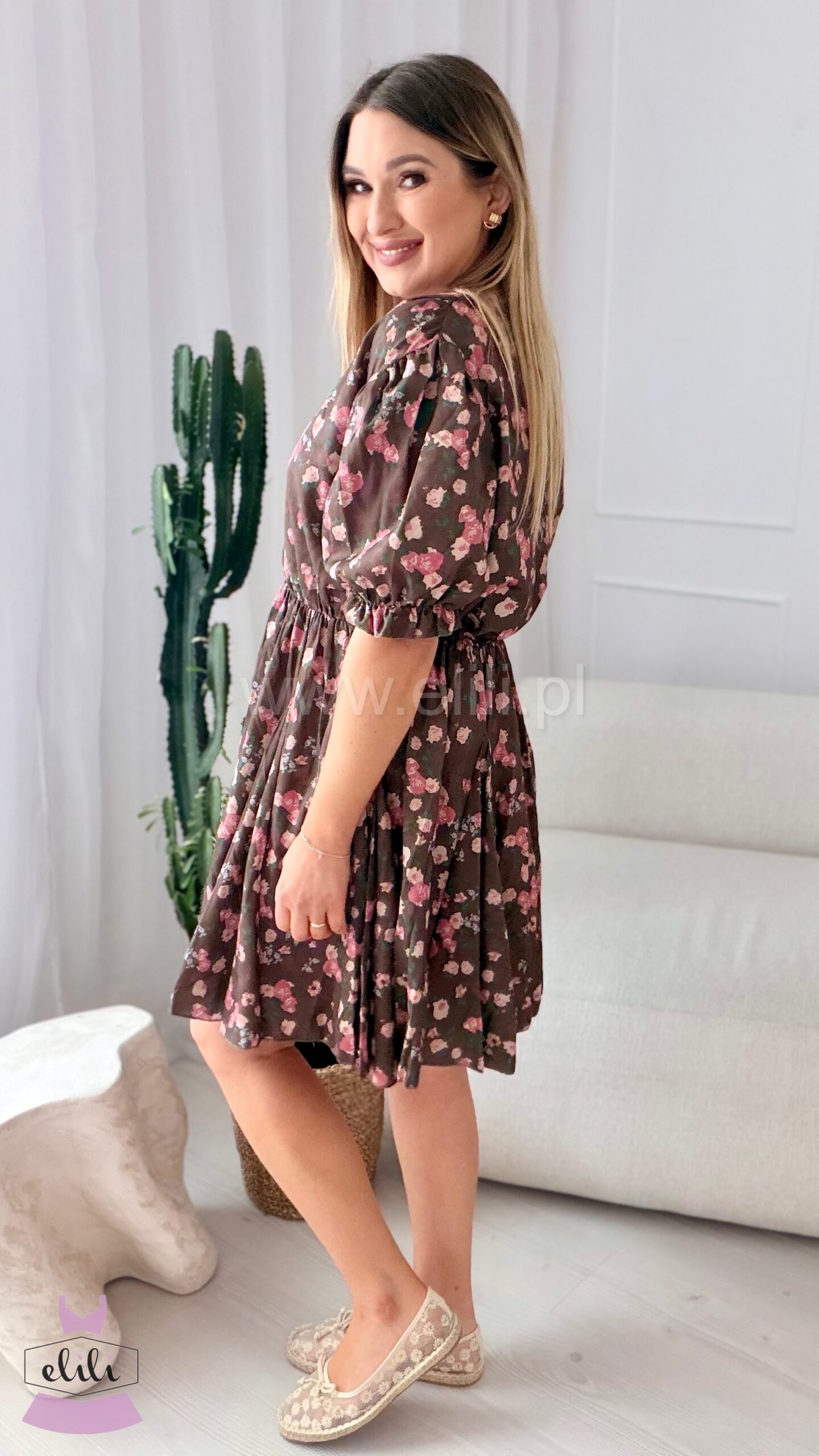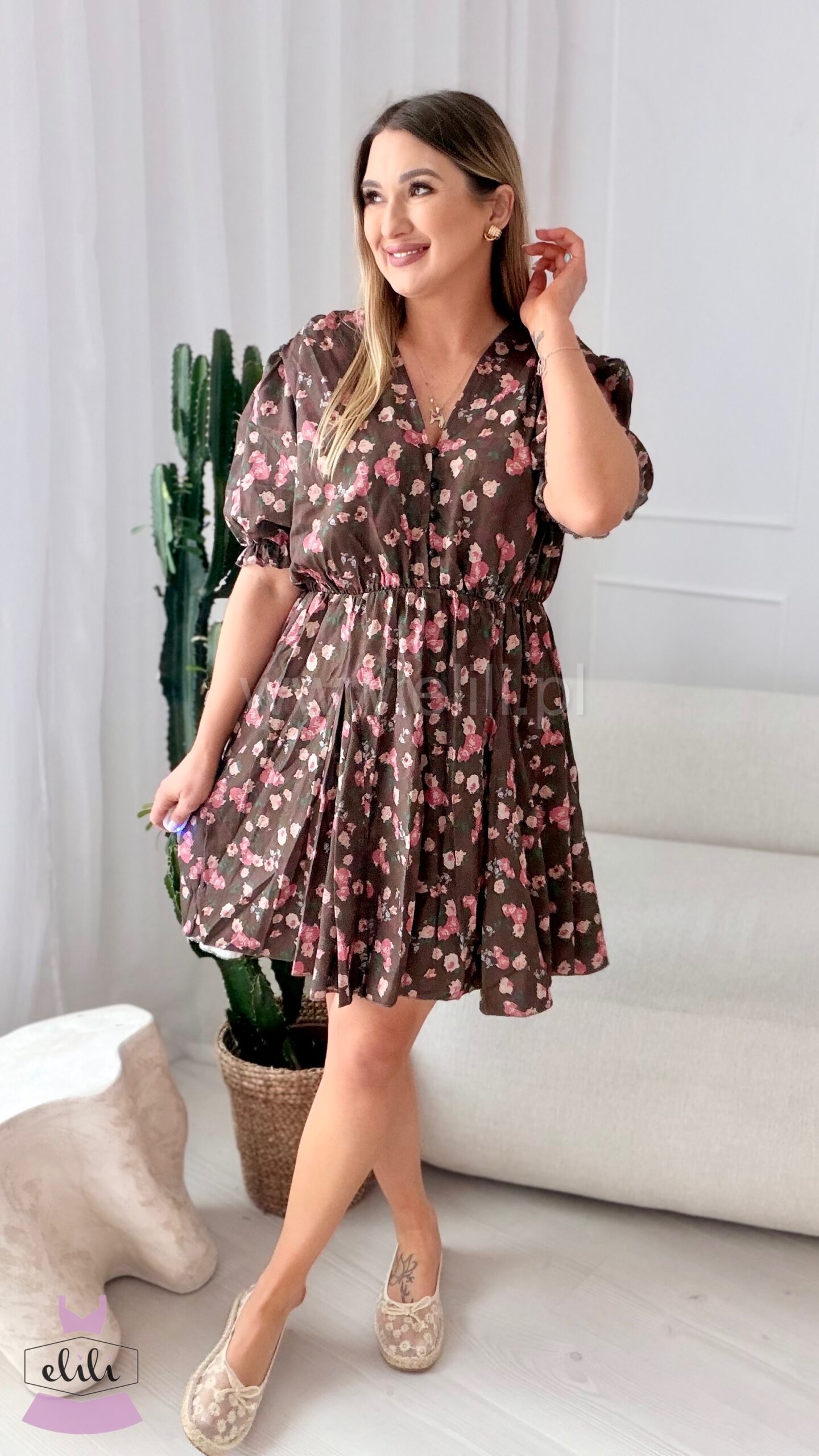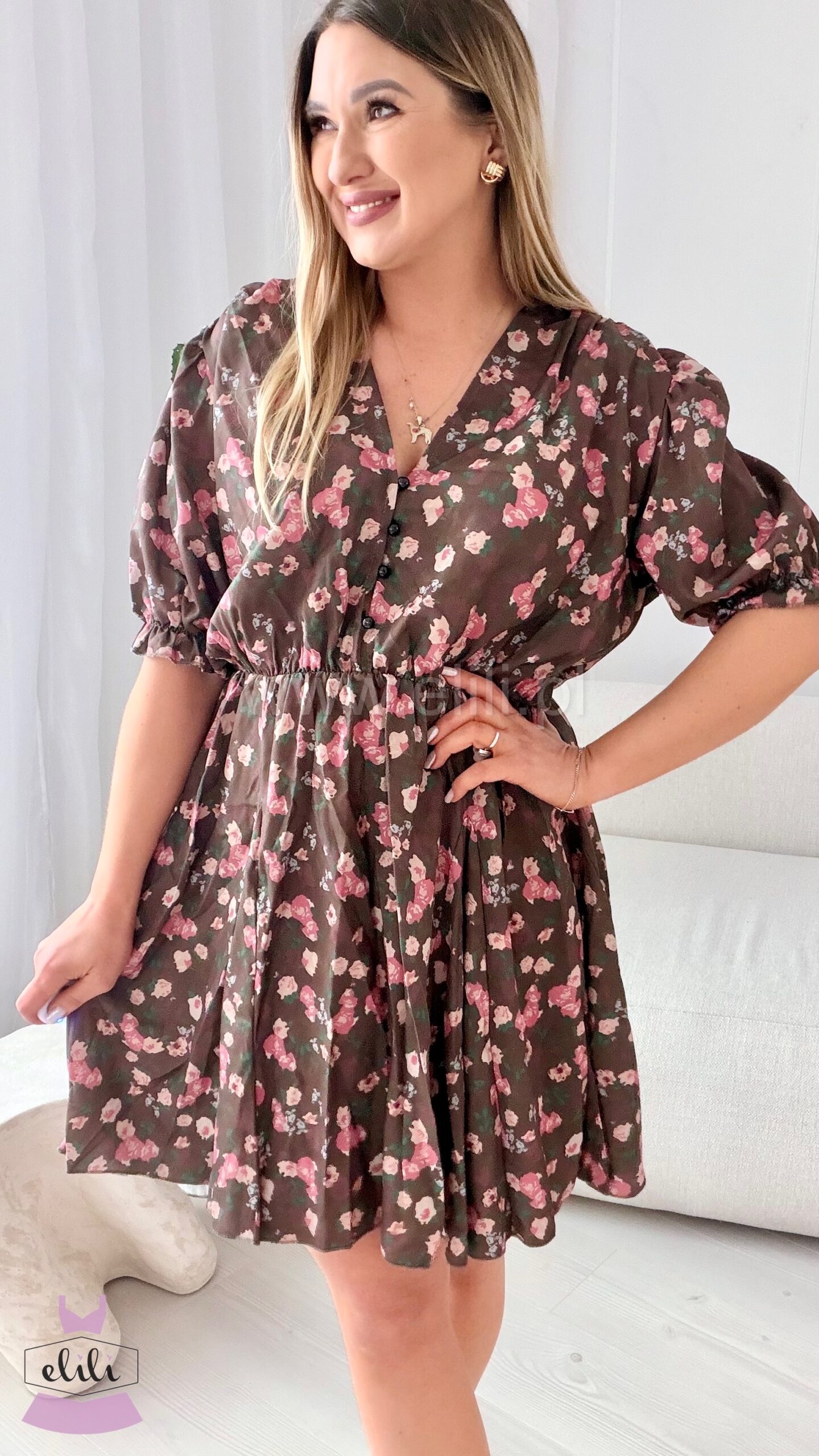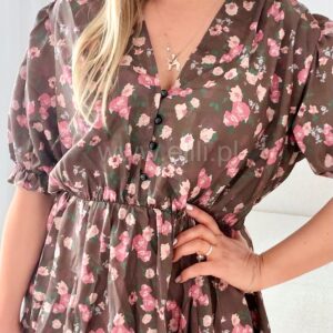 Sukienka Ewa mini PLUS SIZE czekoladowa w herbaciane kwiatki