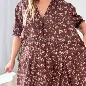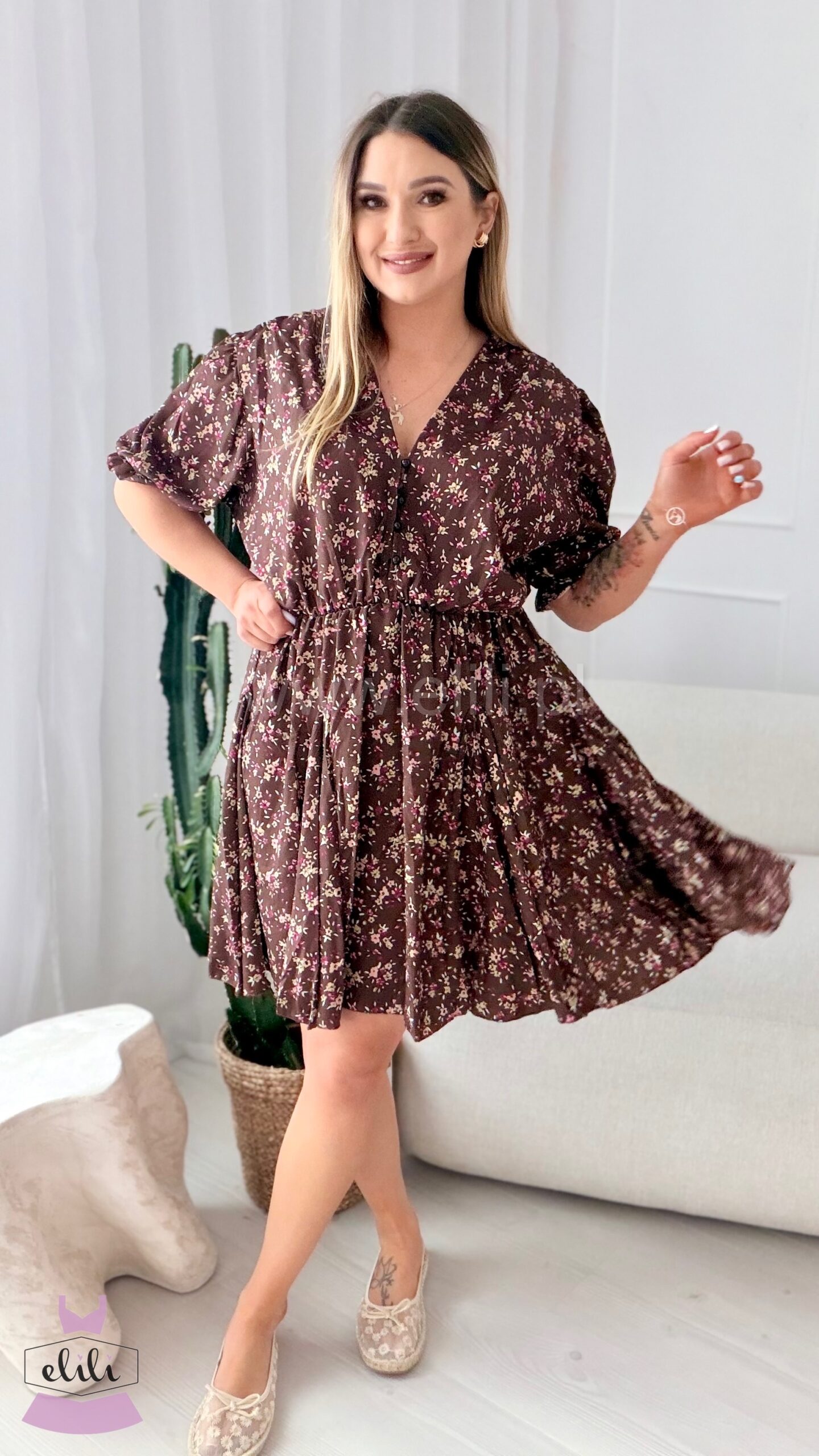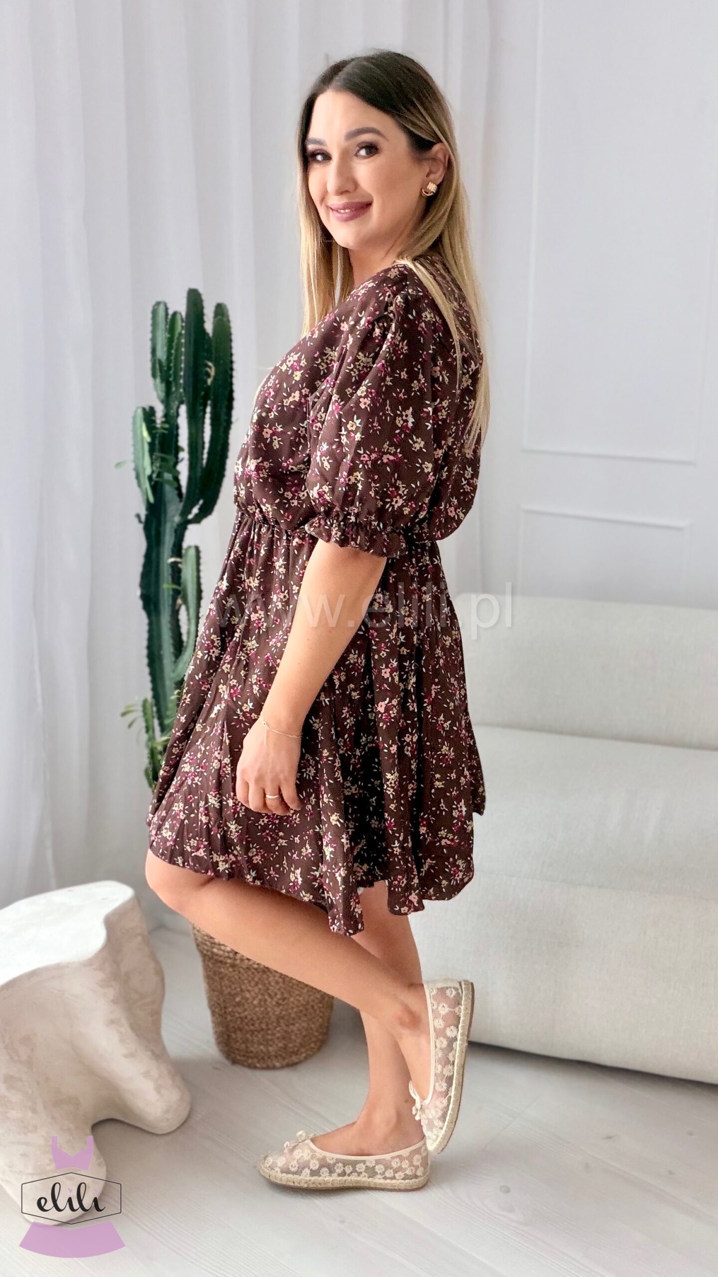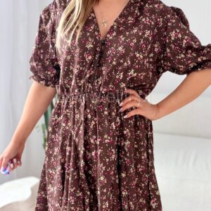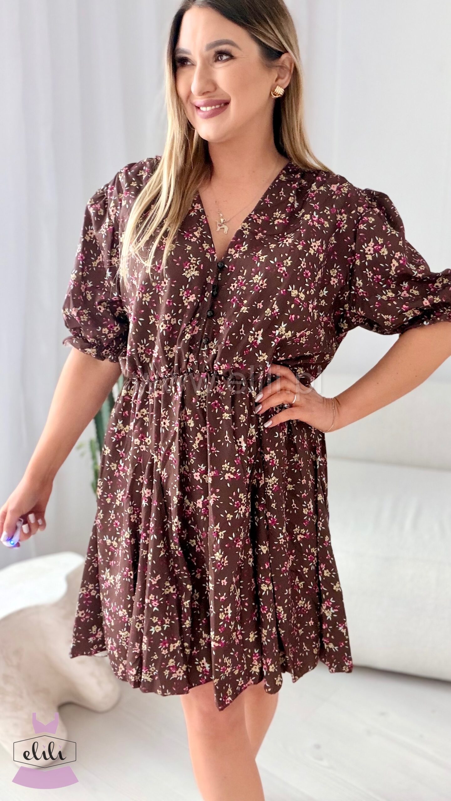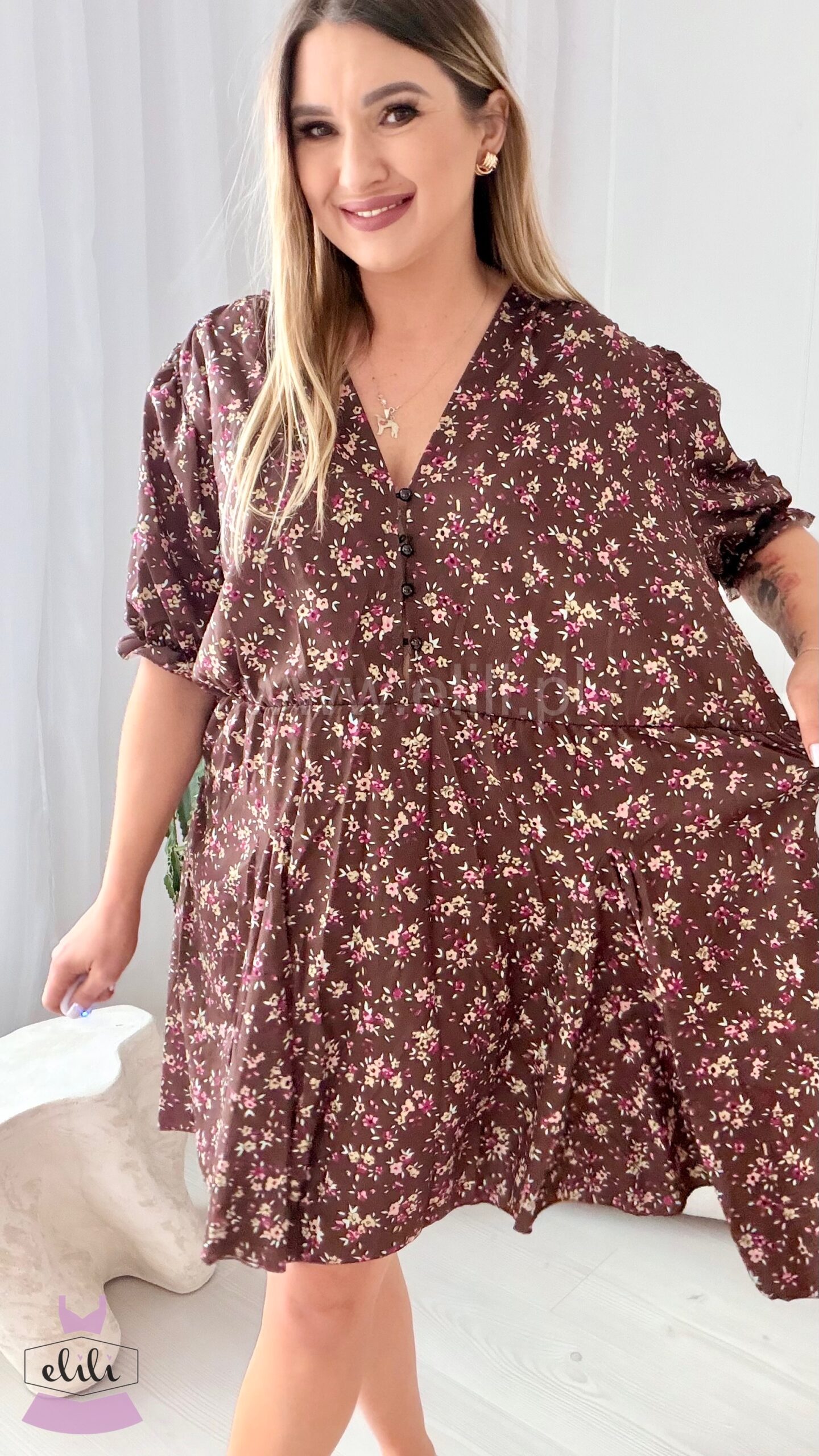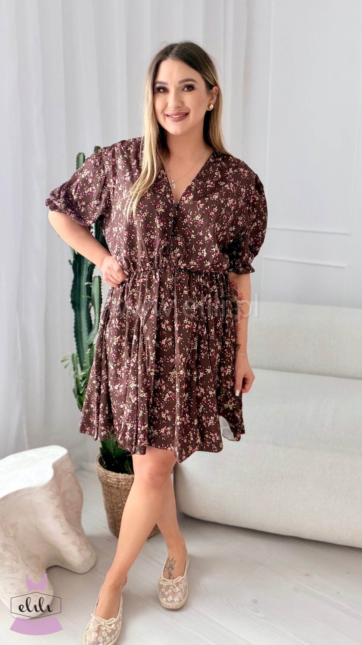 Góra zapinana na guziki dodaje uroku i pozwala regulować dekolt, a elastyczna gumka w talii idealnie dopasowuje się do figury, podkreślając jej atuty. Krótki rękaw sprawia, że sukienka świetnie sprawdzi się w cieplejsze dni, a dół szyty z koła nadaje jej lekkości i pięknego ruchu podczas chodzenia.