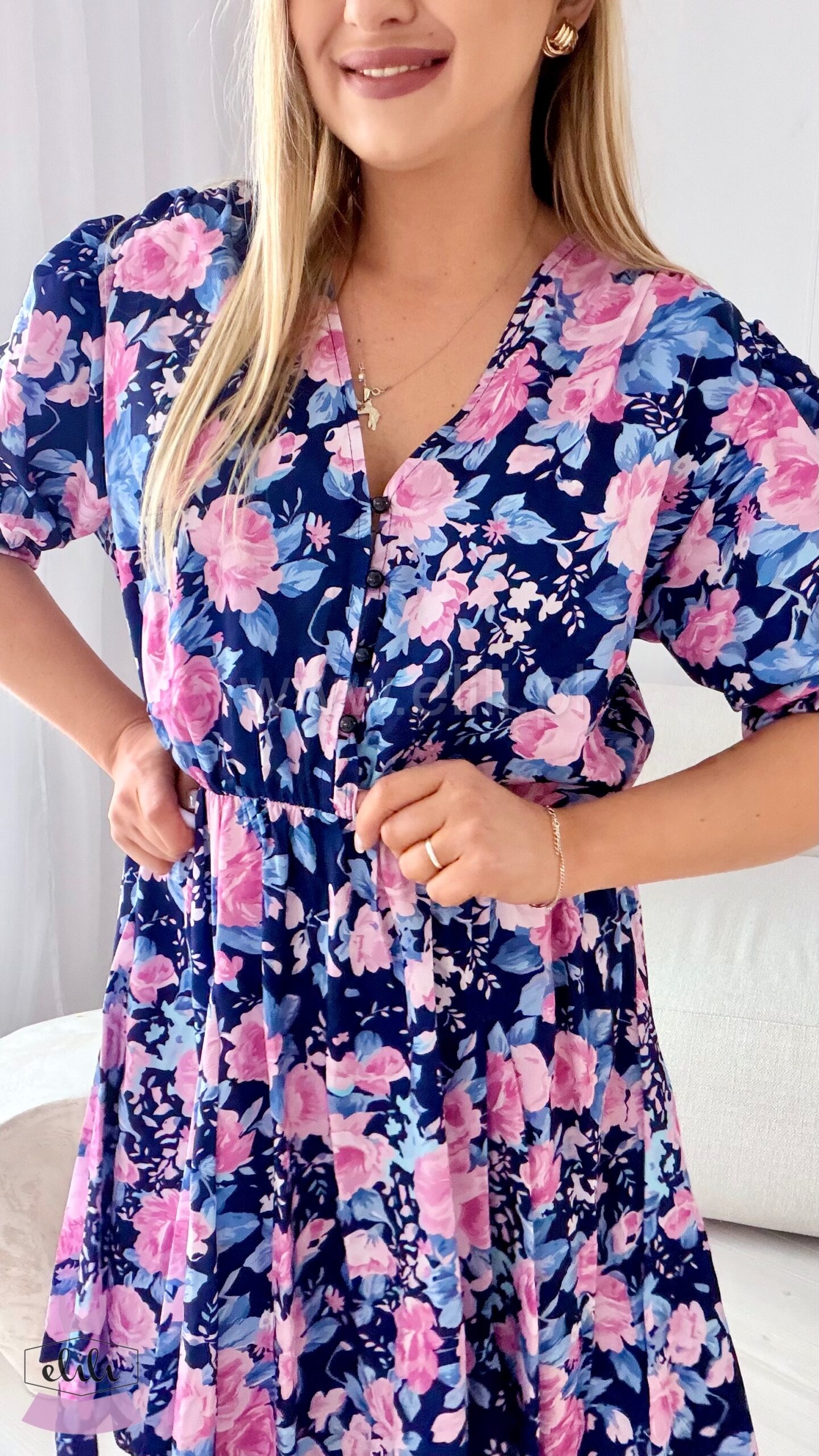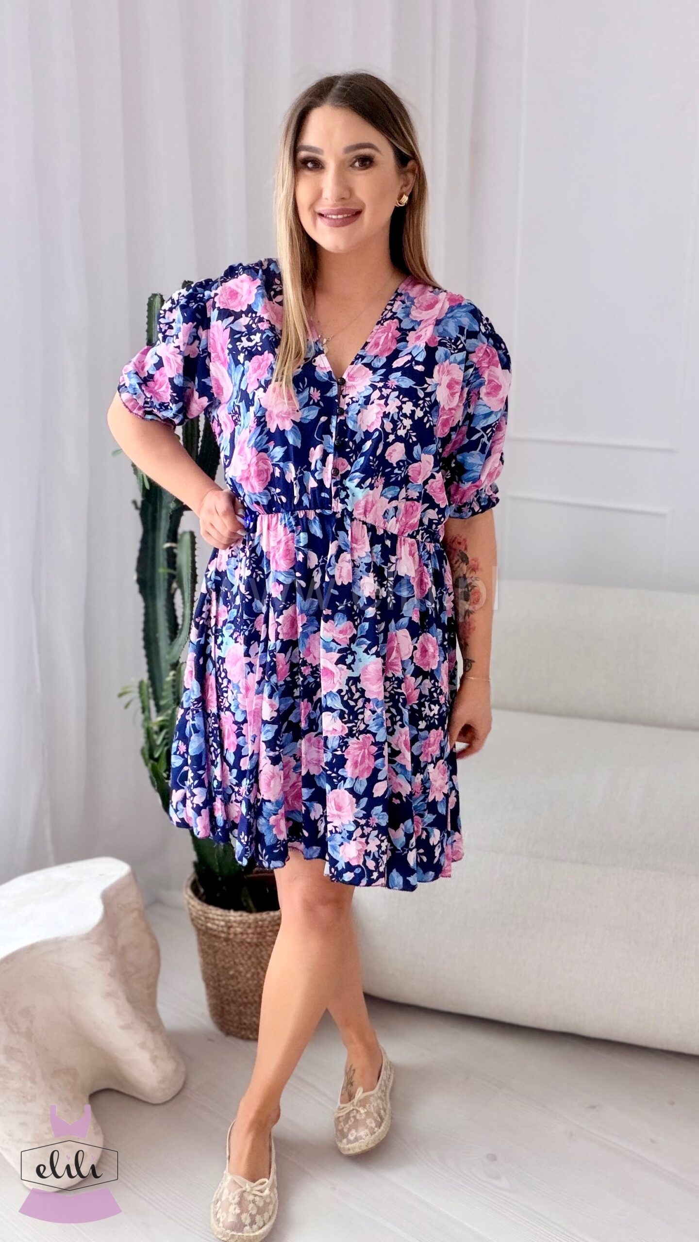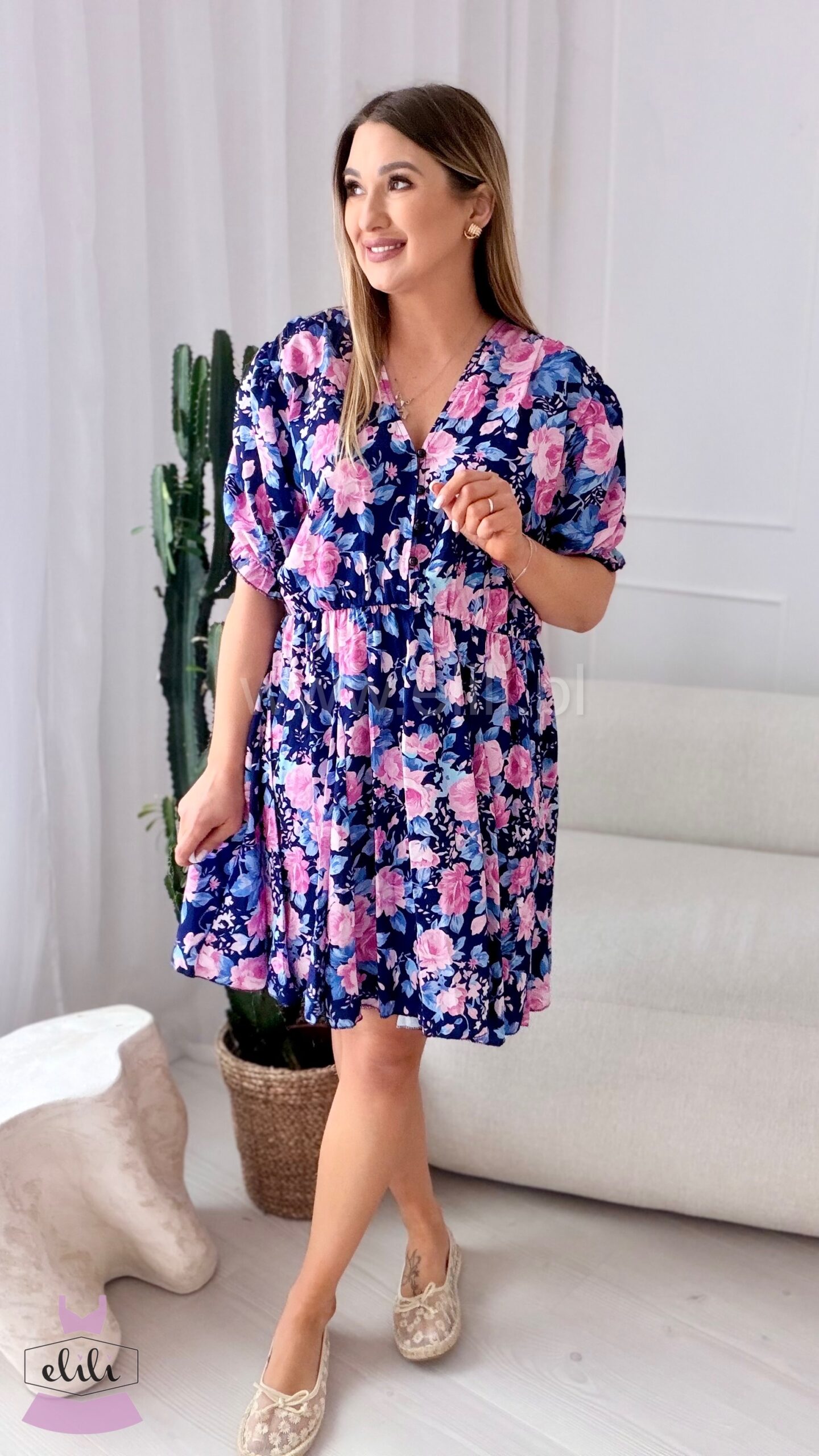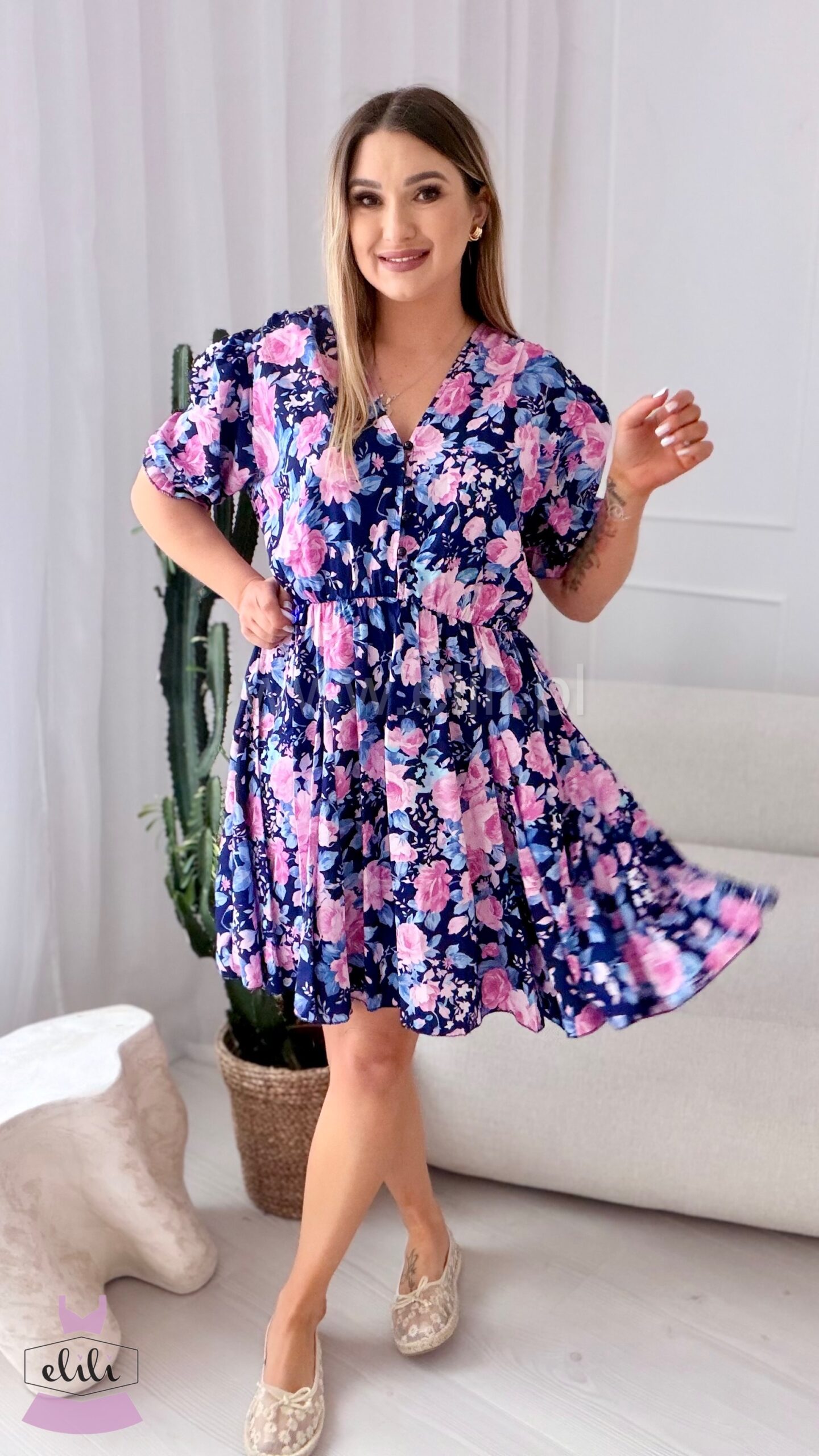 Prześliczna sukienka uszyta w rozmiarze plus size. Dekolt w serek zapinany na guziczki, umożliwiać będzie karmienie piersią. W talii znajduje się gumka. Dół sukienki uszyty jest na kole.