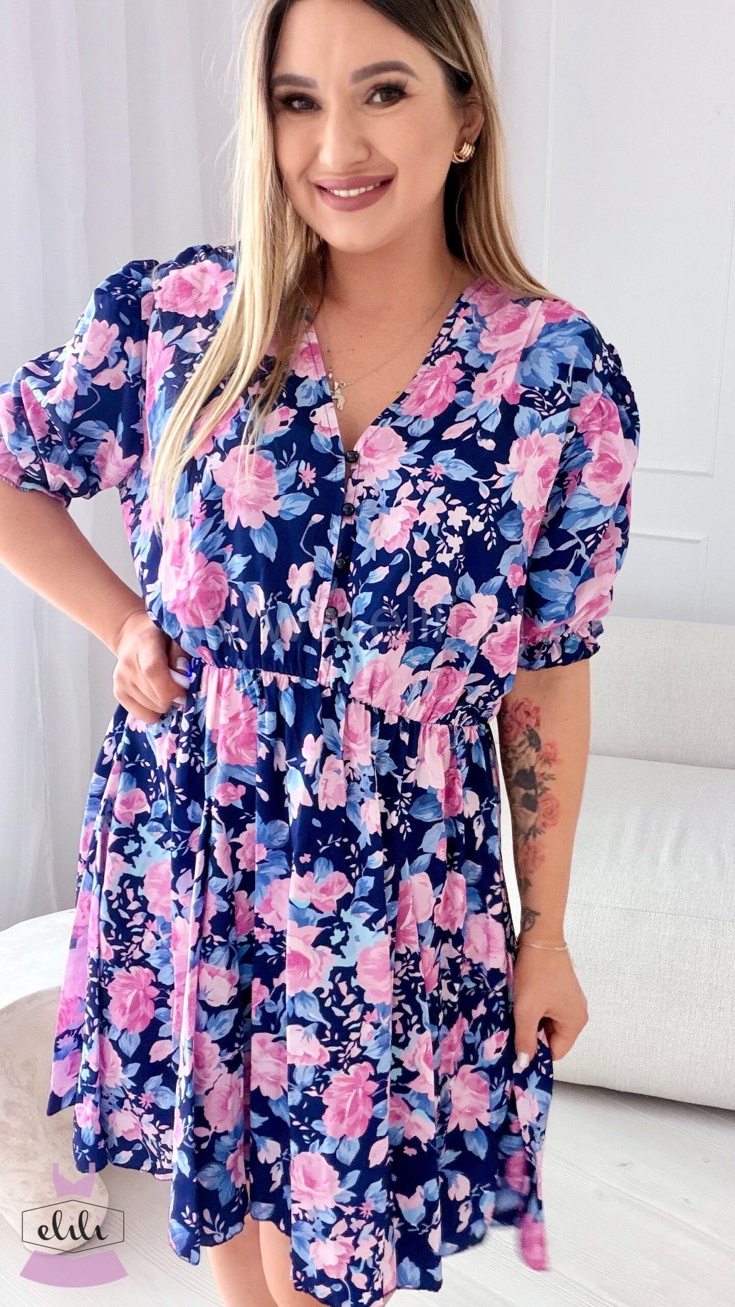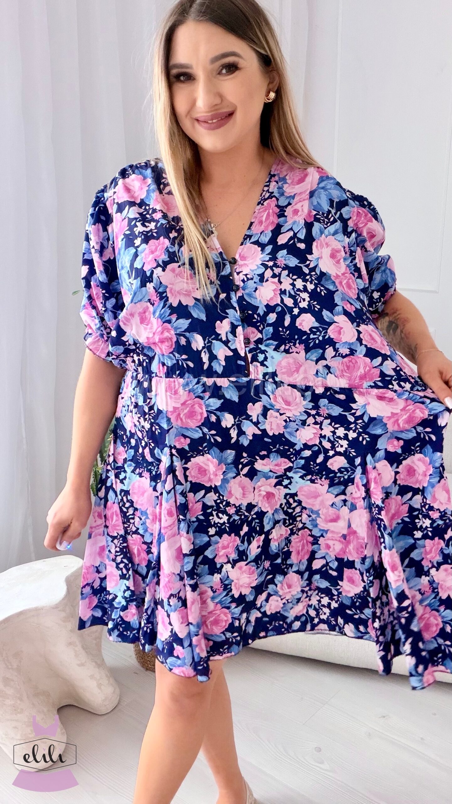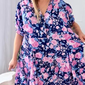 Sukienka Ewa mini PLUS SIZE granatowa w różowe kwiaty