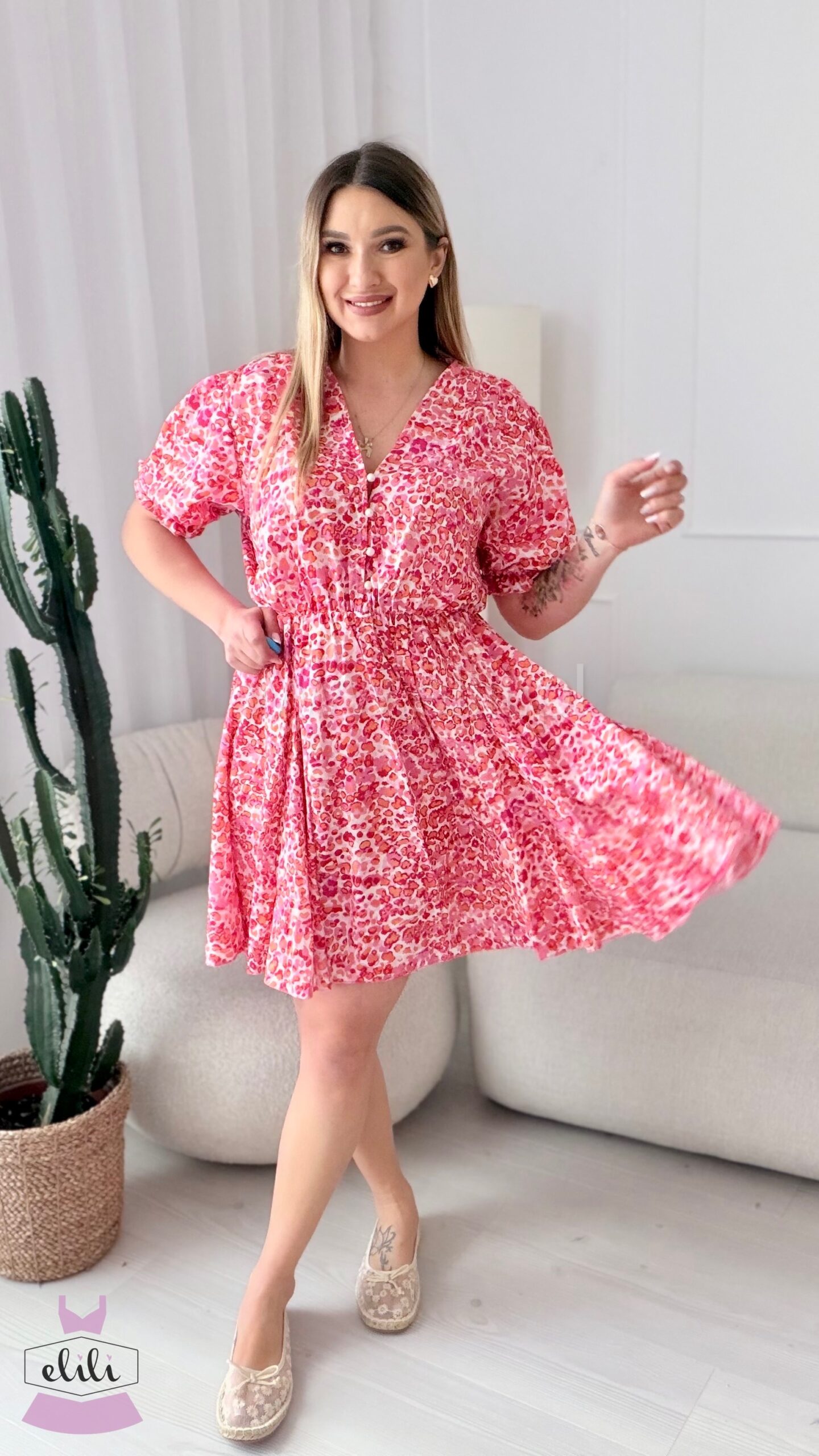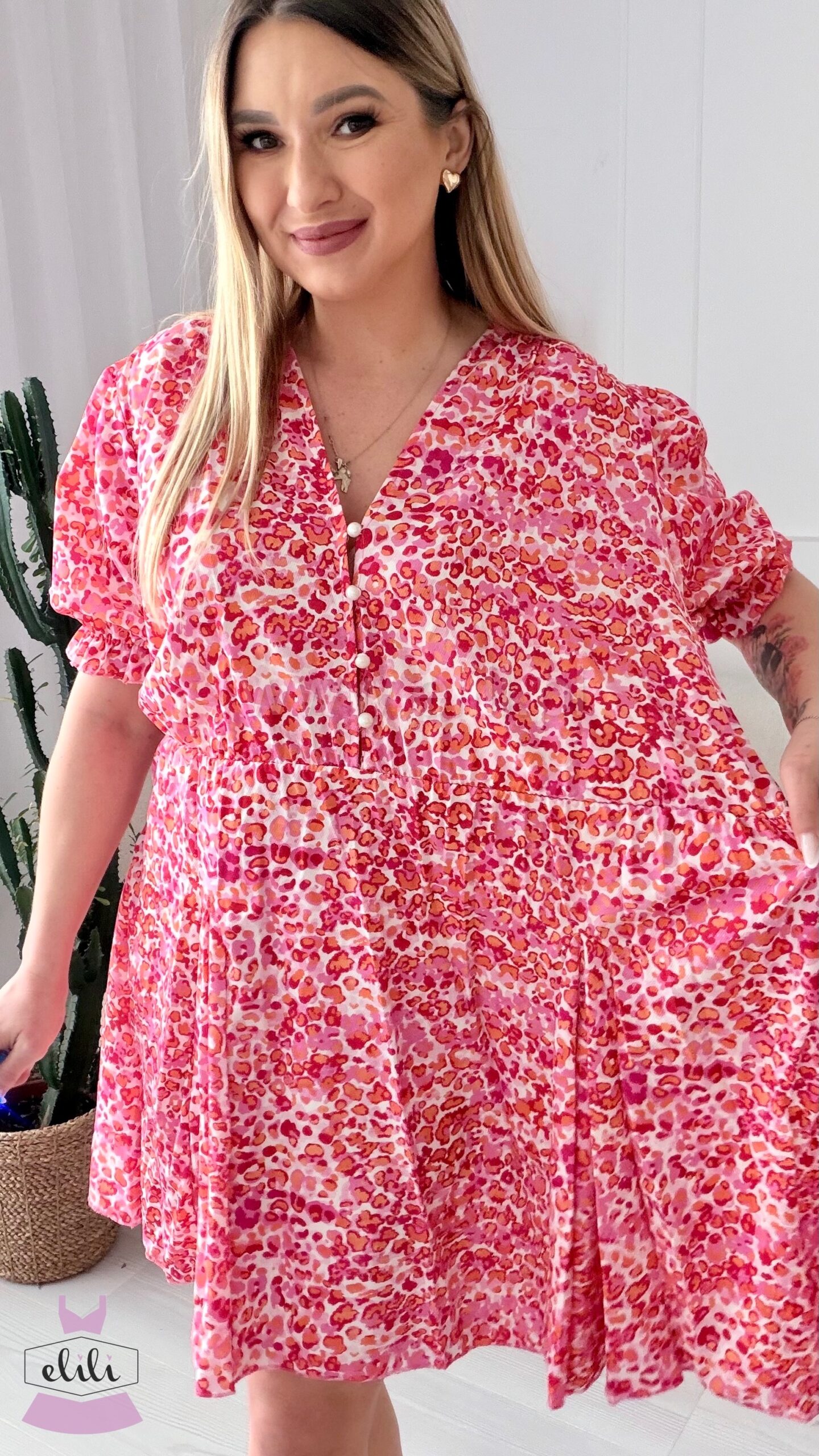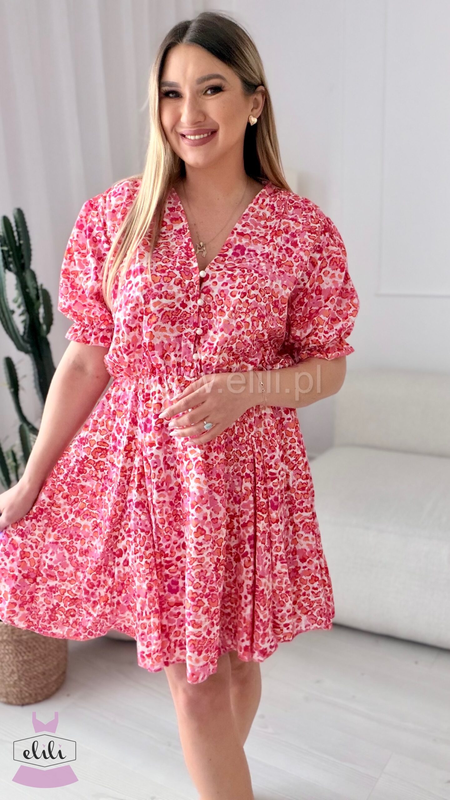 Prześliczna sukienka uszyta w rozmiarze plus size. Dekolt w serek zapinany na guziczki, umożliwiać będzie karmienie piersią. W talii znajduje się gumka. Dół sukienki uszyty jest na kole.