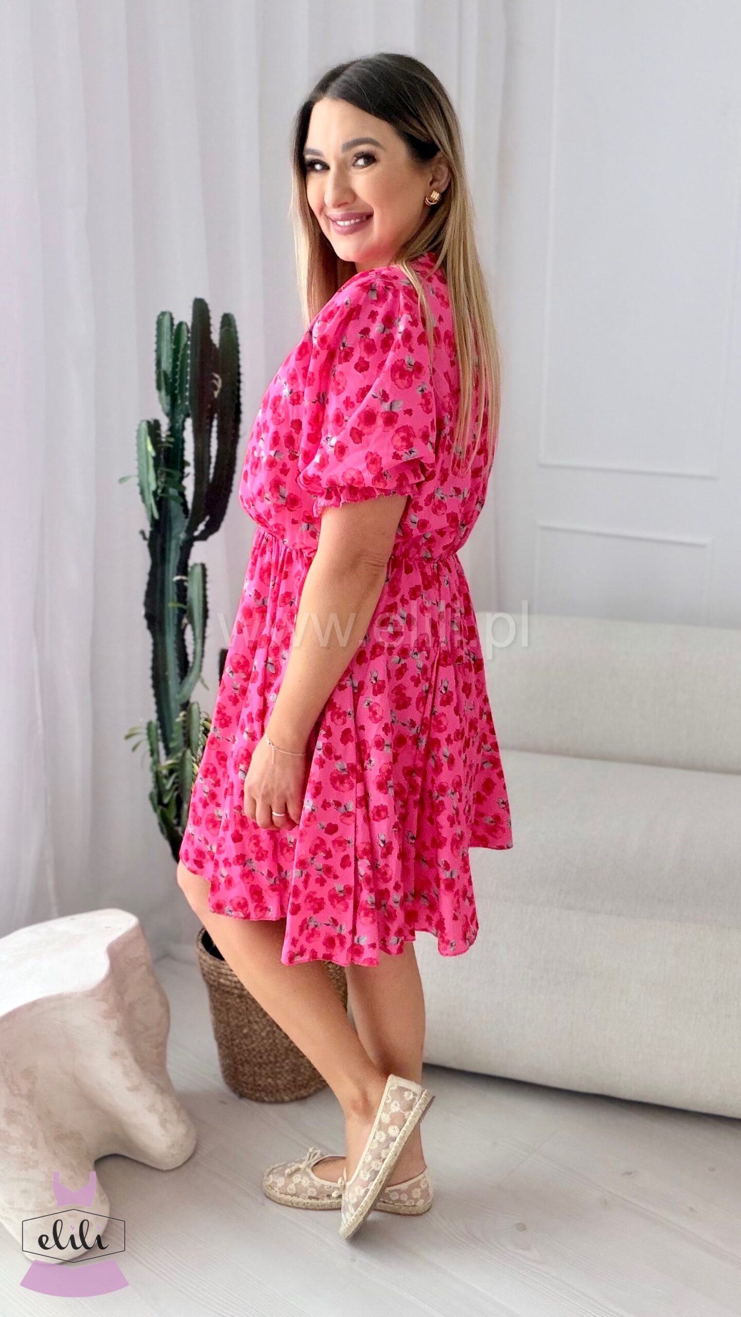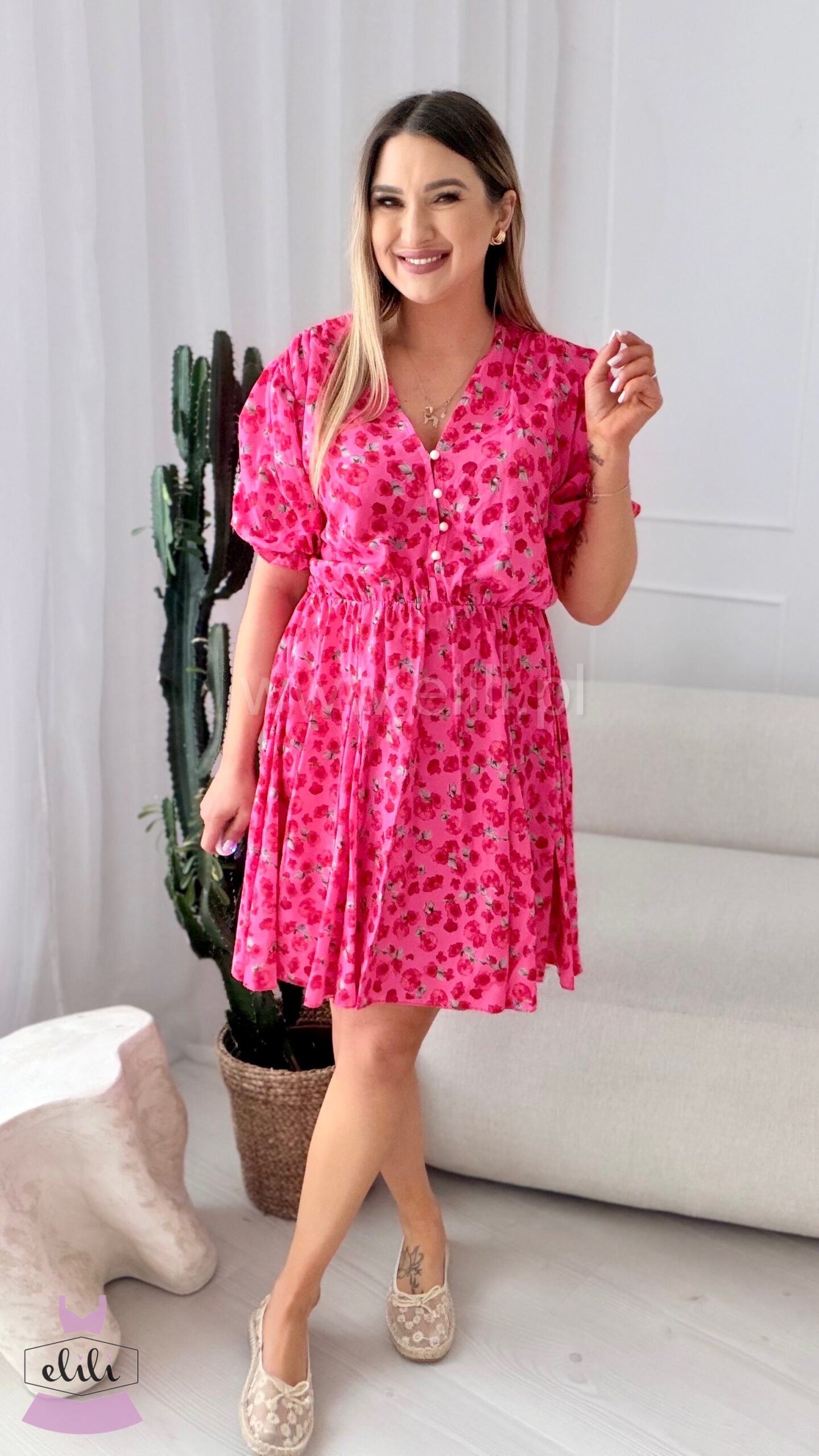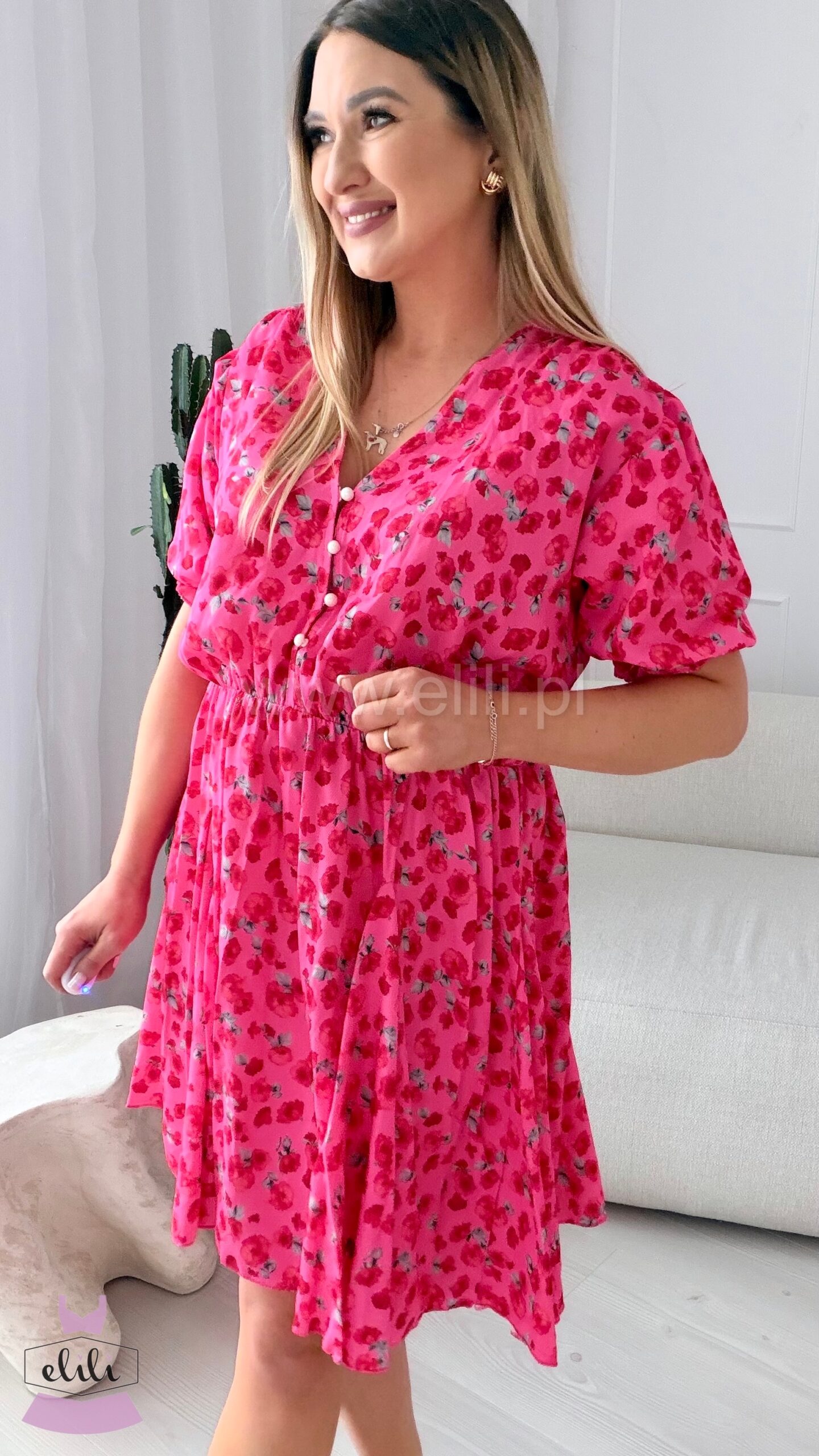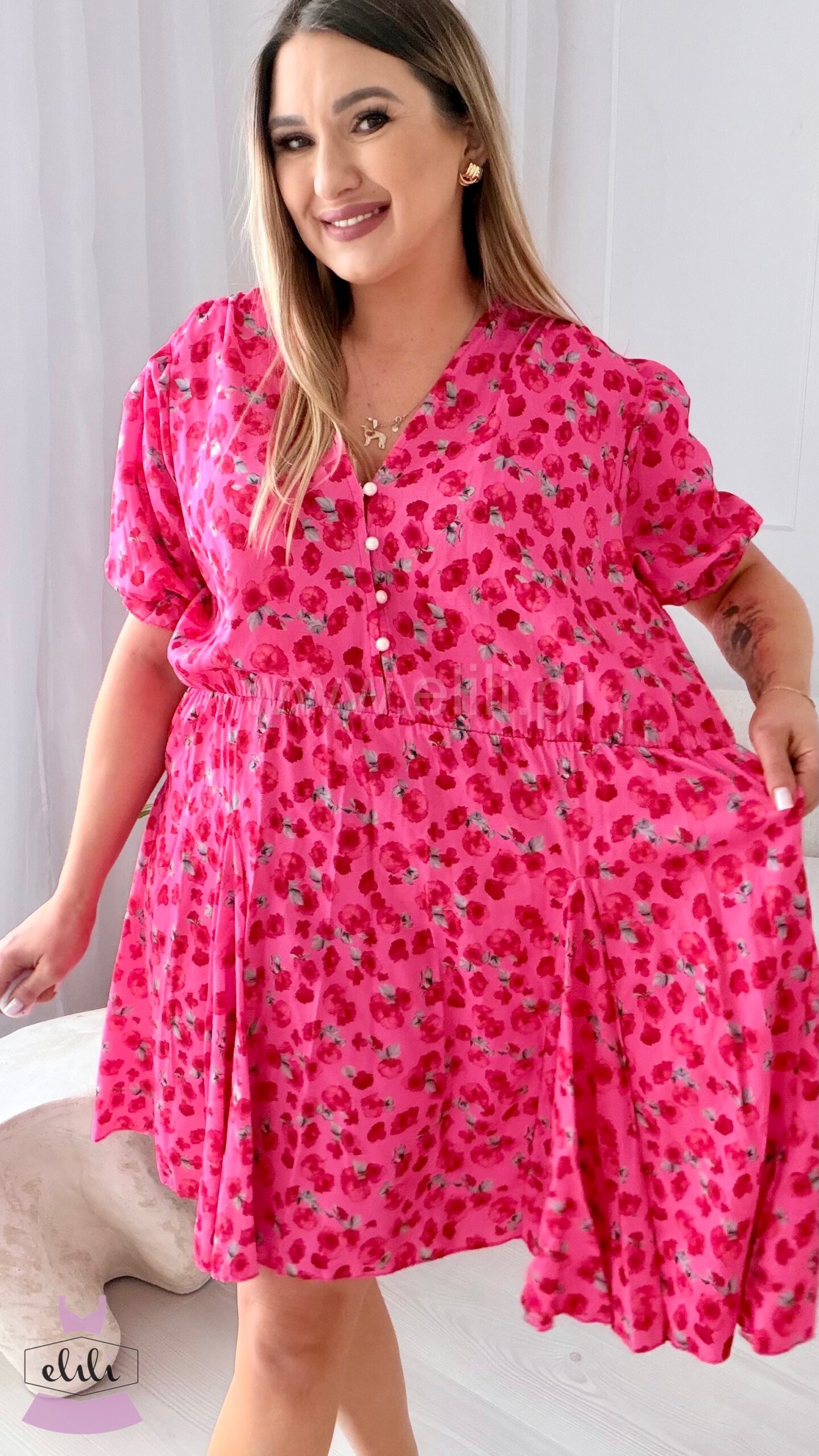 Prześliczna sukienka uszyta w rozmiarze plus size. Dekolt w serek zapinany na guziczki, umożliwiać będzie karmienie piersią. W talii znajduje się gumka. Dół sukienki uszyty jest na kole.