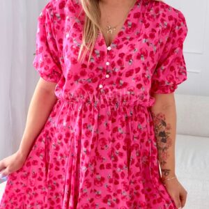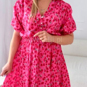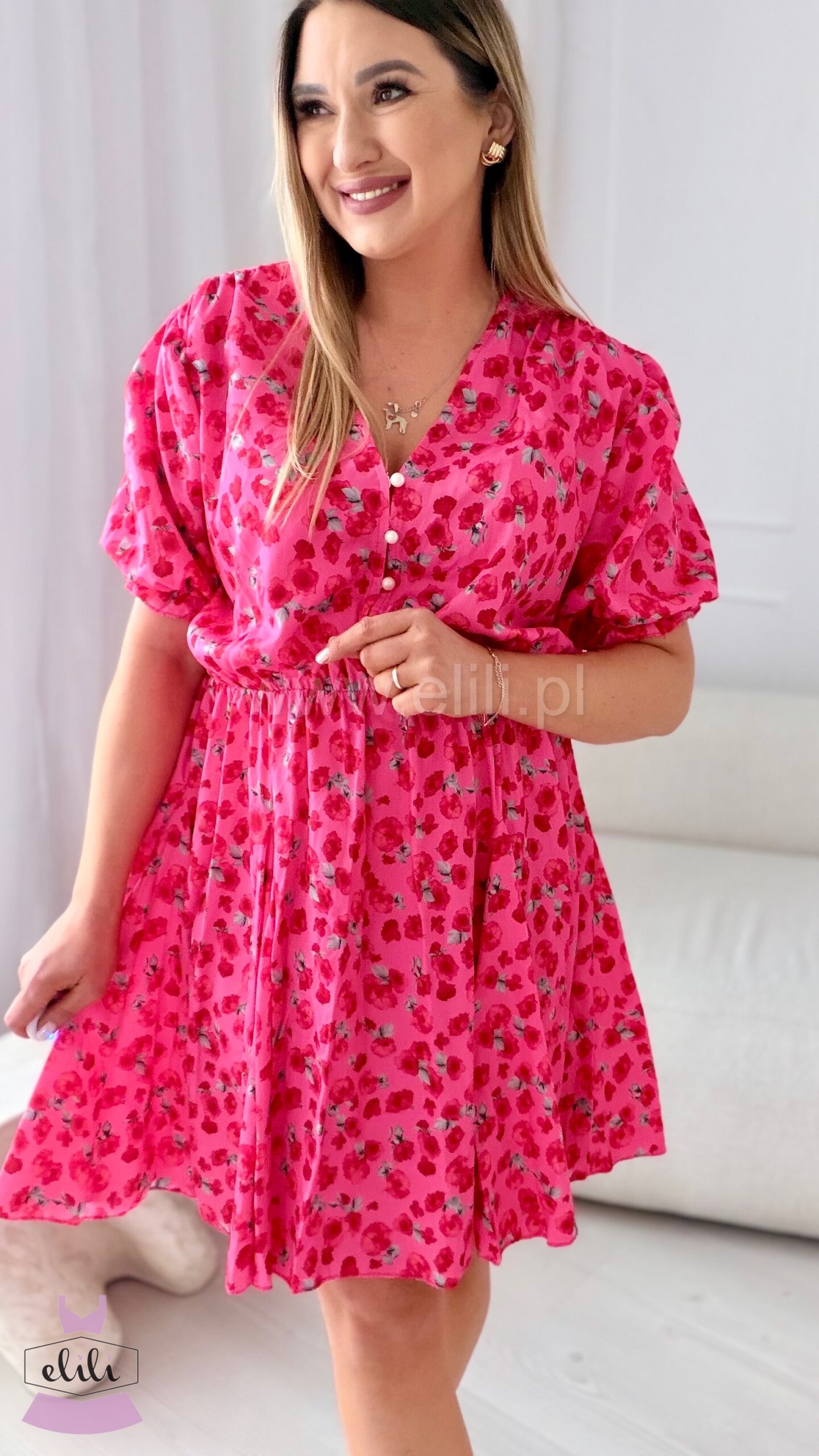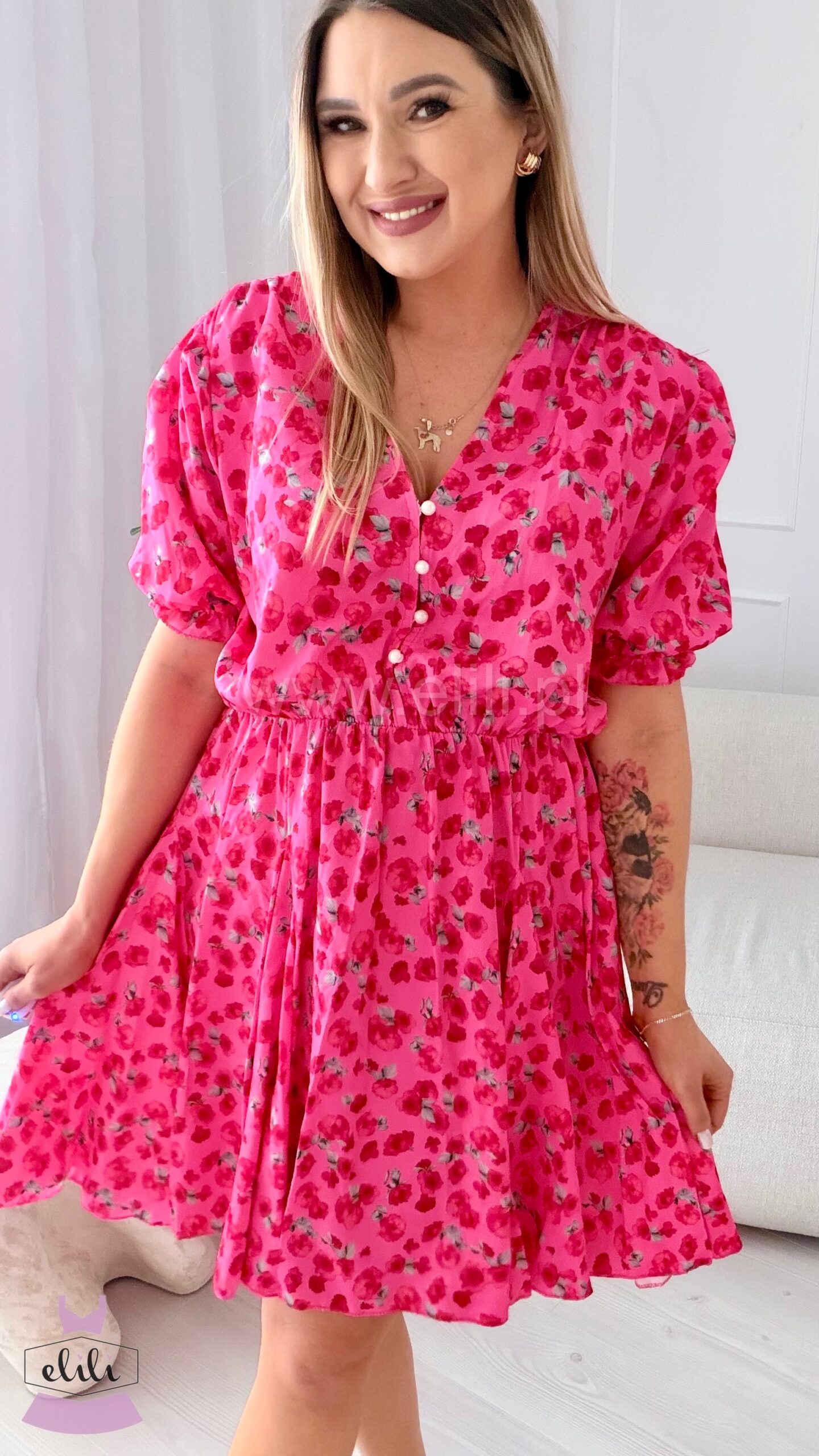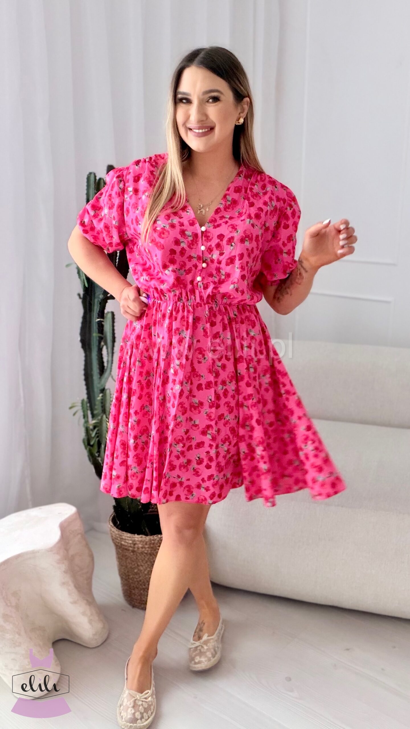 Prześliczna sukienka uszyta w rozmiarze plus size. Dekolt w serek zapinany na guziczki, umożliwiać będzie karmienie piersią. W talii znajduje się gumka. Dół sukienki uszyty jest na kole.