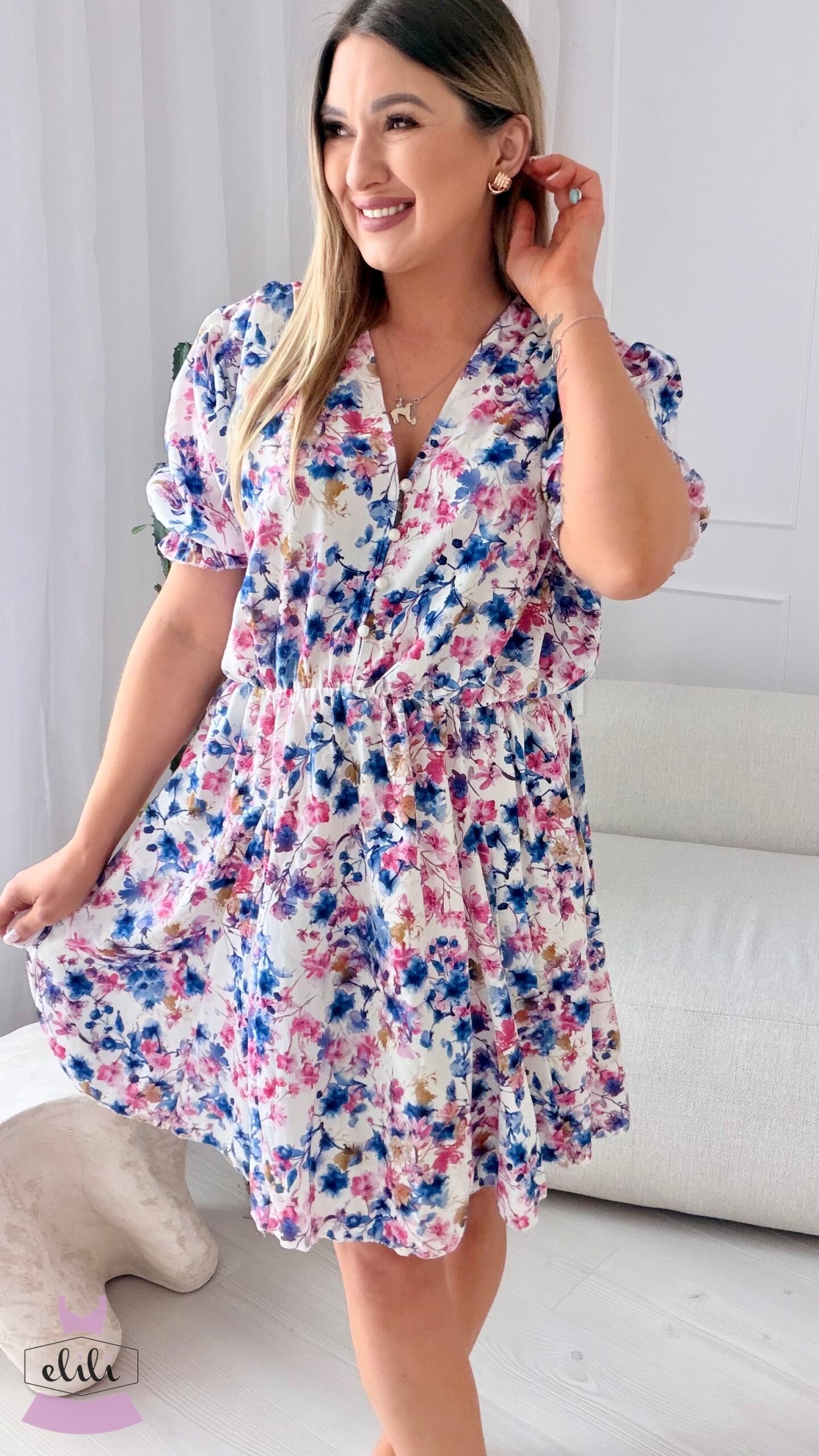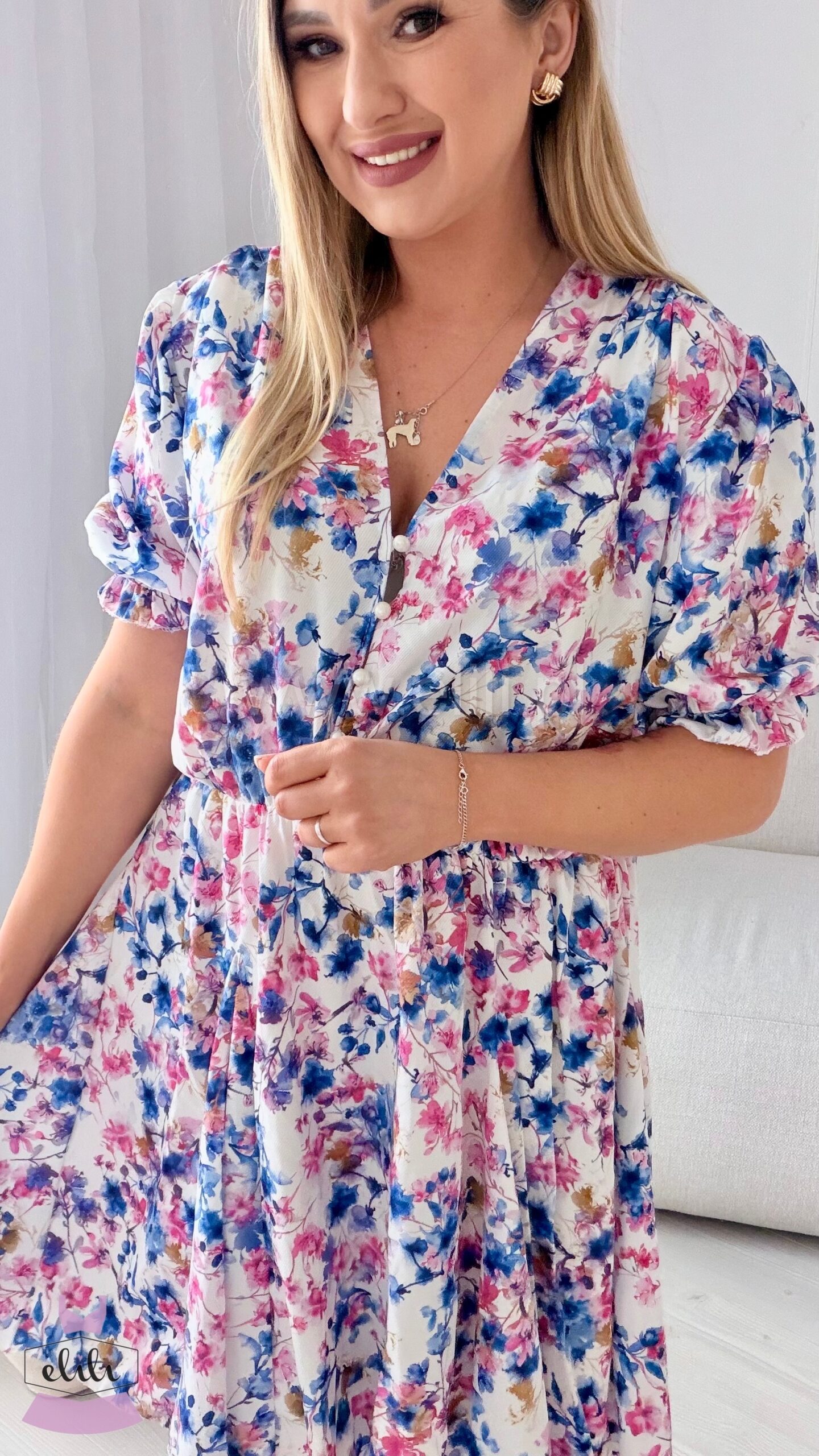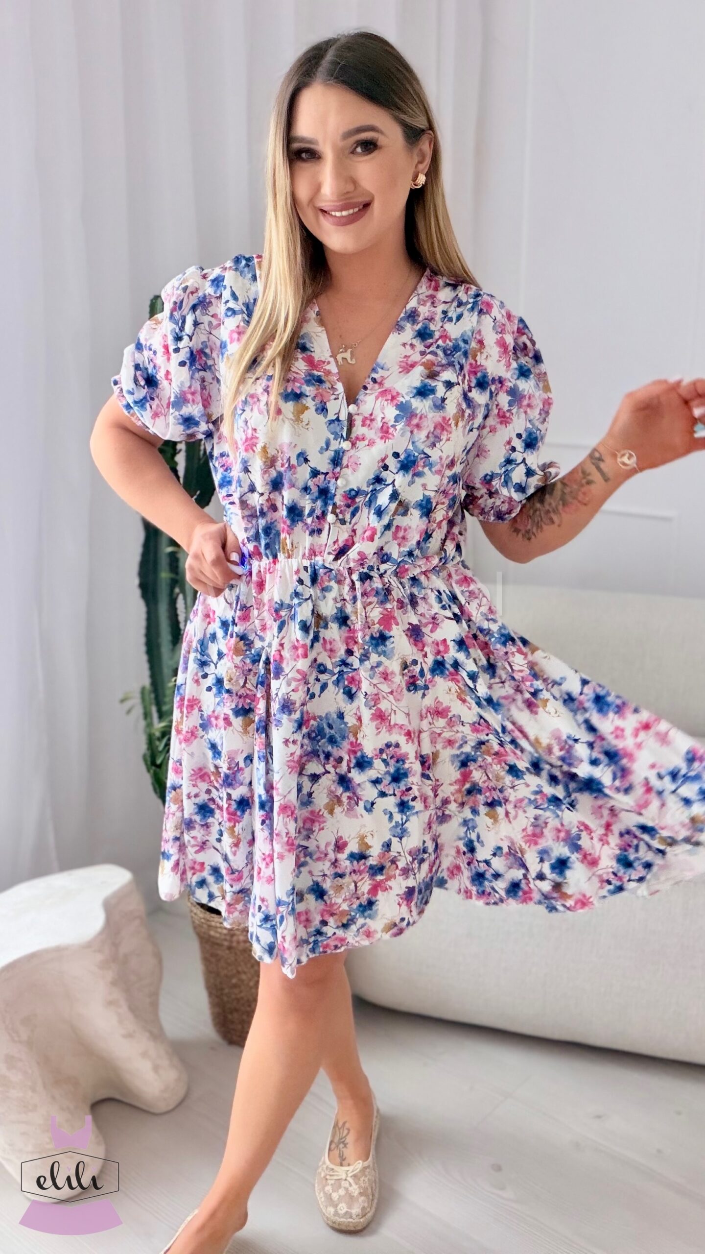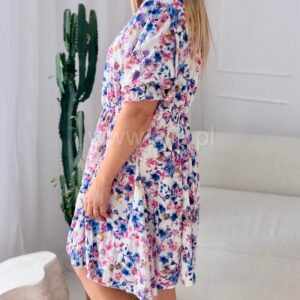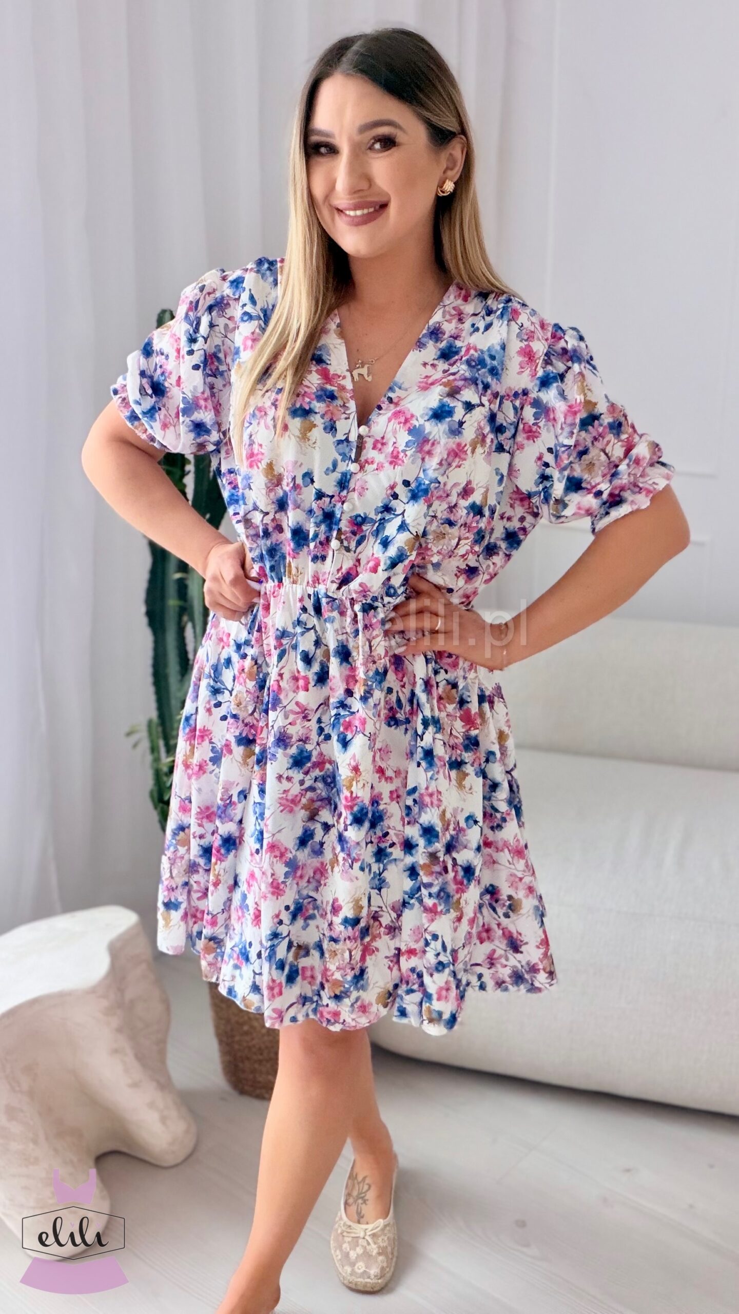Góra zapinana na guziki dodaje uroku i pozwala regulować dekolt, a elastyczna gumka w talii idealnie dopasowuje się do figury, podkreślając jej atuty. Krótki rękaw sprawia, że sukienka świetnie sprawdzi się w cieplejsze dni, a dół szyty z koła nadaje jej lekkości i pięknego ruchu podczas chodzenia.