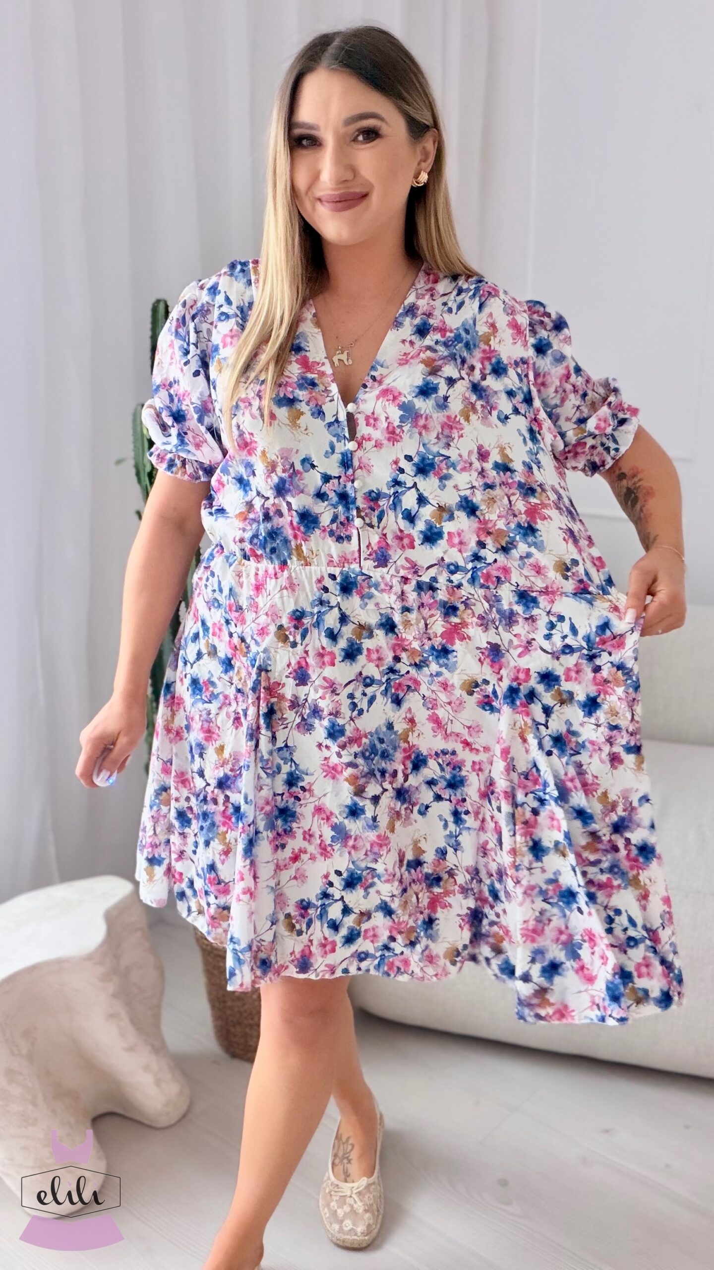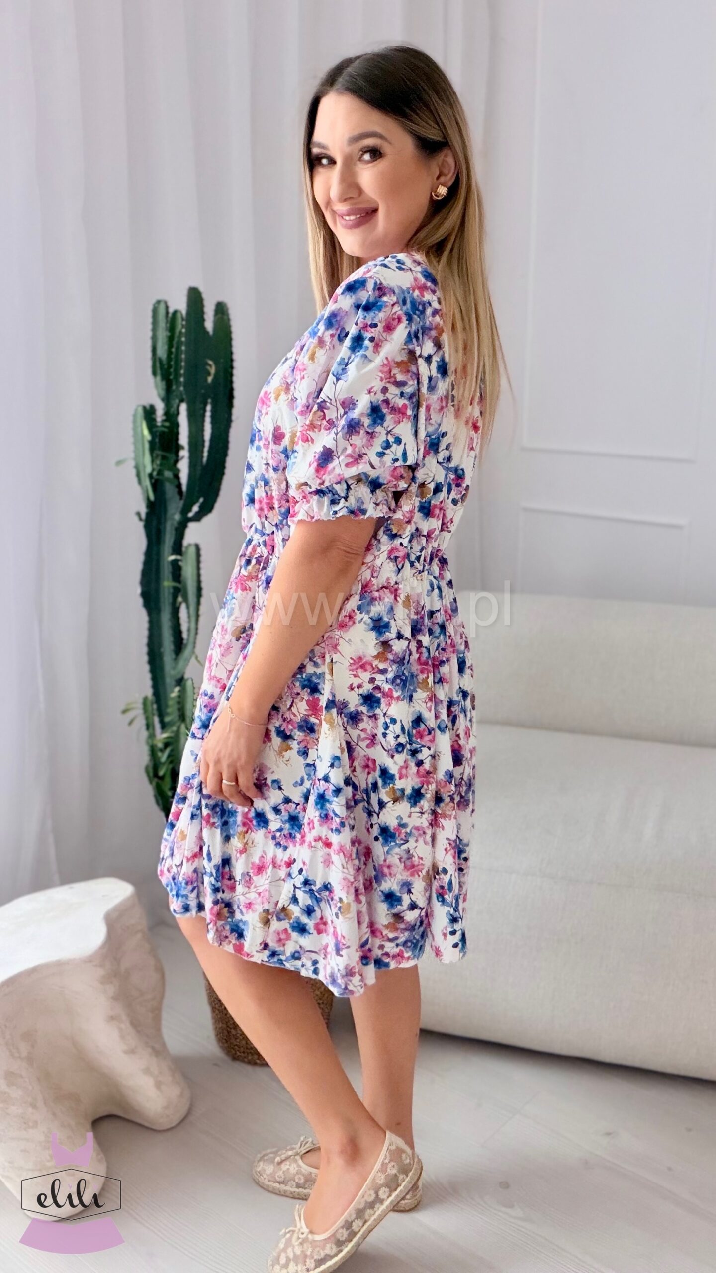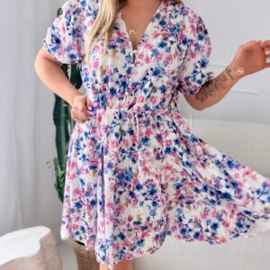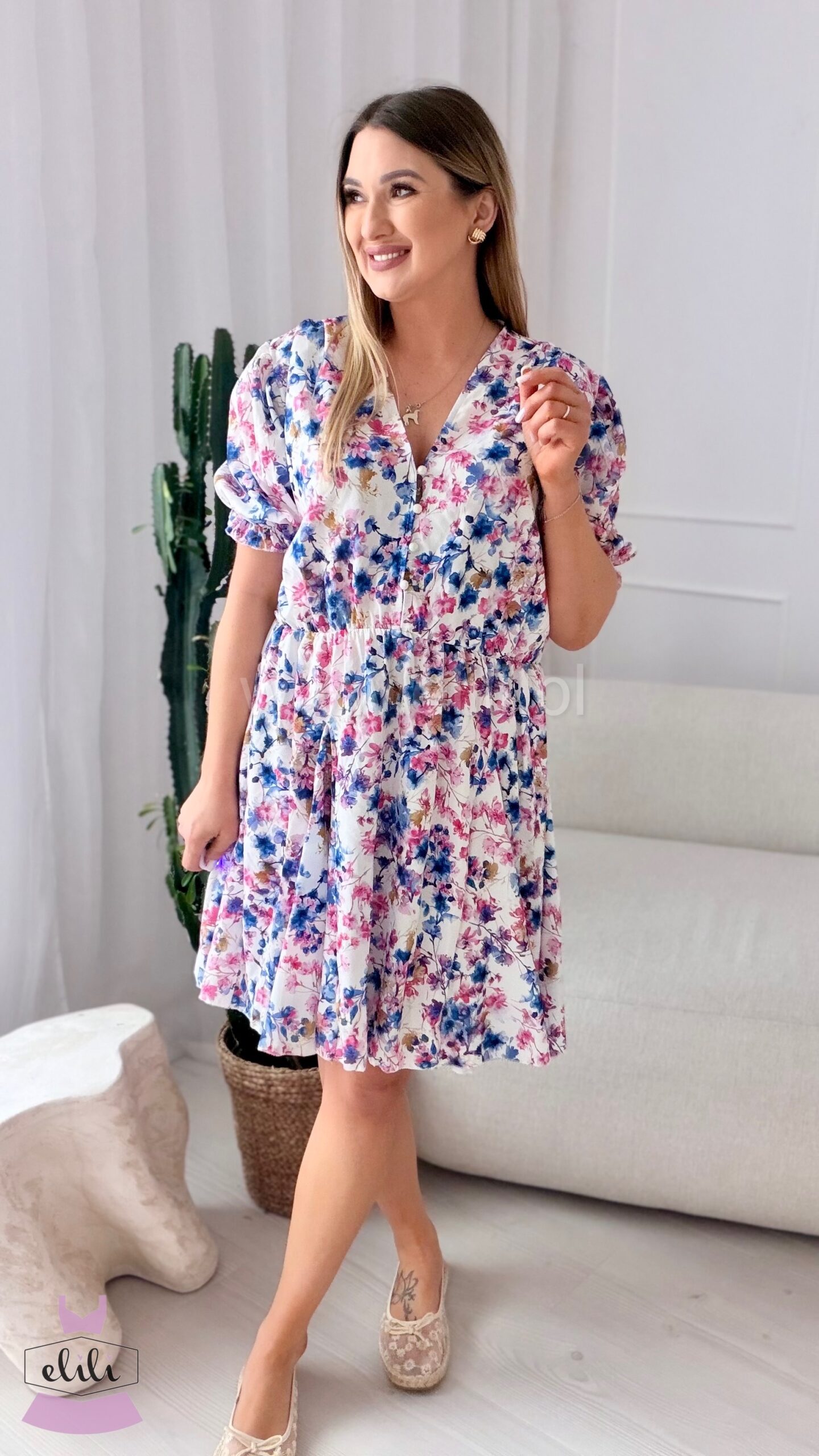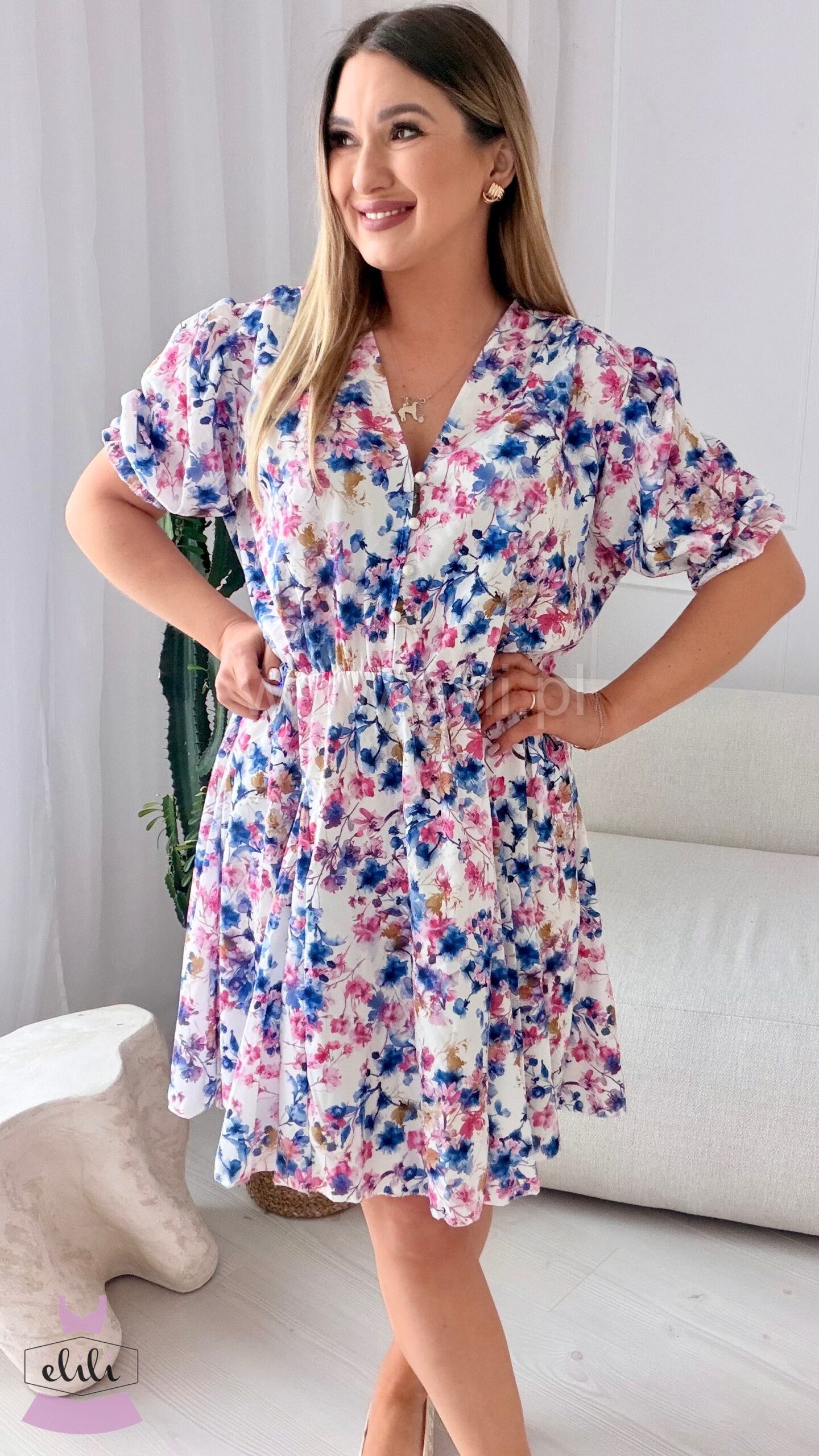 Góra zapinana na guziki dodaje uroku i pozwala regulować dekolt, a elastyczna gumka w talii idealnie dopasowuje się do figury, podkreślając jej atuty. Krótki rękaw sprawia, że sukienka świetnie sprawdzi się w cieplejsze dni, a dół szyty z koła nadaje jej lekkości i pięknego ruchu podczas chodzenia.