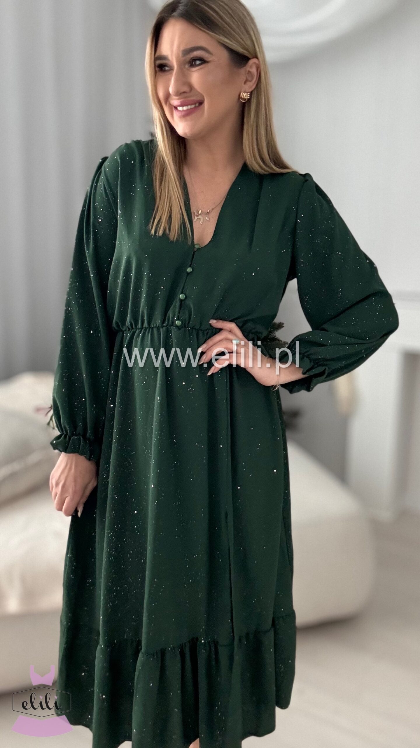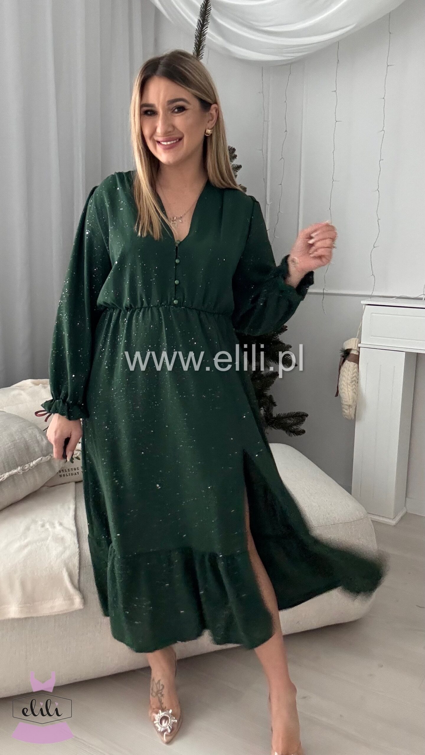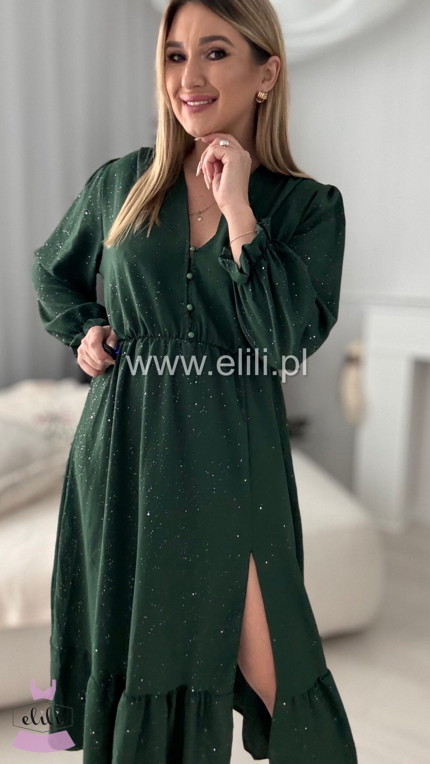 Nasza bestsellerowa sukienka w wersji plus size to prawdziwy hit, który zdobył serca tysięcy kobiet. Dzięki swojej uniwersalnej i ponadczasowej stylistyce, stała się jednym z najchętniej wybieranych modeli – sprzedaliśmy już dziesiątki tysięcy sztuk! Sukienka łączy funkcjonalność z elegancją: rozpinane guziki umożliwiają indywidualne dopasowanie, a gumka w talii pięknie podkreśla sylwetkę, zapewniając jednocześnie komfort przez cały dzień. Rozcięcie na nodze dodaje lekkości i kobiecego uroku, sprawiając, że całość nabiera zmysłowego charakteru. To idealny wybór dla kobiet, które szukają sukienki łączącej styl, wygodę i modny wygląd – perfekcyjna zarówno na co dzień, jak i na wyjątkowe okazje. Teraz dostępna w wyjątkowej limitowanej edycji – w błyszczącym wydaniu