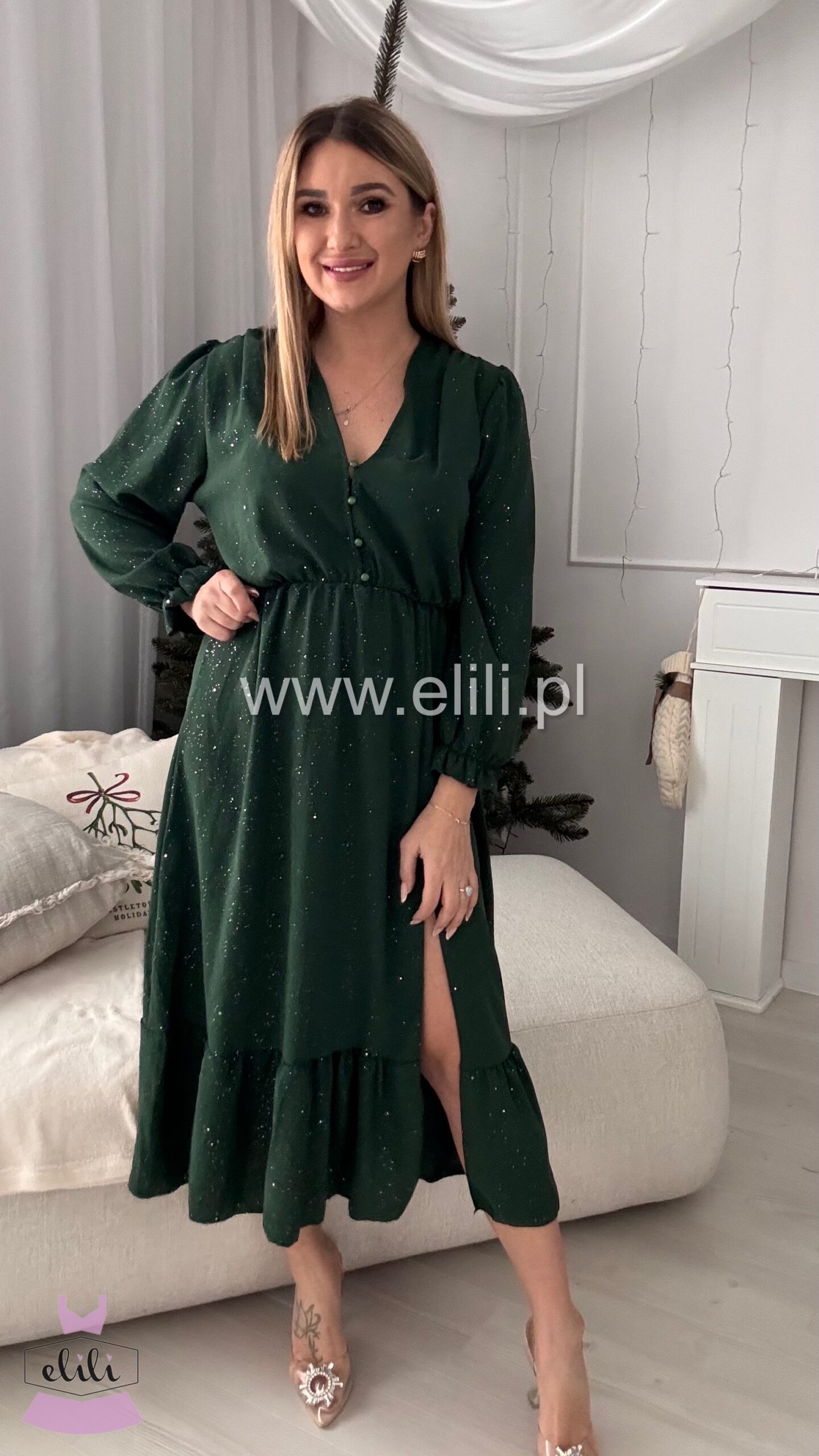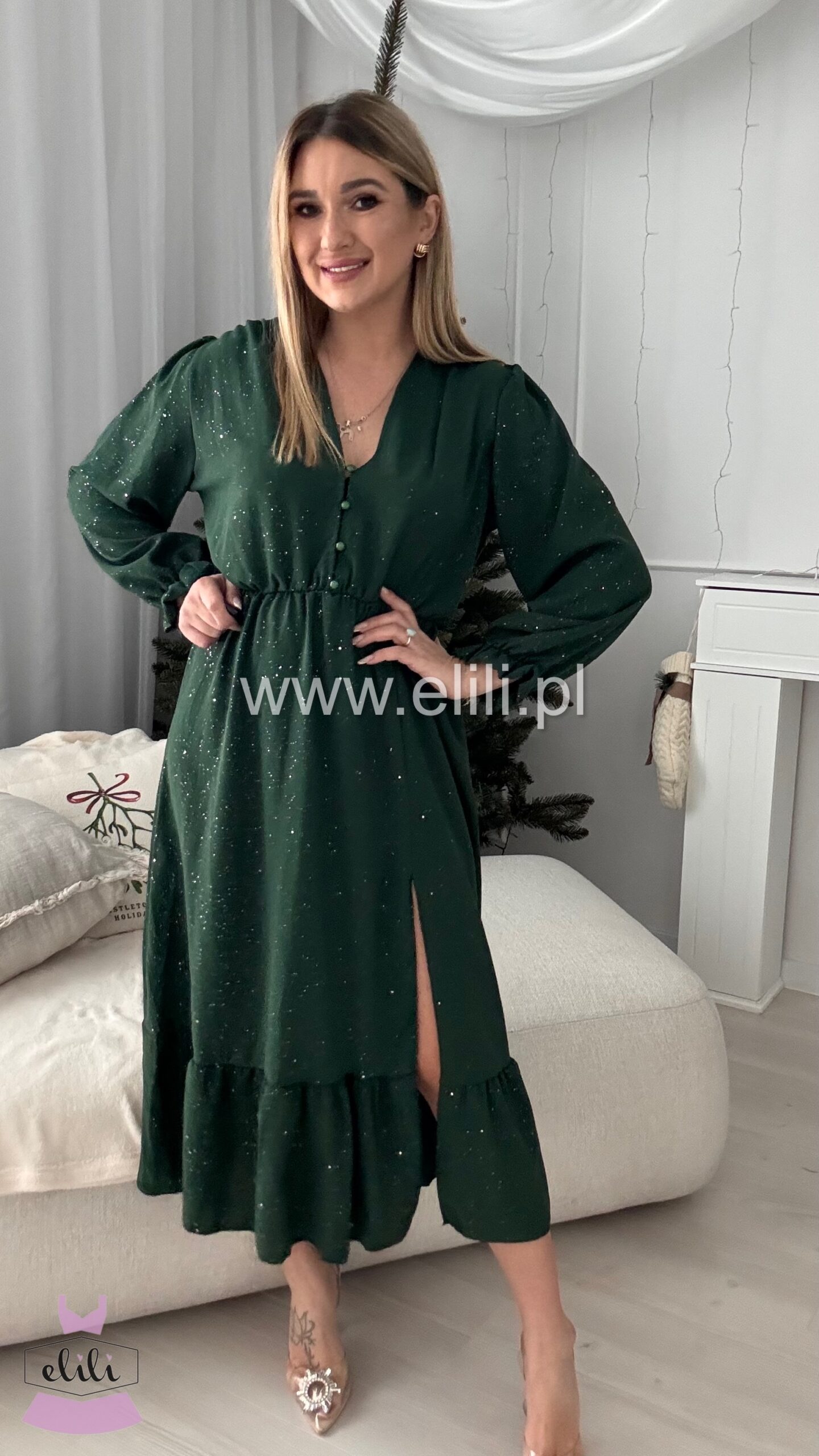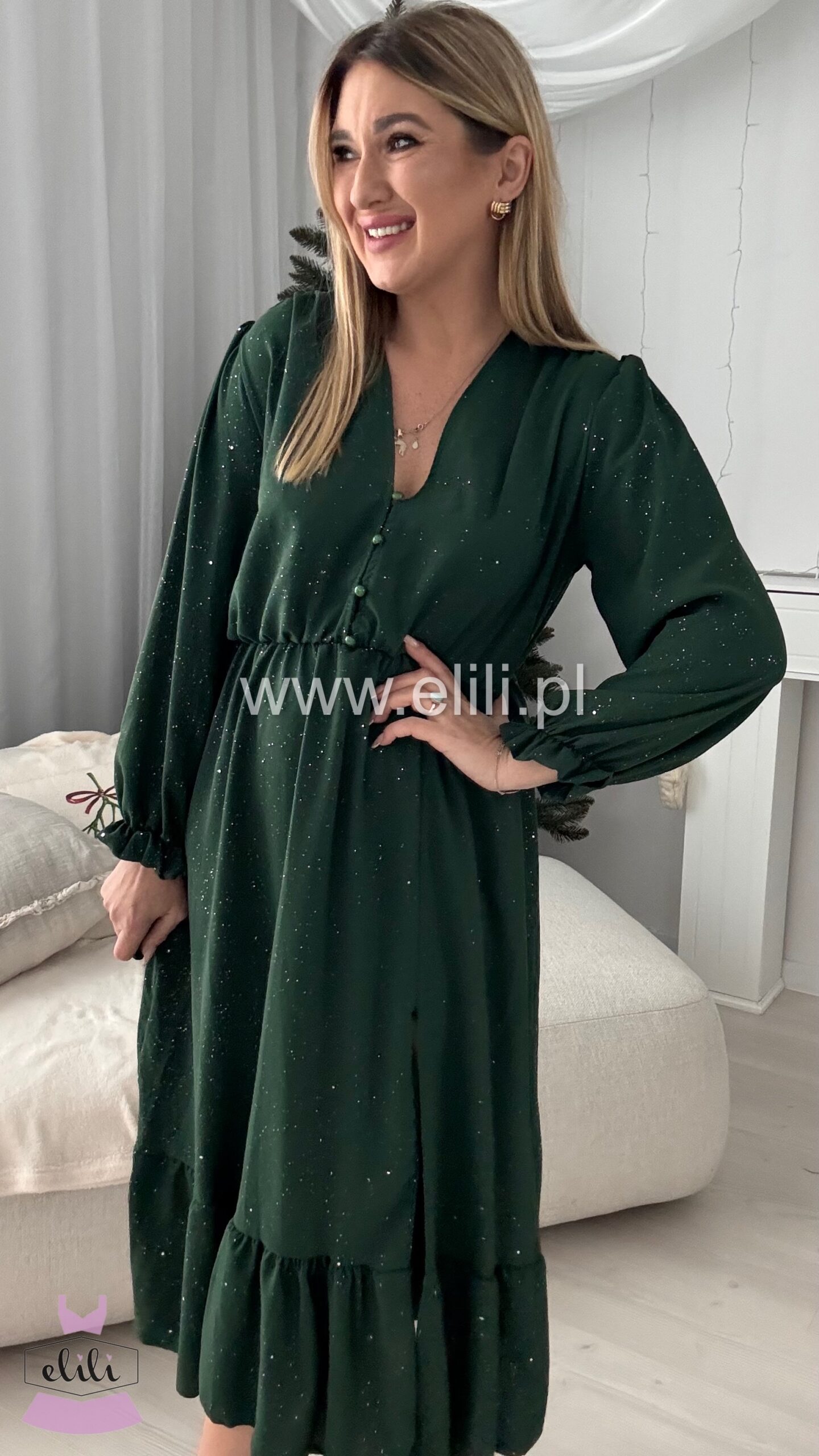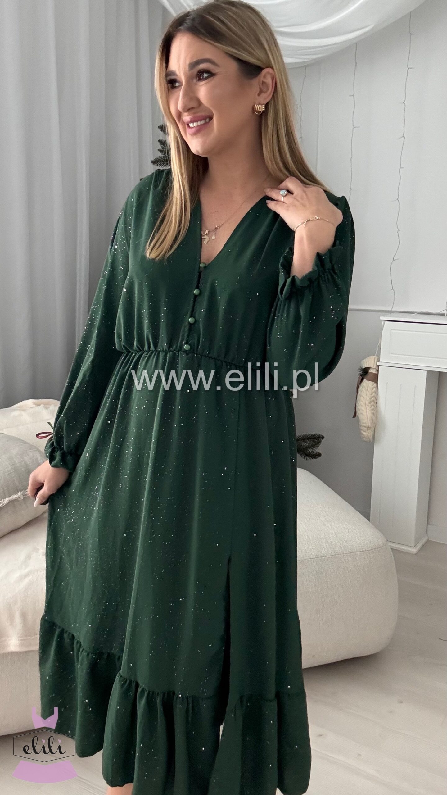 Nasza bestsellerowa sukienka w wersji plus size to prawdziwy hit, który zdobył serca tysięcy kobiet. Dzięki swojej uniwersalnej i ponadczasowej stylistyce, stała się jednym z najchętniej wybieranych modeli – sprzedaliśmy już dziesiątki tysięcy sztuk! Sukienka łączy funkcjonalność z elegancją: rozpinane guziki umożliwiają indywidualne dopasowanie, a gumka w talii pięknie podkreśla sylwetkę, zapewniając jednocześnie komfort przez cały dzień. Rozcięcie na nodze dodaje lekkości i kobiecego uroku, sprawiając, że całość nabiera zmysłowego charakteru. To idealny wybór dla kobiet, które szukają sukienki łączącej styl, wygodę i modny wygląd – perfekcyjna zarówno na co dzień, jak i na wyjątkowe okazje. Teraz dostępna w wyjątkowej limitowanej edycji – w błyszczącym wydaniu