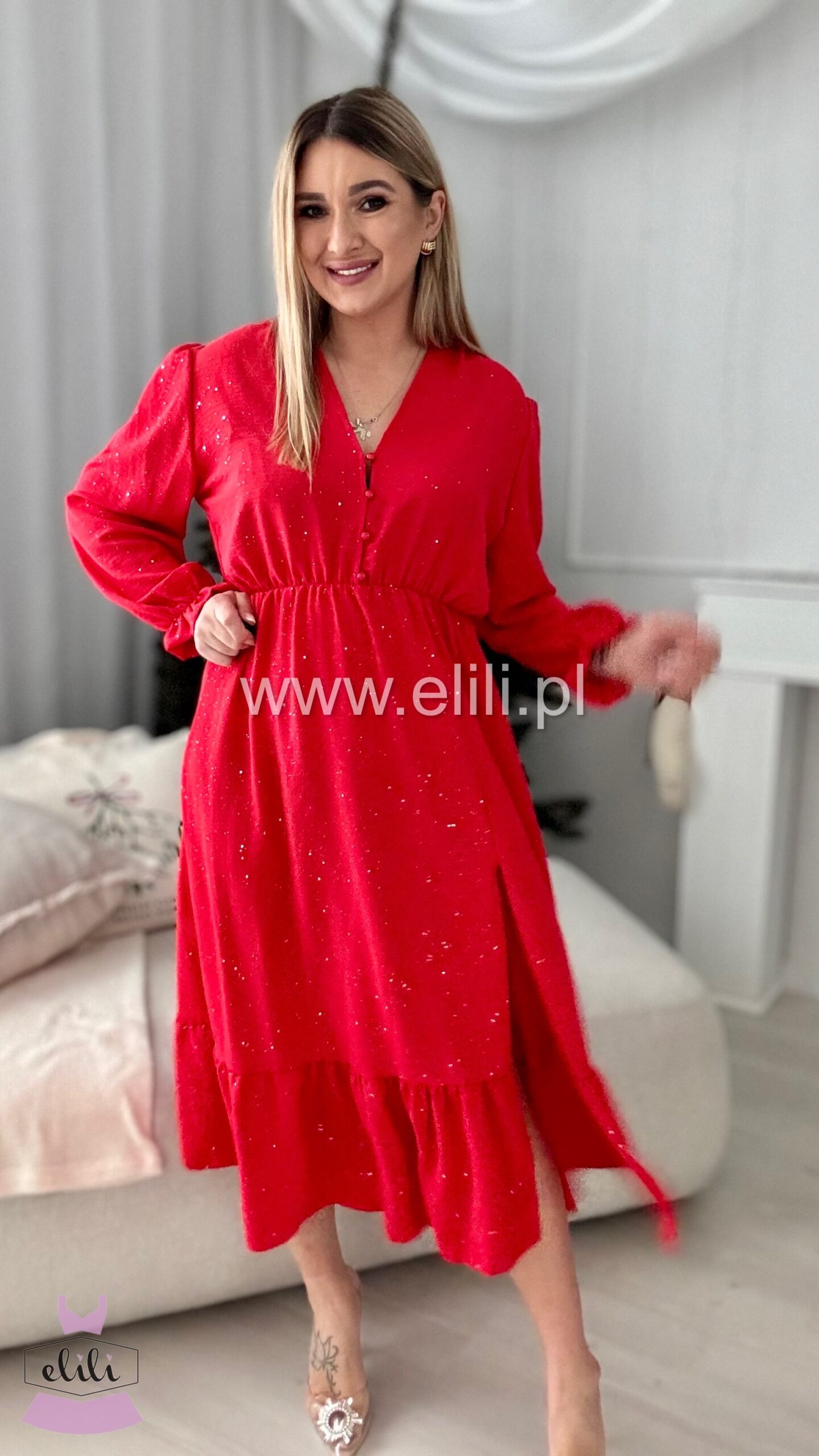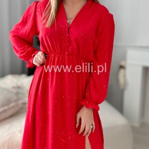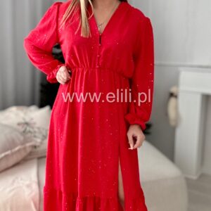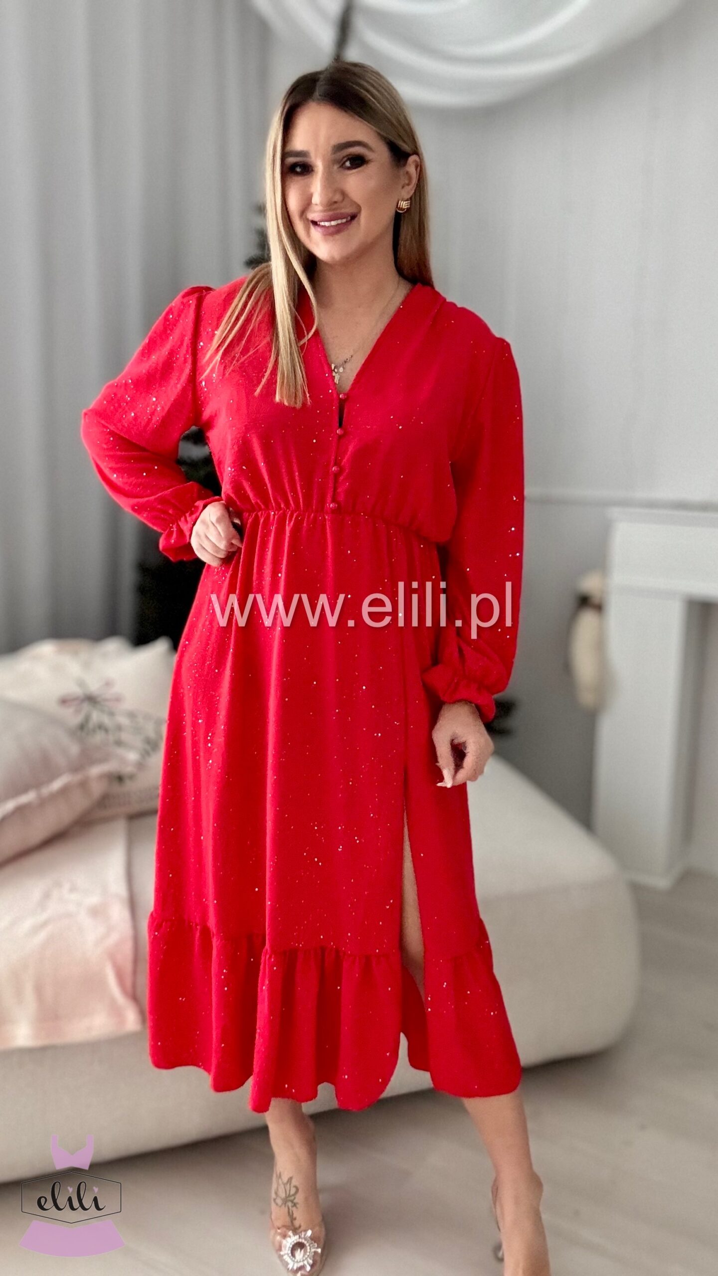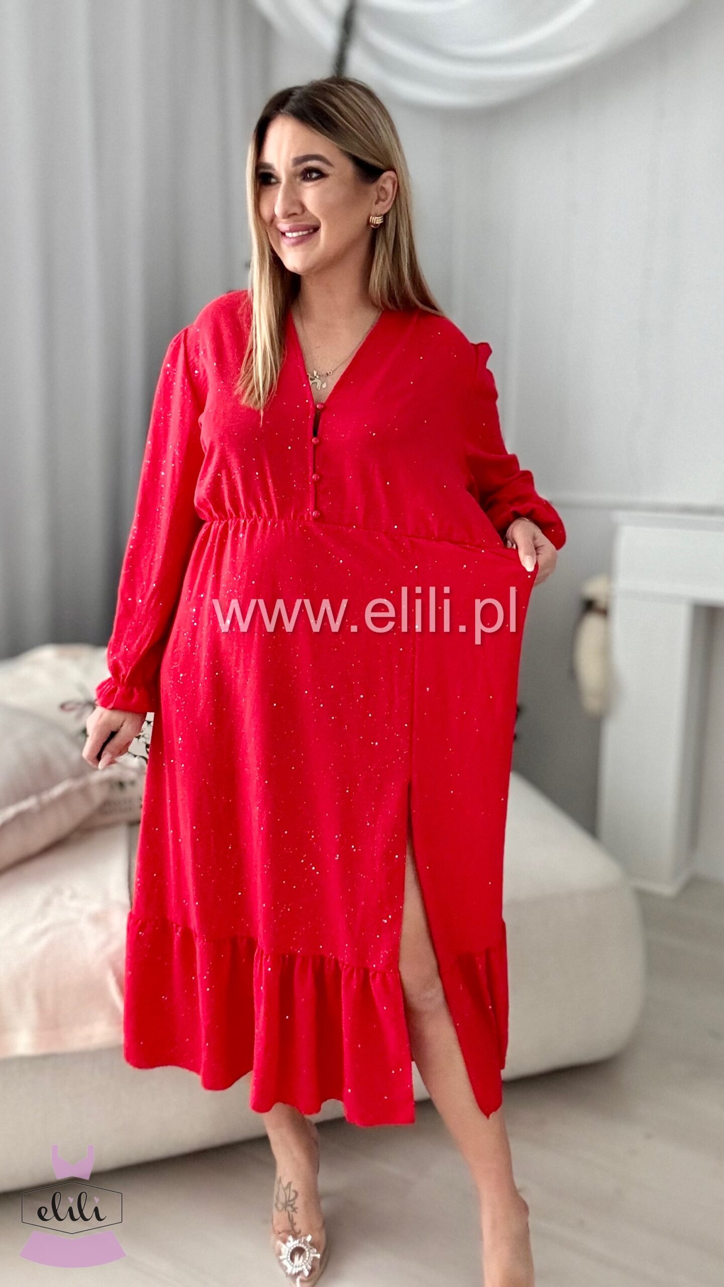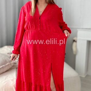 Nasza bestsellerowa sukienka w wersji plus size to prawdziwy hit, który zdobył serca tysięcy kobiet. Dzięki swojej uniwersalnej i ponadczasowej stylistyce, stała się jednym z najchętniej wybieranych modeli – sprzedaliśmy już dziesiątki tysięcy sztuk! Sukienka łączy funkcjonalność z elegancją: rozpinane guziki umożliwiają indywidualne dopasowanie, a gumka w talii pięknie podkreśla sylwetkę, zapewniając jednocześnie komfort przez cały dzień. Rozcięcie na nodze dodaje lekkości i kobiecego uroku, sprawiając, że całość nabiera zmysłowego charakteru. To idealny wybór dla kobiet, które szukają sukienki łączącej styl, wygodę i modny wygląd – perfekcyjna zarówno na co dzień, jak i na wyjątkowe okazje. Teraz dostępna w wyjątkowej limitowanej edycji –  w błyszczącym wydaniu