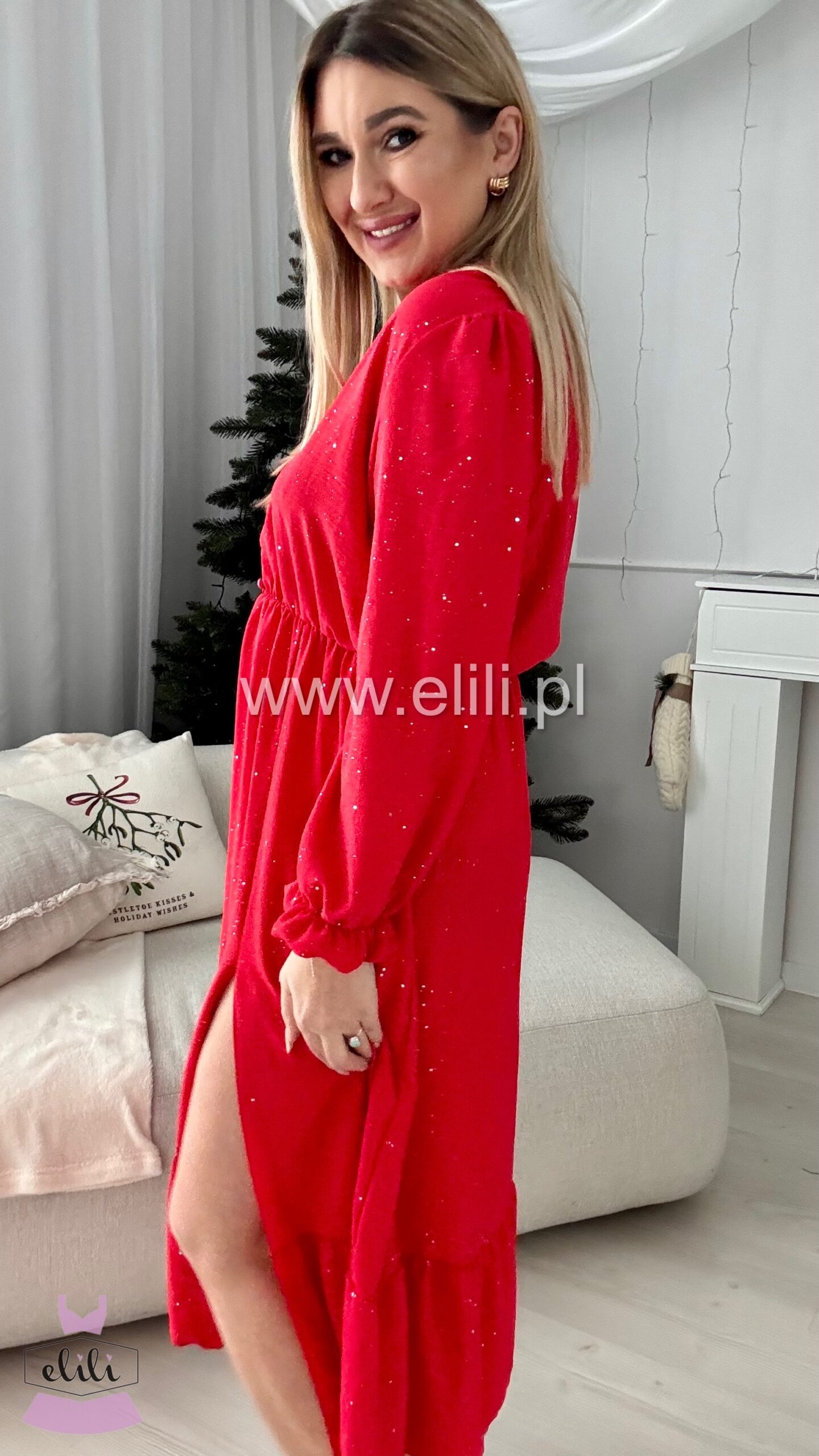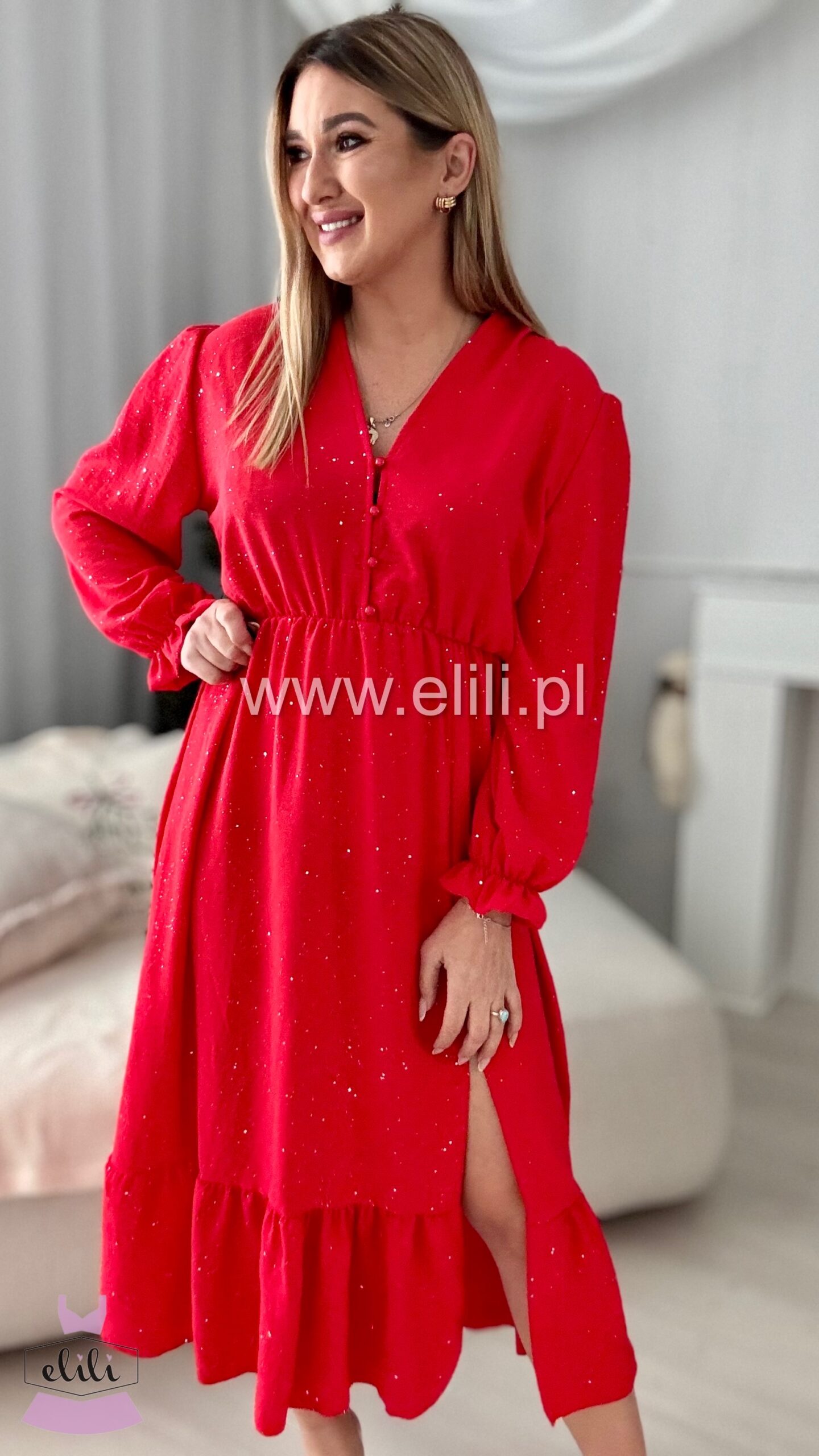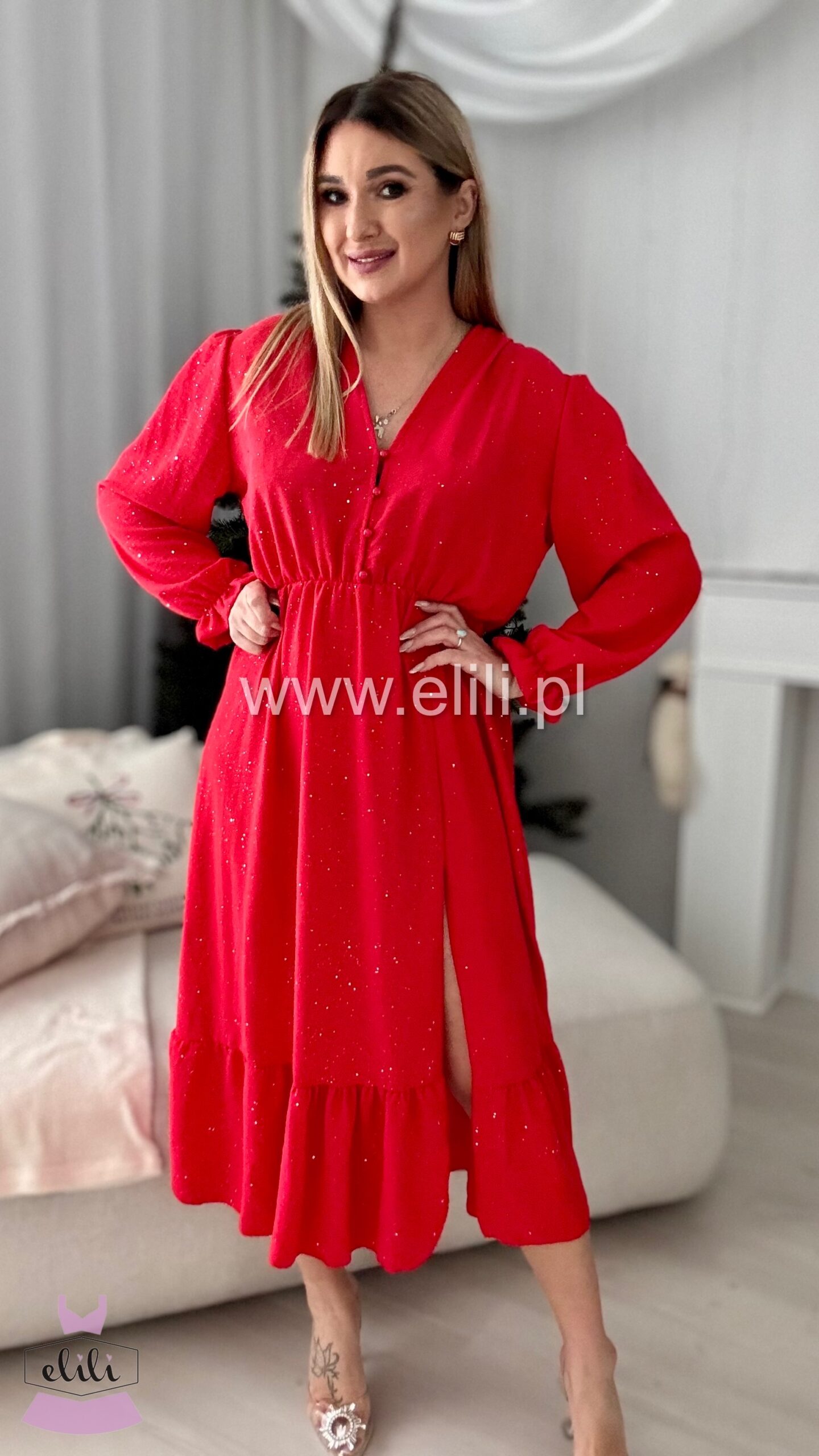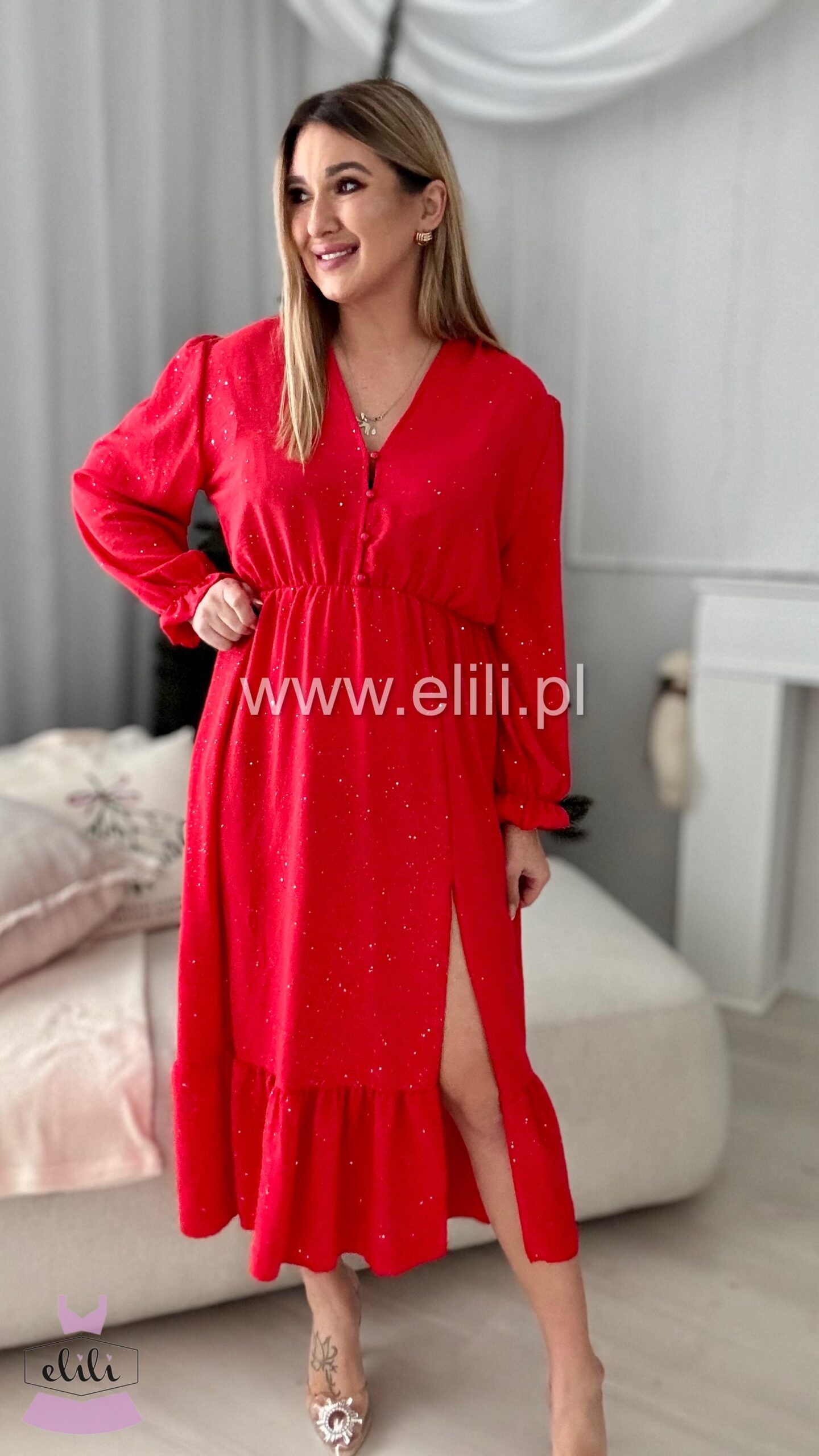 Nasza bestsellerowa sukienka w wersji plus size to prawdziwy hit, który zdobył serca tysięcy kobiet. Dzięki swojej uniwersalnej i ponadczasowej stylistyce, stała się jednym z najchętniej wybieranych modeli – sprzedaliśmy już dziesiątki tysięcy sztuk! Sukienka łączy funkcjonalność z elegancją: rozpinane guziki umożliwiają indywidualne dopasowanie, a gumka w talii pięknie podkreśla sylwetkę, zapewniając jednocześnie komfort przez cały dzień. Rozcięcie na nodze dodaje lekkości i kobiecego uroku, sprawiając, że całość nabiera zmysłowego charakteru. To idealny wybór dla kobiet, które szukają sukienki łączącej styl, wygodę i modny wygląd – perfekcyjna zarówno na co dzień, jak i na wyjątkowe okazje. Teraz dostępna w wyjątkowej limitowanej edycji –  w błyszczącym wydaniu