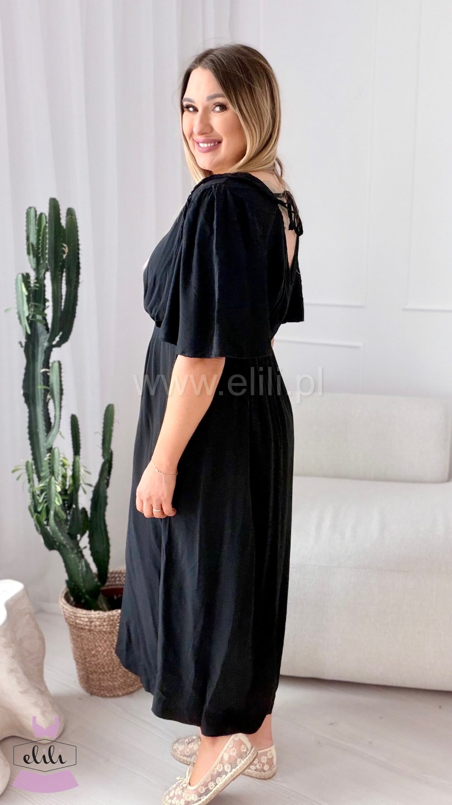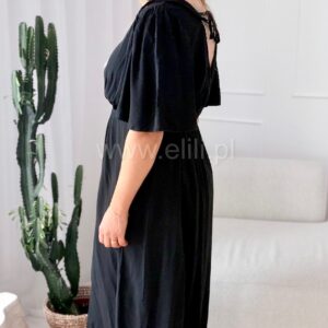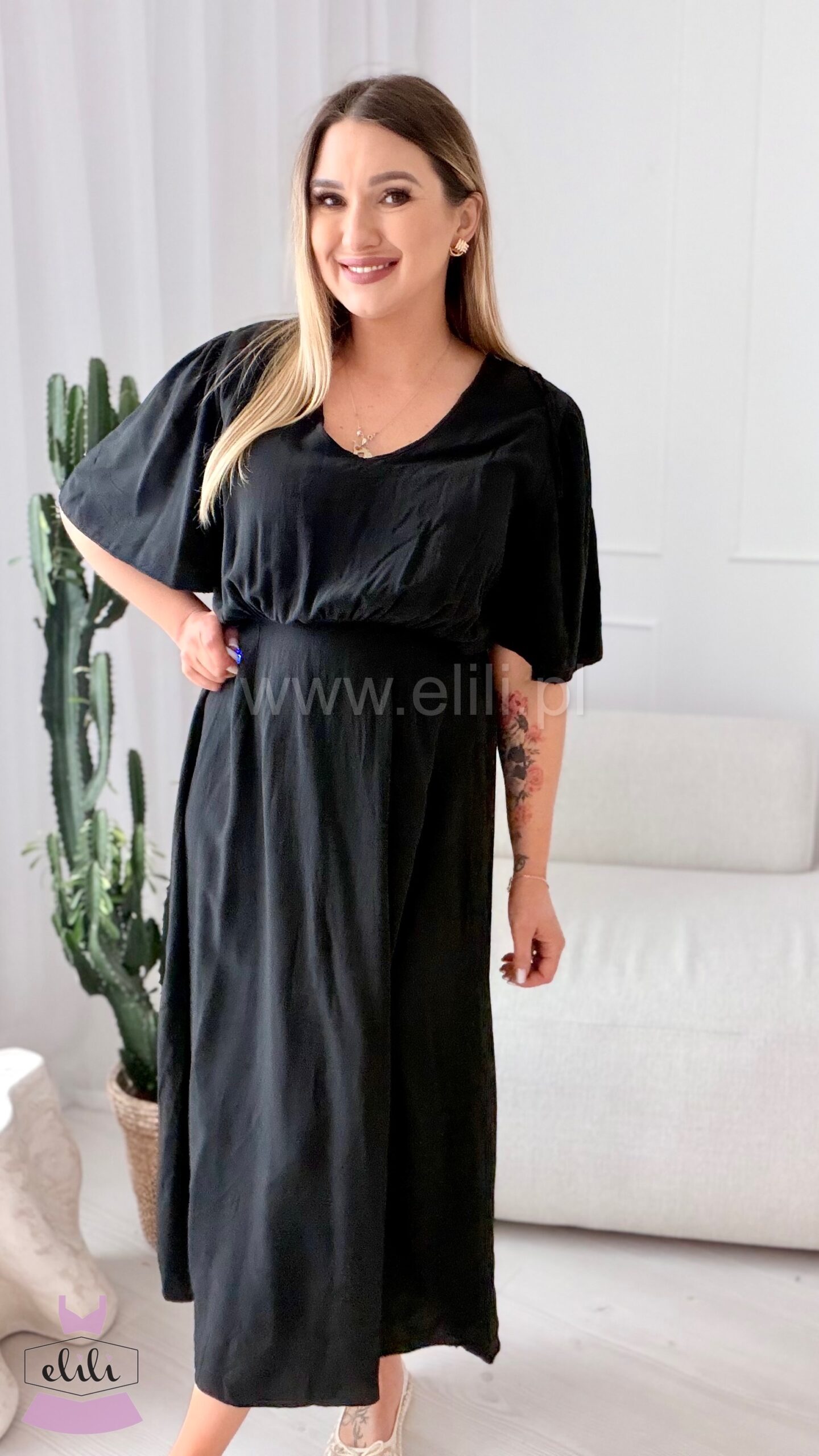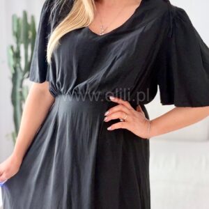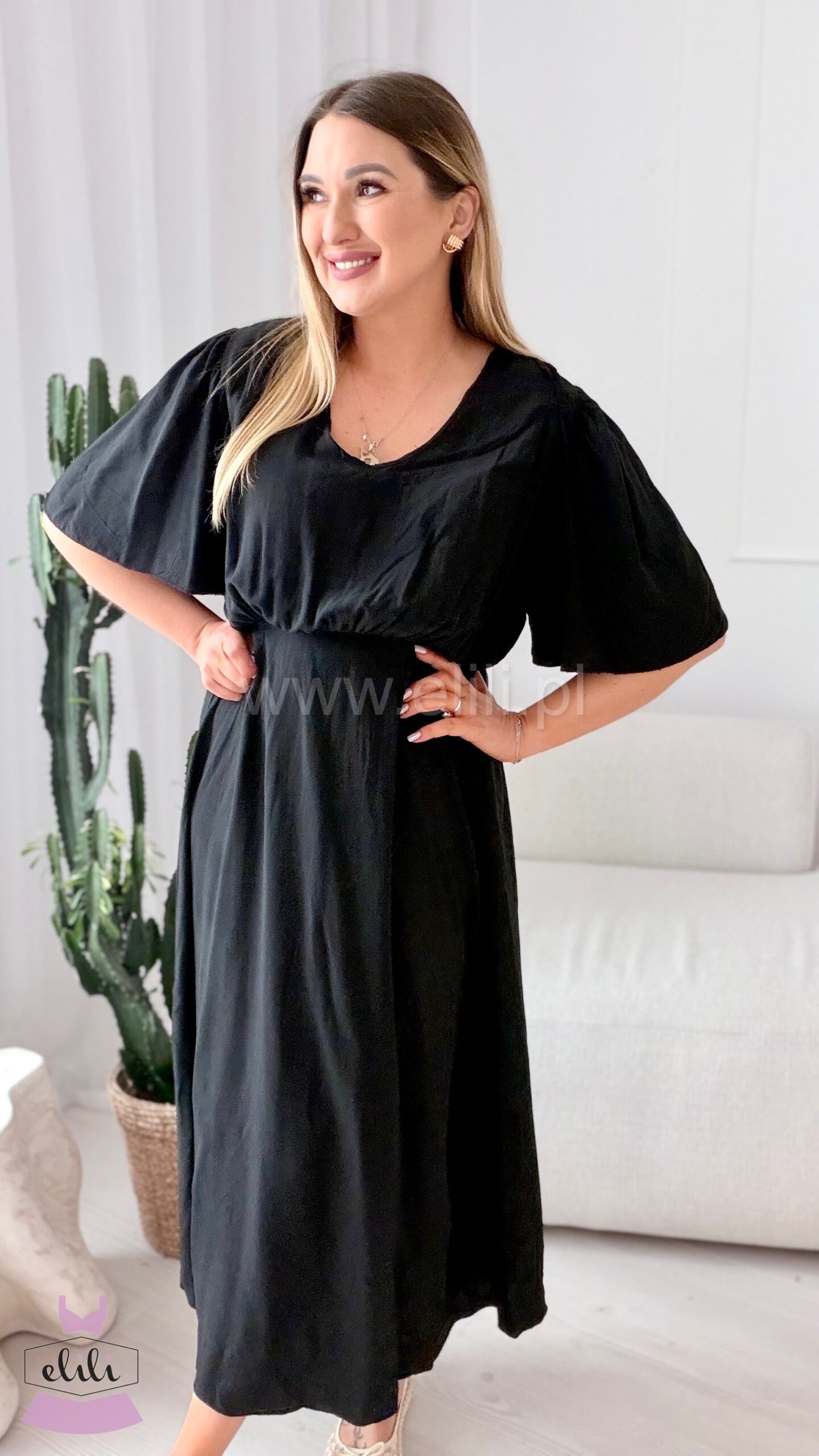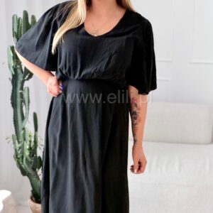 Fason z gumką w talii subtelnie podkreśla sylwetkę, jednocześnie gwarantując pełną swobodę ruchów. Kimonowa góra nadaje sukience luźnego, nowoczesnego charakteru i pięknie układa się na ramionach. Wiązanie z tyłu stanowi nie tylko praktyczny element dopasowania, ale także efektowny, kobiecy akcent.