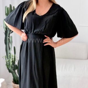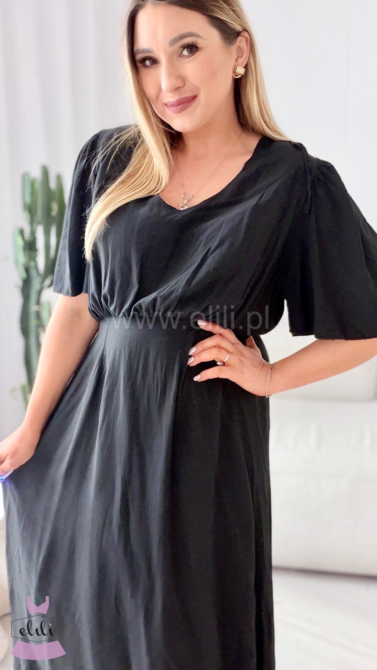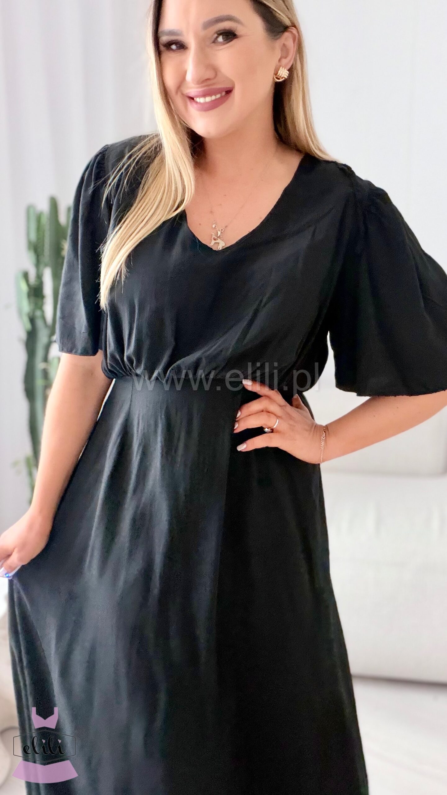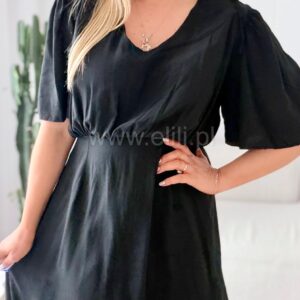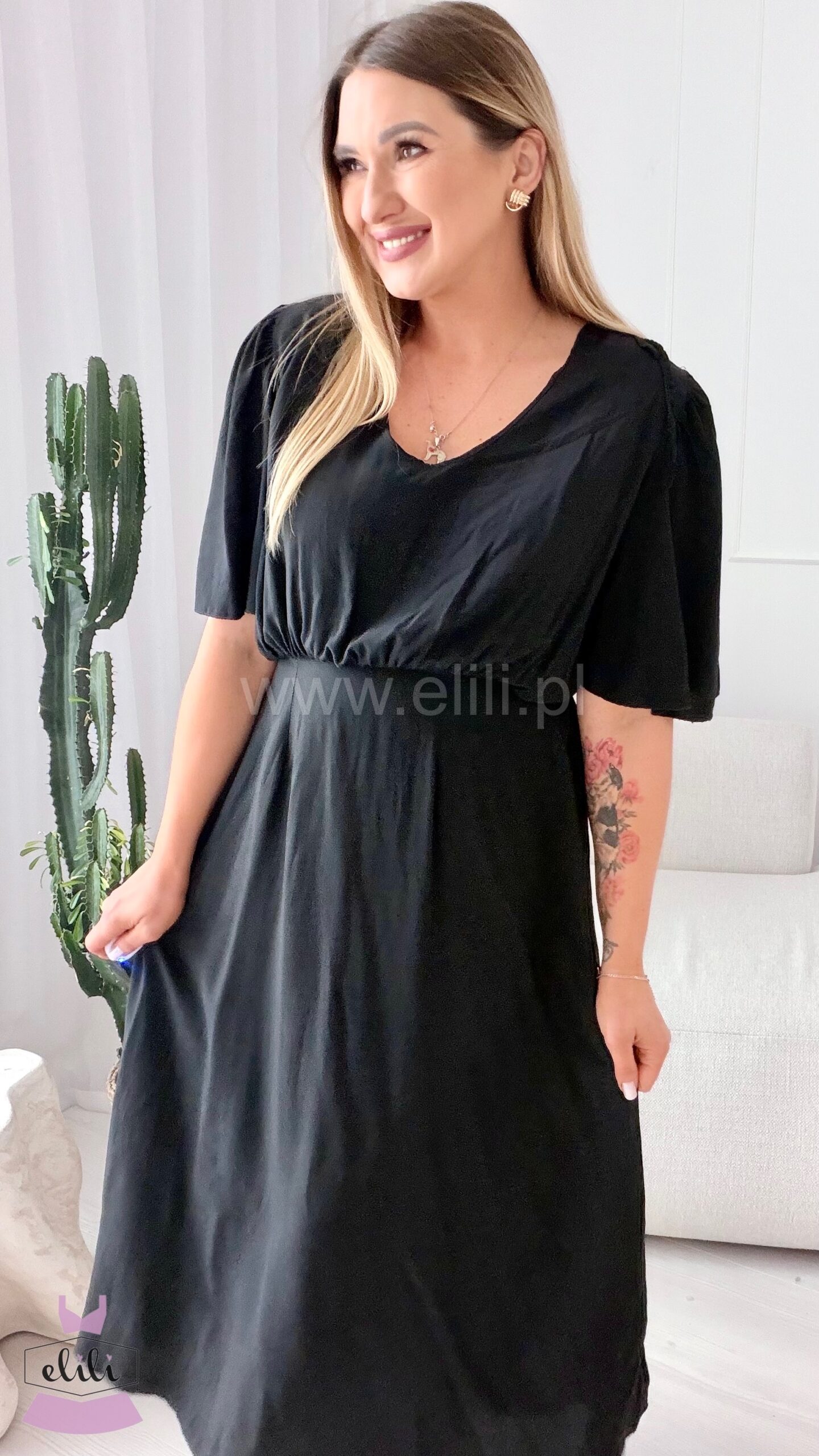 Fason z gumką w talii subtelnie podkreśla sylwetkę, jednocześnie gwarantując pełną swobodę ruchów. Kimonowa góra nadaje sukience luźnego, nowoczesnego charakteru i pięknie układa się na ramionach. Wiązanie z tyłu stanowi nie tylko praktyczny element dopasowania, ale także efektowny, kobiecy akcent.