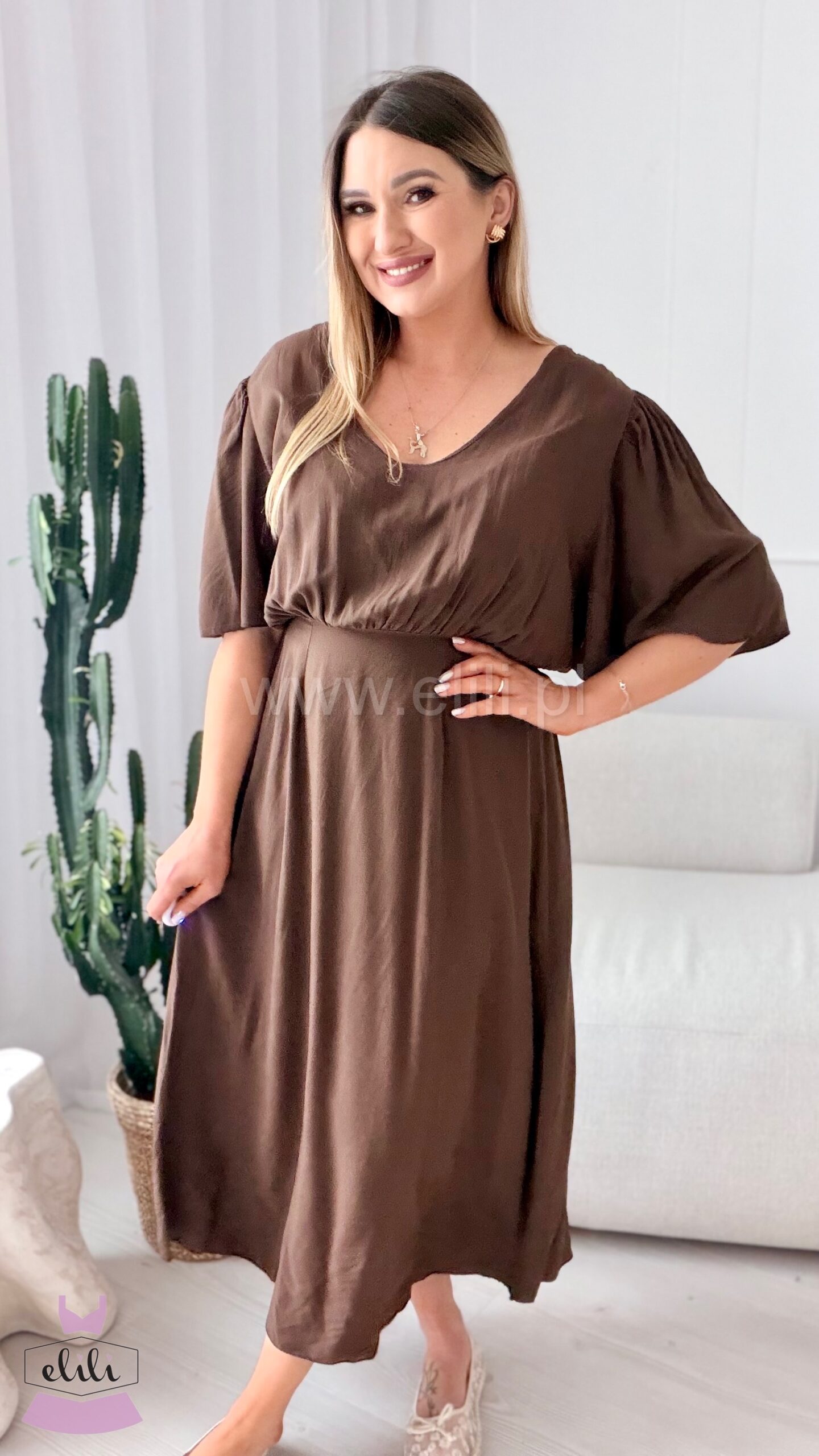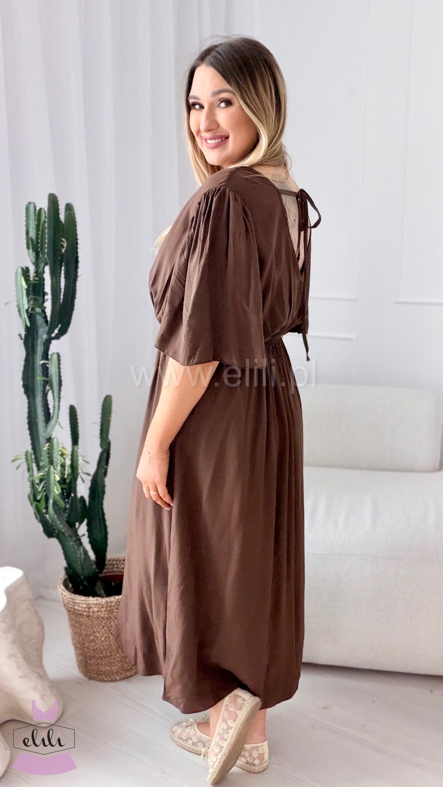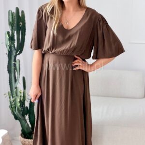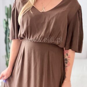 Fason z gumką w talii subtelnie podkreśla sylwetkę, jednocześnie gwarantując pełną swobodę ruchów. Kimonowa góra nadaje sukience luźnego, nowoczesnego charakteru i pięknie układa się na ramionach. Wiązanie z tyłu stanowi nie tylko praktyczny element dopasowania, ale także efektowny, kobiecy akcent.