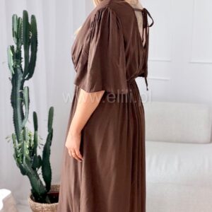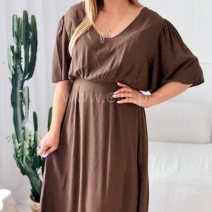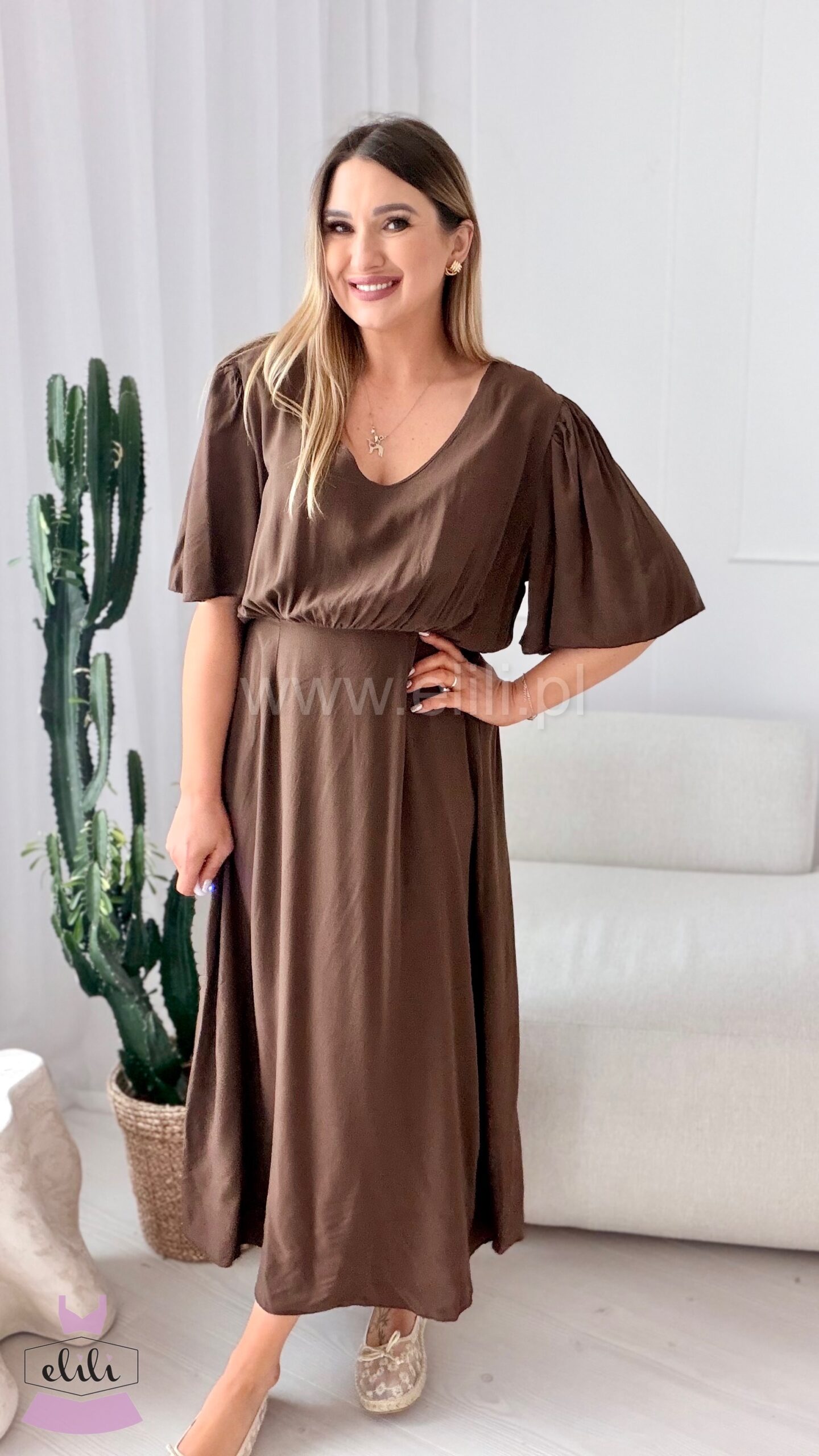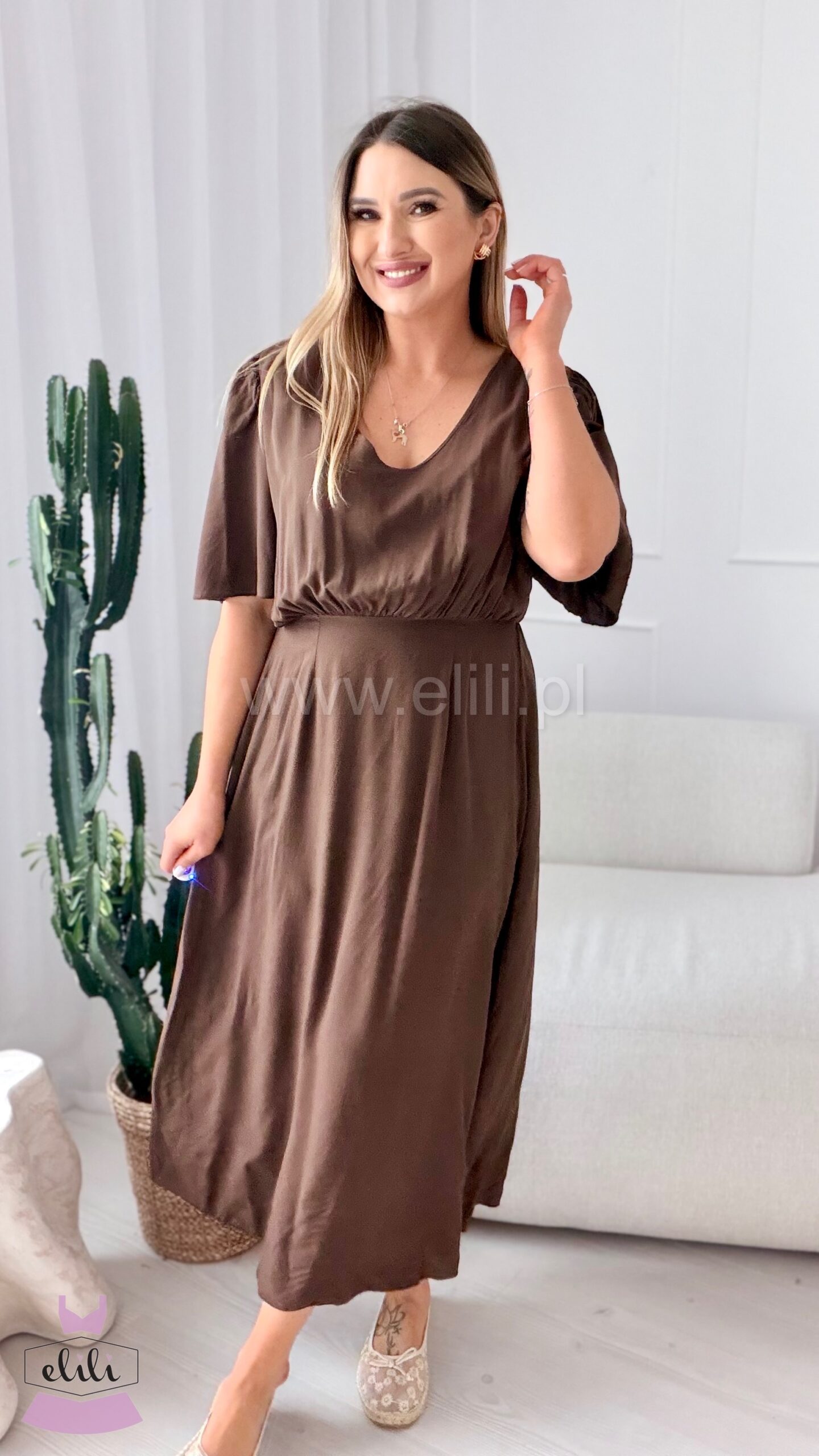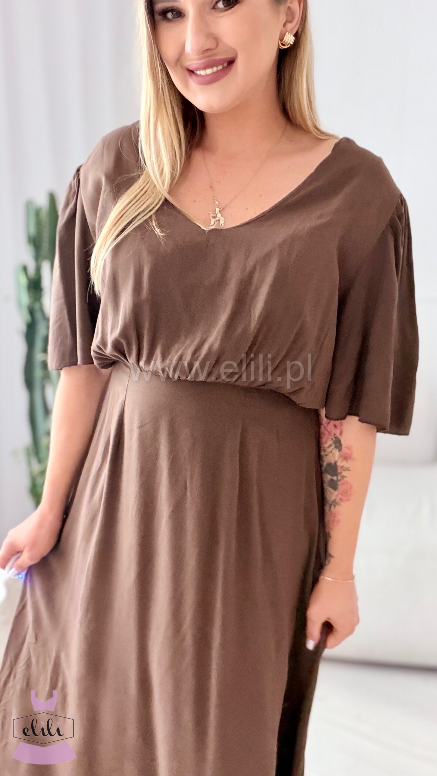 Fason z gumką w talii subtelnie podkreśla sylwetkę, jednocześnie gwarantując pełną swobodę ruchów. Kimonowa góra nadaje sukience luźnego, nowoczesnego charakteru i pięknie układa się na ramionach. Wiązanie z tyłu stanowi nie tylko praktyczny element dopasowania, ale także efektowny, kobiecy akcent.