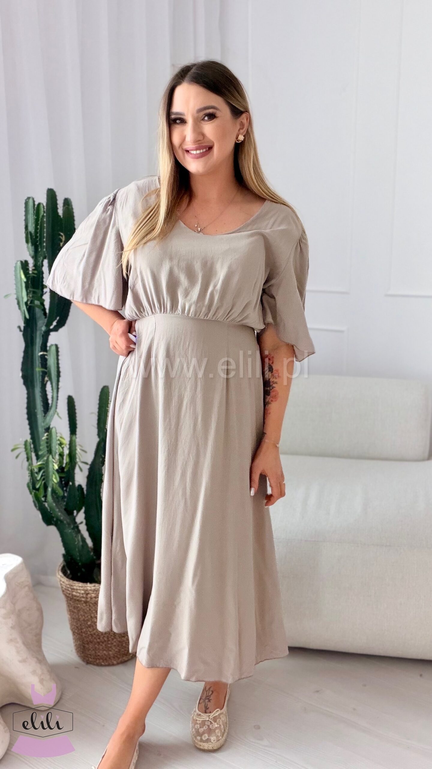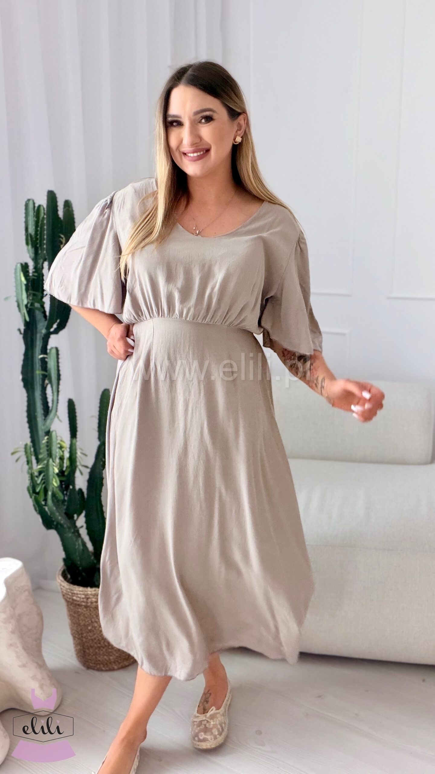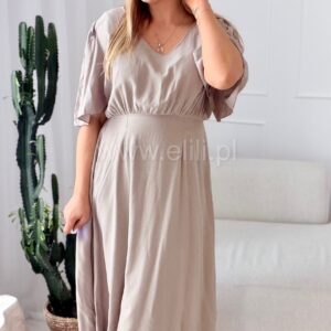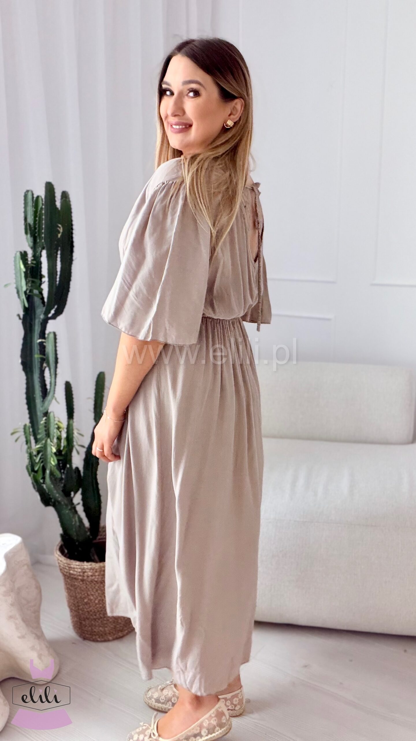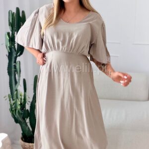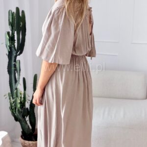 Fason z gumką w talii subtelnie podkreśla sylwetkę, jednocześnie gwarantując pełną swobodę ruchów. Kimonowa góra nadaje sukience luźnego, nowoczesnego charakteru i pięknie układa się na ramionach. Wiązanie z tyłu stanowi nie tylko praktyczny element dopasowania, ale także efektowny, kobiecy akcent.