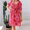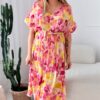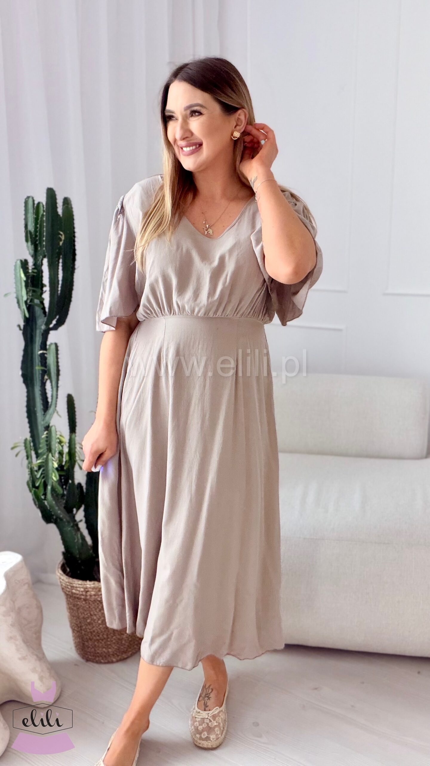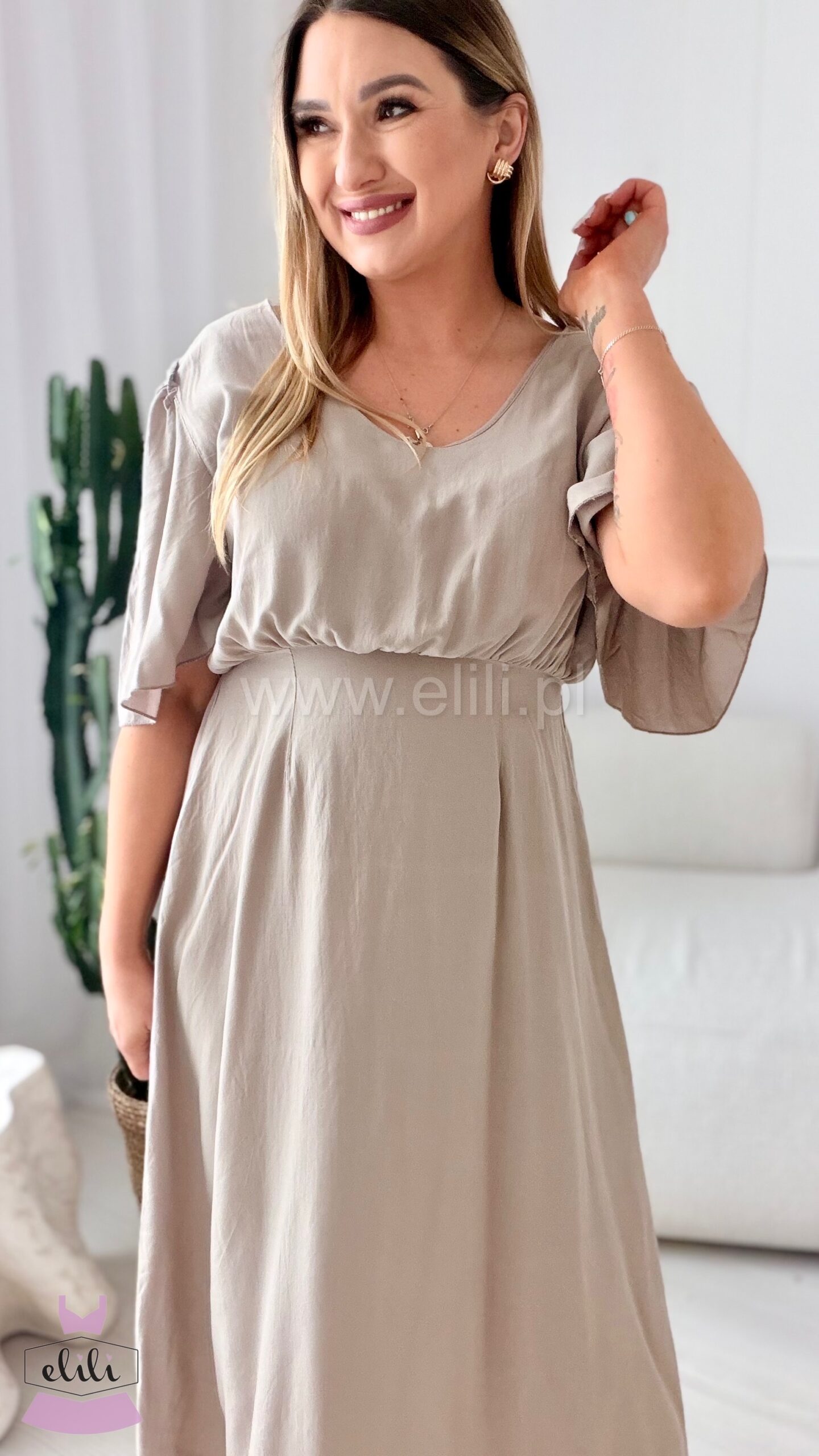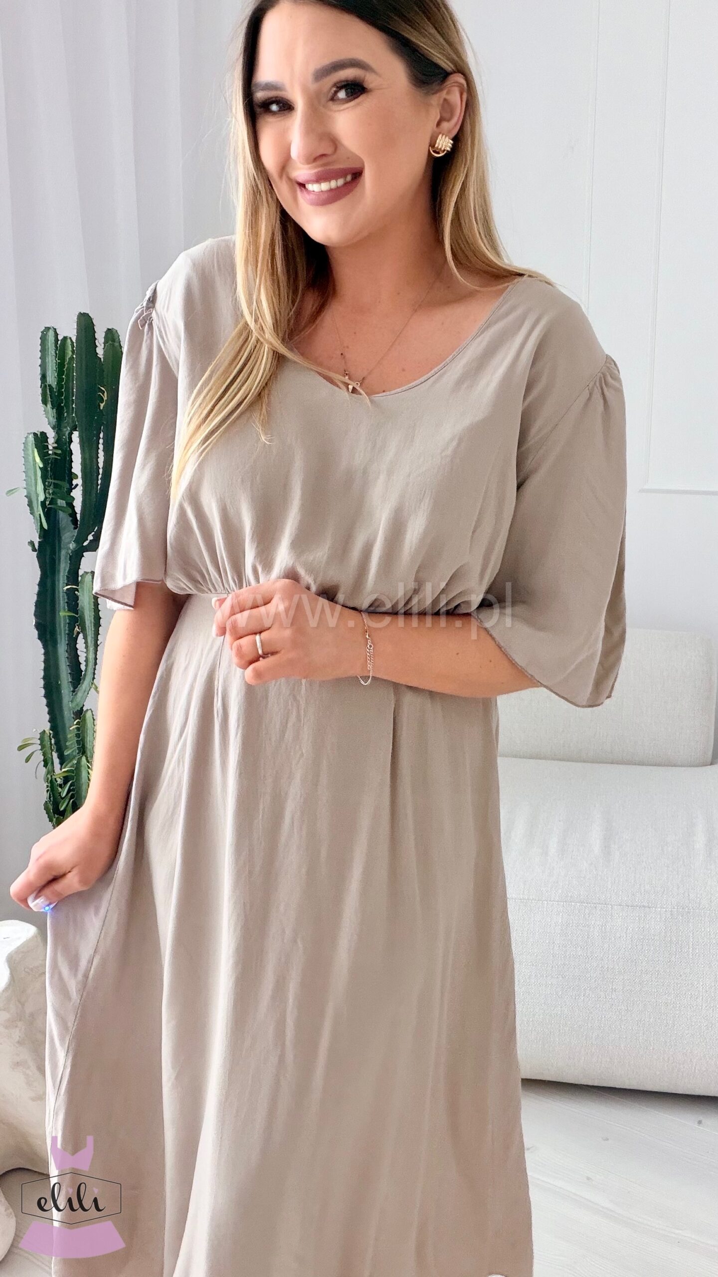 Fason z gumką w talii subtelnie podkreśla sylwetkę, jednocześnie gwarantując pełną swobodę ruchów. Kimonowa góra nadaje sukience luźnego, nowoczesnego charakteru i pięknie układa się na ramionach. Wiązanie z tyłu stanowi nie tylko praktyczny element dopasowania, ale także efektowny, kobiecy akcent.