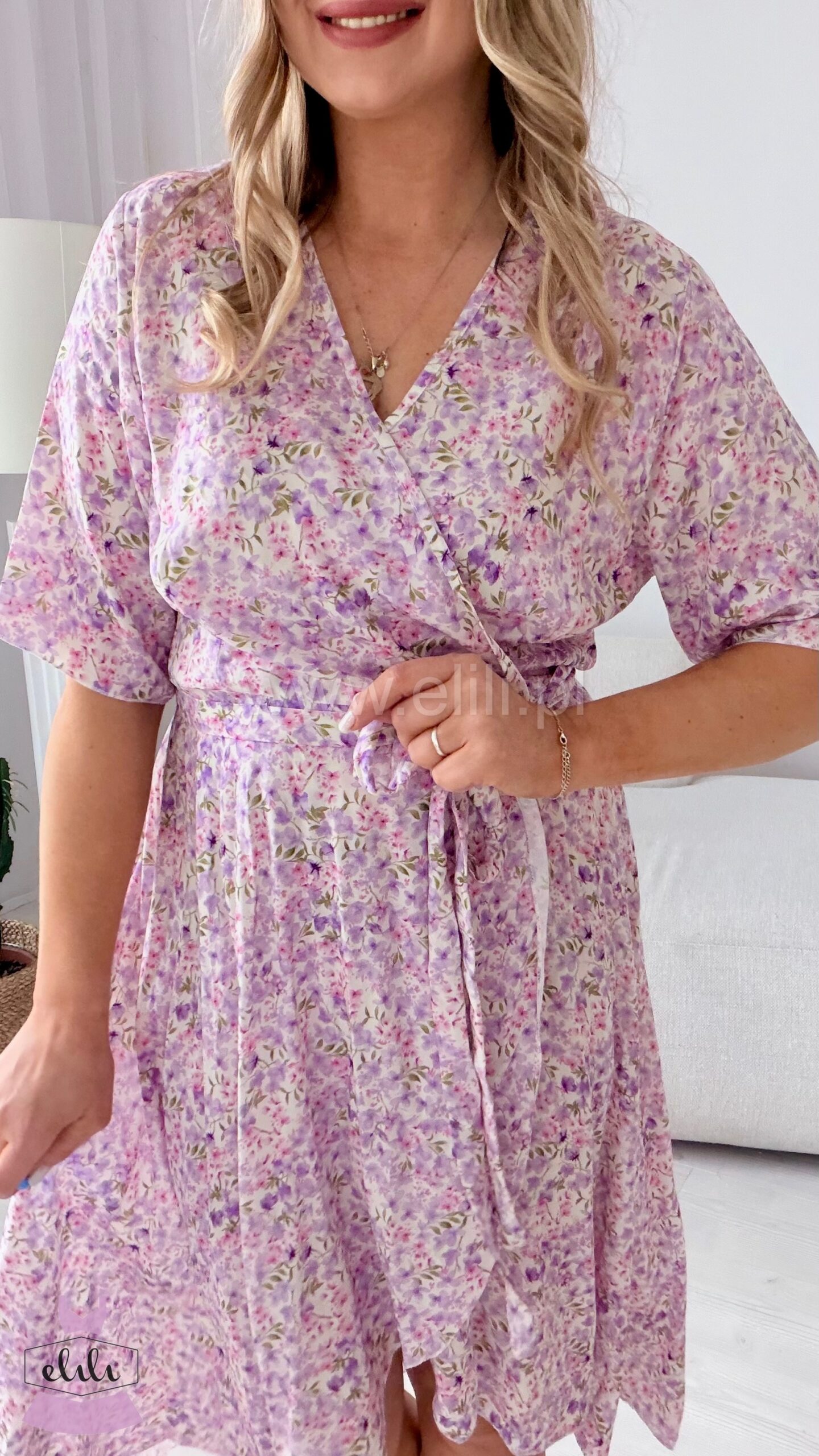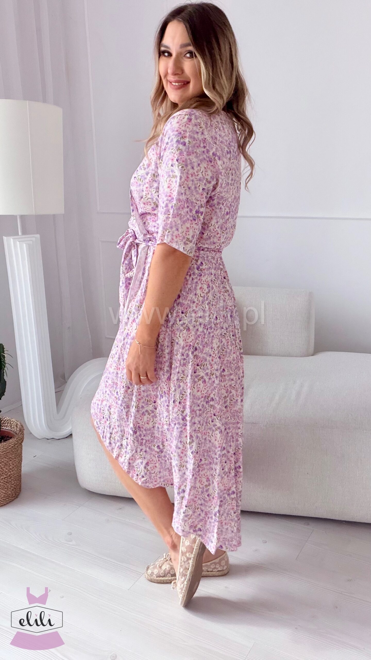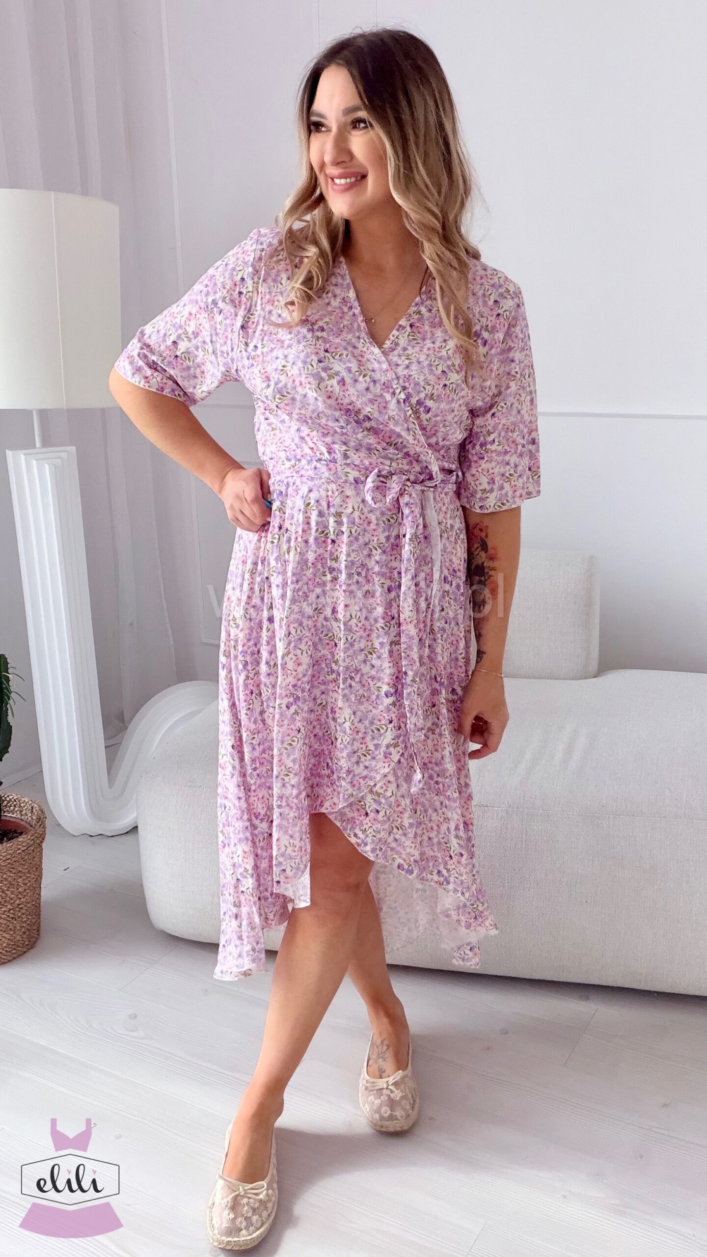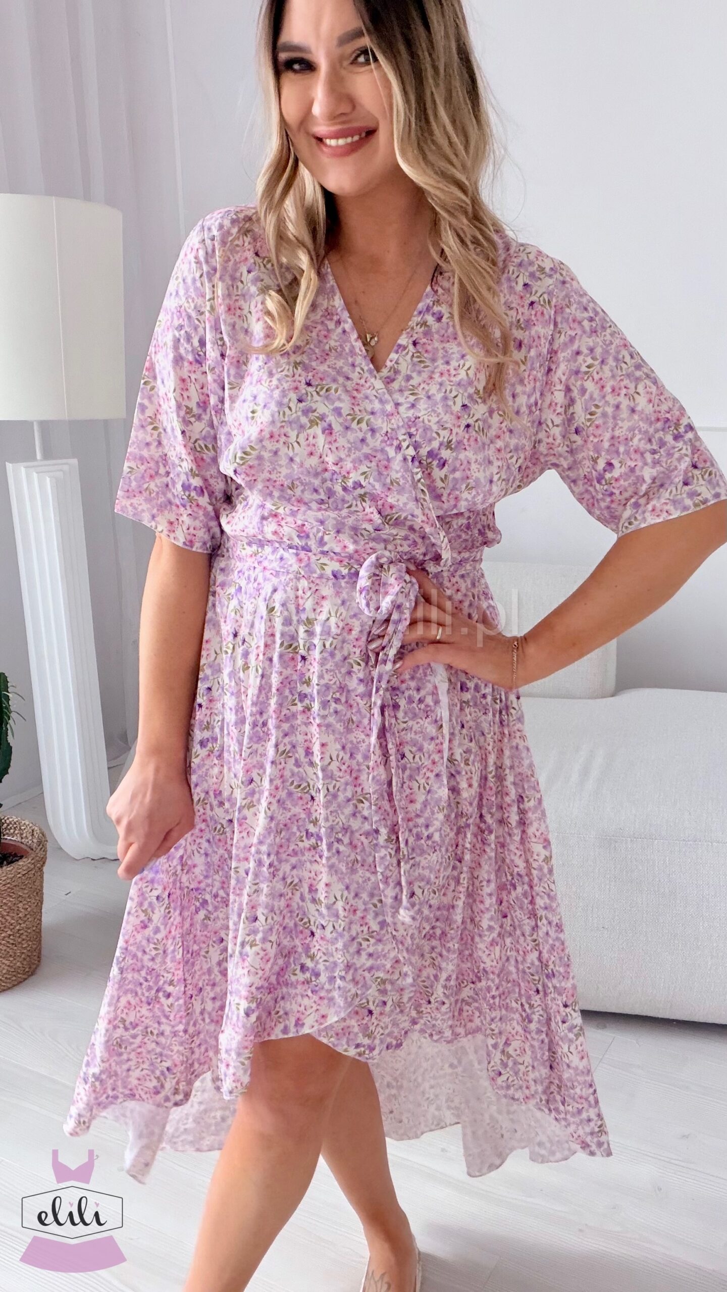 Gracja to kobieca sukienka wykonana z lekkiej, przewiewnej wiskozy, która pięknie układa się na sylwetce. Model zakładany szlafrokowo subtelnie podkreśla talię i daje możliwość dopasowania do figury. Asymetryczny dół z delikatnie dłuższym tyłem dodaje jej lekkości i eleganckiego charakteru. To idealna propozycja na co dzień, do pracy oraz na wyjątkowe okazje.