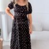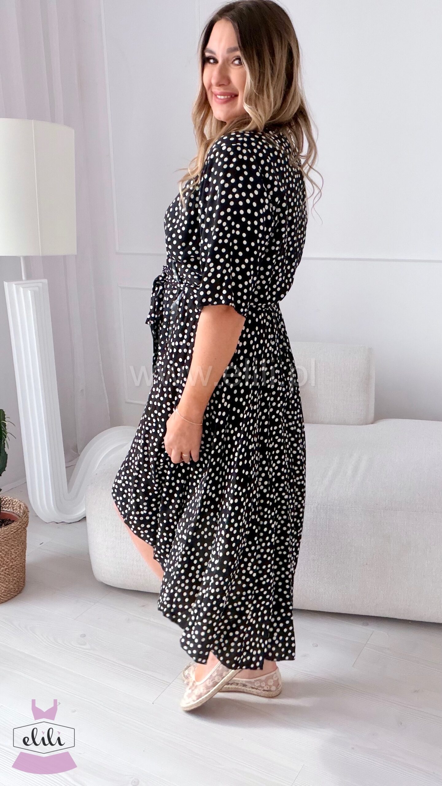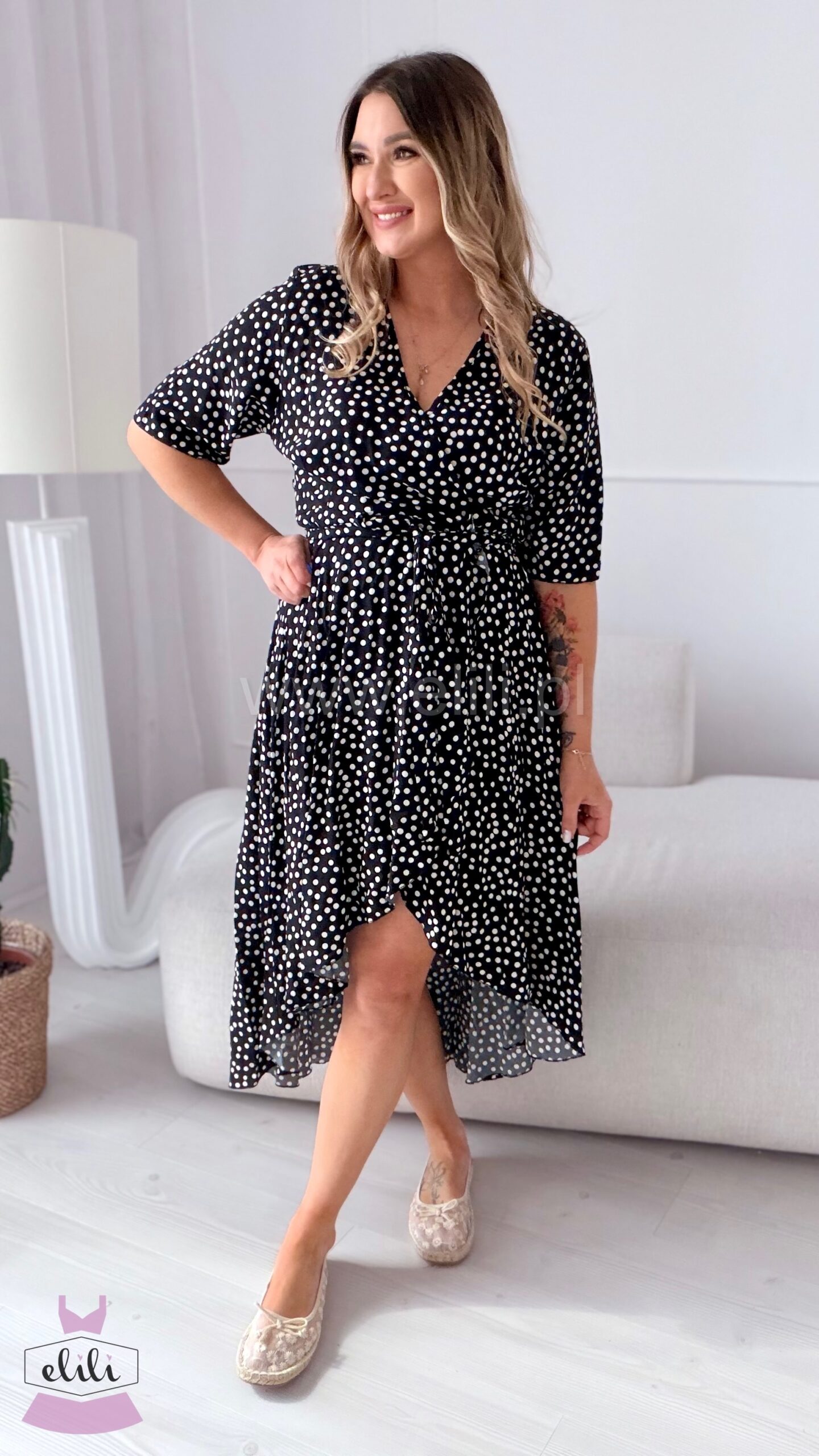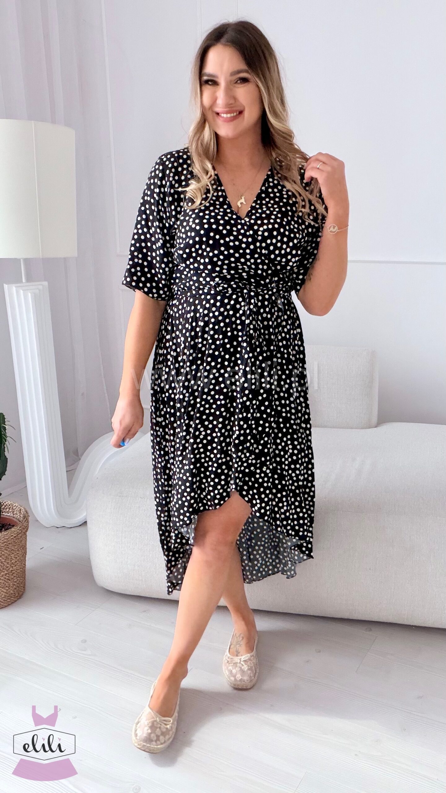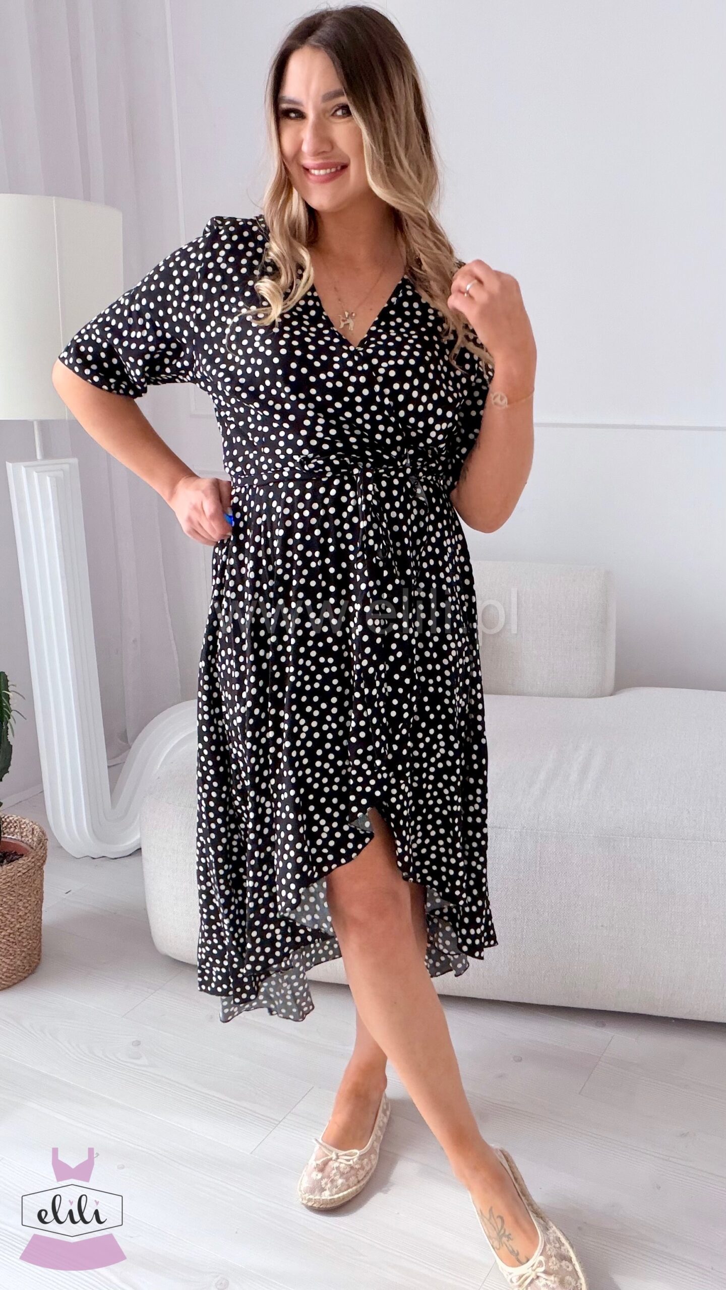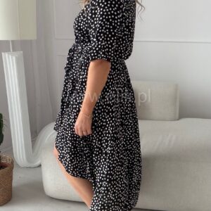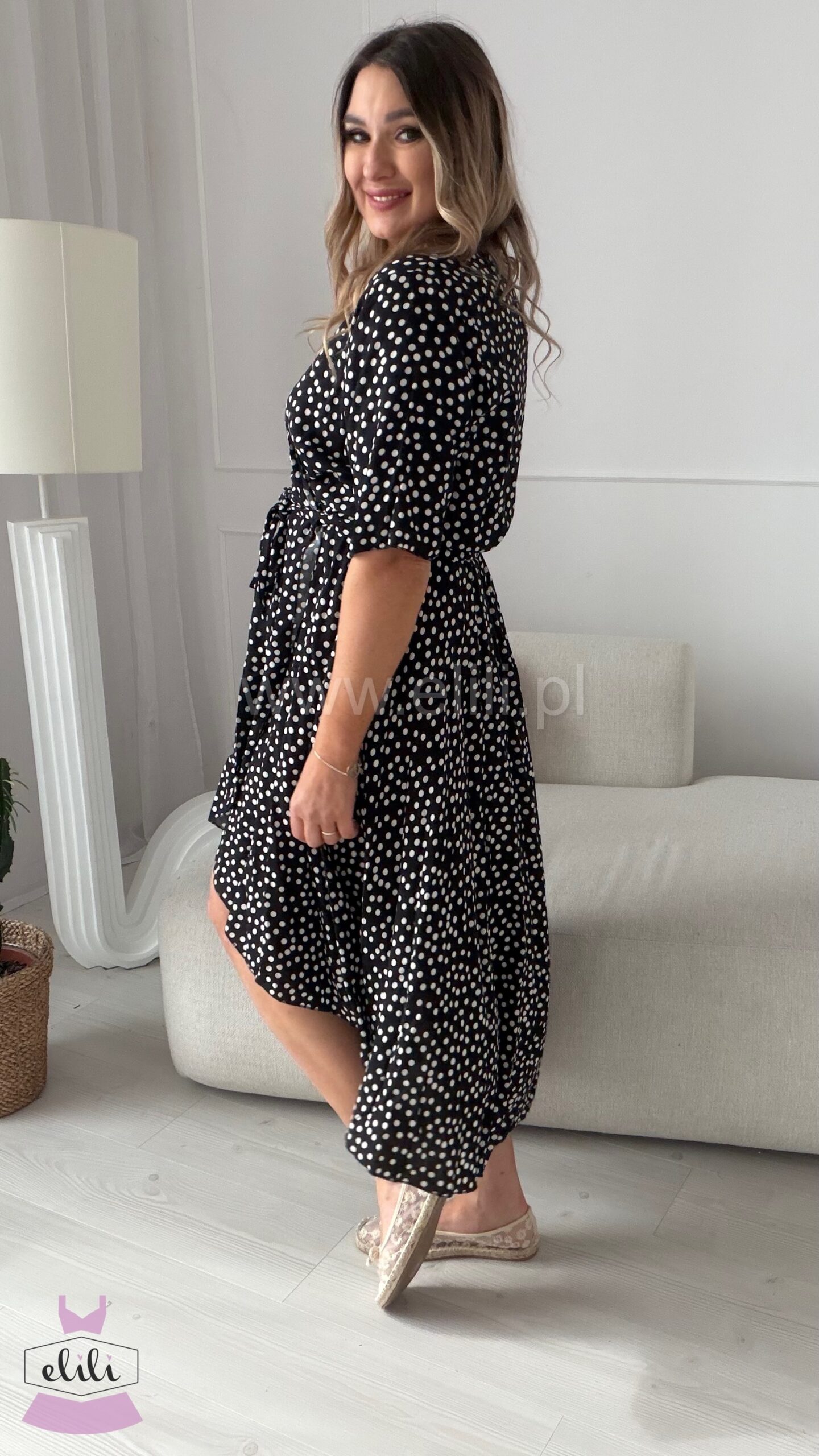 Gracja to kobieca sukienka wykonana z lekkiej, przewiewnej wiskozy, która pięknie układa się na sylwetce. Model zakładany szlafrokowo subtelnie podkreśla talię i daje możliwość dopasowania do figury. Asymetryczny dół z delikatnie dłuższym tyłem dodaje jej lekkości i eleganckiego charakteru. To idealna propozycja na co dzień, do pracy oraz na wyjątkowe okazje.