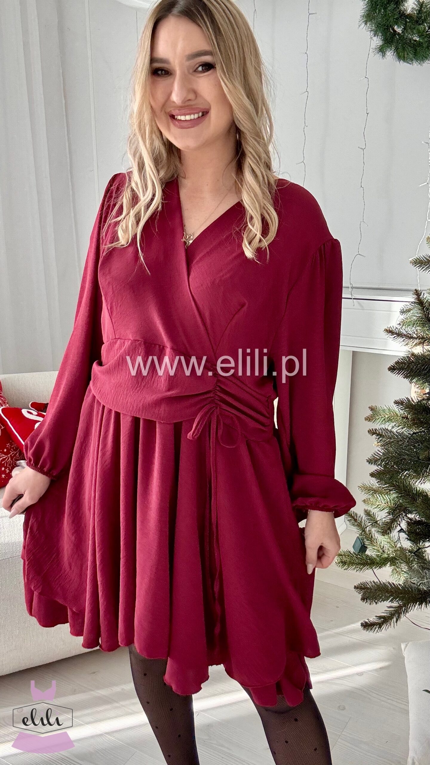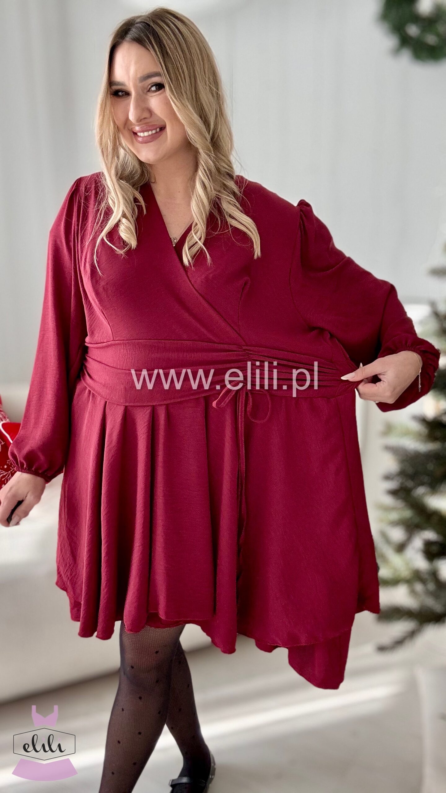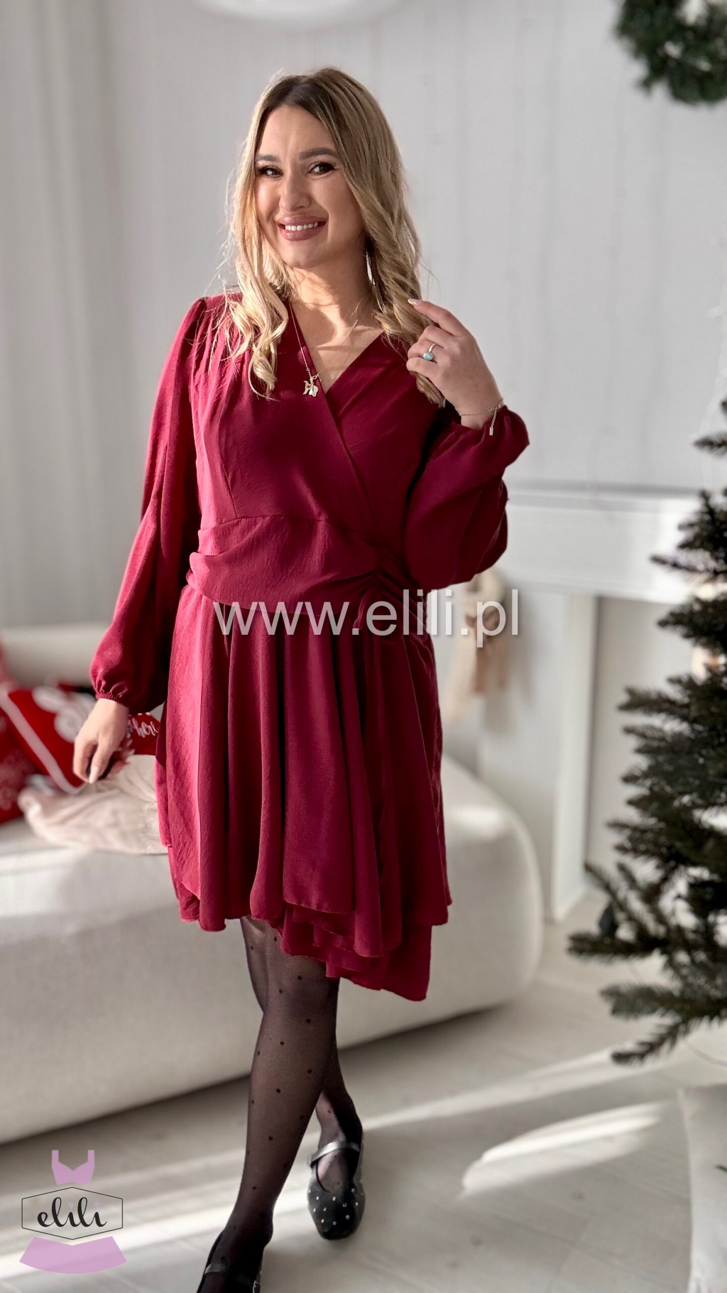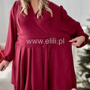 Gładka sukienka plus size to połączenie elegancji i kobiecego wdzięku, stworzone z myślą o komforcie i podkreśleniu atutów sylwetki. Kopertowy dekolt pięknie eksponuje biust i wysmukla szyję, nadając całości subtelnego charakteru. Talia jest wyraźnie zaakcentowana, co doskonale modeluje figurę i podkreśla kobiece kształty. Szerokie rękawy dodają sukience lekkości i swobody, a falbankowy dół szyty na kole zapewnia zwiewność i efektowne wykończenie. To doskonały wybór na eleganckie przyjęcia, rodzinne spotkania czy romantyczne wyjścia, gwarantujący nie tylko stylowy wygląd, ale i wygodę noszenia.