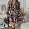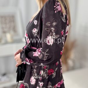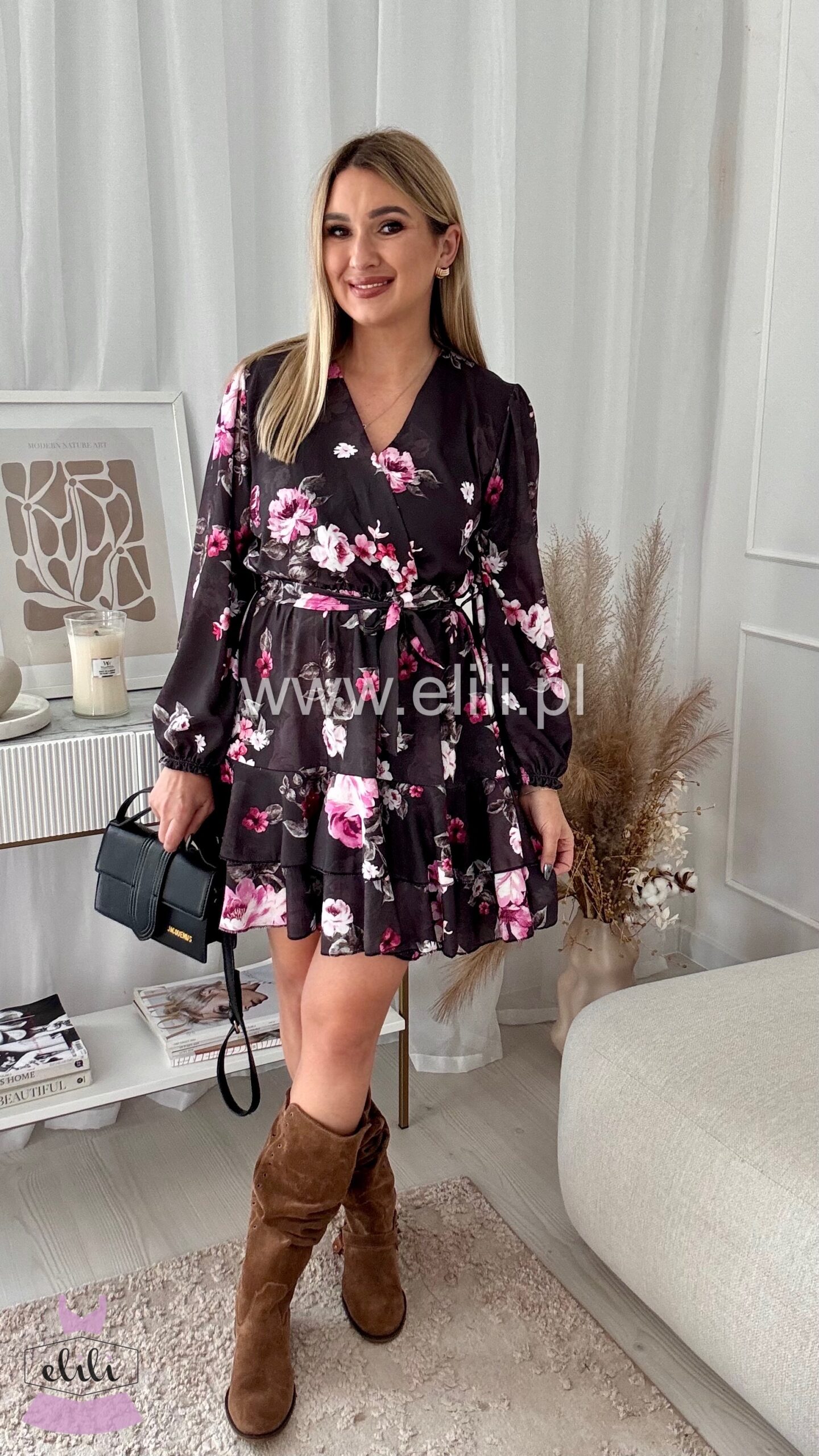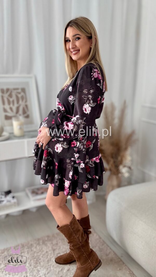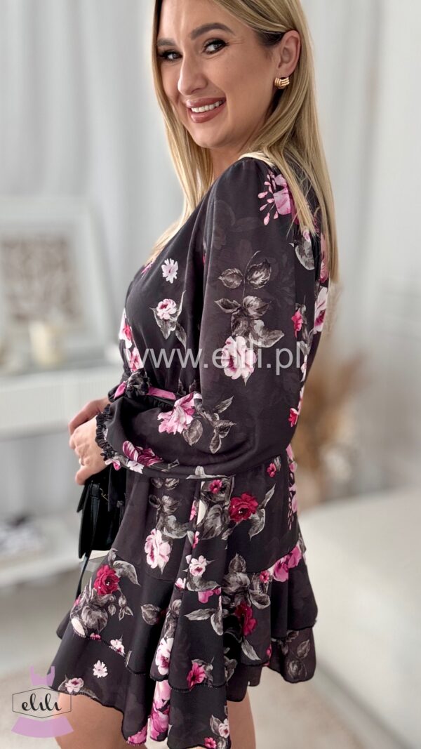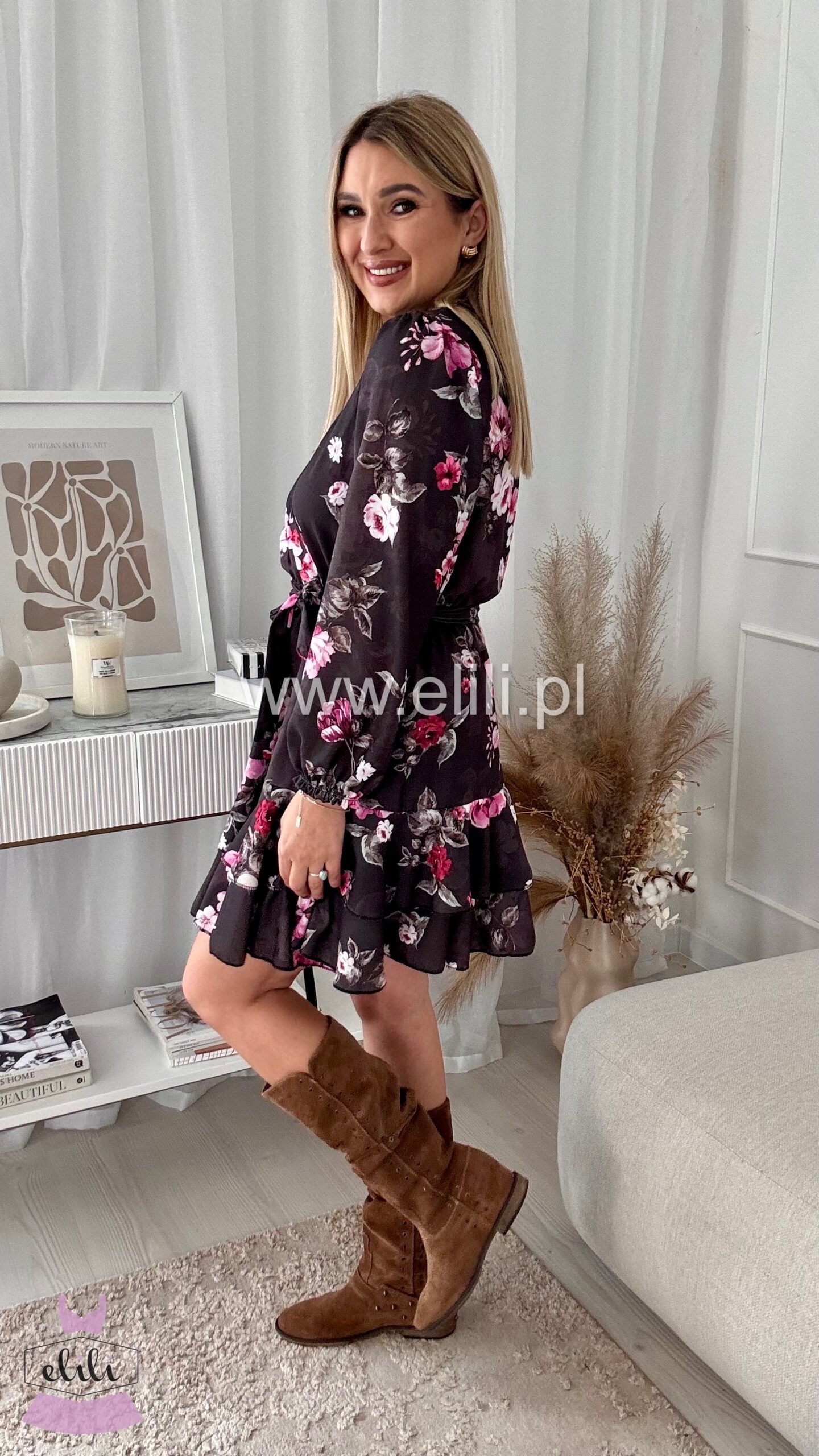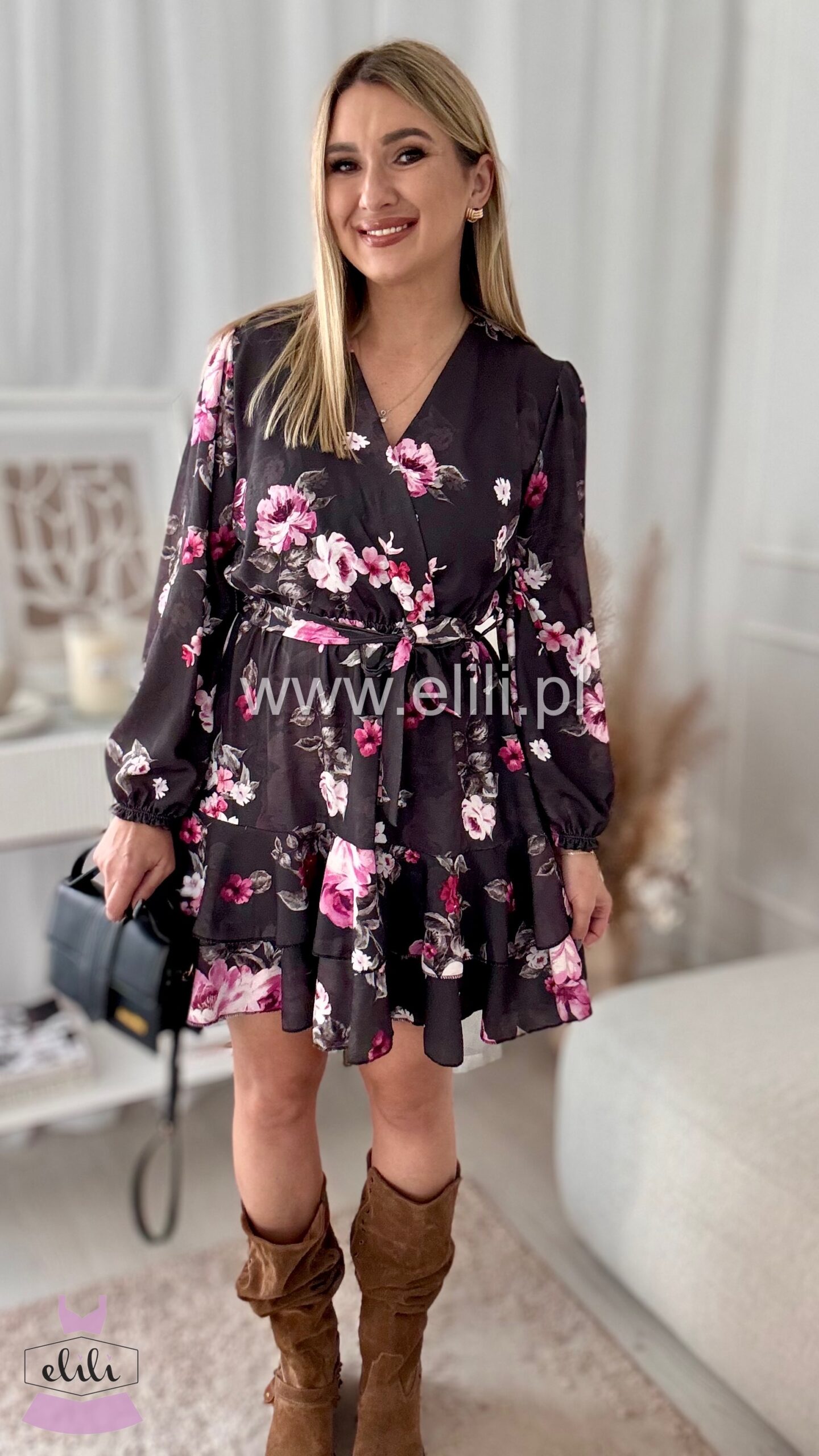 MOdel z kopertowym dekoltem i gumką w talii przewiązywany paskiem. Na dole posiada dwie falbanki