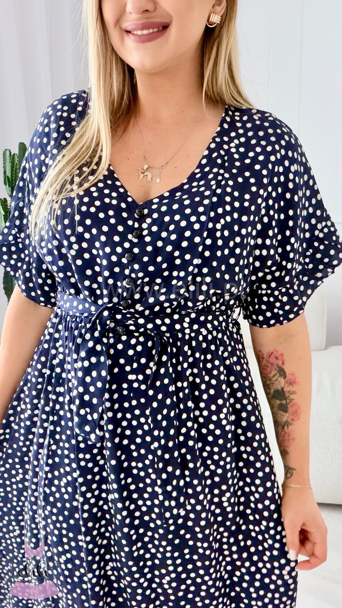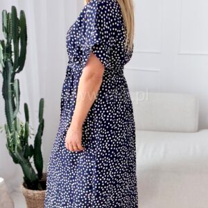 Fason z delikatnie zaznaczoną talią dzięki wszytej gumce pięknie podkreśla sylwetkę, zapewniając jednocześnie wygodę i swobodę ruchów. Dekolt w kształcie serka wysmukla szyję i dodaje całości lekkości, a ozdobne guziki nadają sukience charakteru i modowego wykończenia.